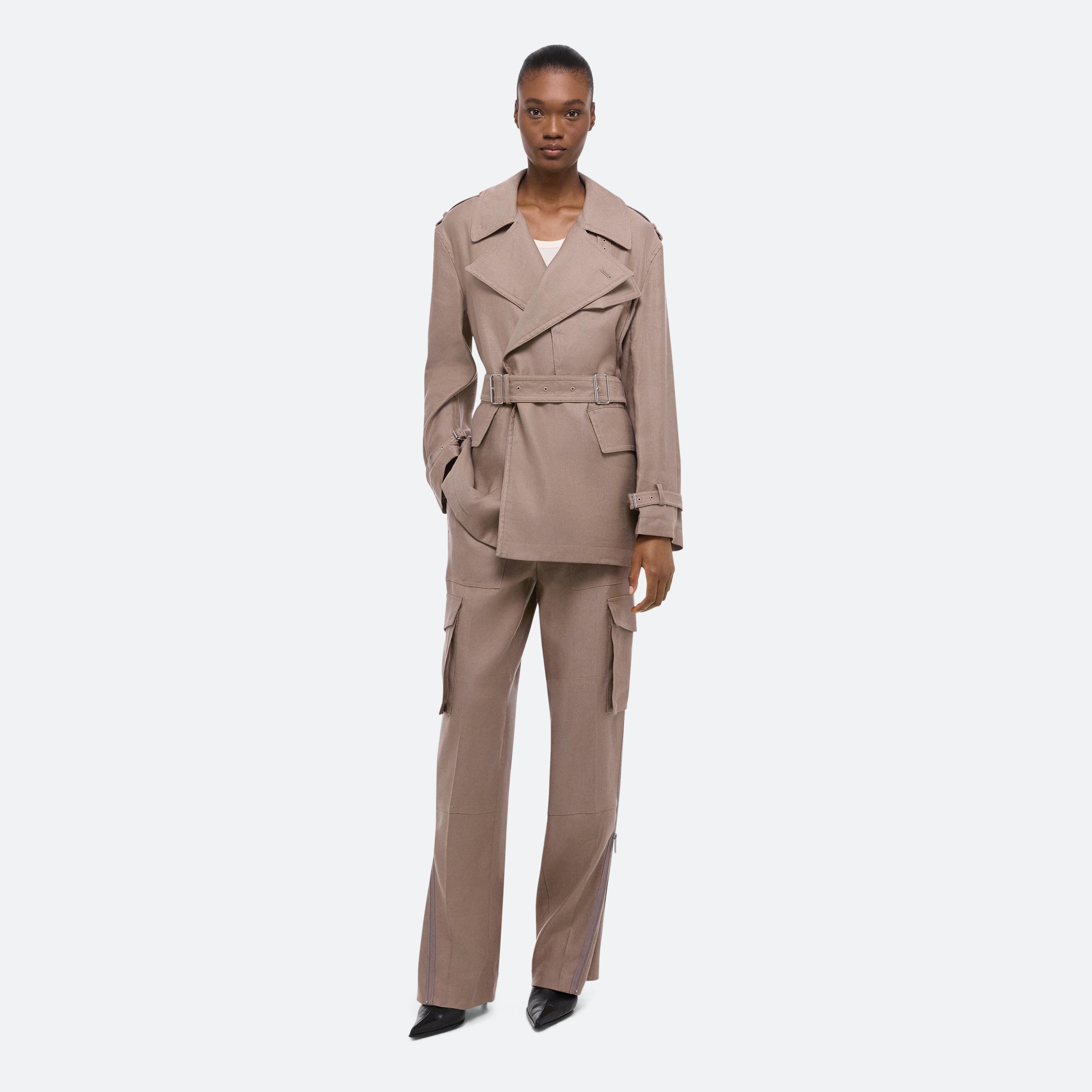 Short, relaxed trench jacket with oversized lapels and dimensional pockets in a breathable linen blend. Classic trench details like buckle closures at the cuffs and collar, and epaulets at the shoulder. Thread the detachable belt through the buckle detail at the waist for a more fitted, doubled belt effect.