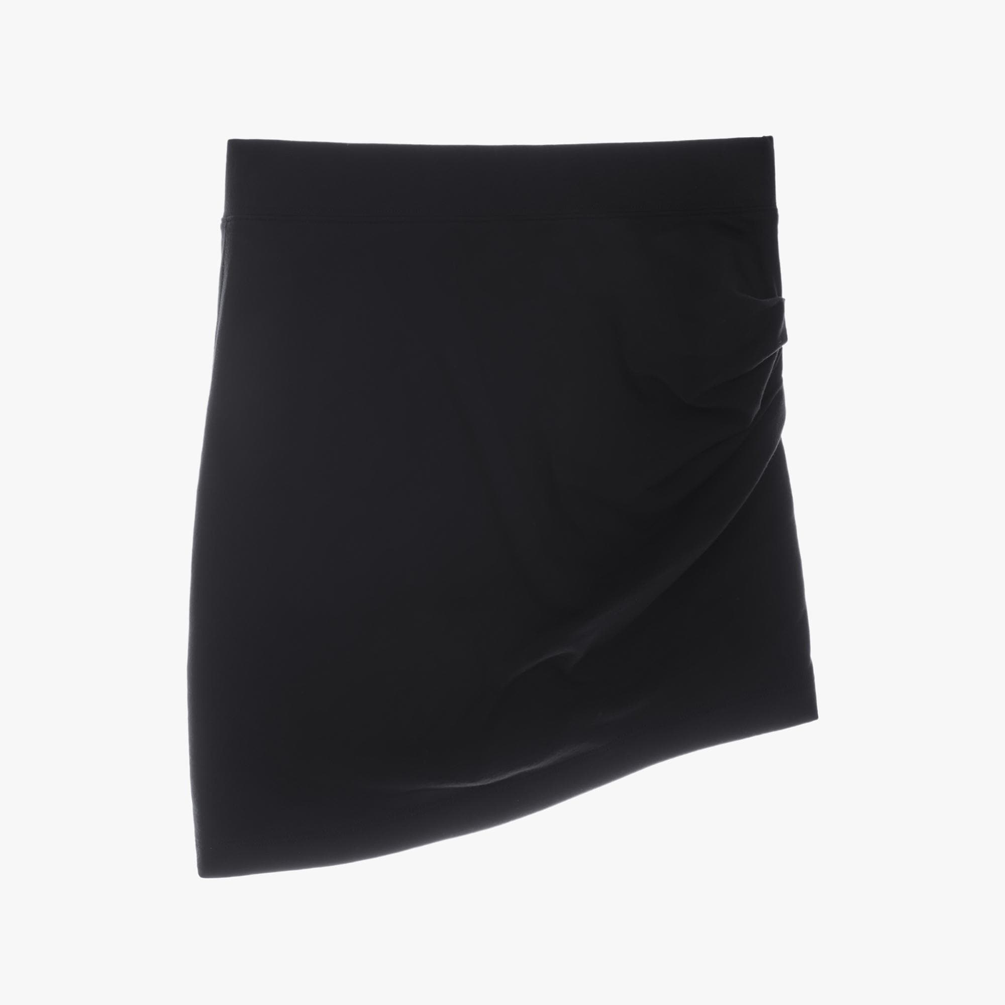 The Helmut Lang Mini Skirt is a pull-on style in a light cotton-modal jersey with ruched details throughout and an asymmetrical hemline.