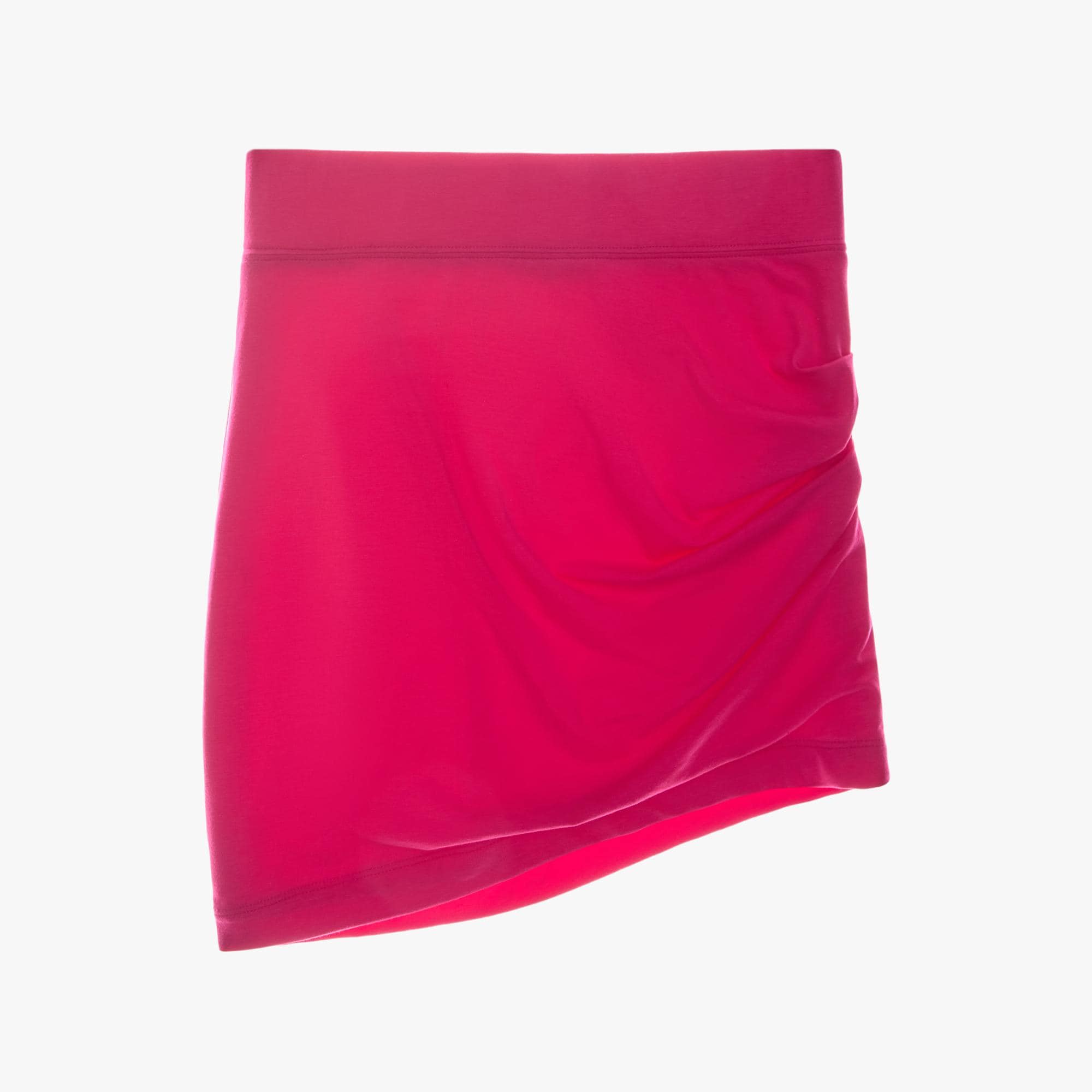 The Helmut Lang Mini Skirt is a pull-on style in a light cotton-modal jersey with ruched details throughout and an asymmetrical hemline.