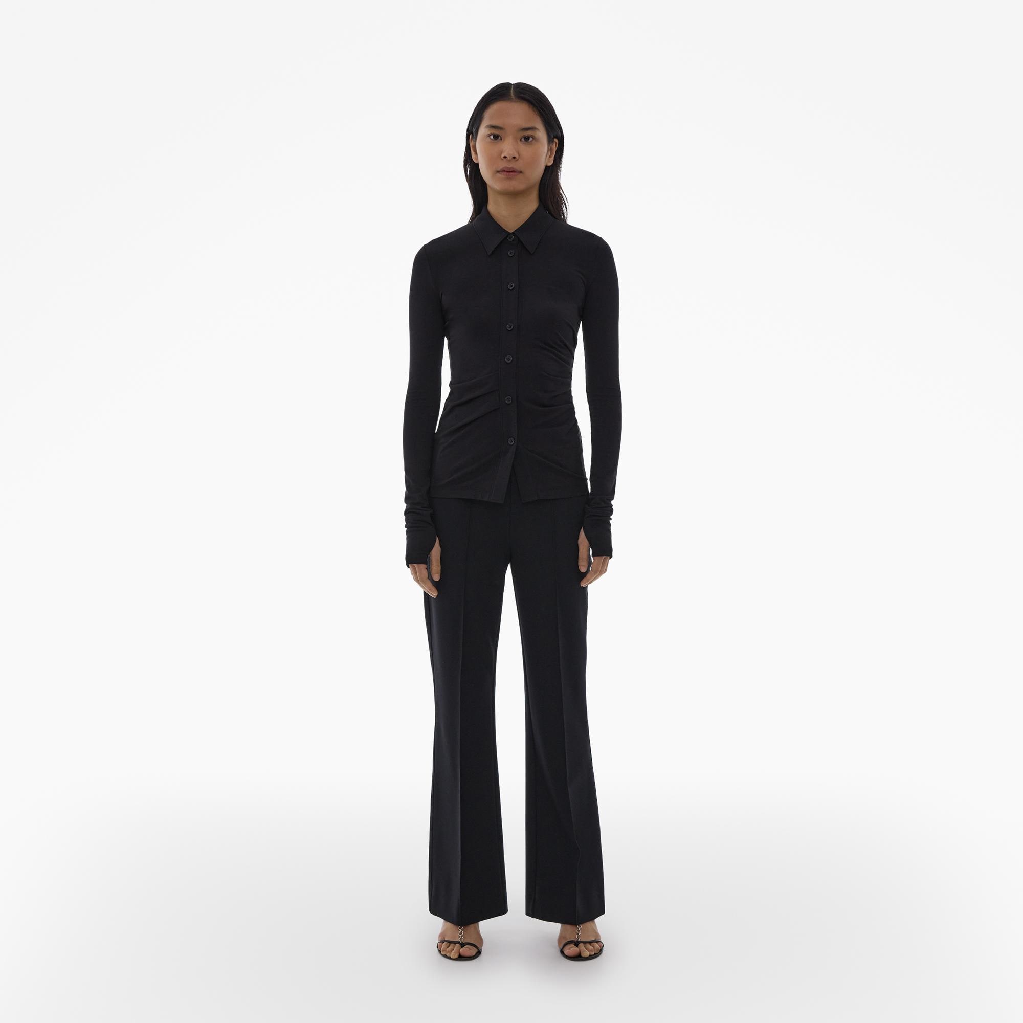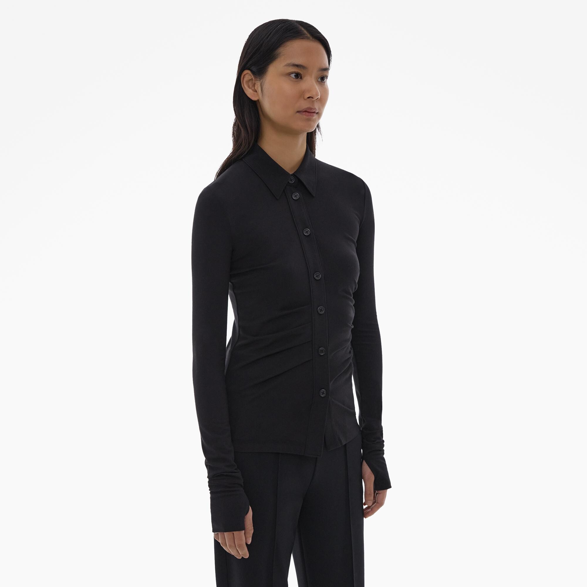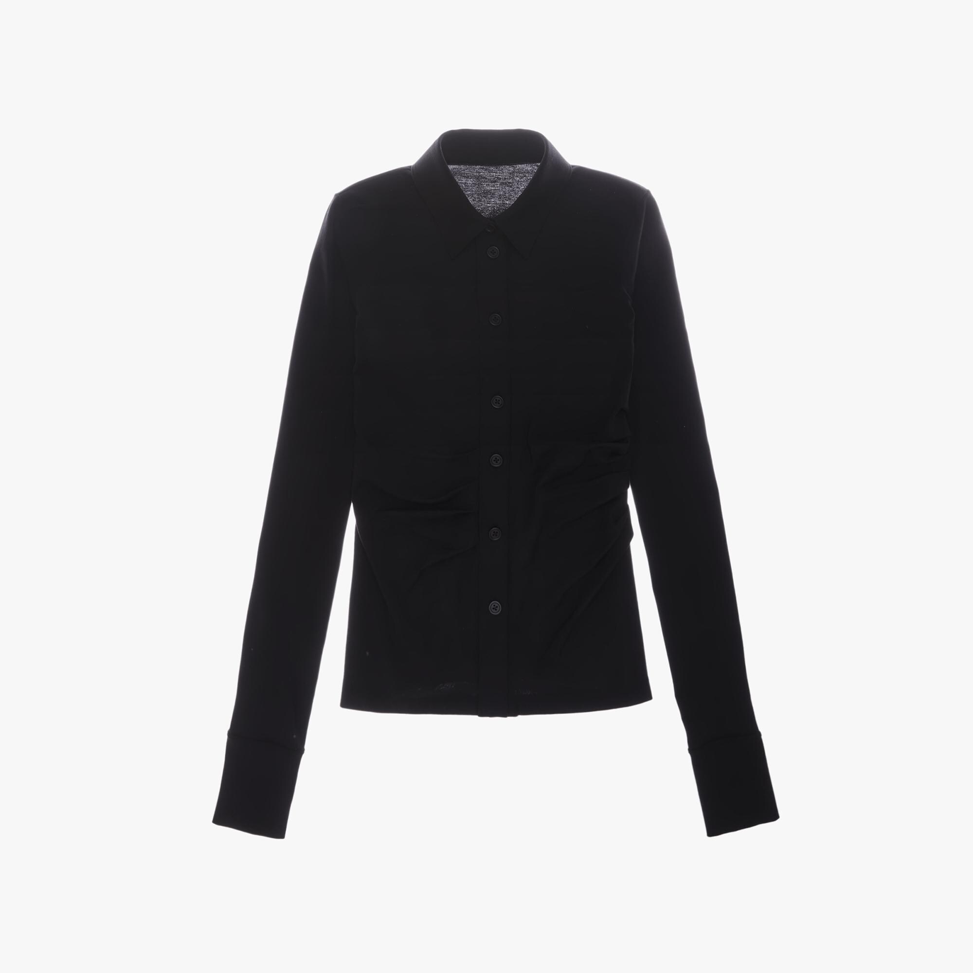 The Helmut Lang Shirt is a button-up style in a light cotton-modal jersey with a pointed collar, long sleeves and ruched details throughout.