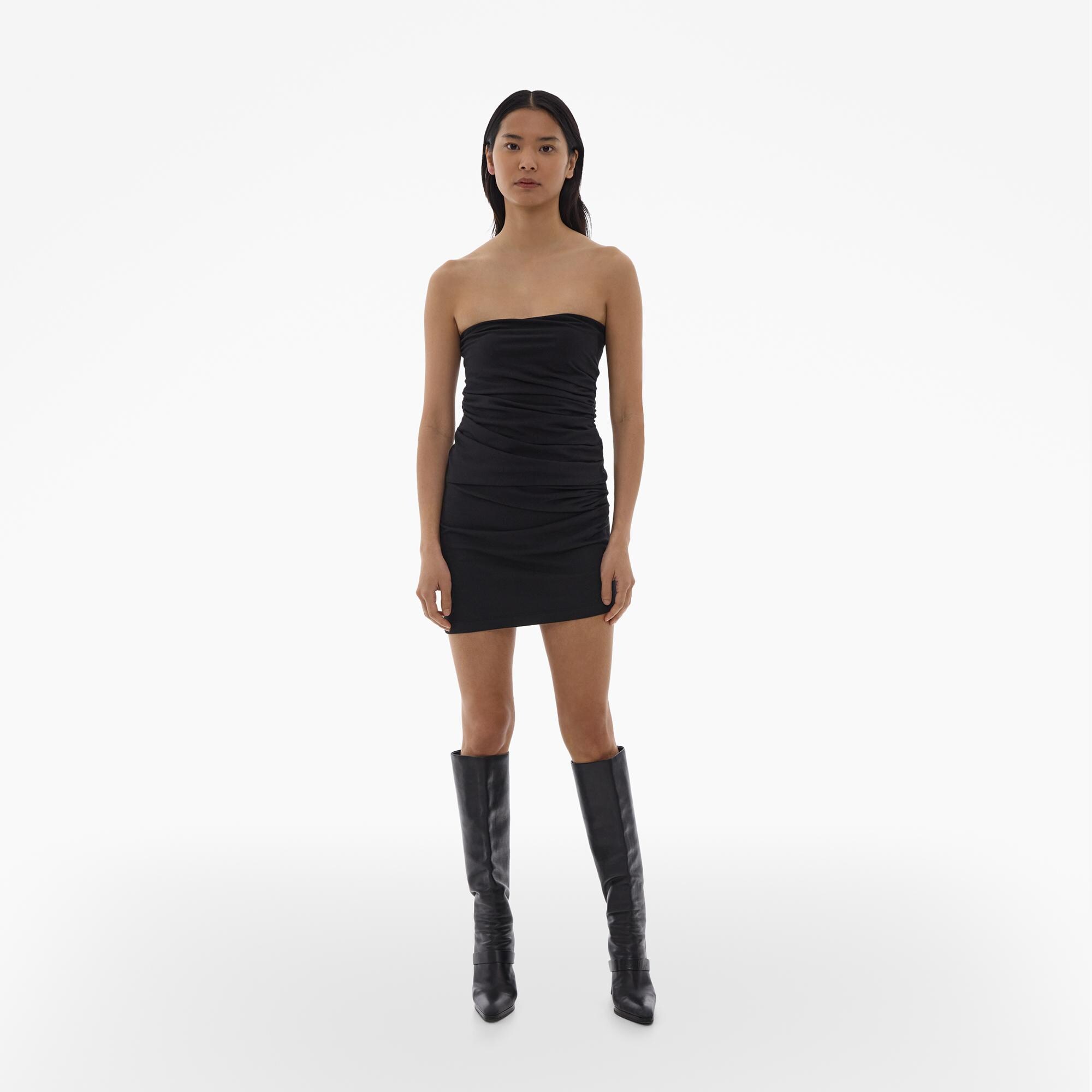 The Helmut Lang Tube Top is a pull-over style in a light cotton-modal jersey with ruched details throughout and a strapless neckline.