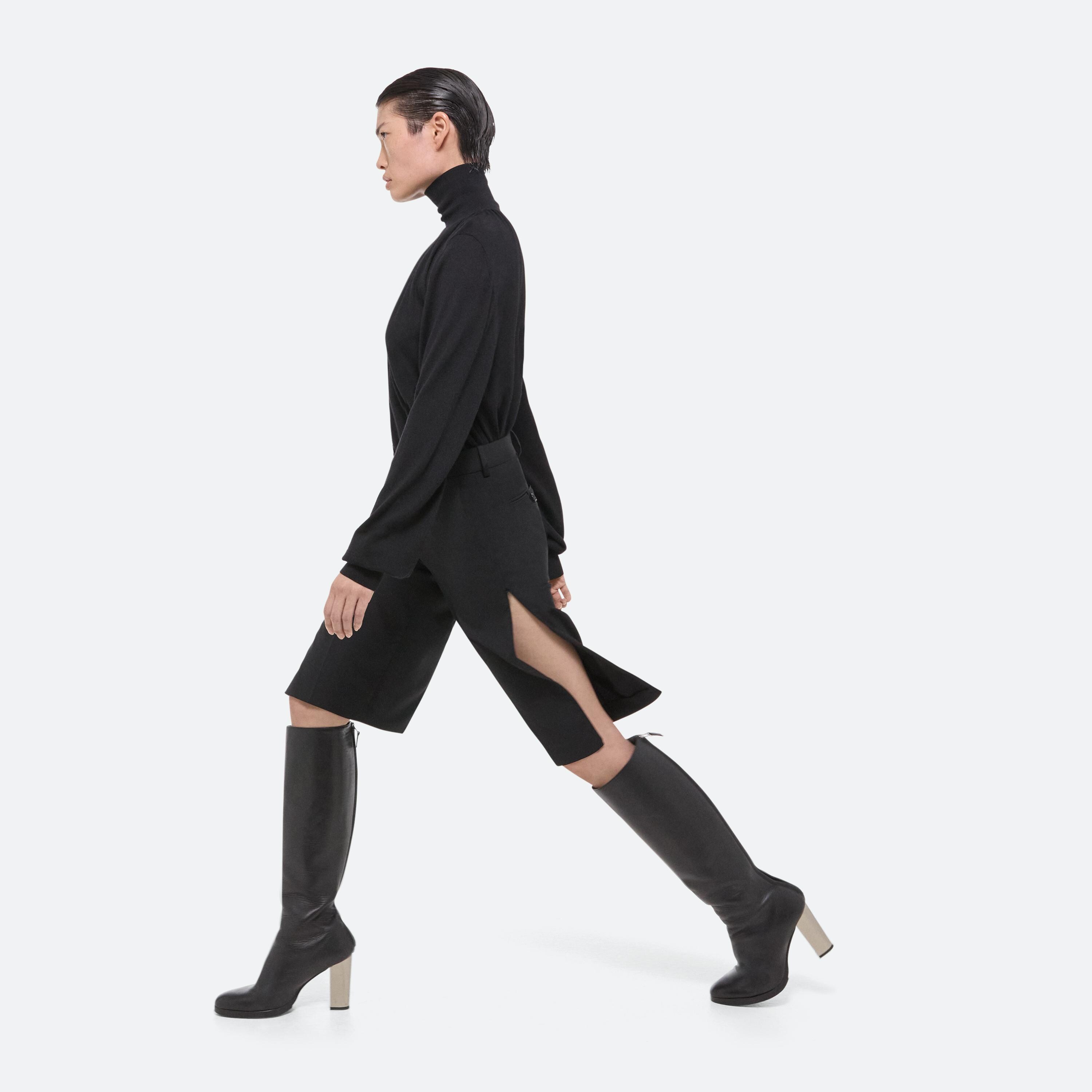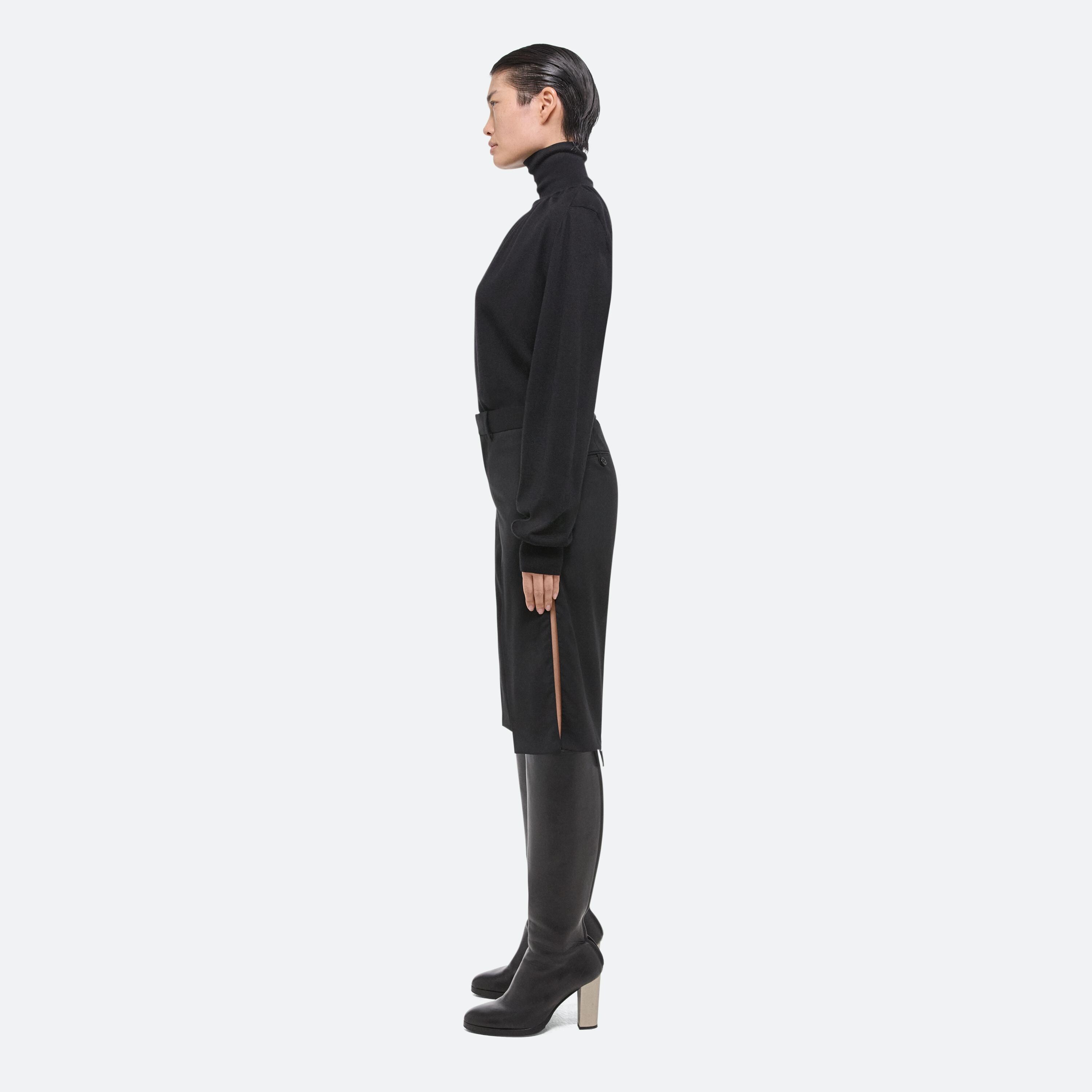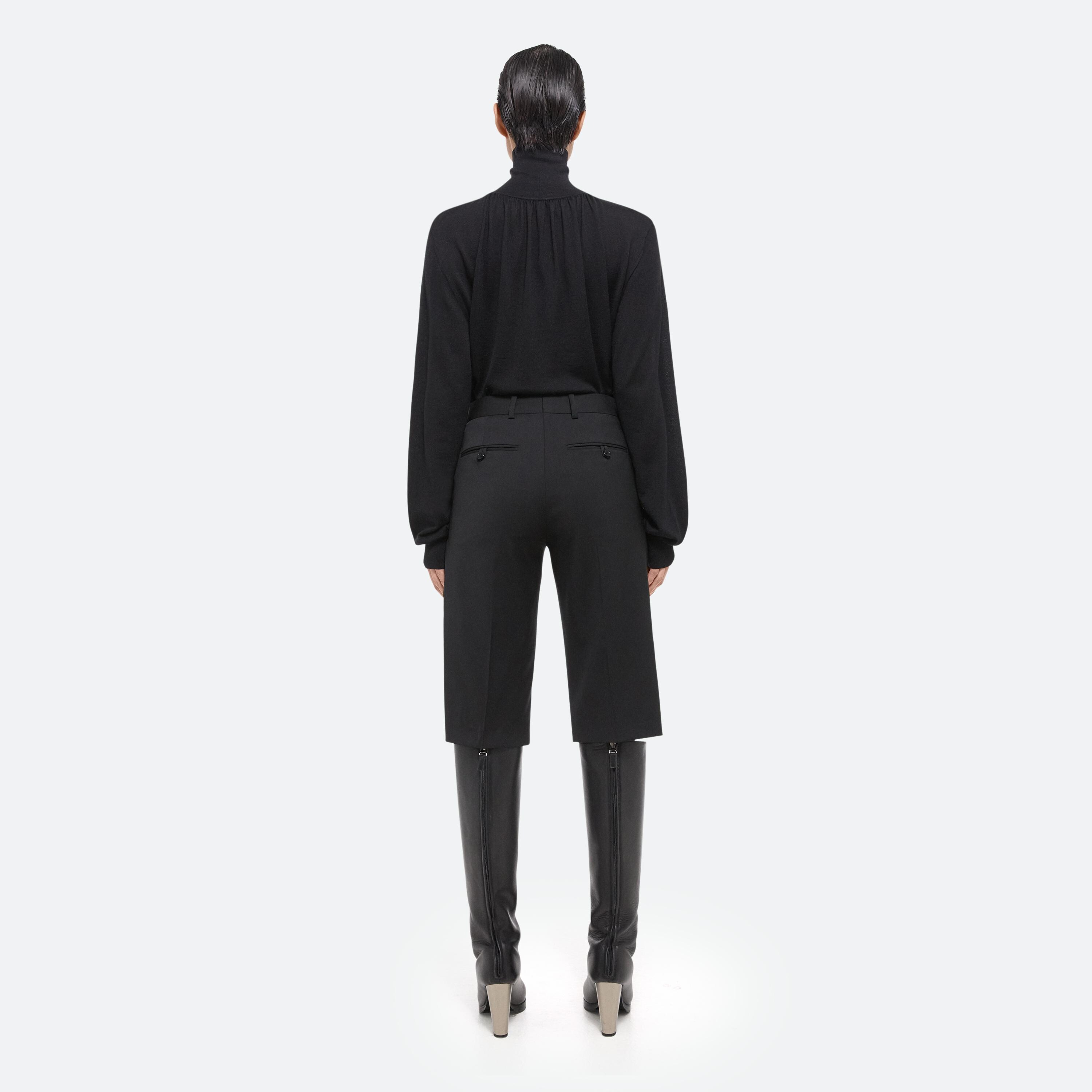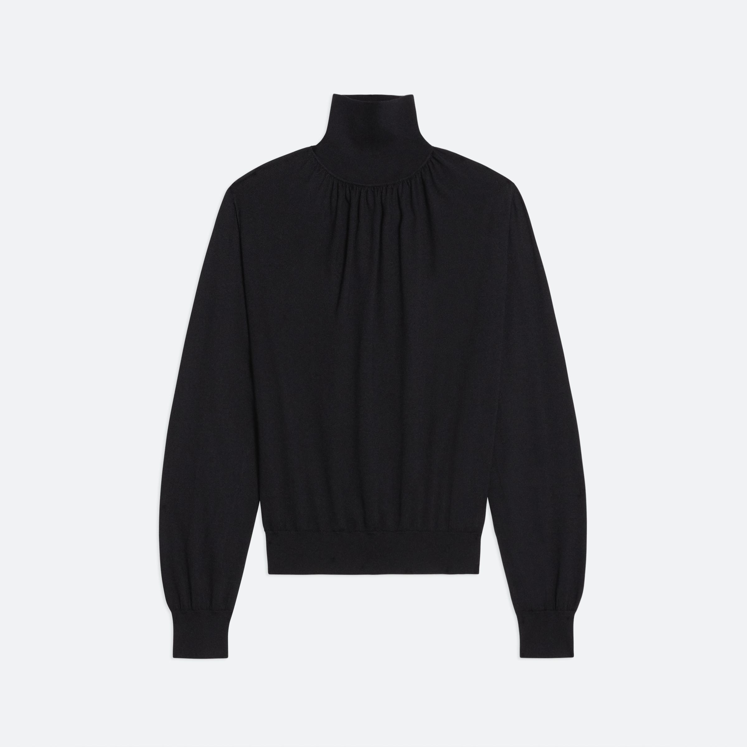 Turtleneck sweater in a superfine Merino Wool Silk blend. Featuring ruching at the neck and blouson sleeves.