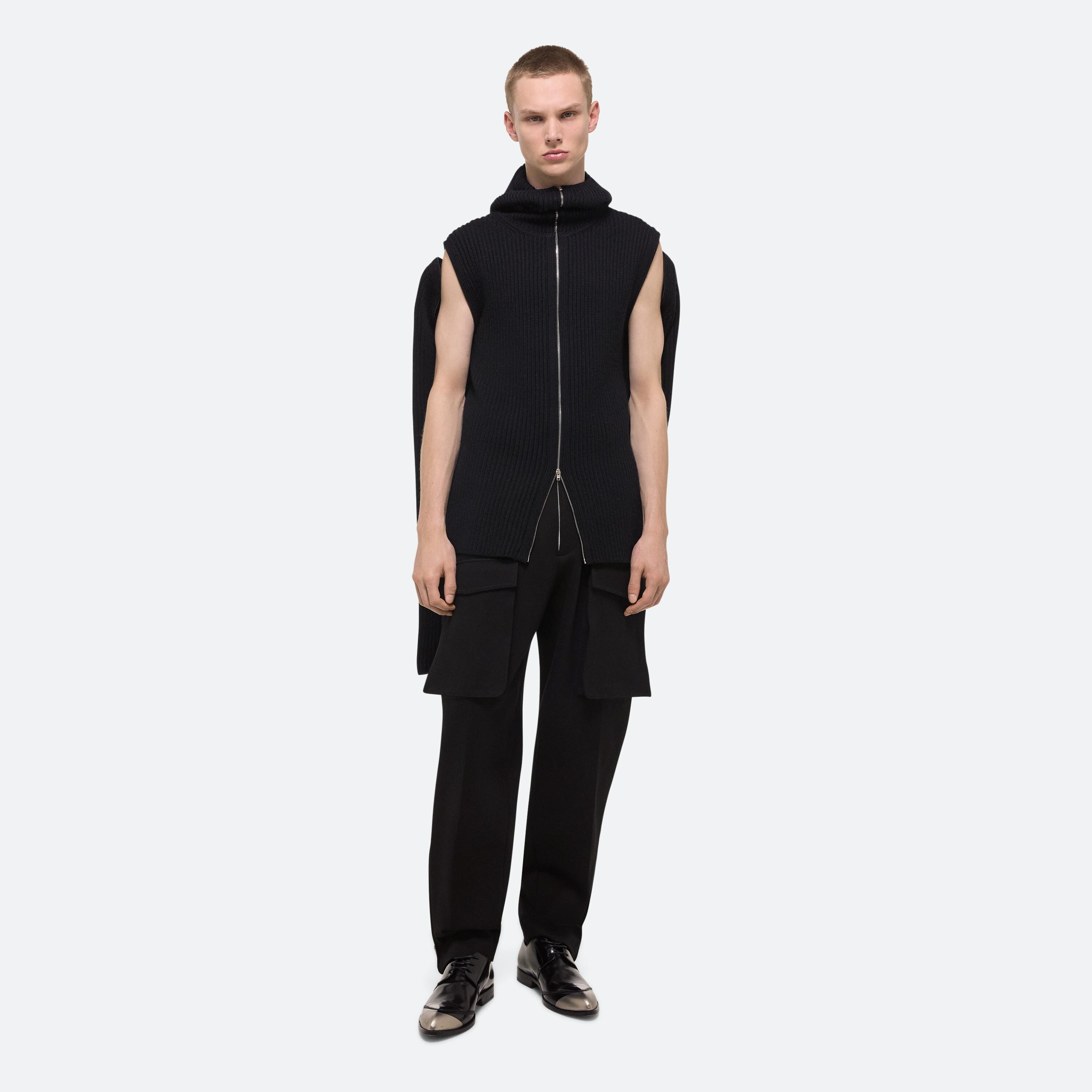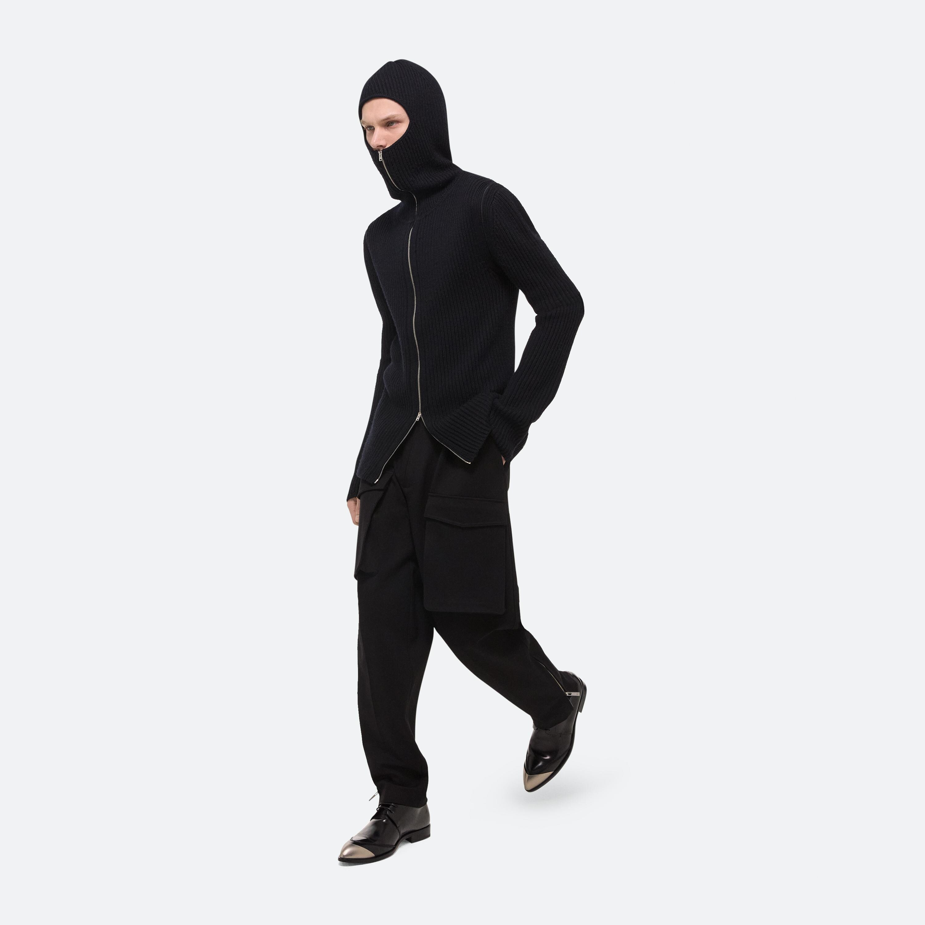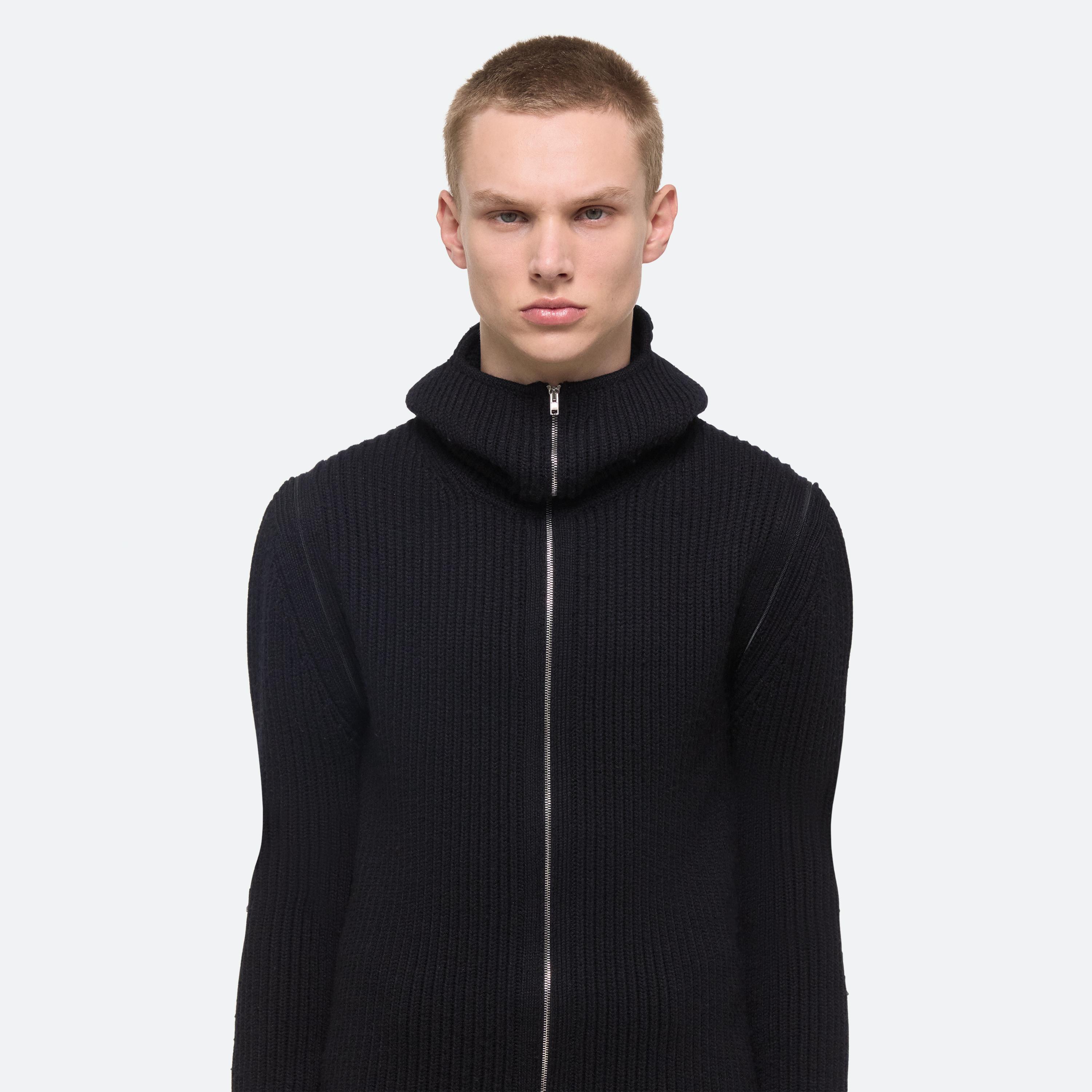 Zip-up sweater in Italian merino wool with exaggerated balaclava hood. Open the concealed coil zippers at the sleeves to wear as a vest, or leave them partially closed for custom styling.