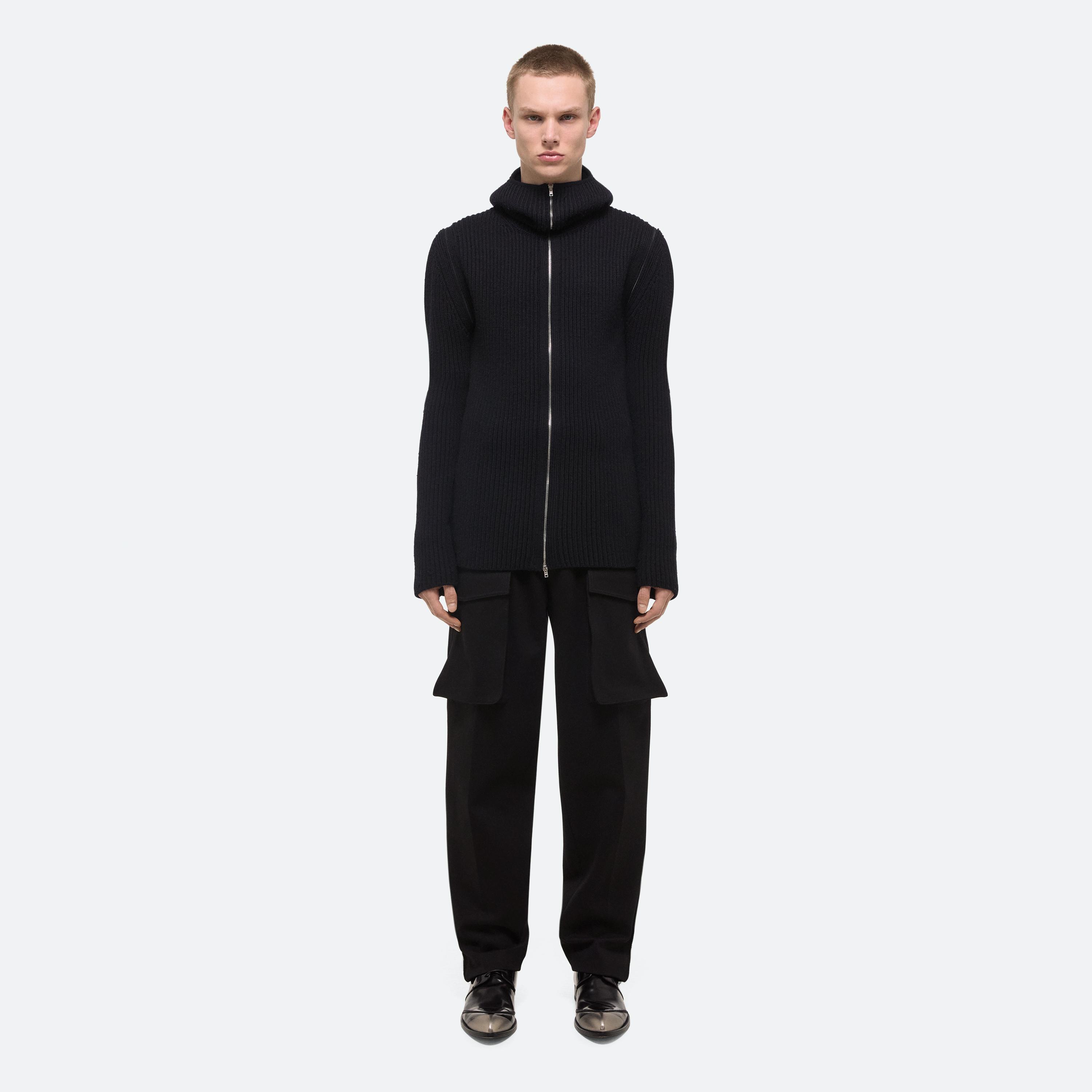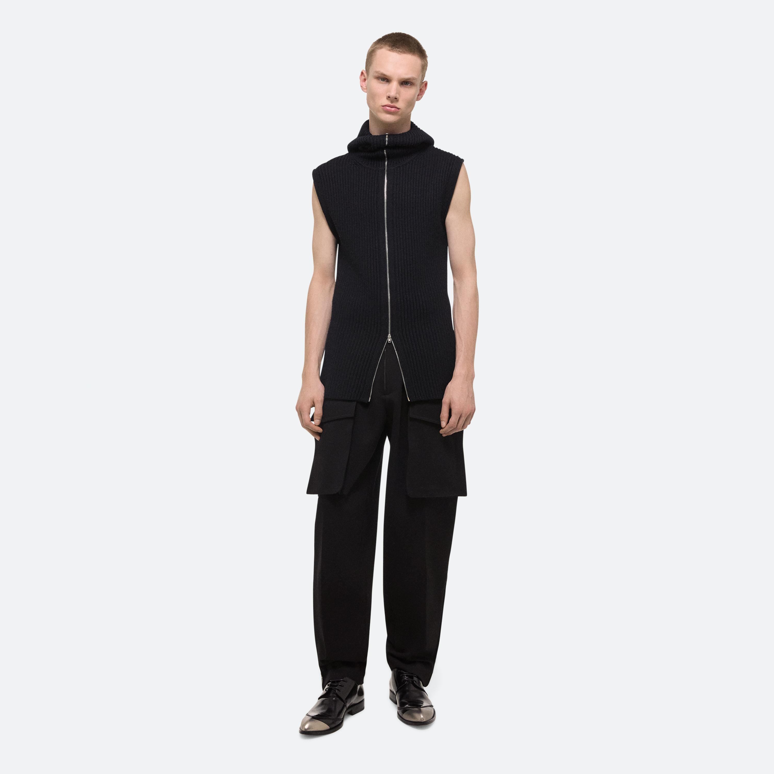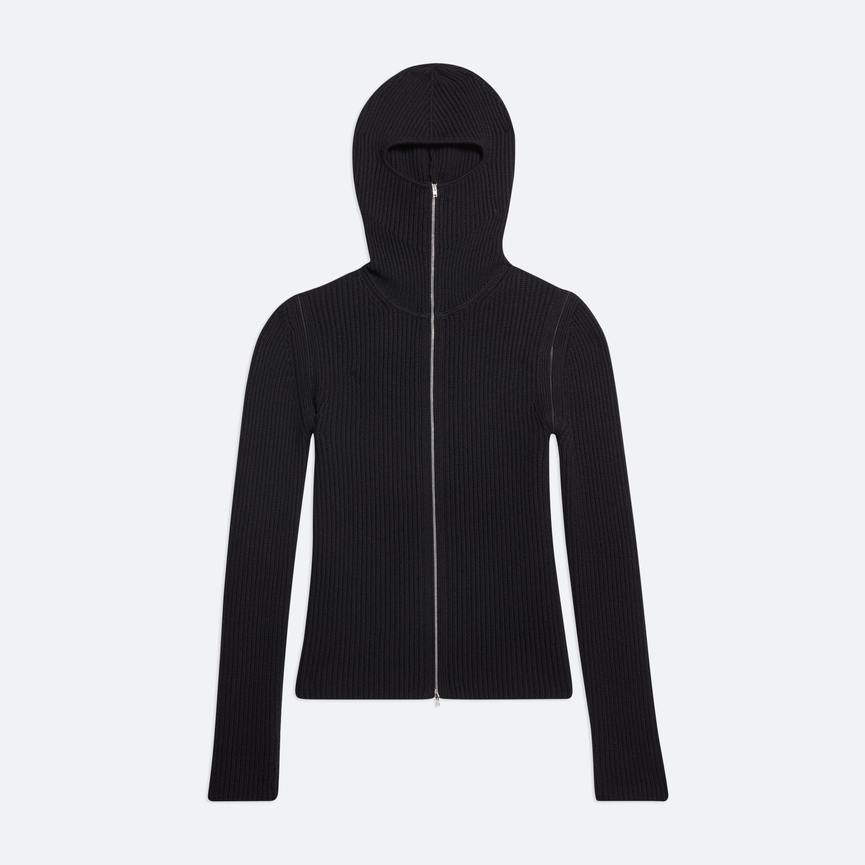 Zip-up sweater in Italian merino wool with exaggerated balaclava hood. Open the concealed coil zippers at the sleeves to wear as a vest, or leave them partially closed for custom styling.