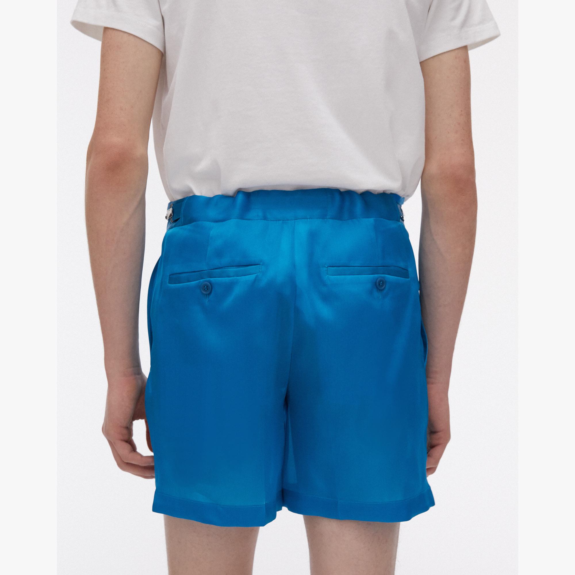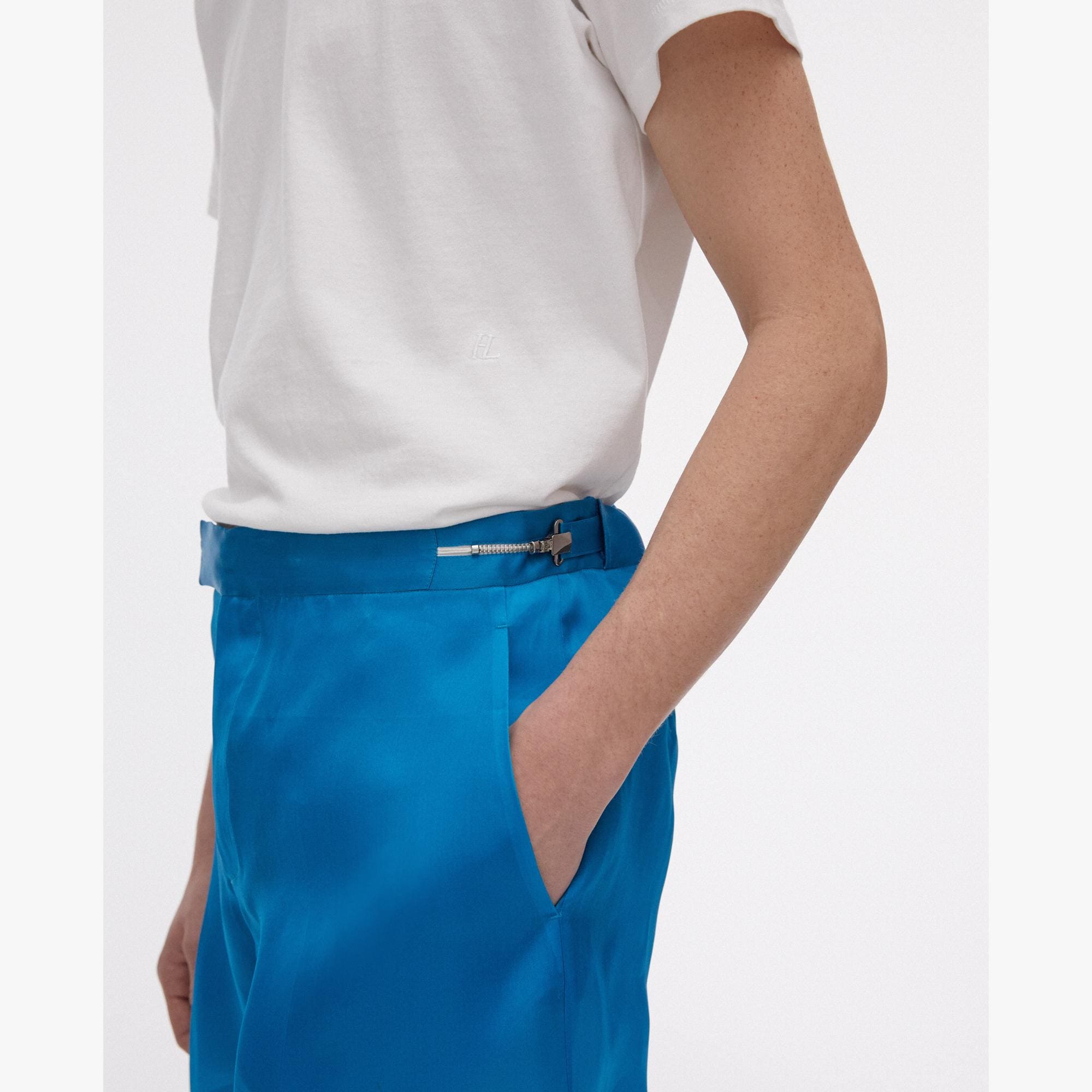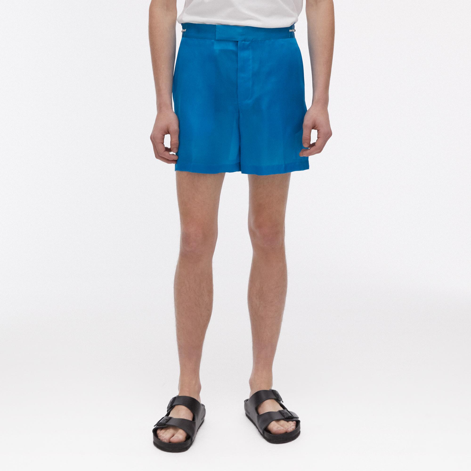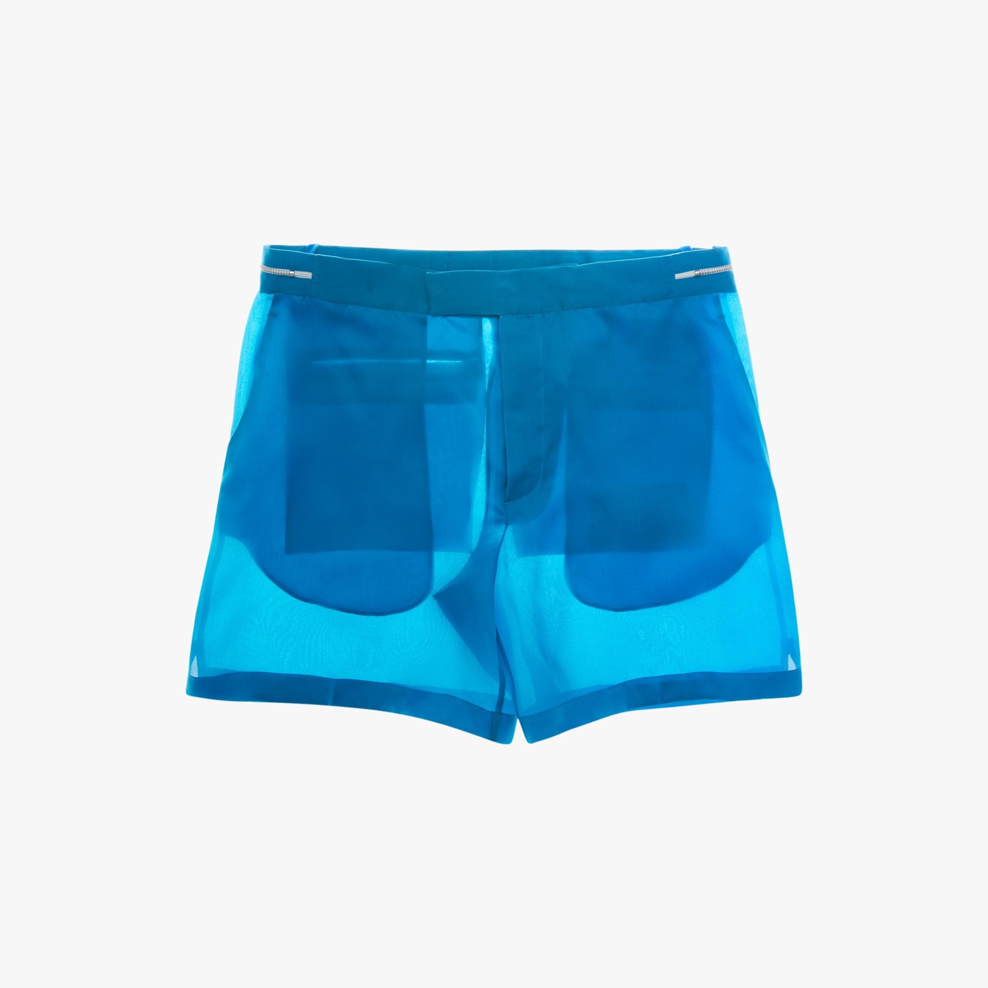 The Helmut Lang Satin Organza Short is a lightweight men's suit short with waist zipper detail and side pockets