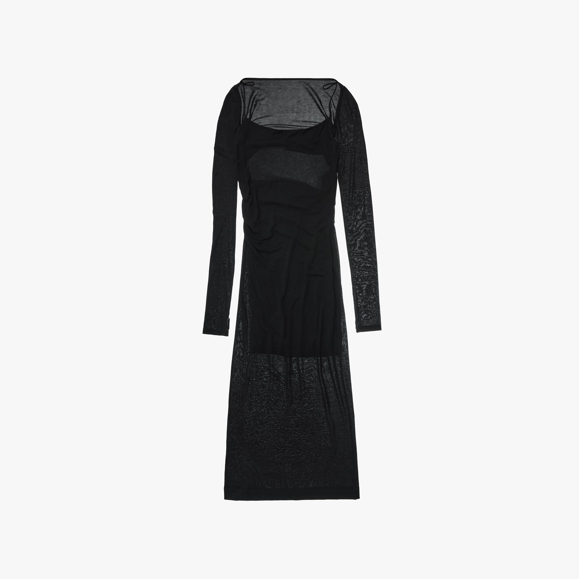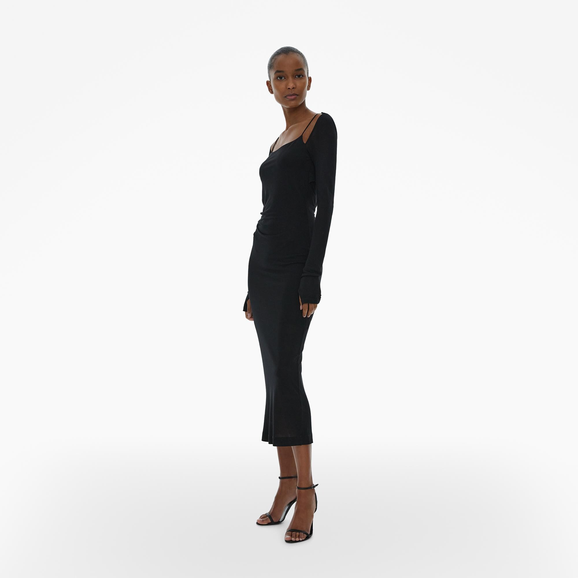 The Helmut Lang Scala Midi Dress is a slim-fitting style in a light viscose jersey with a square neckline, draped open back, and an optional long sleeve bolero with thumbhole details.