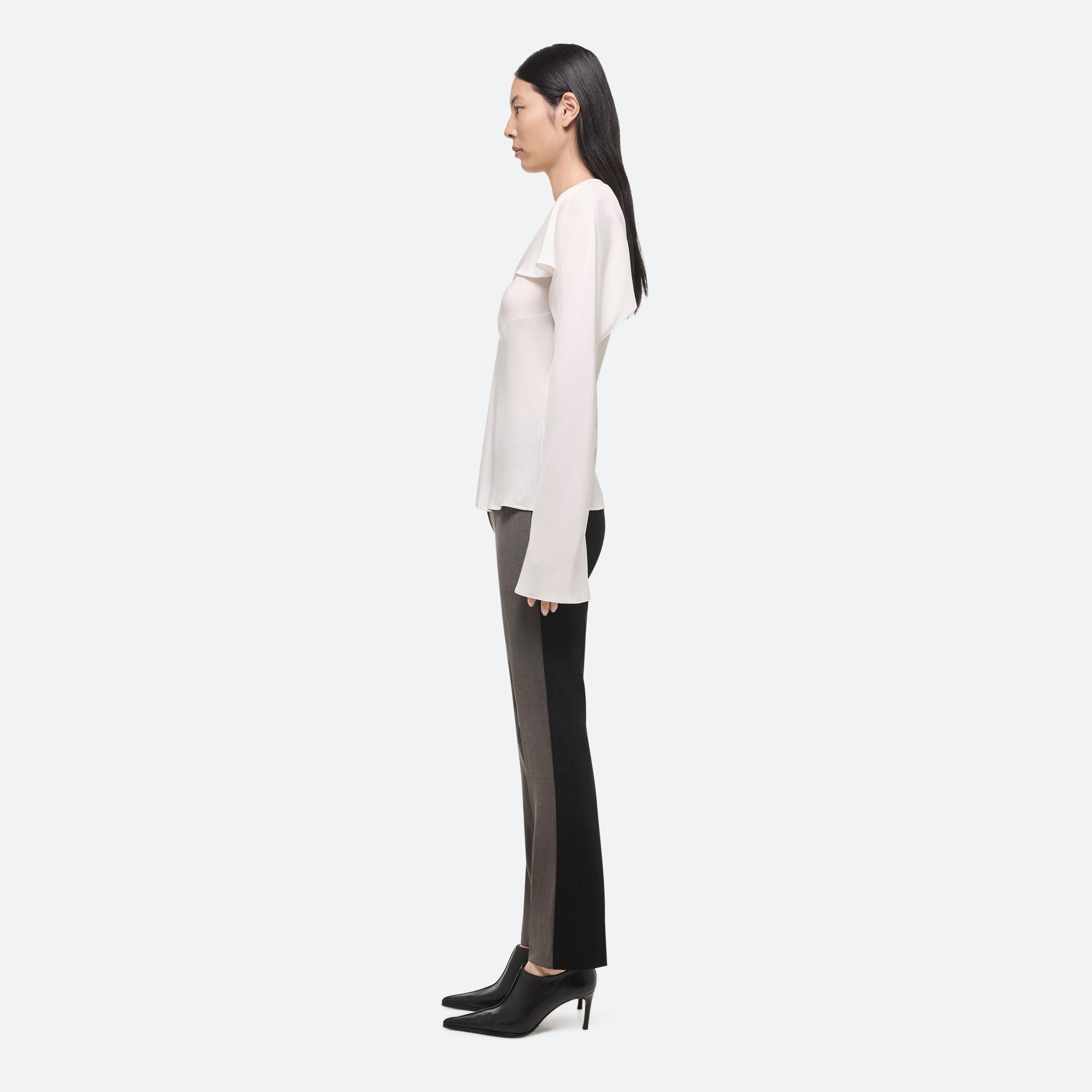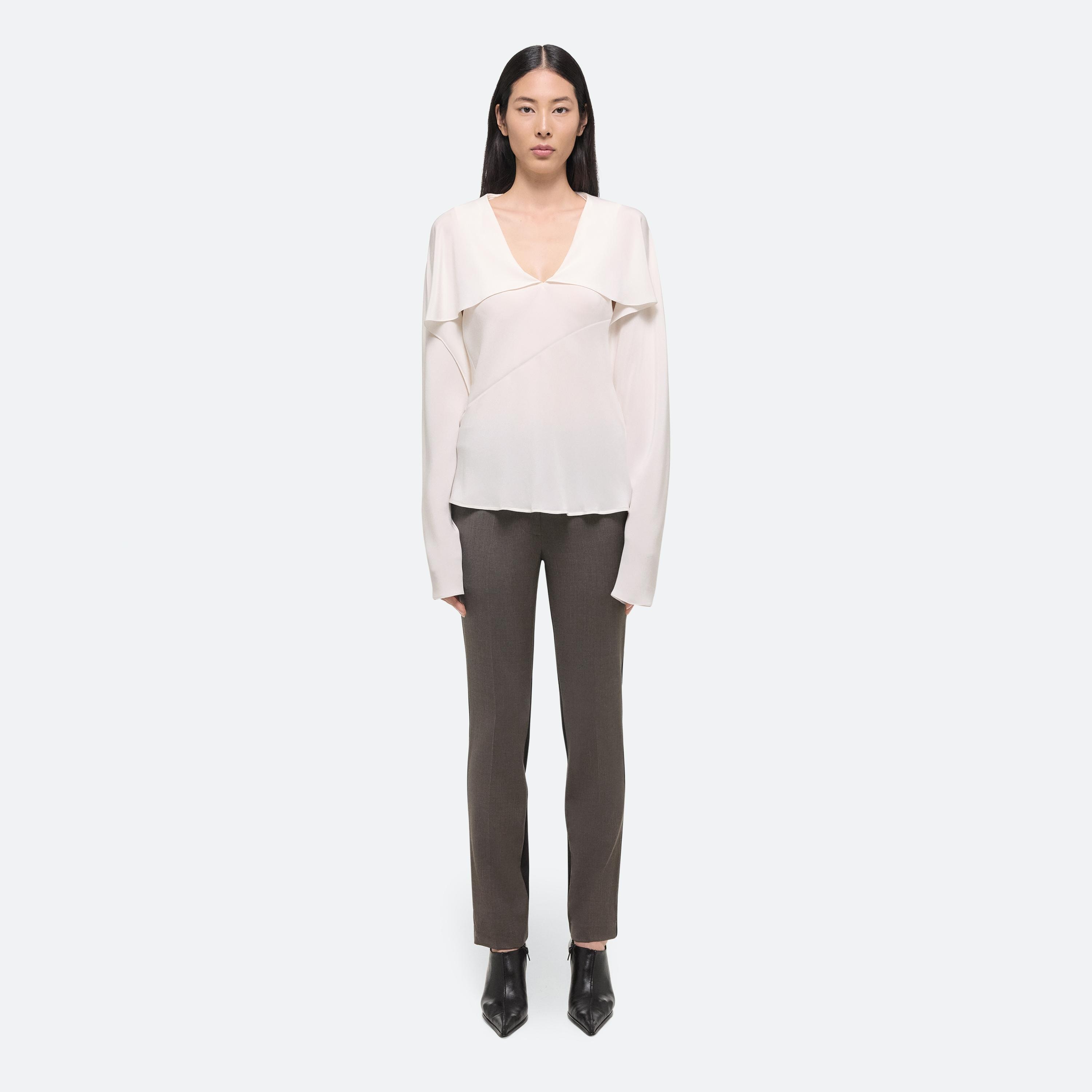 Bias-cut blouse in silk crepe de chine, with draped sleeves attached at the neckline. Unbutton to wear the sleeves loose like a cape, or wrapped as a scarf.