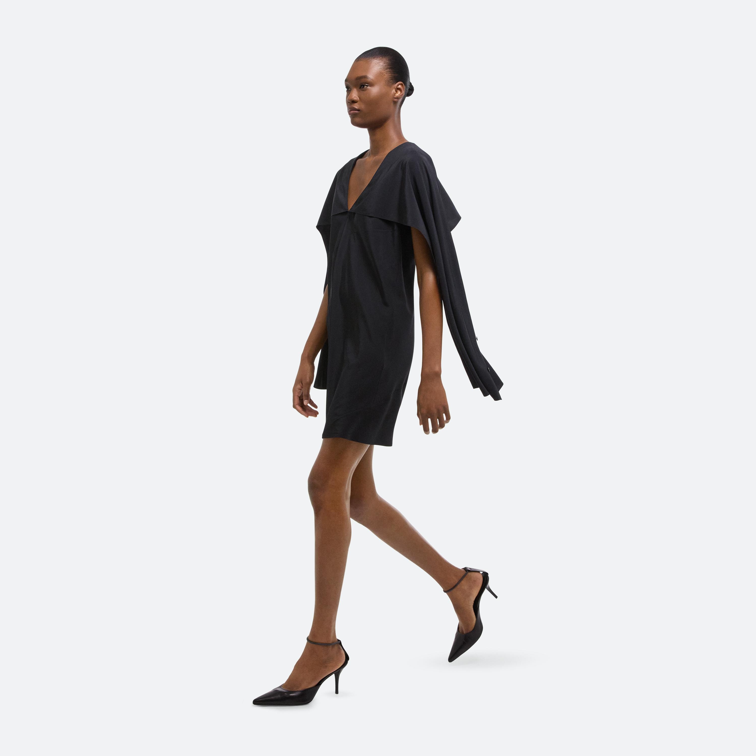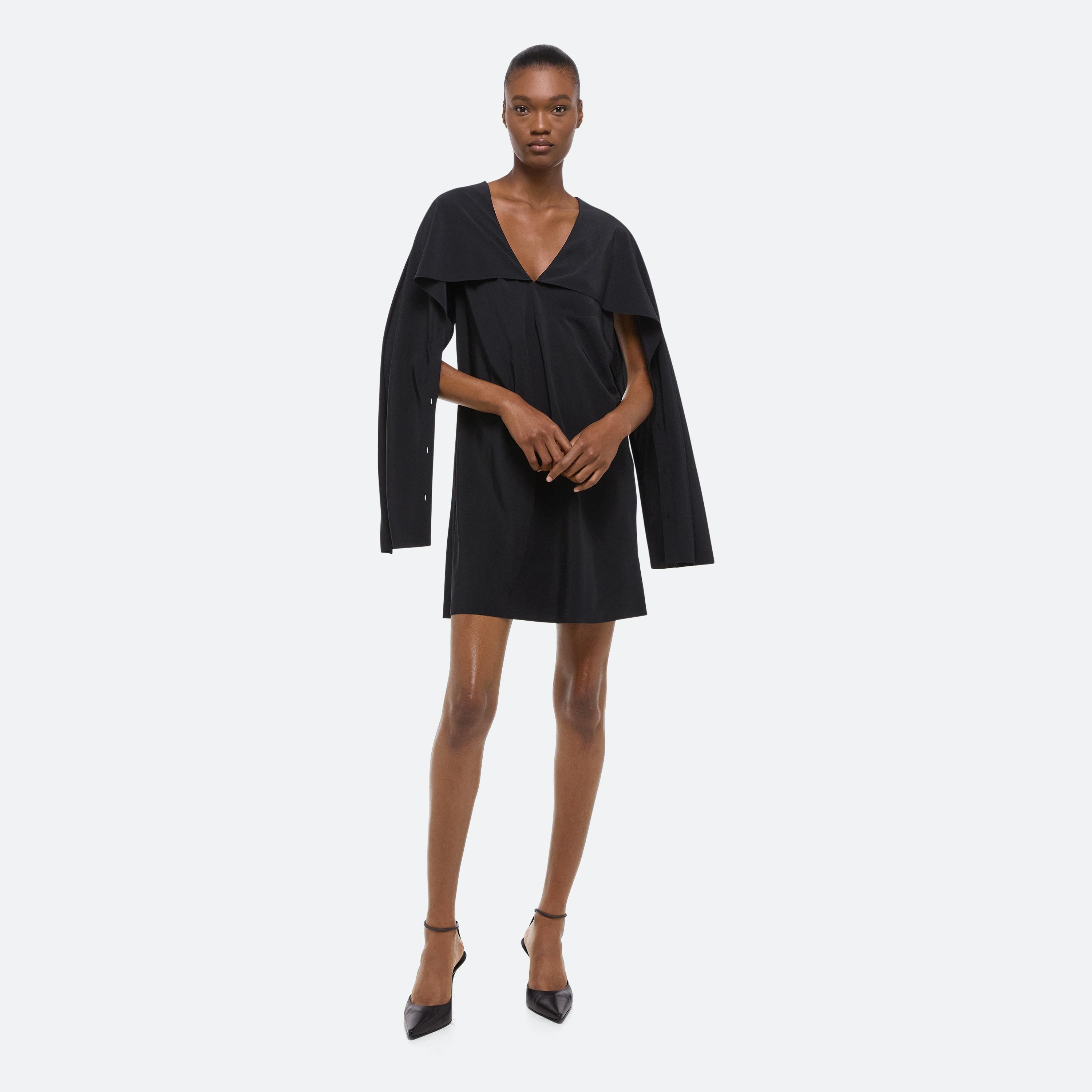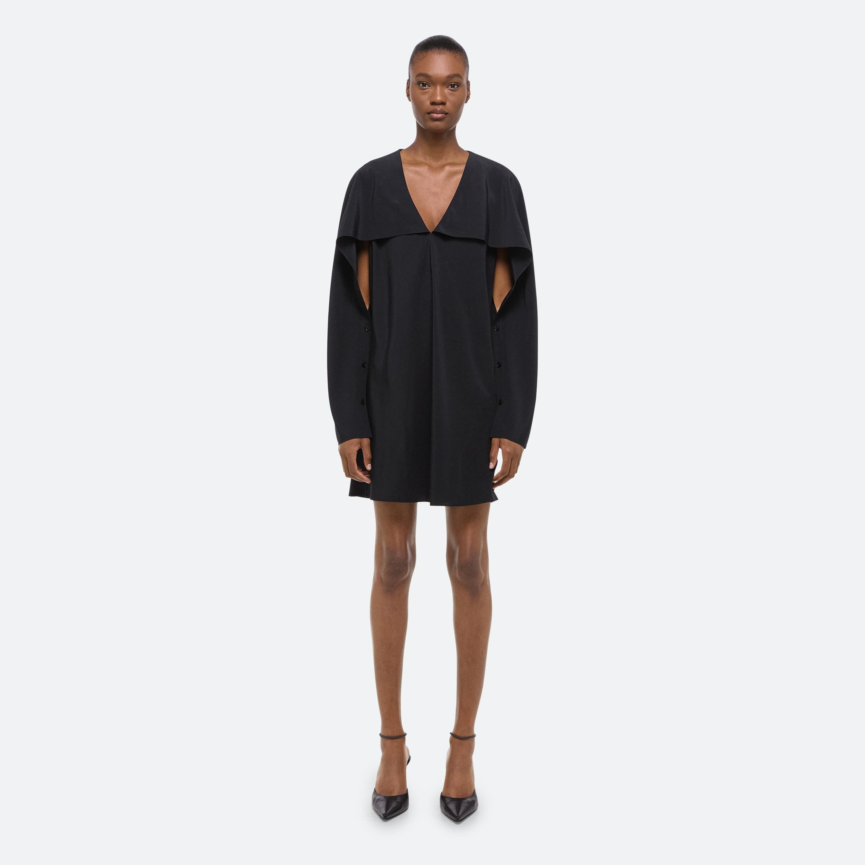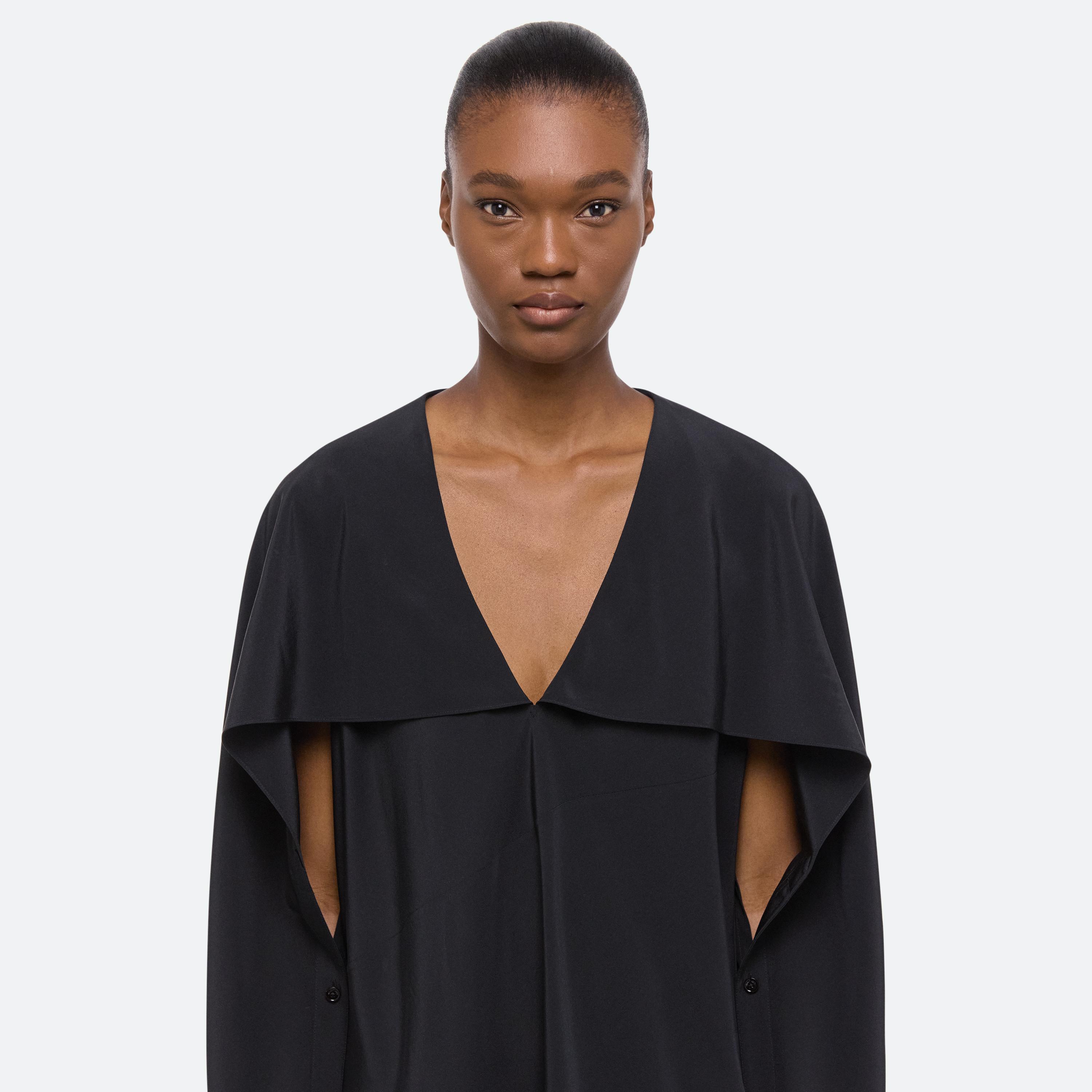 Bias-cut dress in silk crepe de chine, with draped sleeves attached at the neckline. Unbutton to wear the sleeves loose like a cape, or wrapped as a scarf.