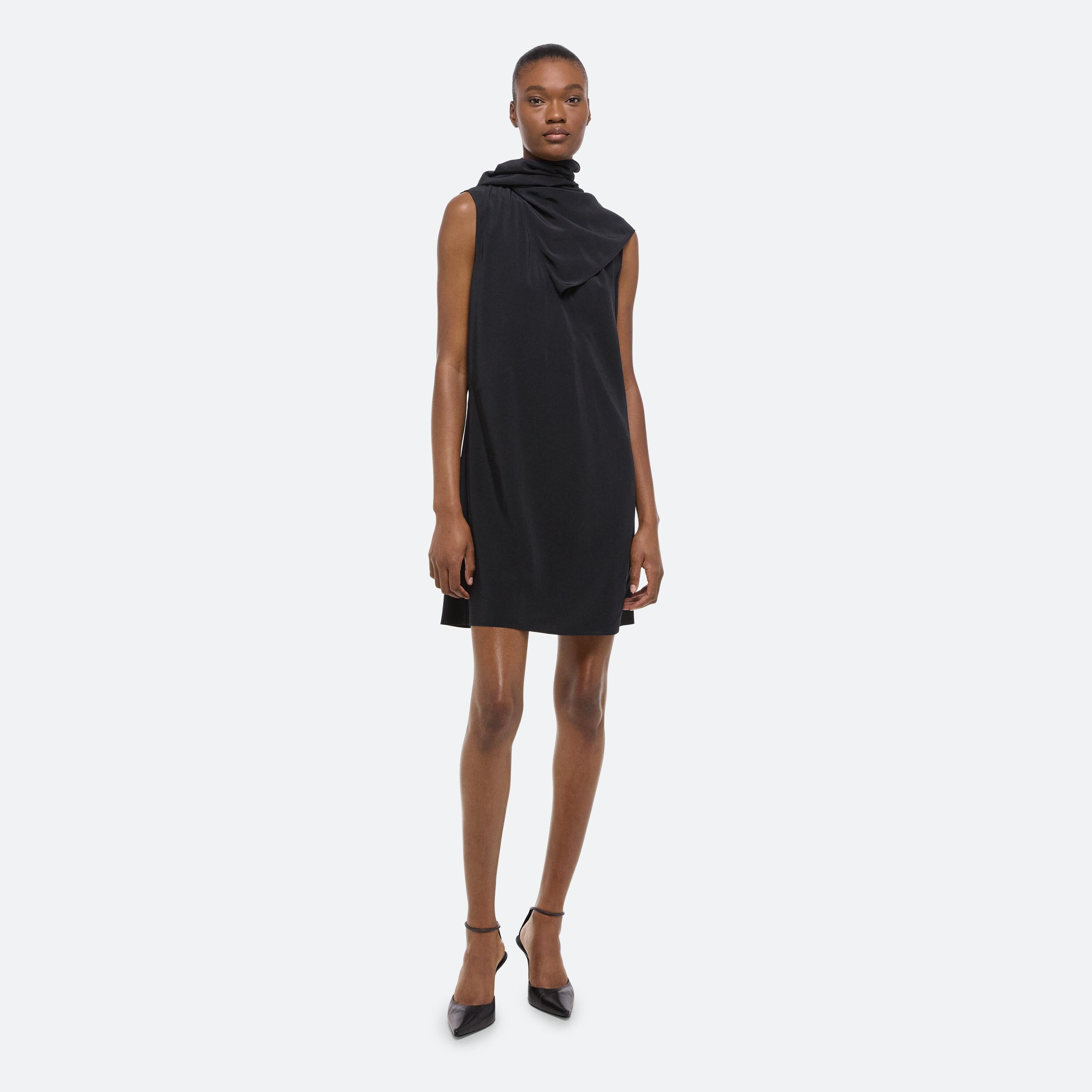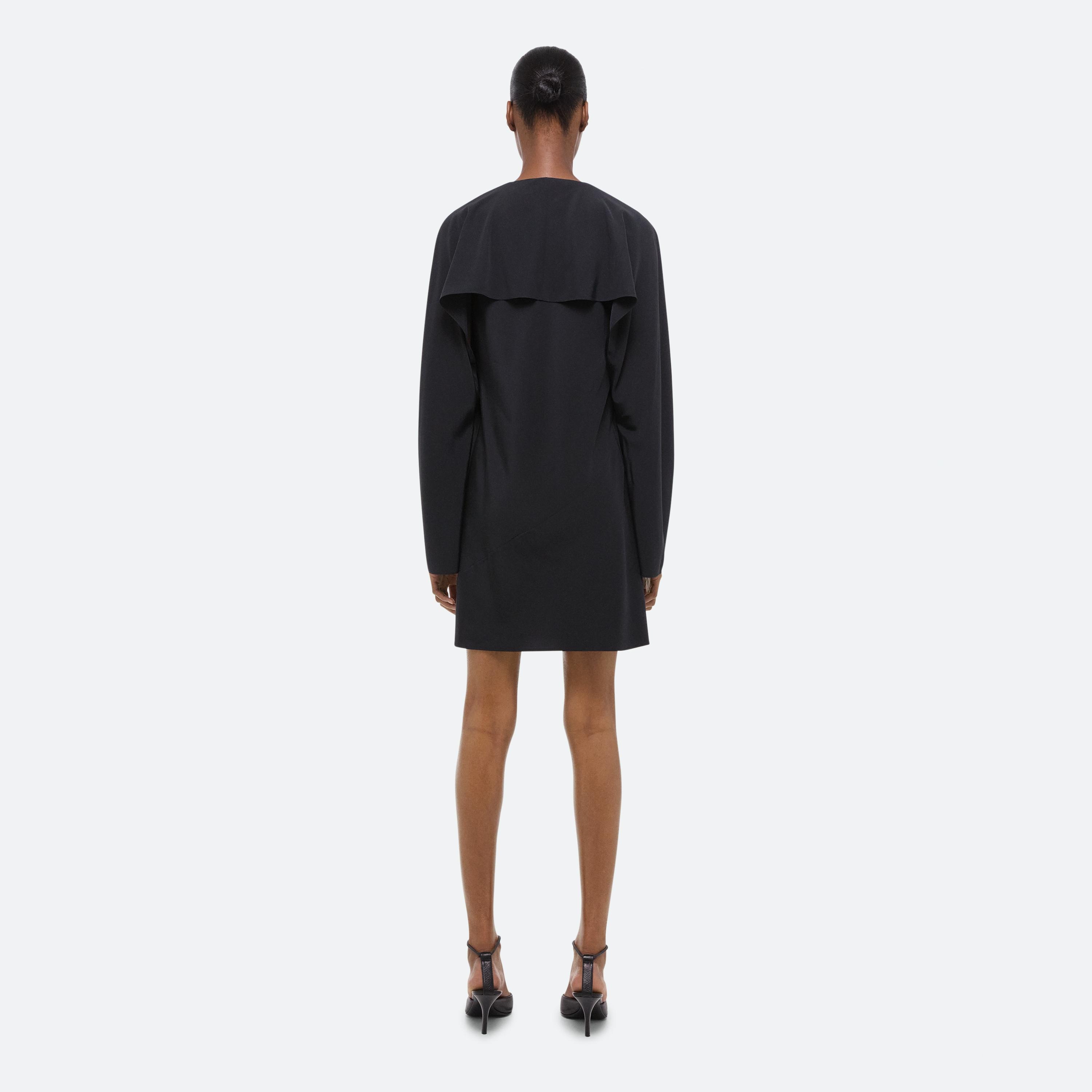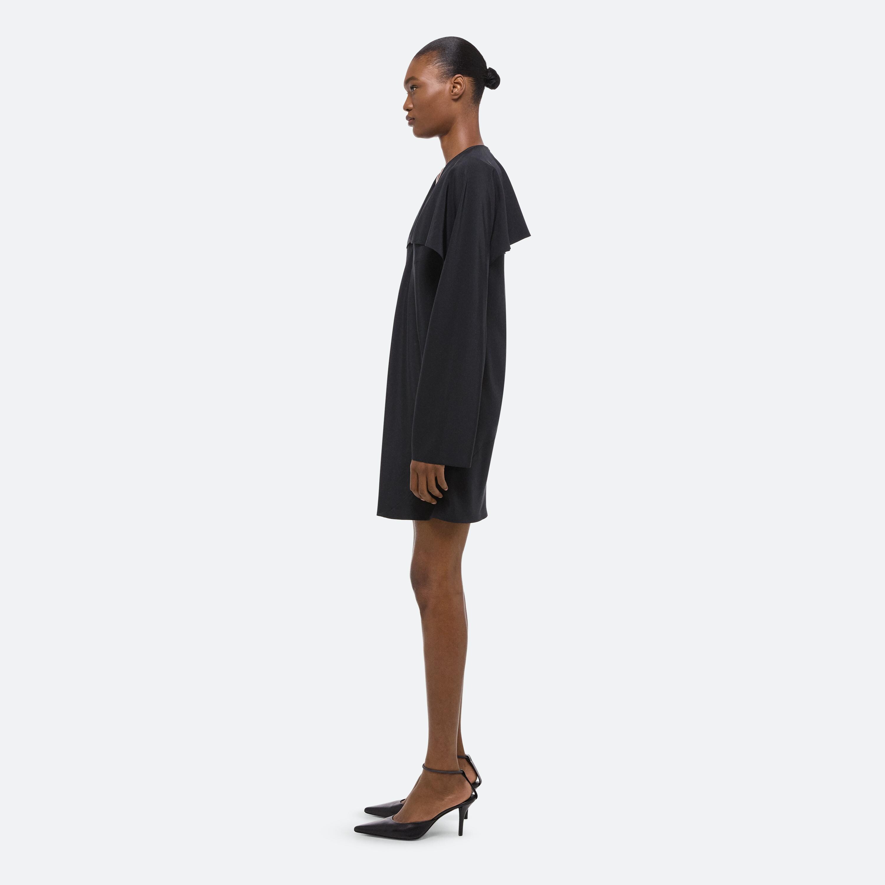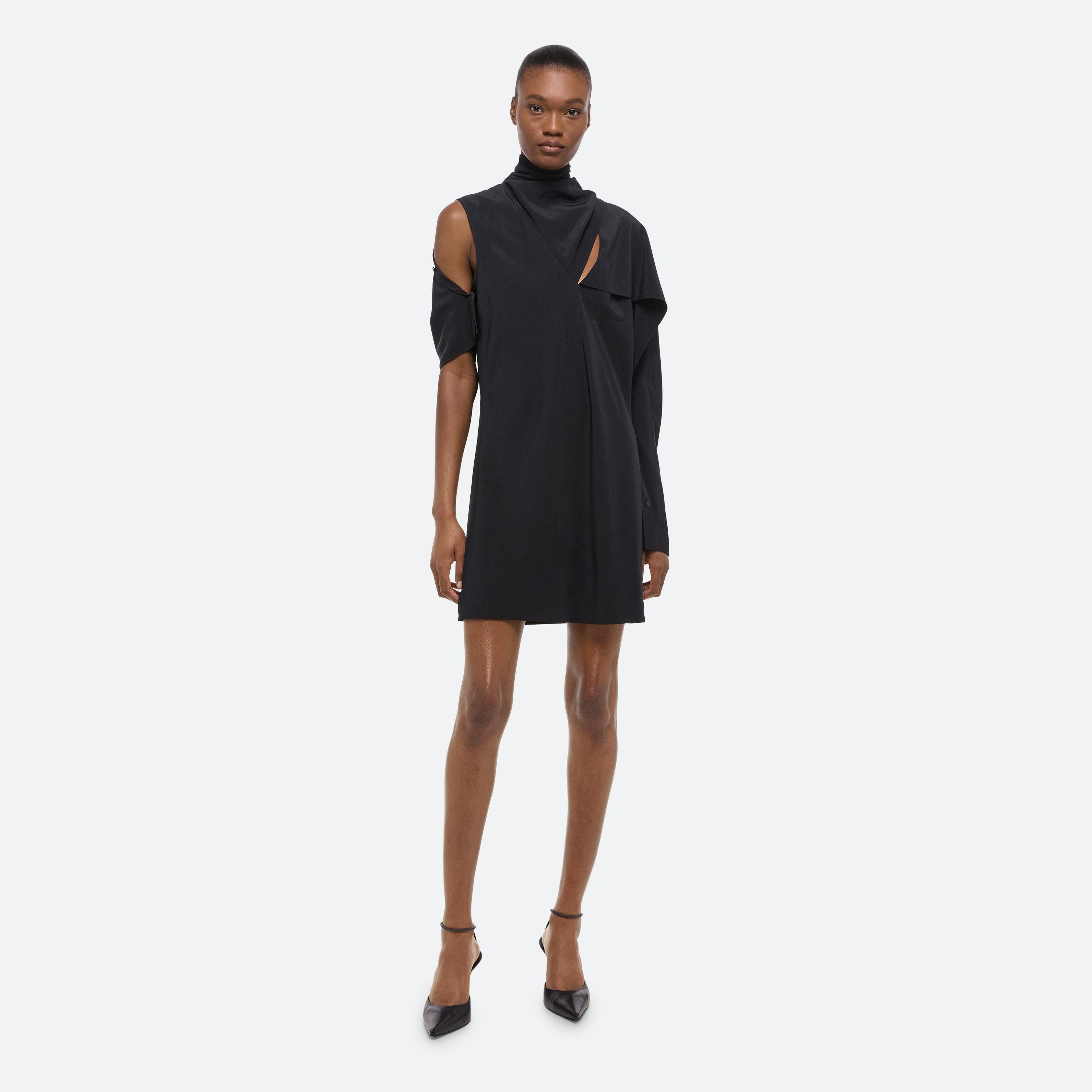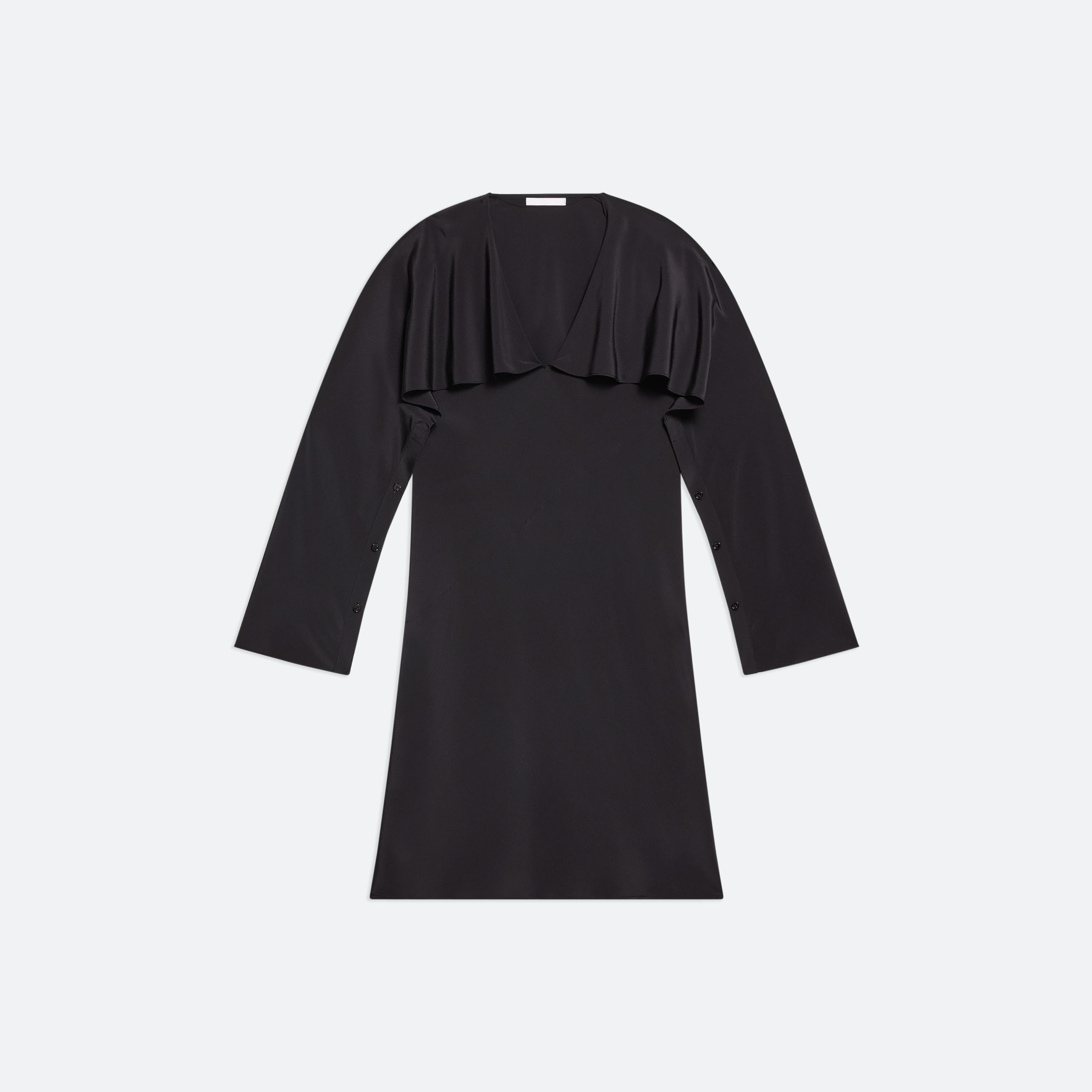 Bias-cut dress in silk crepe de chine, with draped sleeves attached at the neckline. Unbutton to wear the sleeves loose like a cape, or wrapped as a scarf.