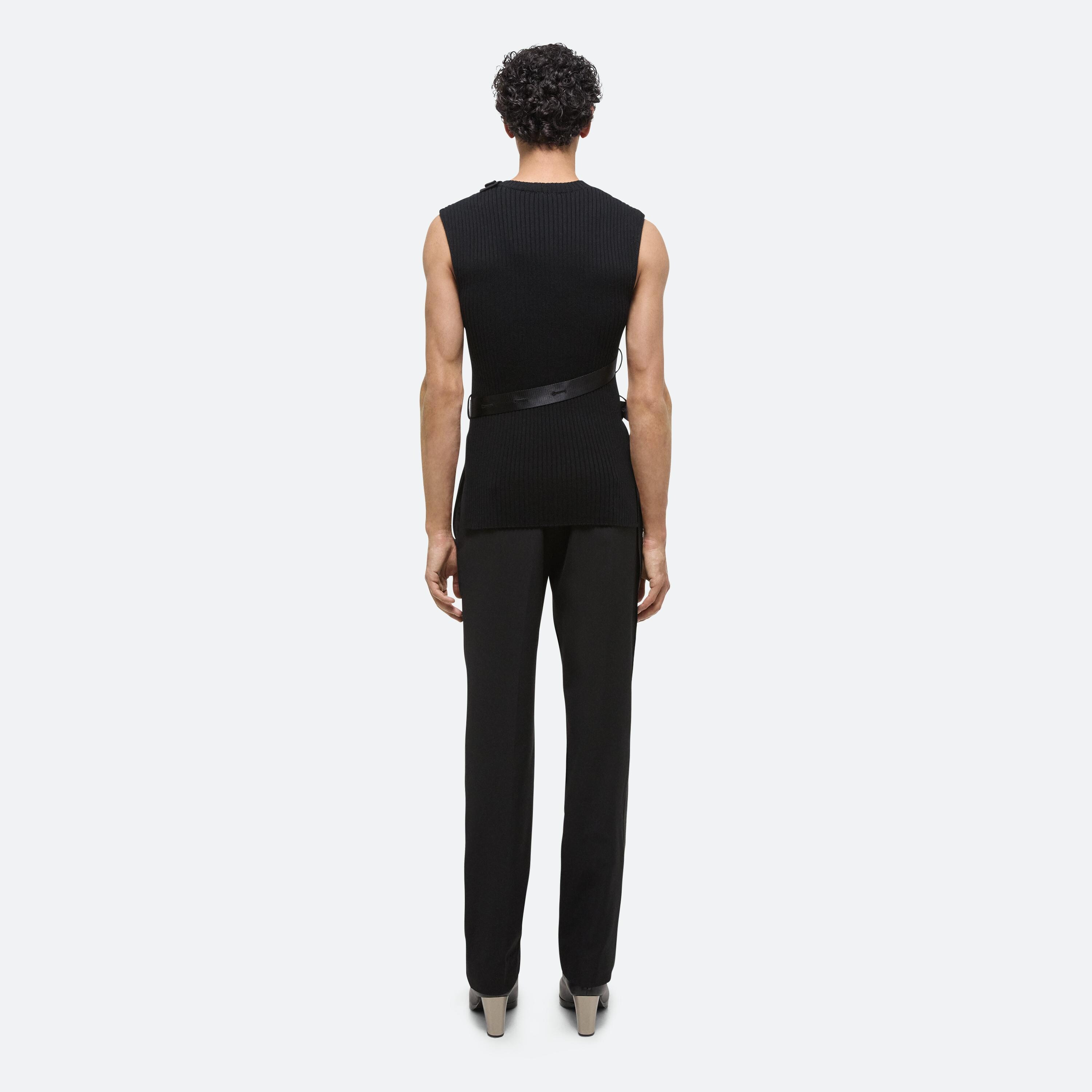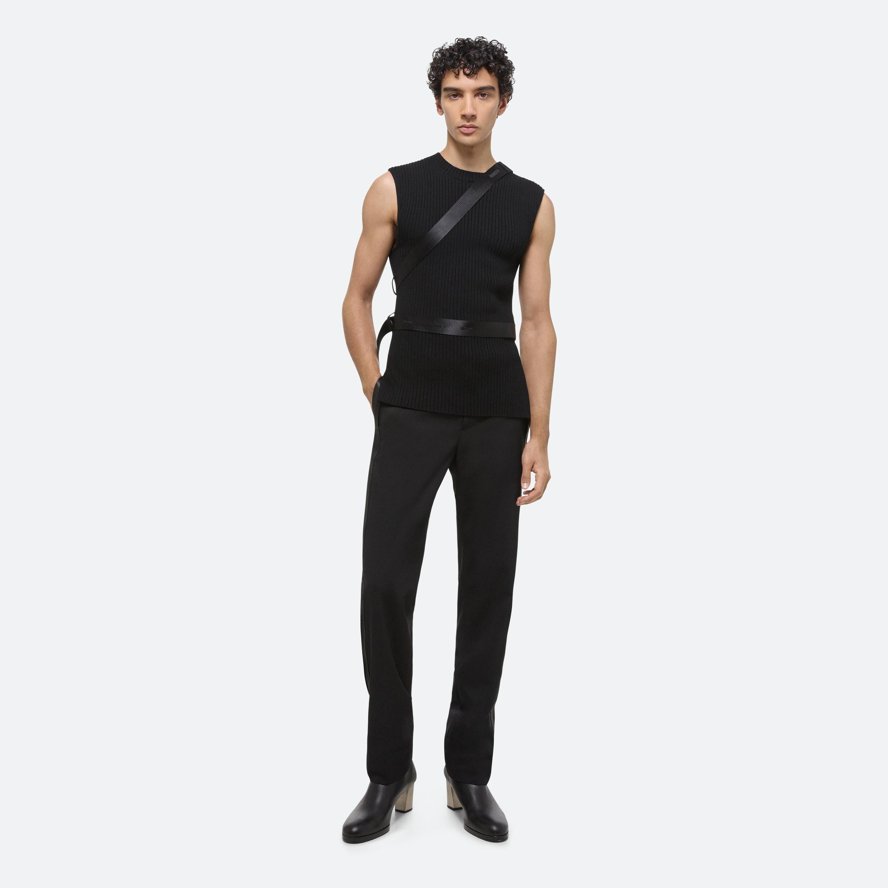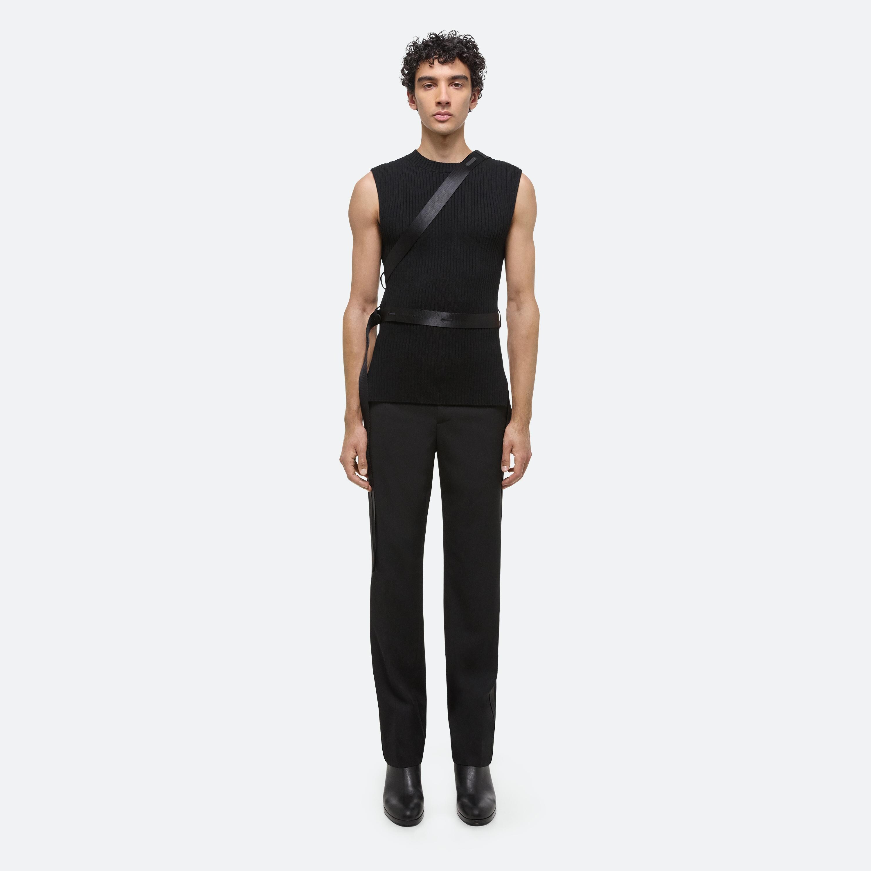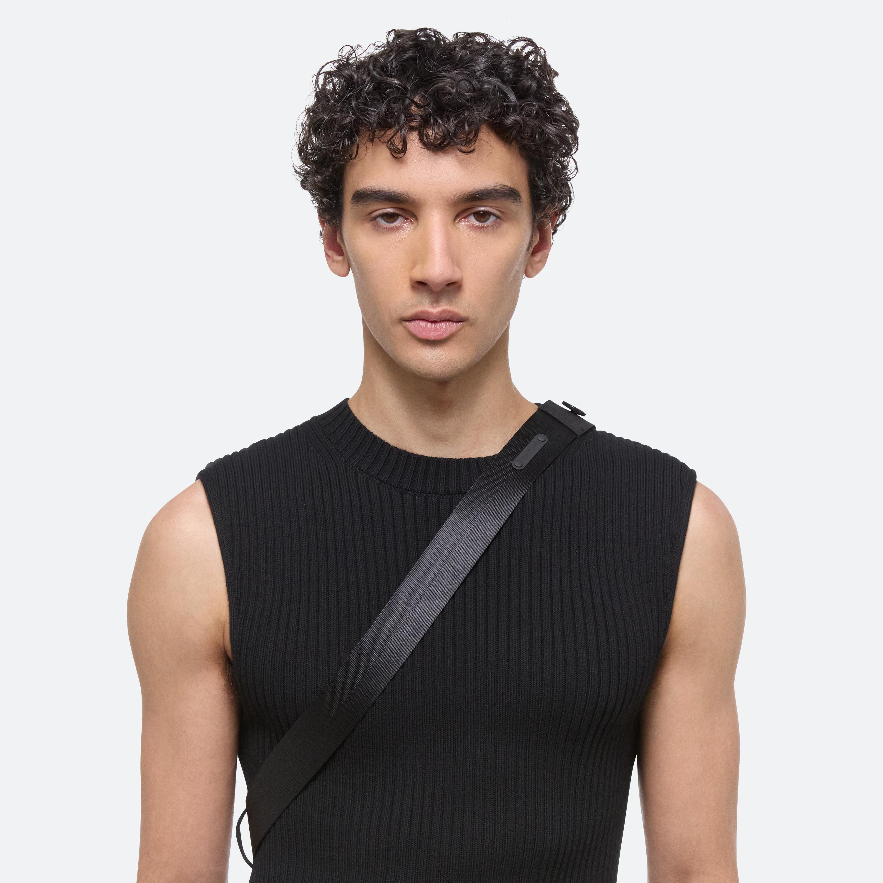 Rib tank with a detachable seatbelt attached at shoulder. Relaxed fit with side slits at the bottom opening. This garment was designed with many body types and gender expressions in mind.