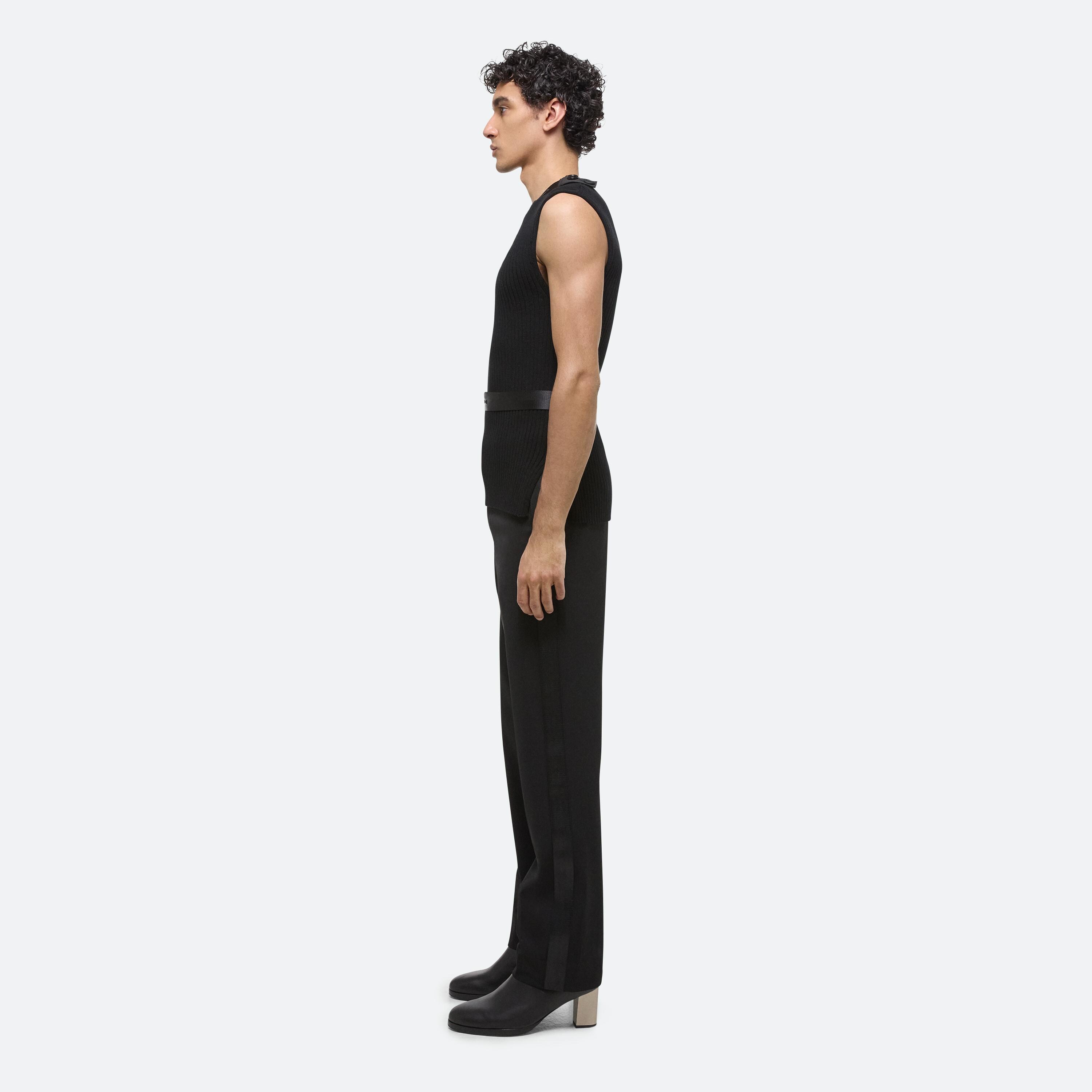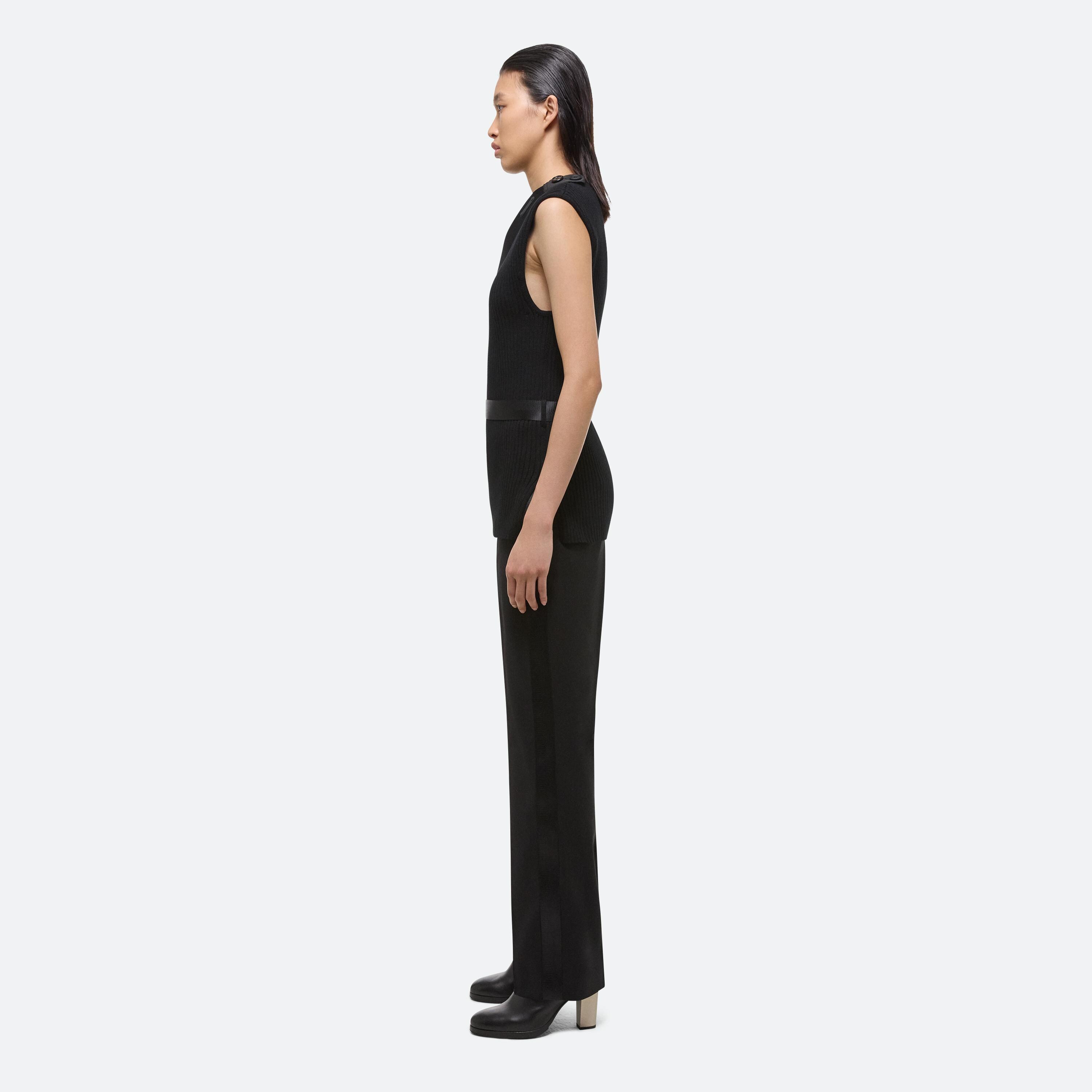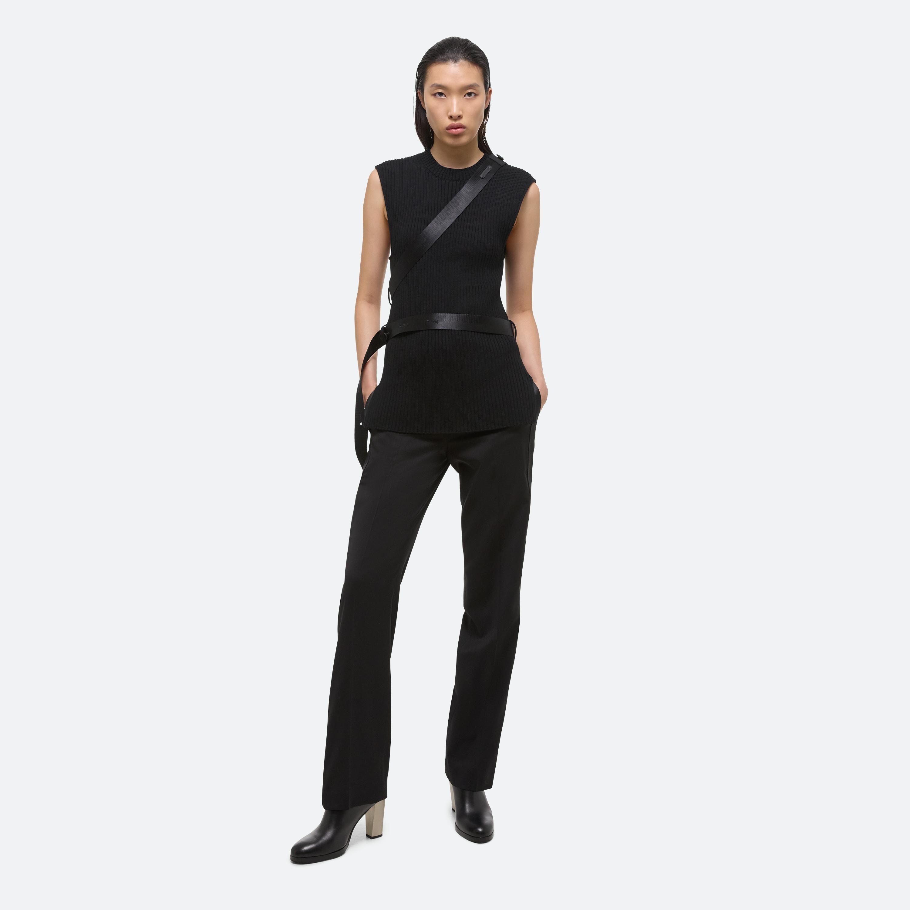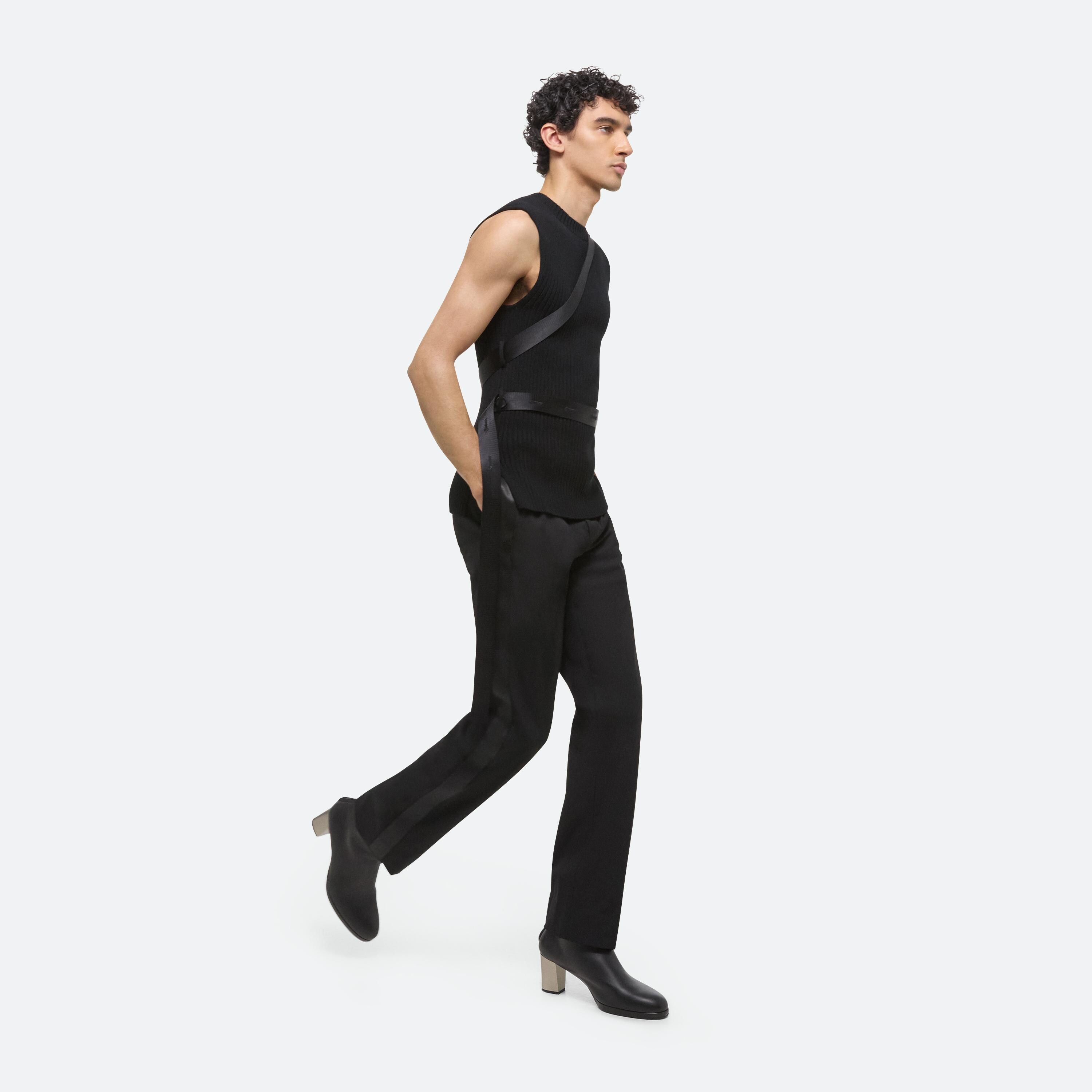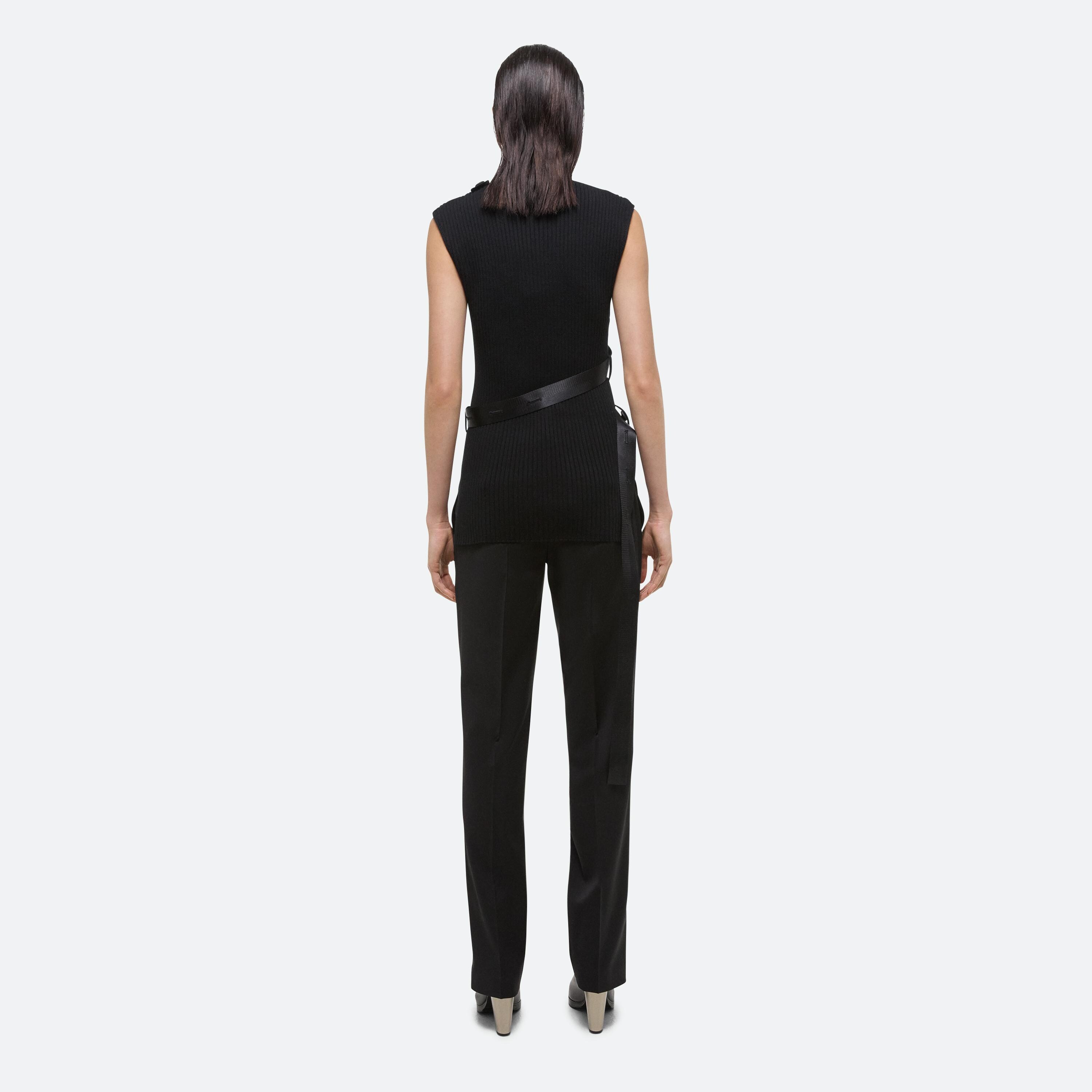 Rib tank with a detachable seatbelt attached at shoulder. Relaxed fit with side slits at the bottom opening. This garment was designed with many body types and gender expressions in mind.