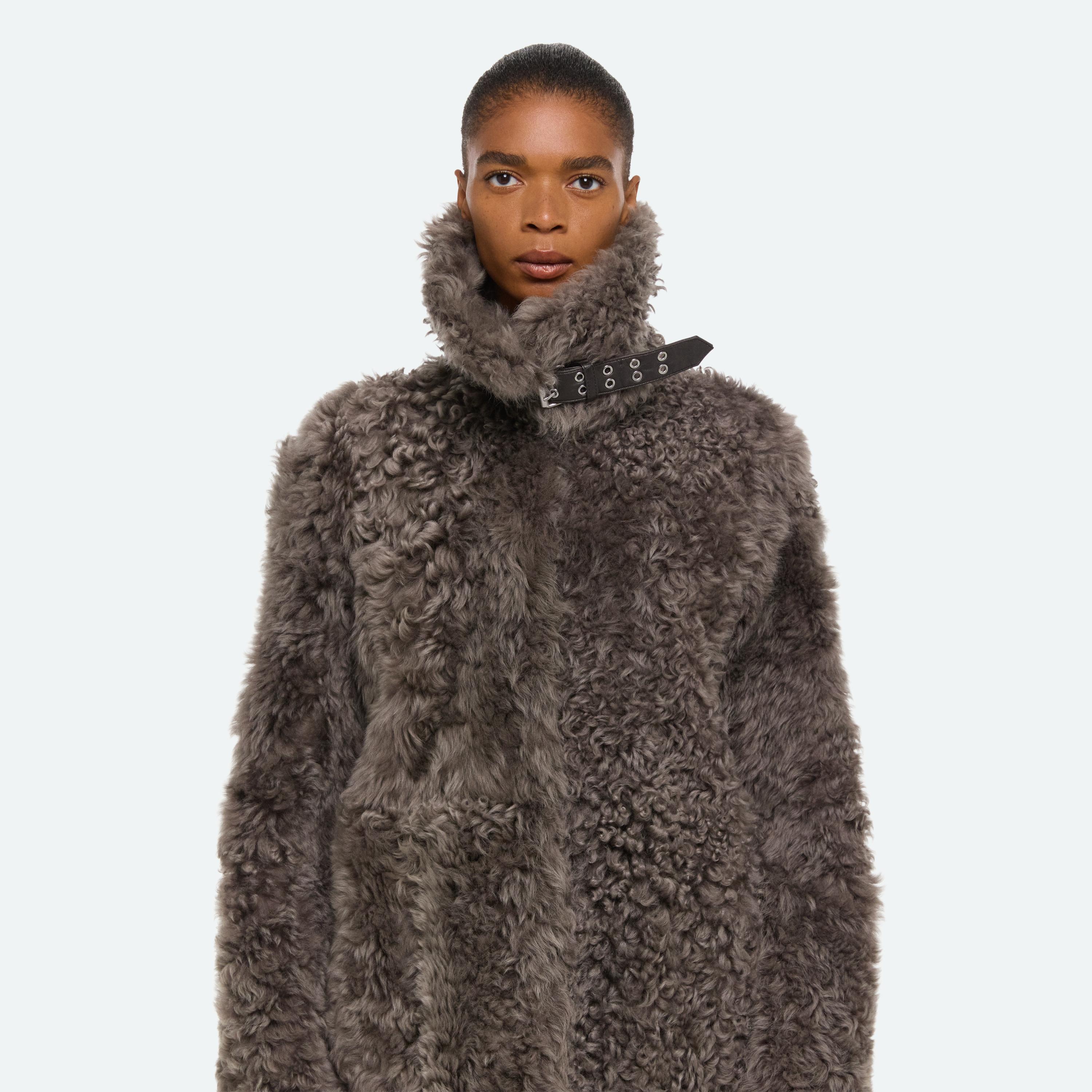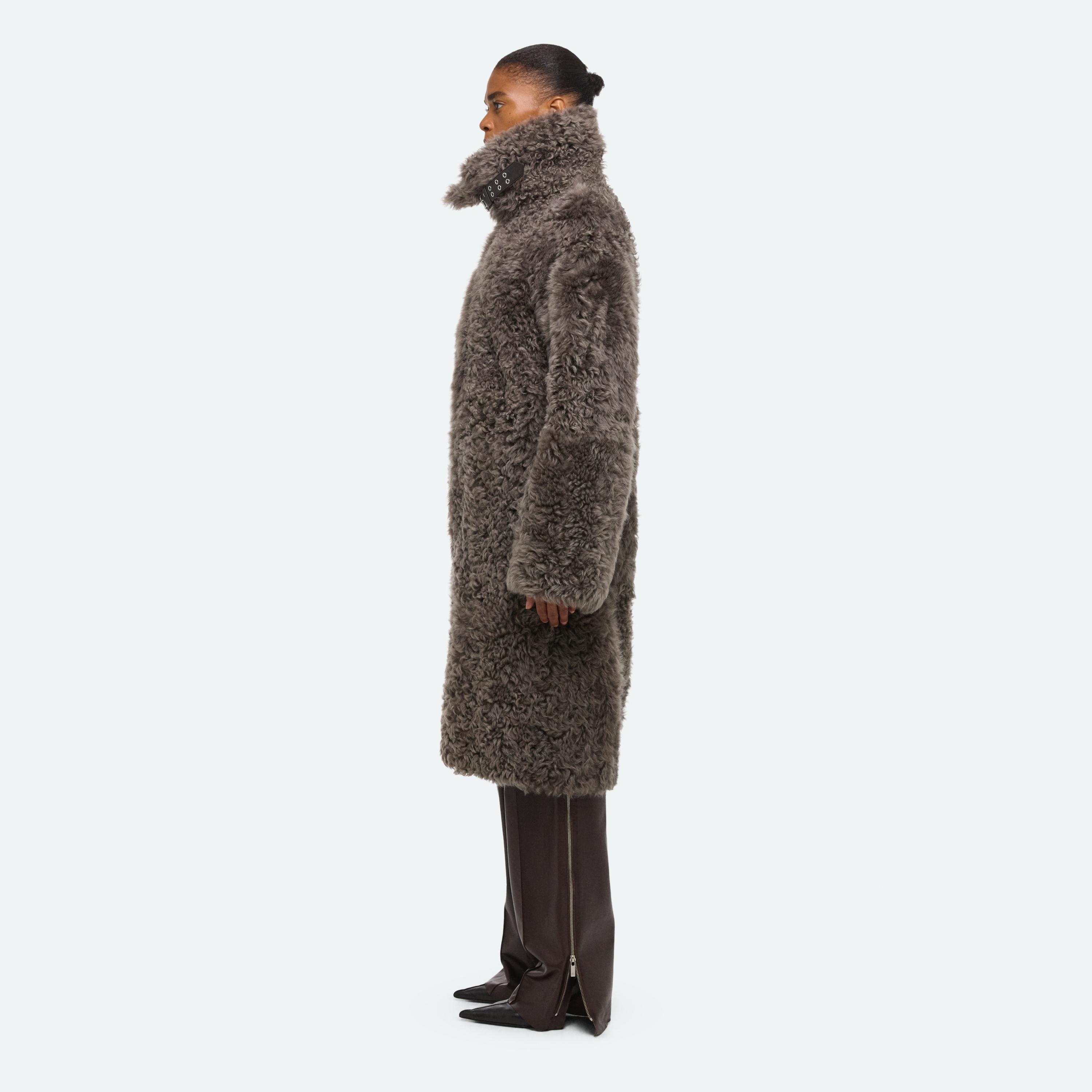 Reversible coat in natural curly shearling with buckle detail on collar.