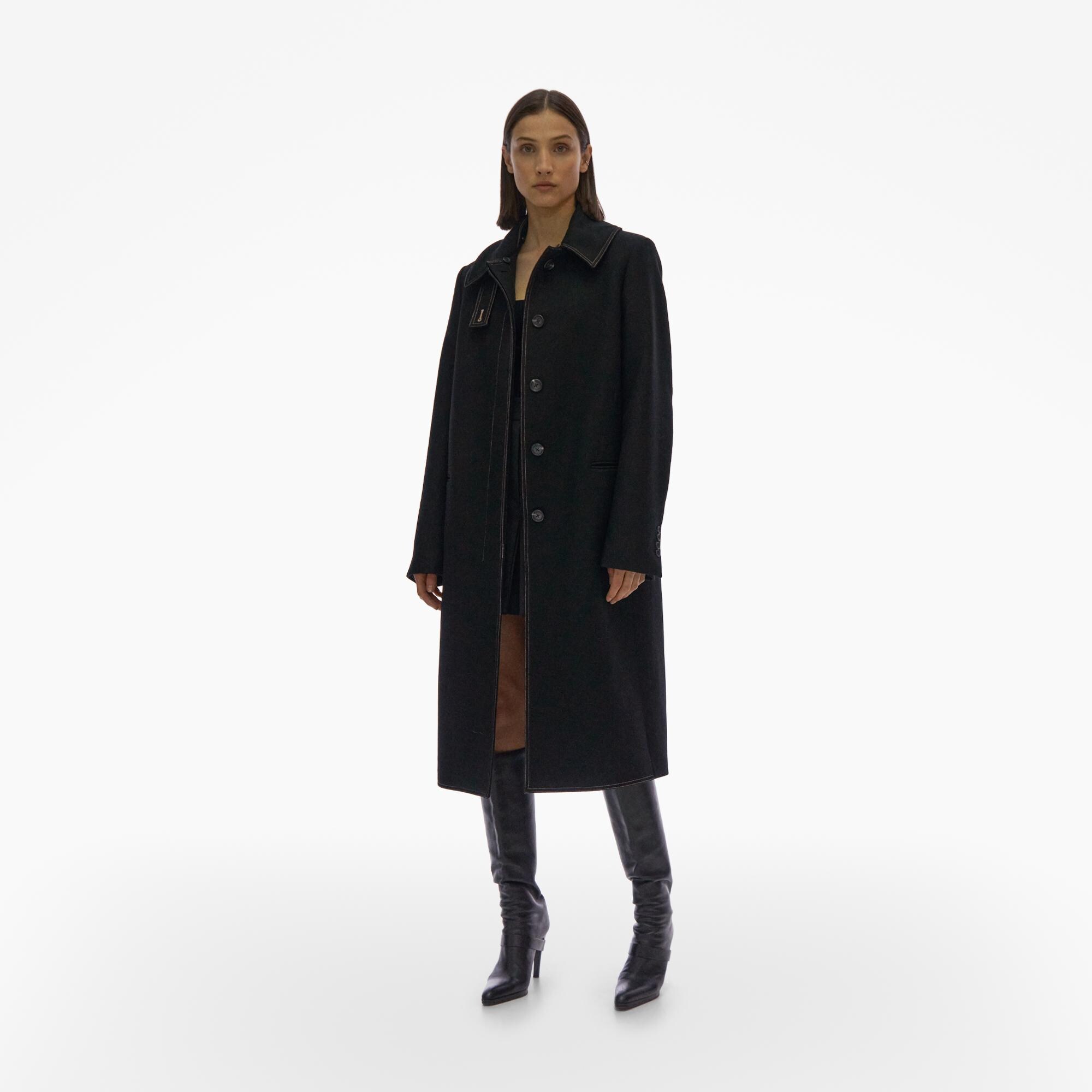 The Helmut Lang Coat is a long style in wool with a detachable shearling collar, welt pockets, button front closures and back vent.