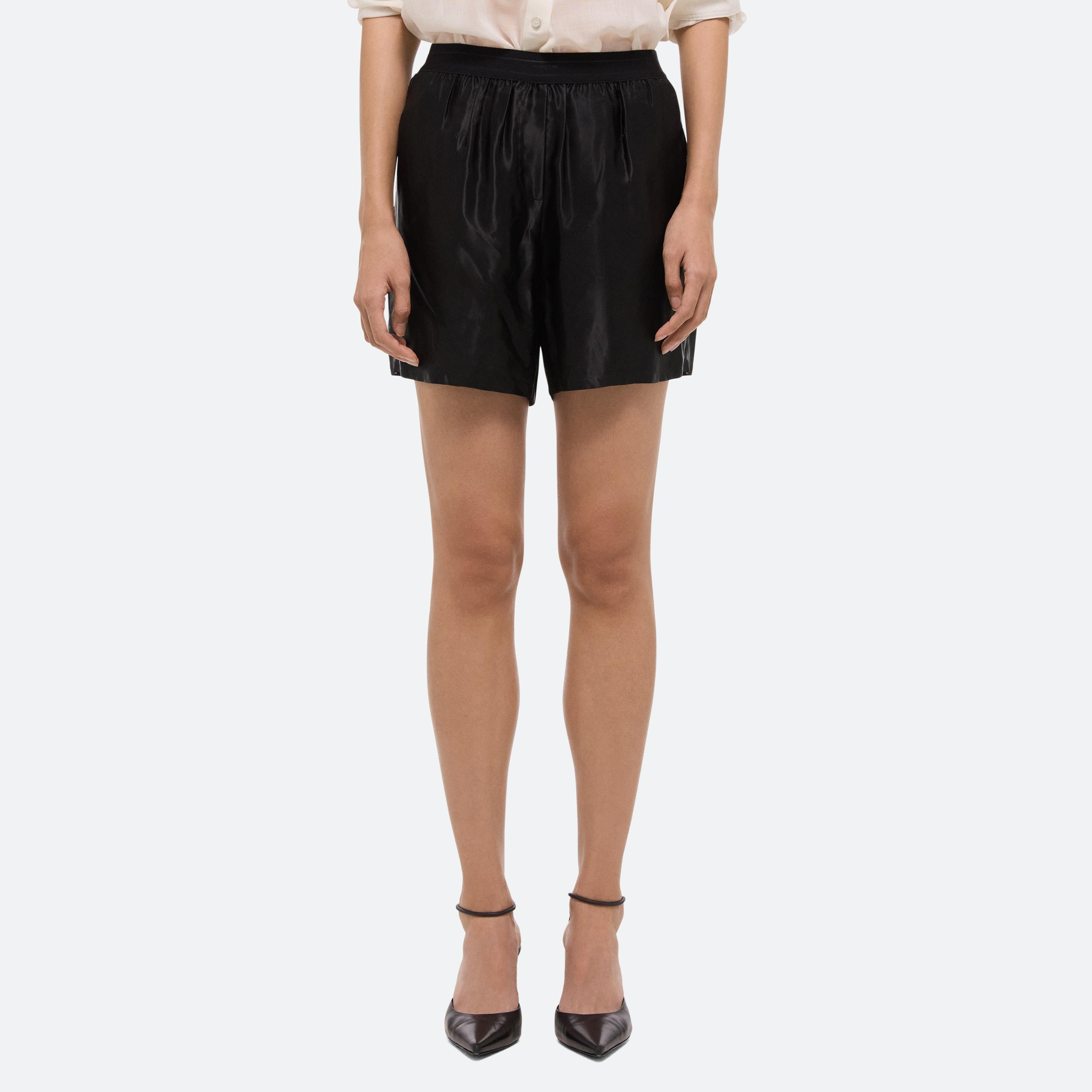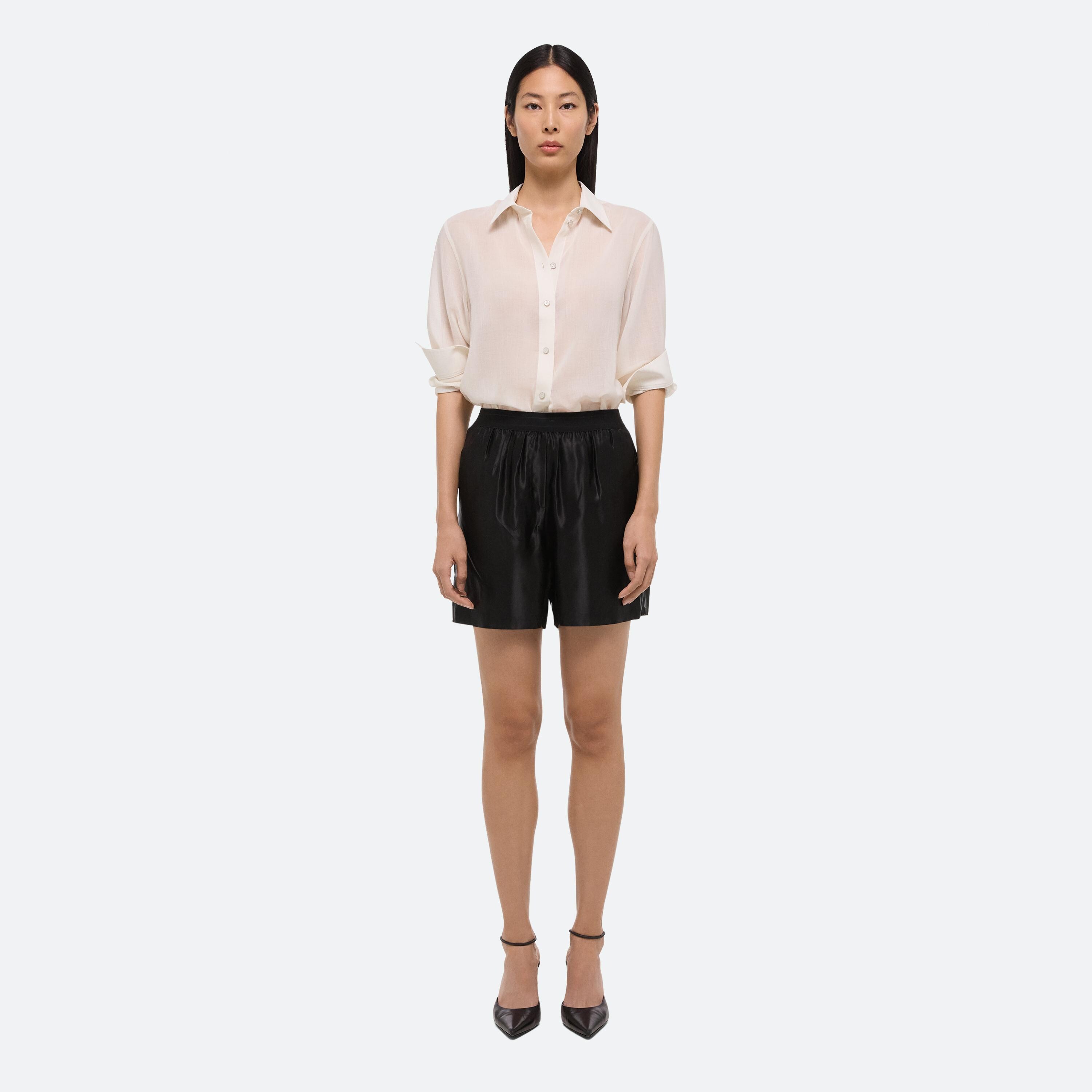 Relaxed trouser with double pleats at front in lightweight wool chiffon. Includes detachable tonal boxers with logo waistband. Matches the Sheer Classic Shirt.