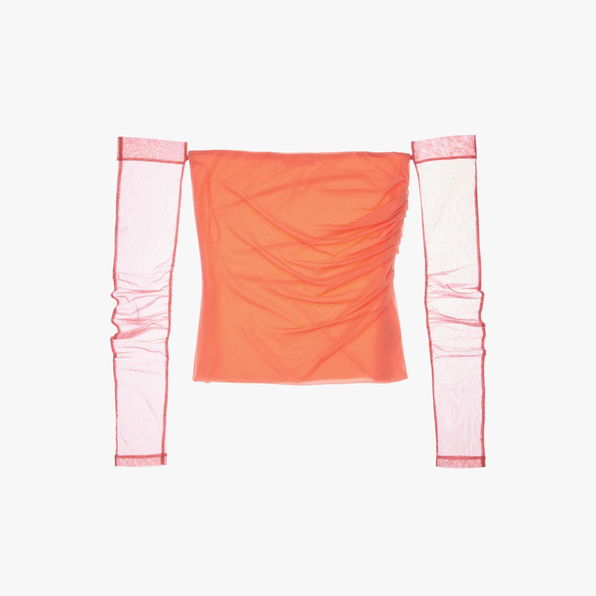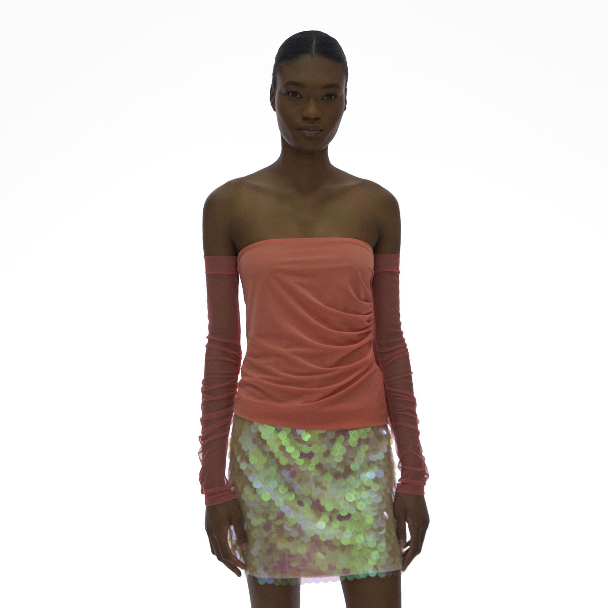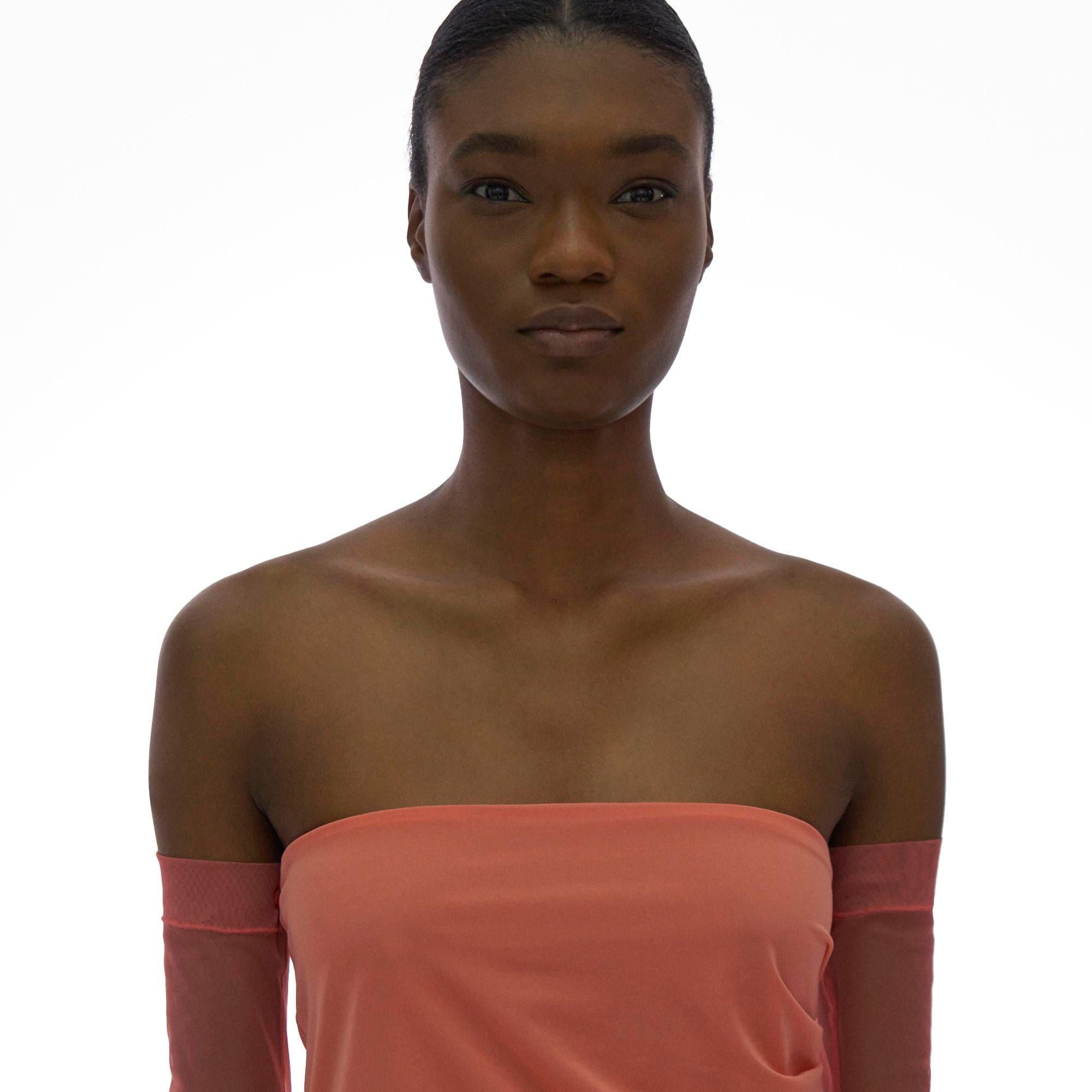 The Helmut Lang Off-the-Shoulder Top is a tube top with optional ruched sheer sleeves.