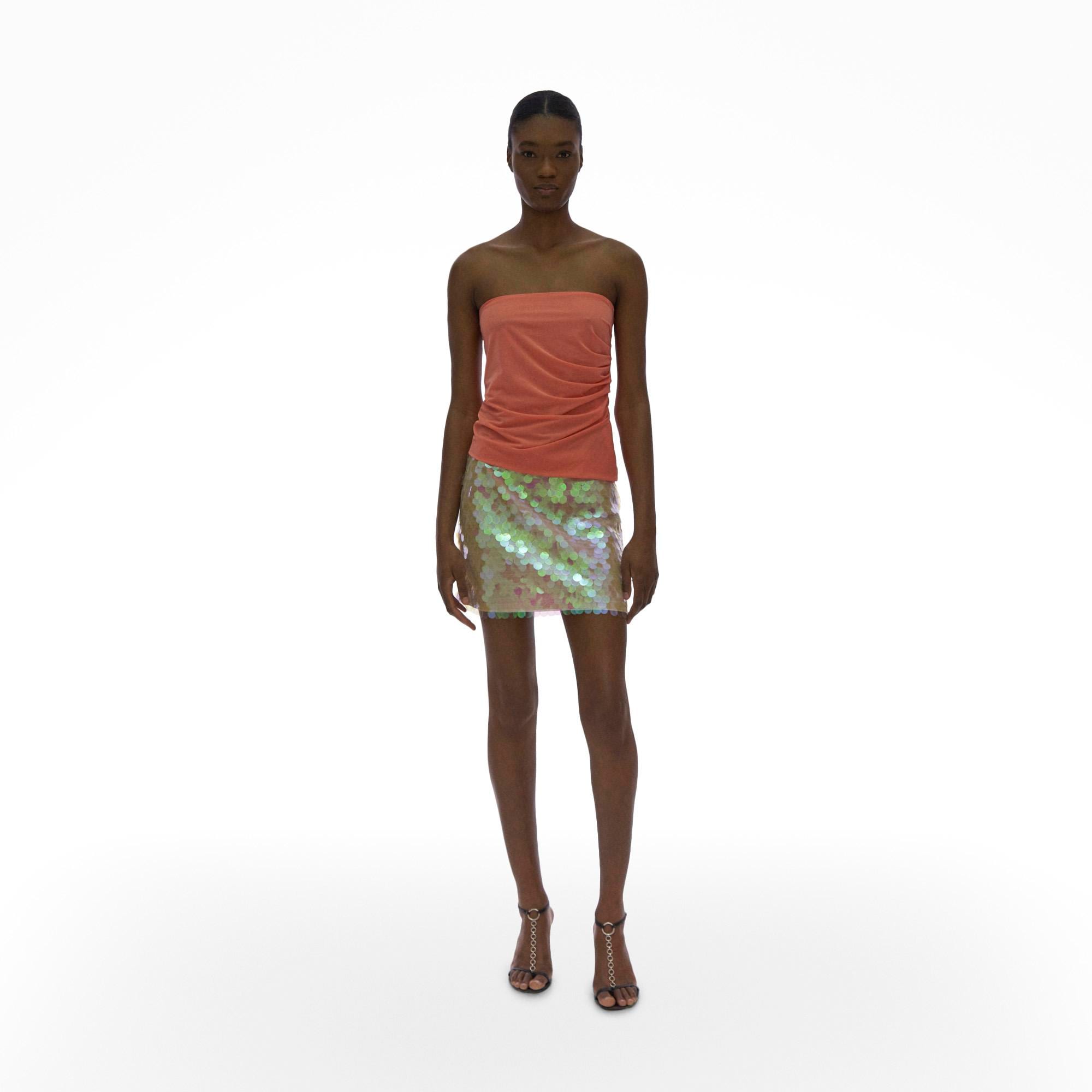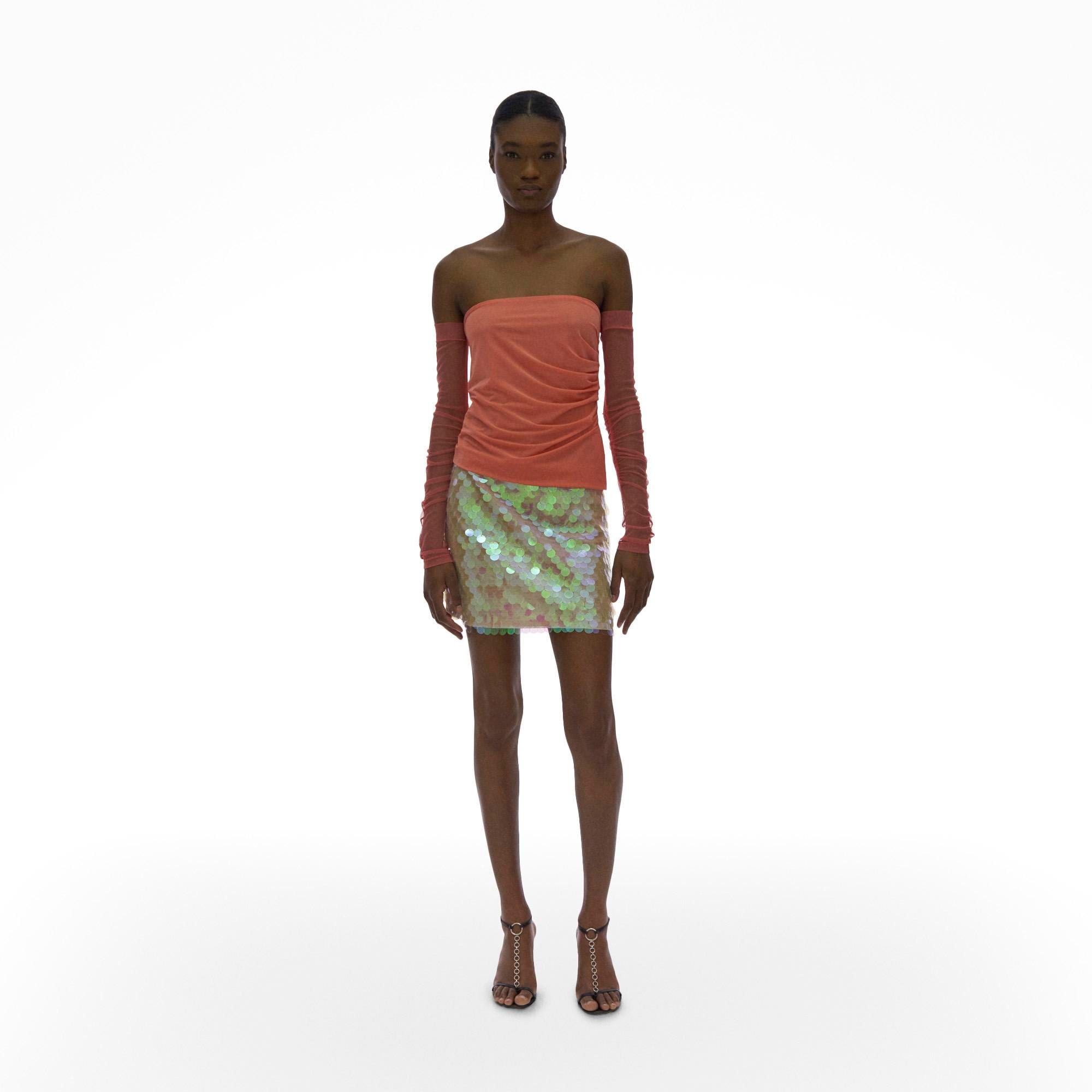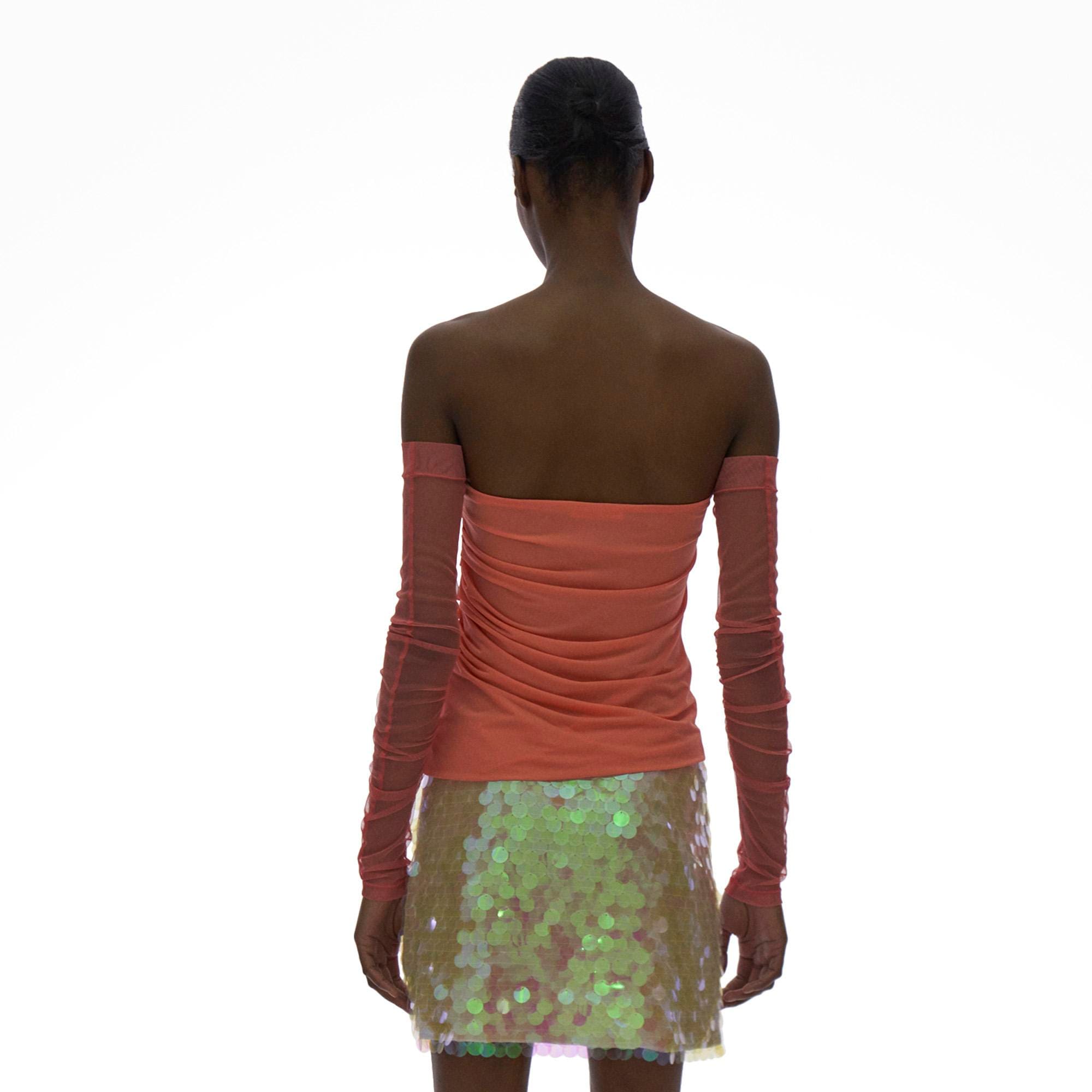 The Helmut Lang Off-the-Shoulder Top is a tube top with optional ruched sheer sleeves.