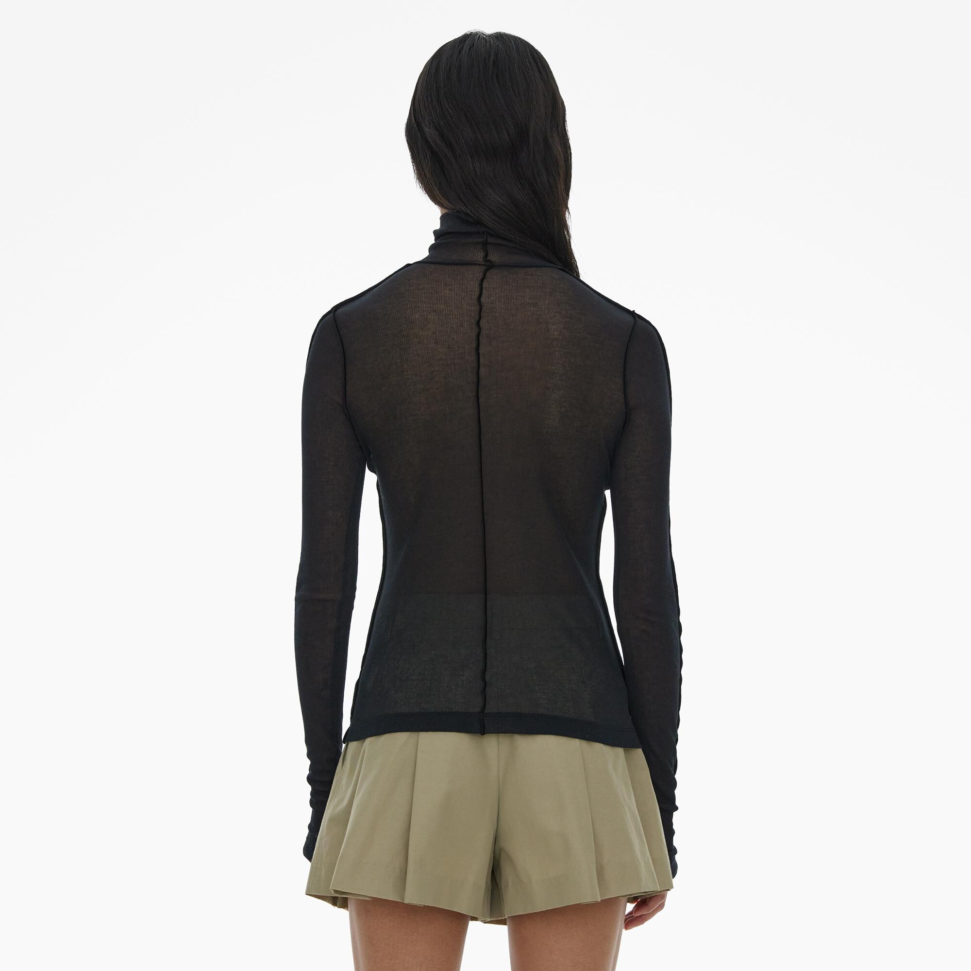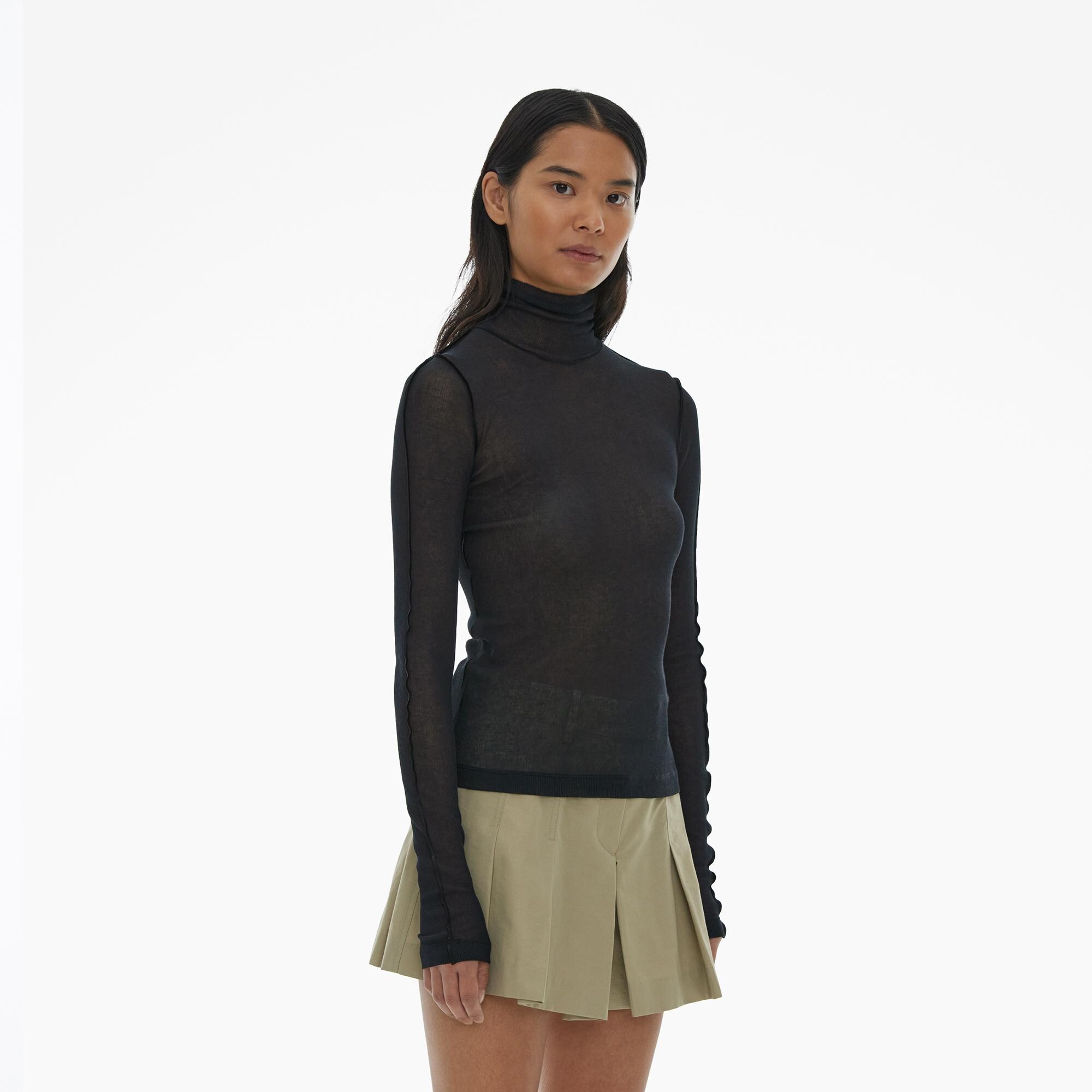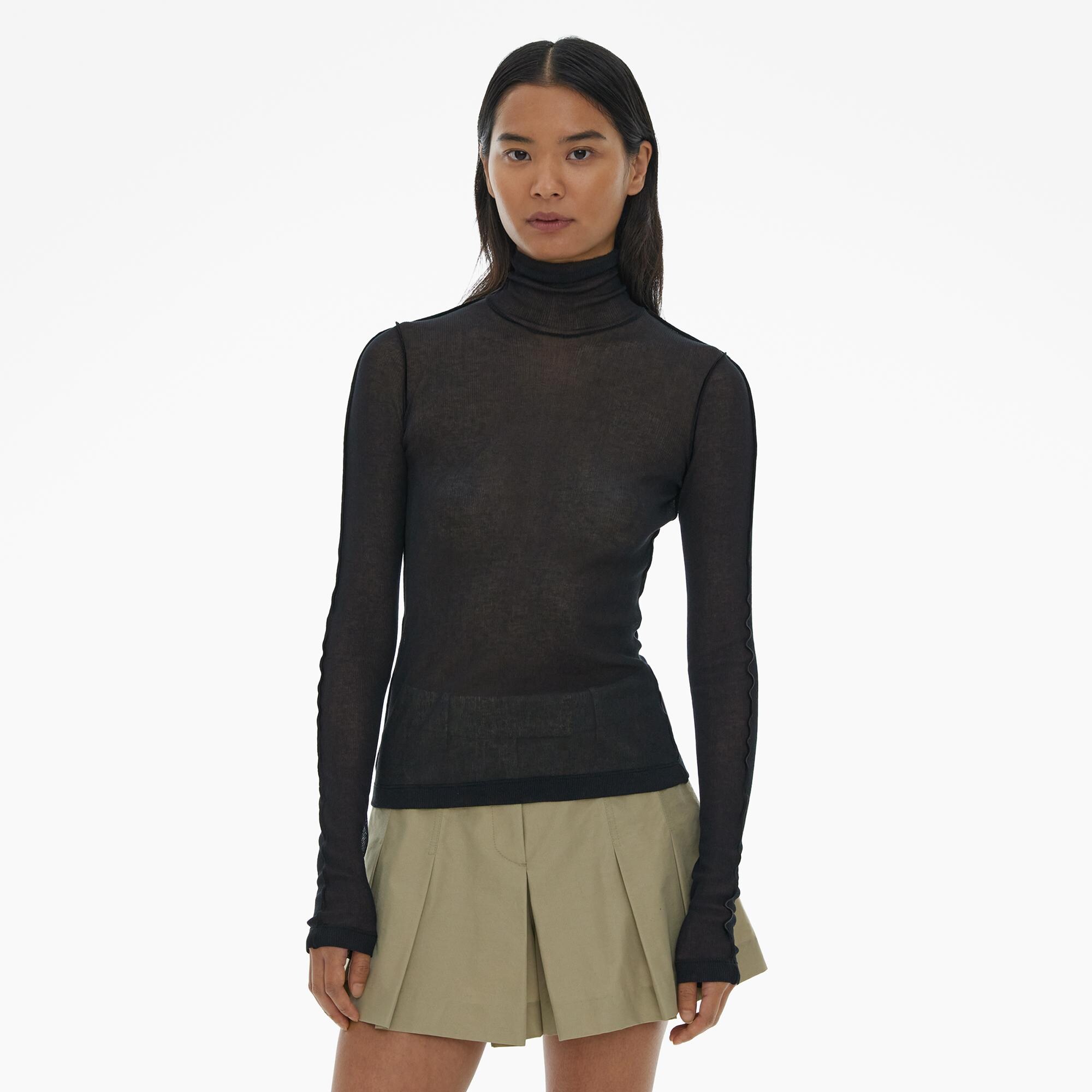 The Helmut Lang Turtleneck is a slim-fitting style in semi-sheer ribbed cotton blend with long sleeves.