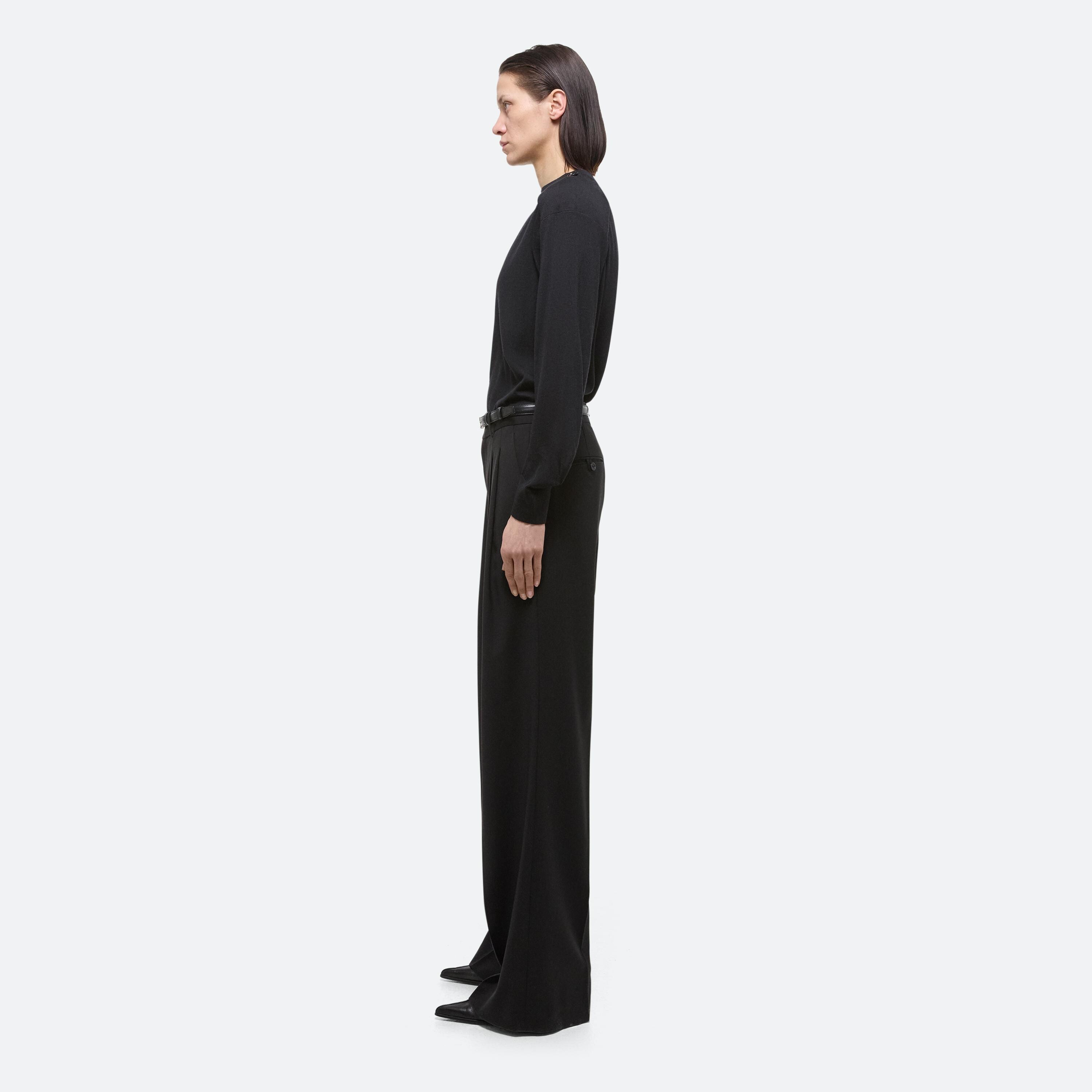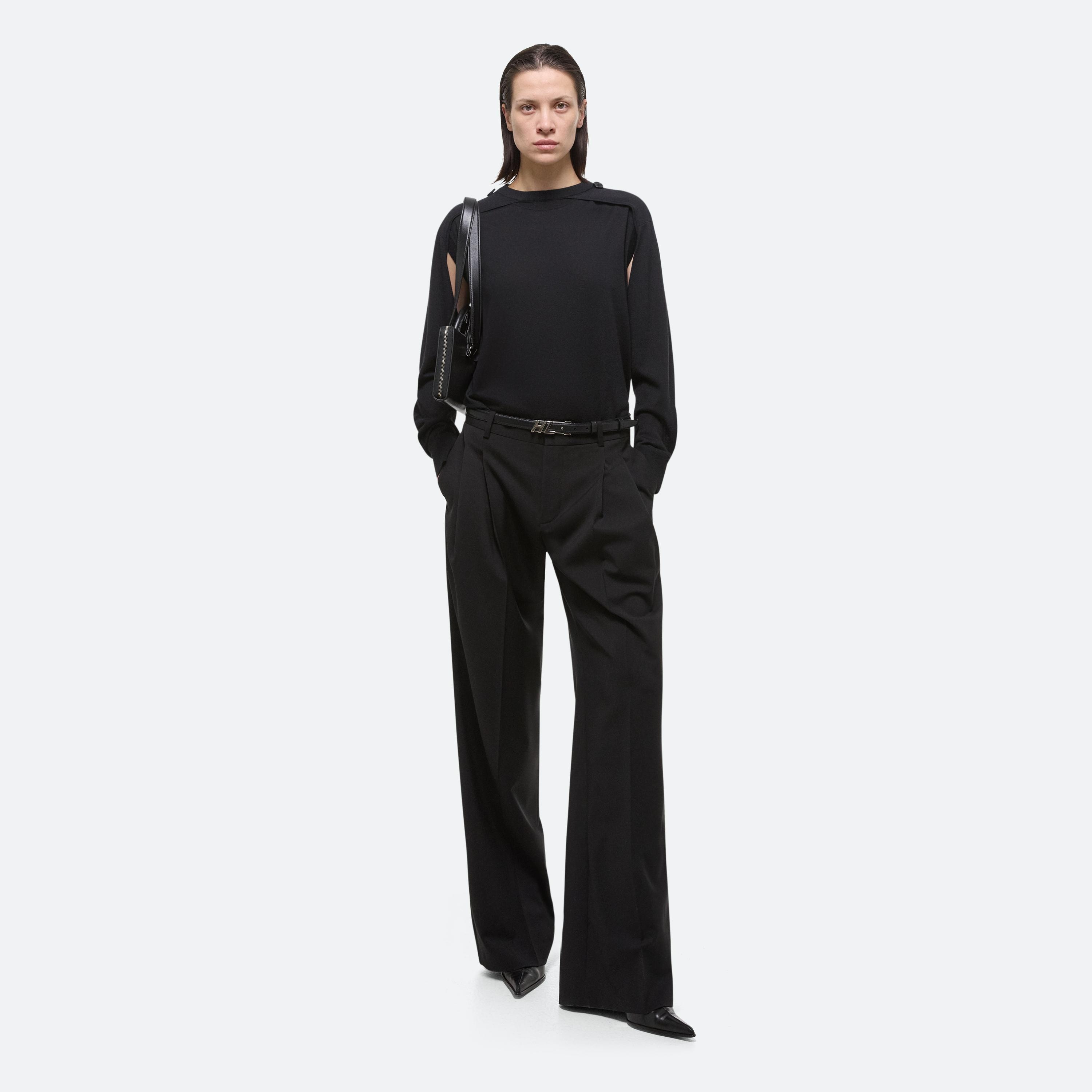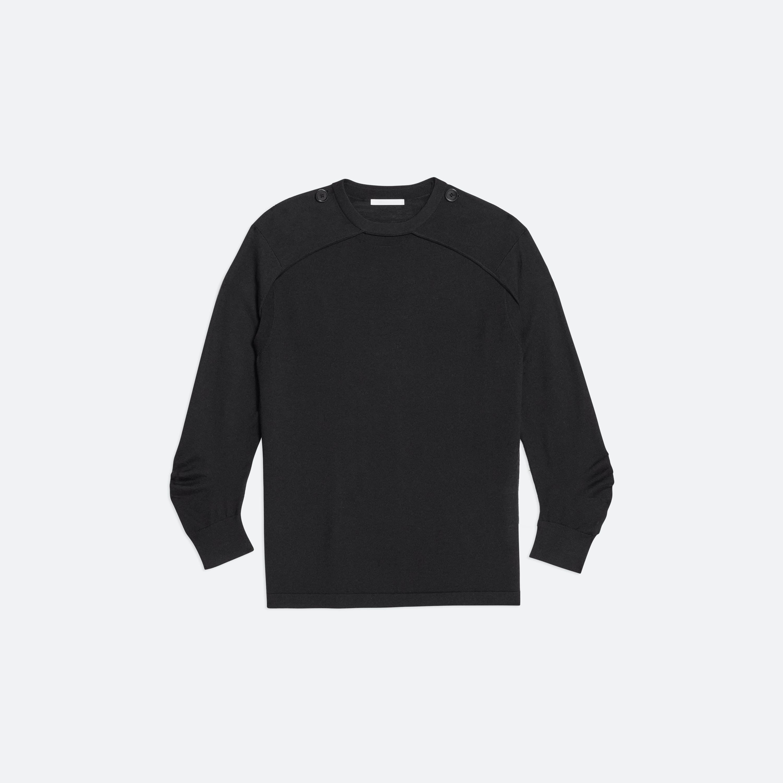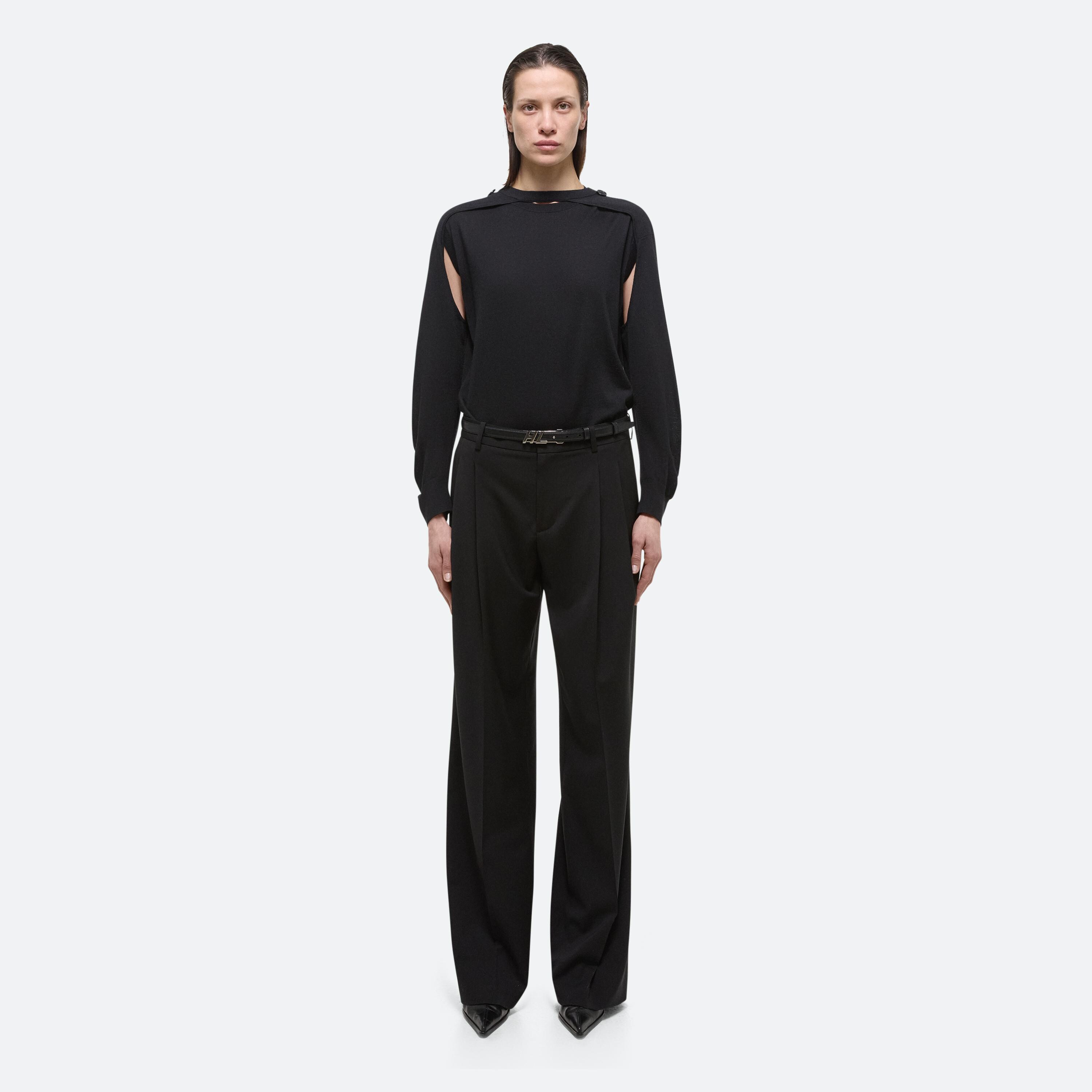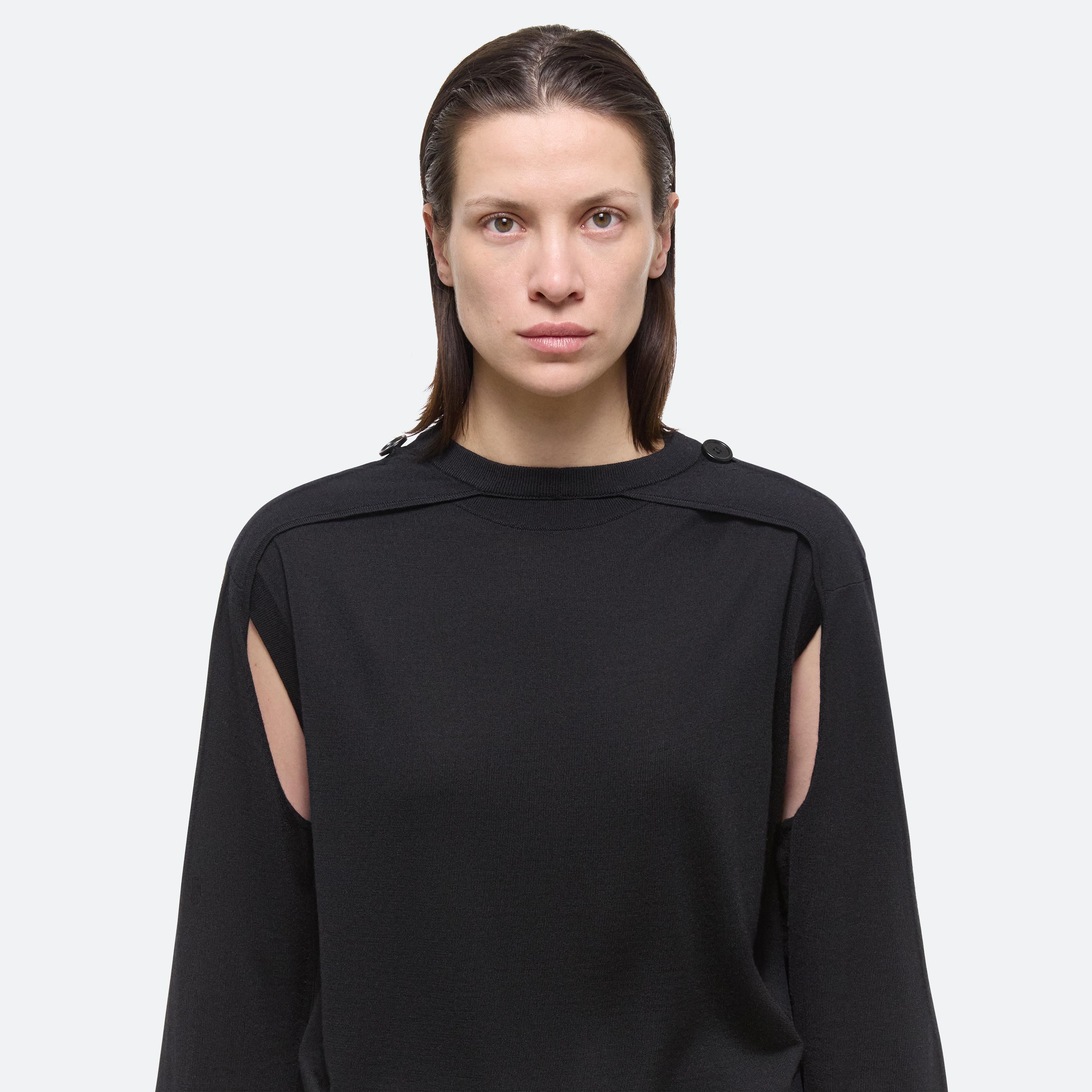 Crewneck sweater with detachable sleeves in Italian wool-silk blend. Wear the sleeveless base alone, layer with the raglan sleeve shrug, or wear sleeves separately as a scart or bolero.