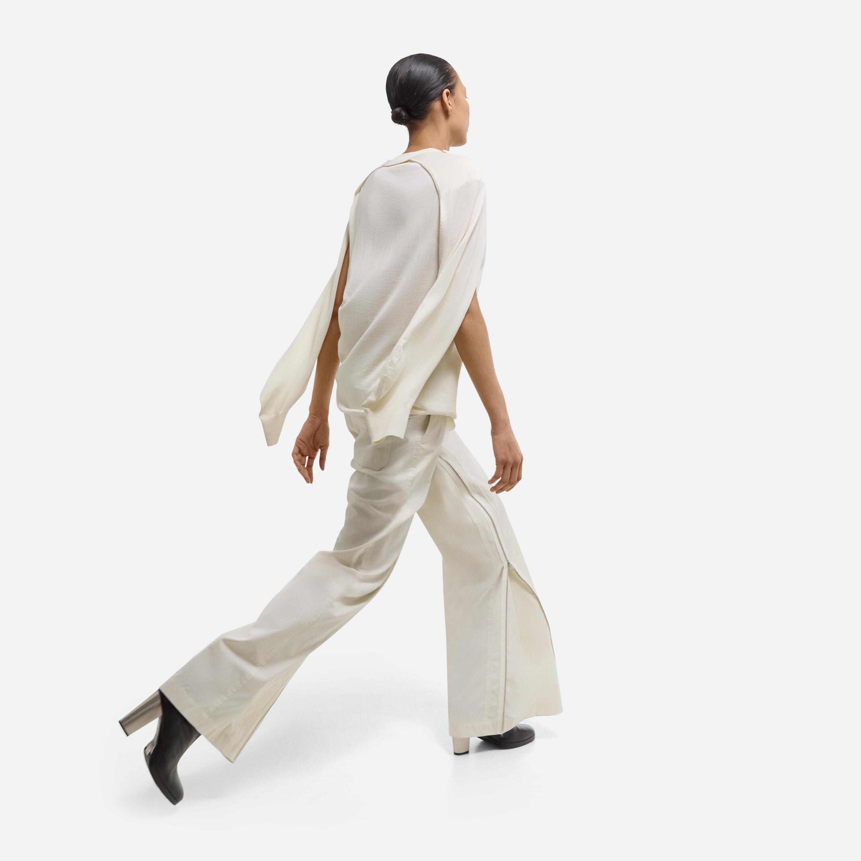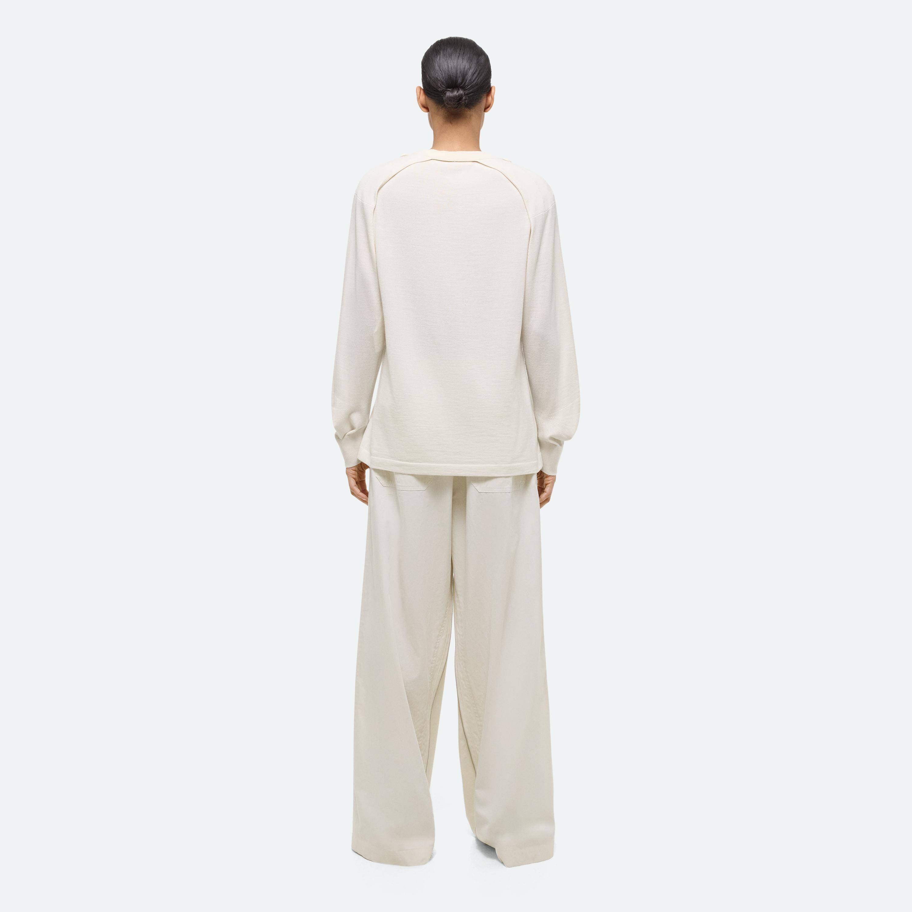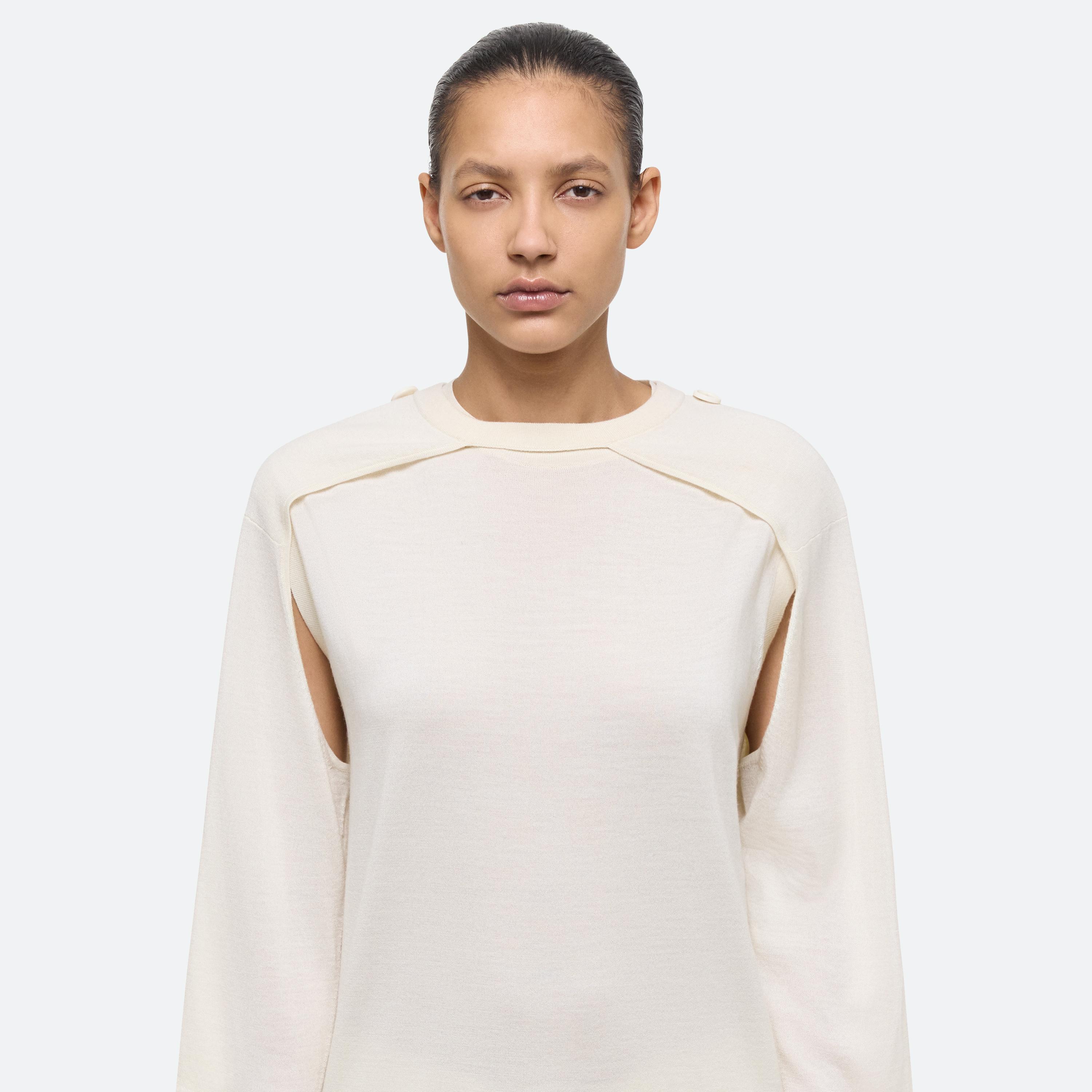 Crewneck sweater with detachable sleeves in Italian wool-silk blend. Wear the sleeveless base alone, layer with the raglan sleeve shrug, or wear sleeves separately as a scart or bolero.
