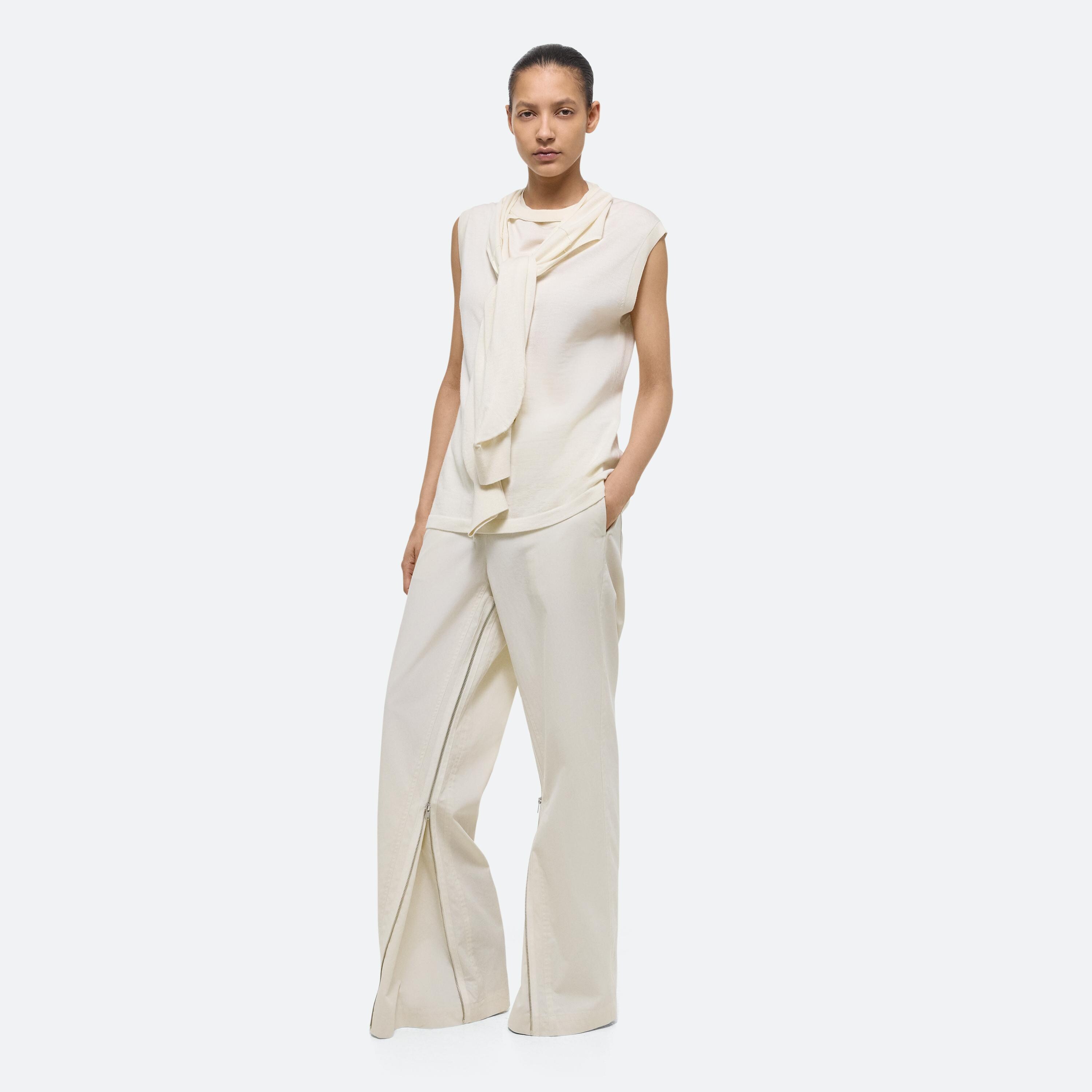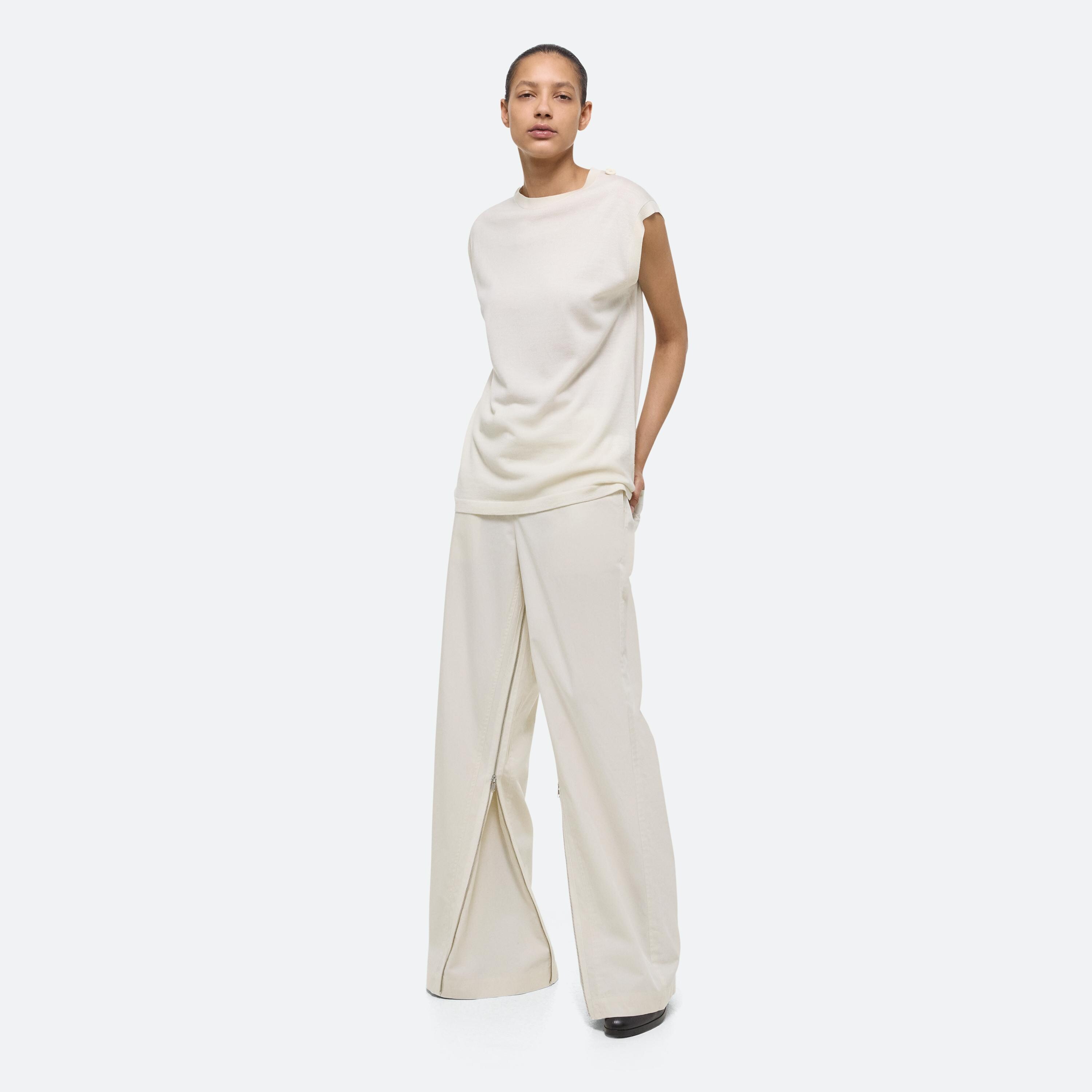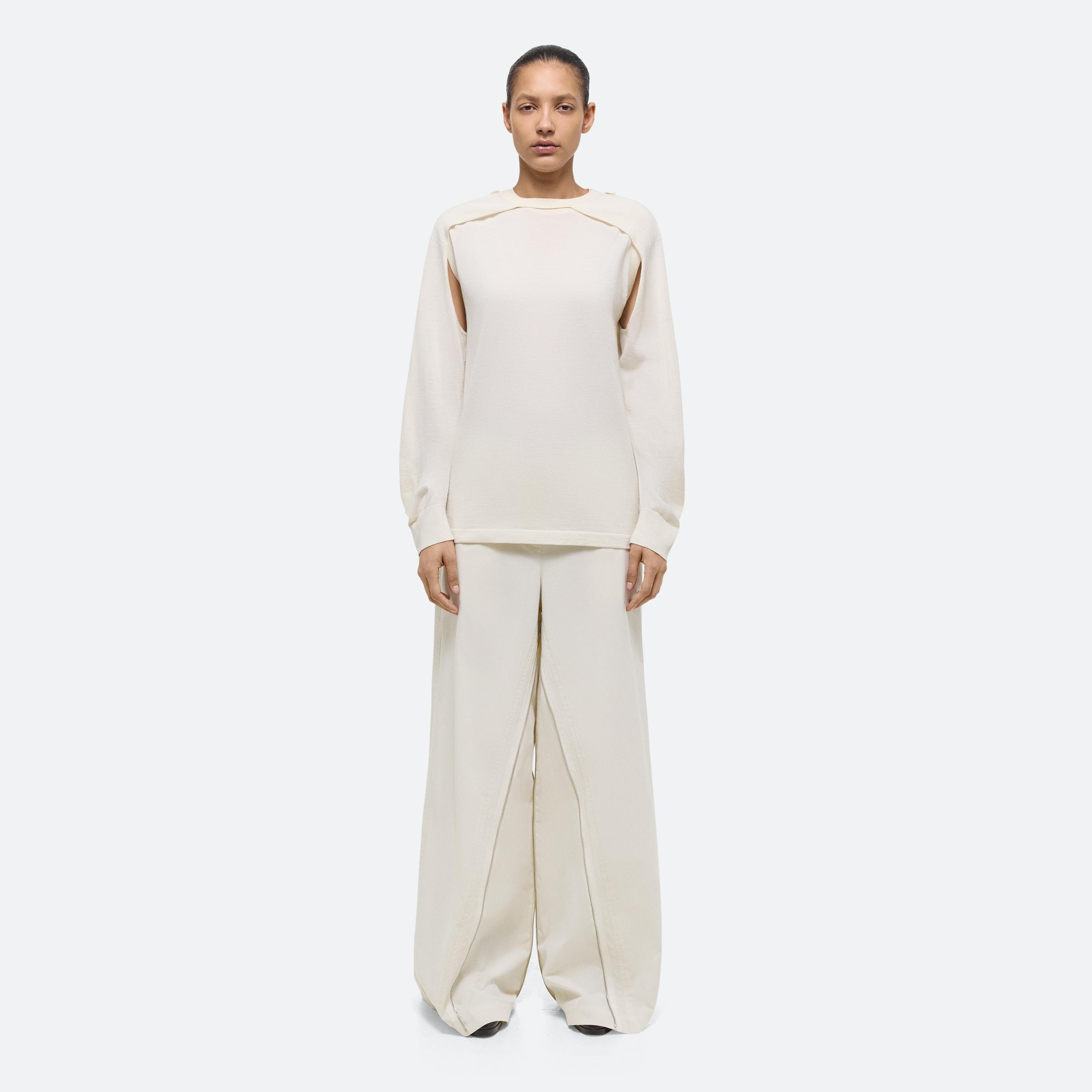 Crewneck sweater with detachable sleeves in Italian wool-silk blend. Wear the sleeveless base alone, layer with the raglan sleeve shrug, or wear sleeves separately as a scart or bolero.