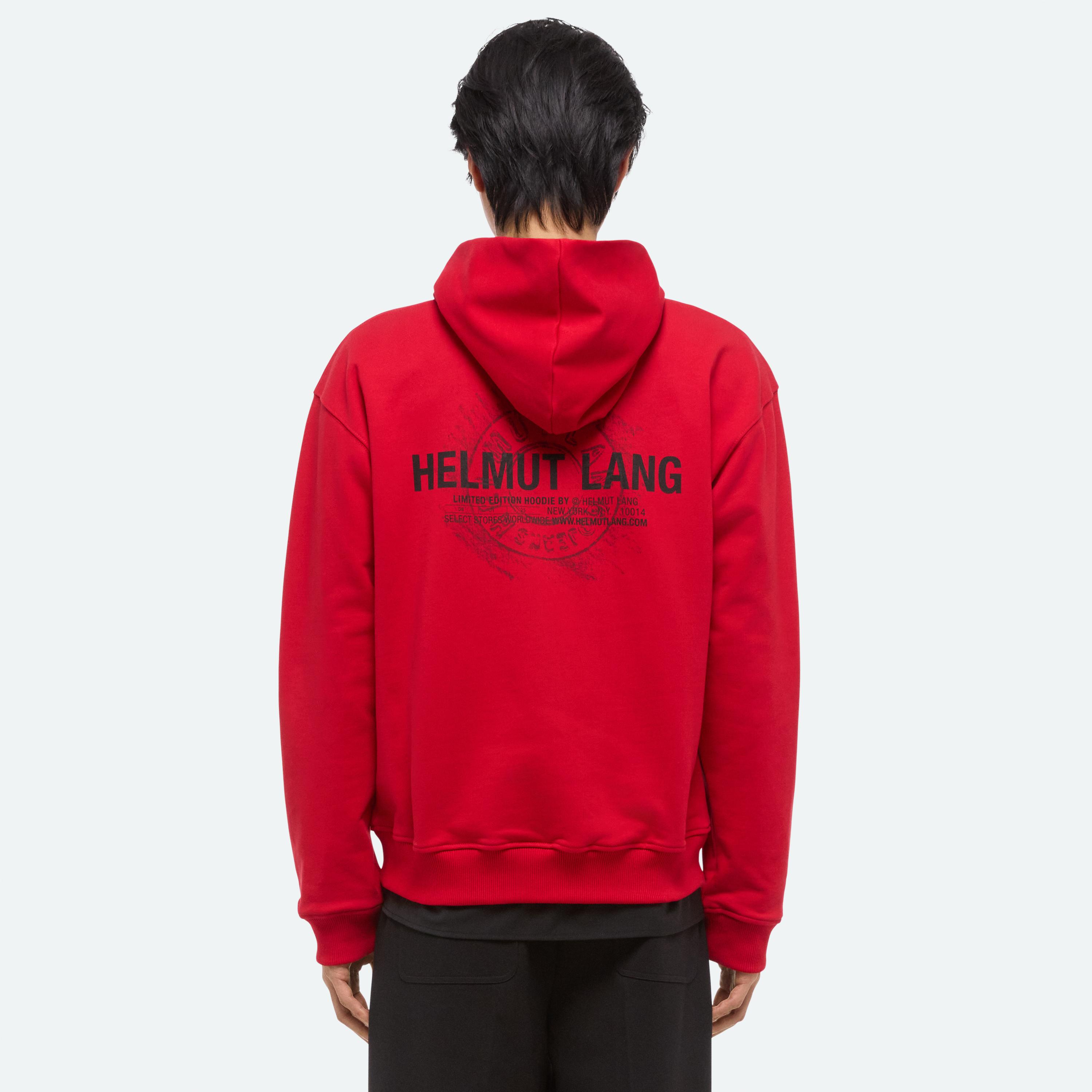 Hooded sweatshirt with illustration of HL Denim hardware on back.