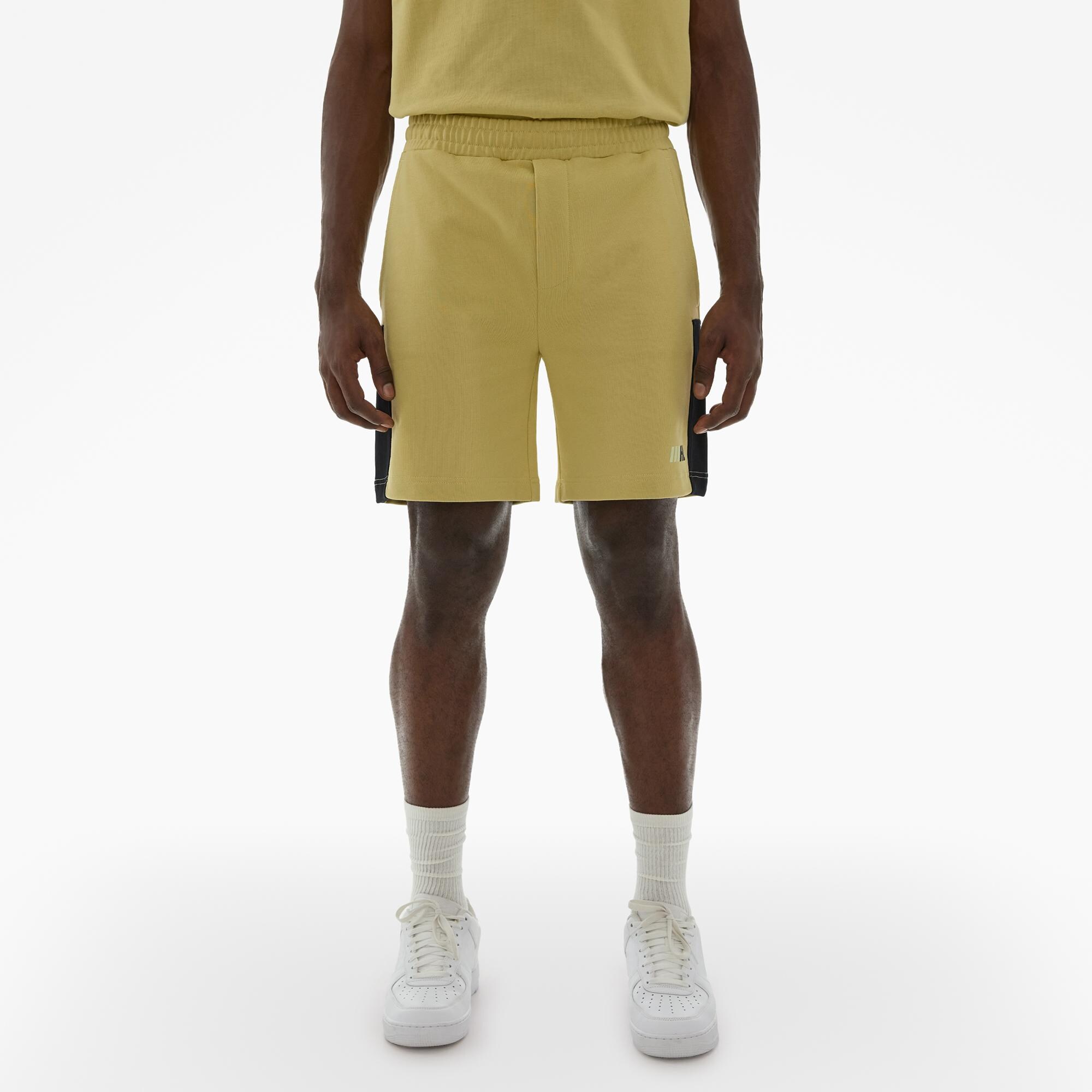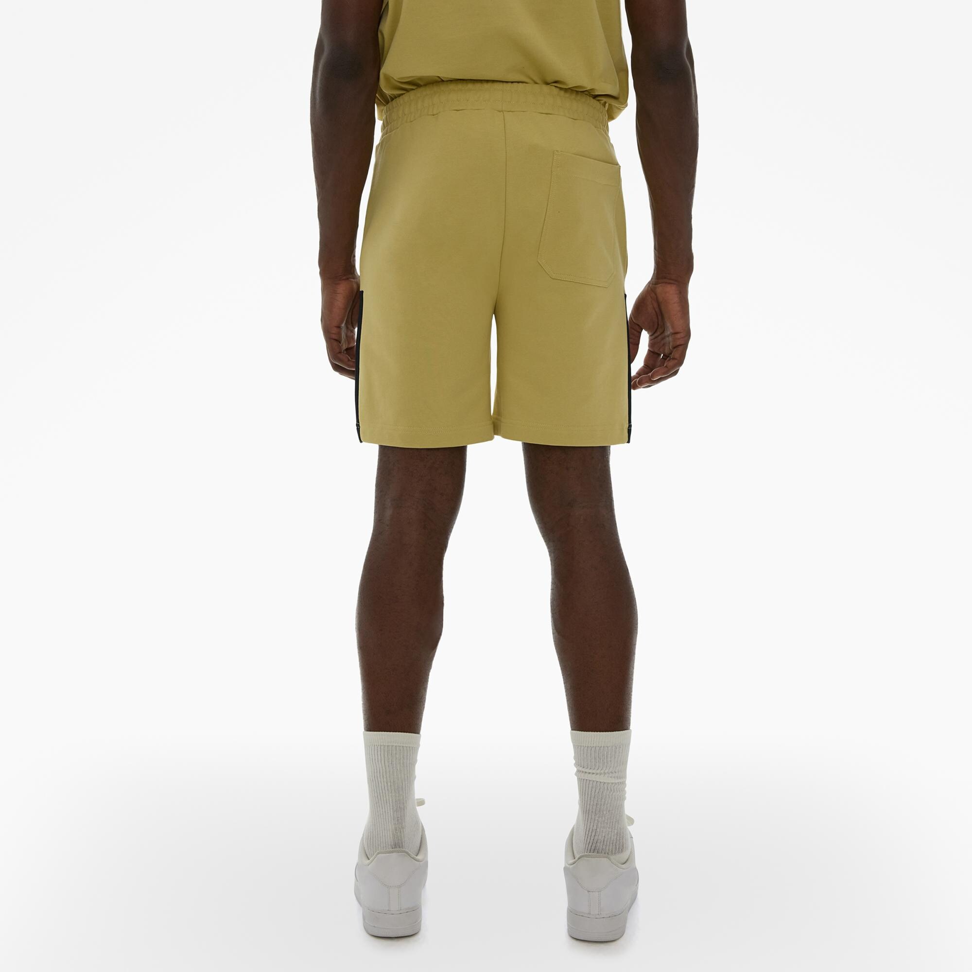 The Helmut Lang Short is a terry cotton pull-on style with an elastic waistband, slash pockets, and a slanted HL logo patch at the wearer’s left leg.