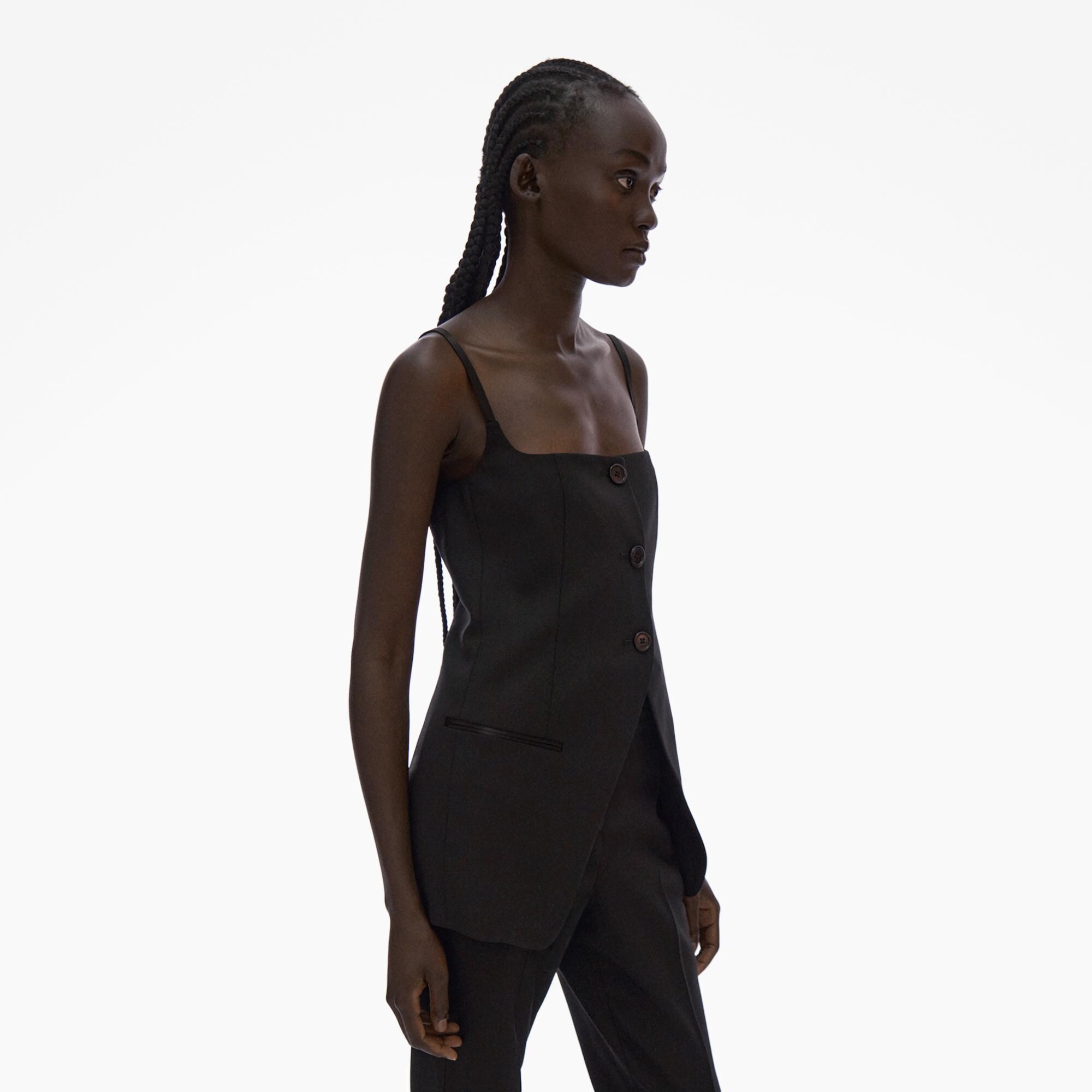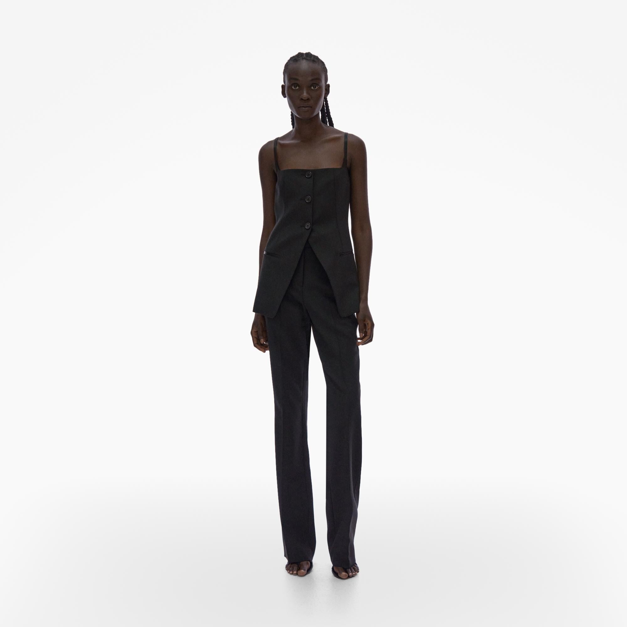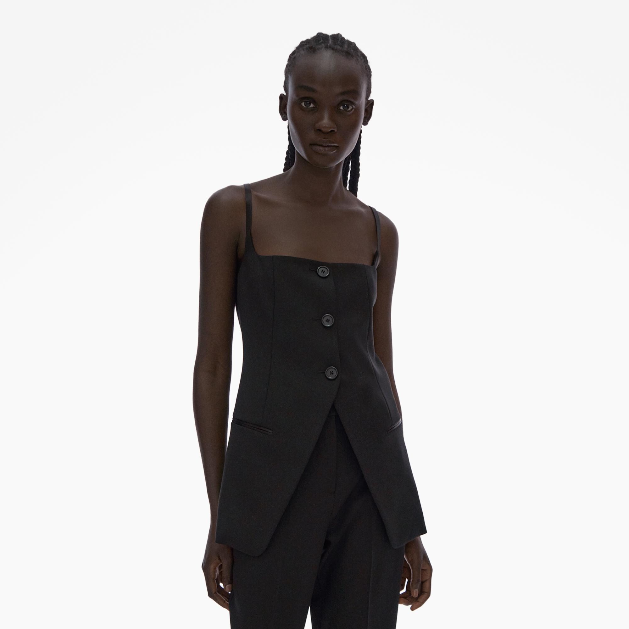 The Helmut Lang Blazer Top is a sleeveless style in a stretch wool blend with side welt pockets and button front closures.