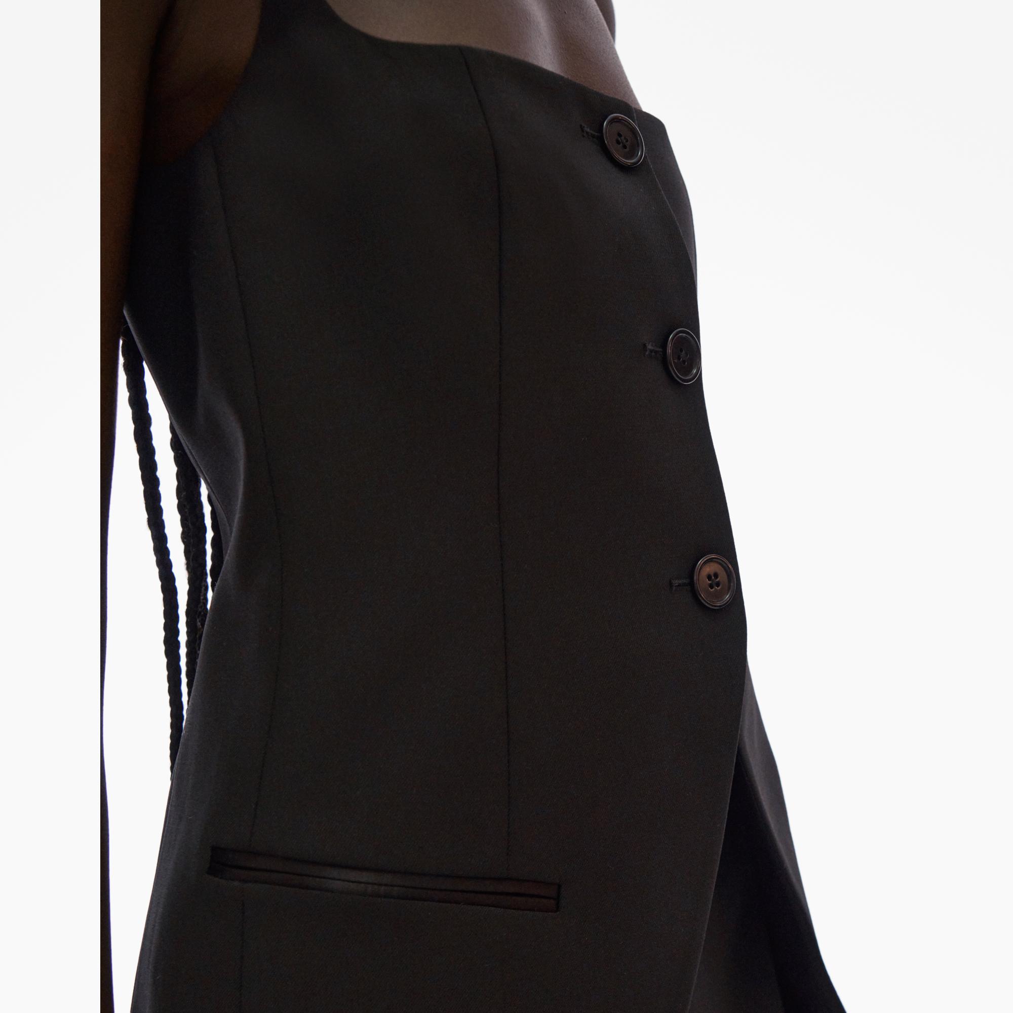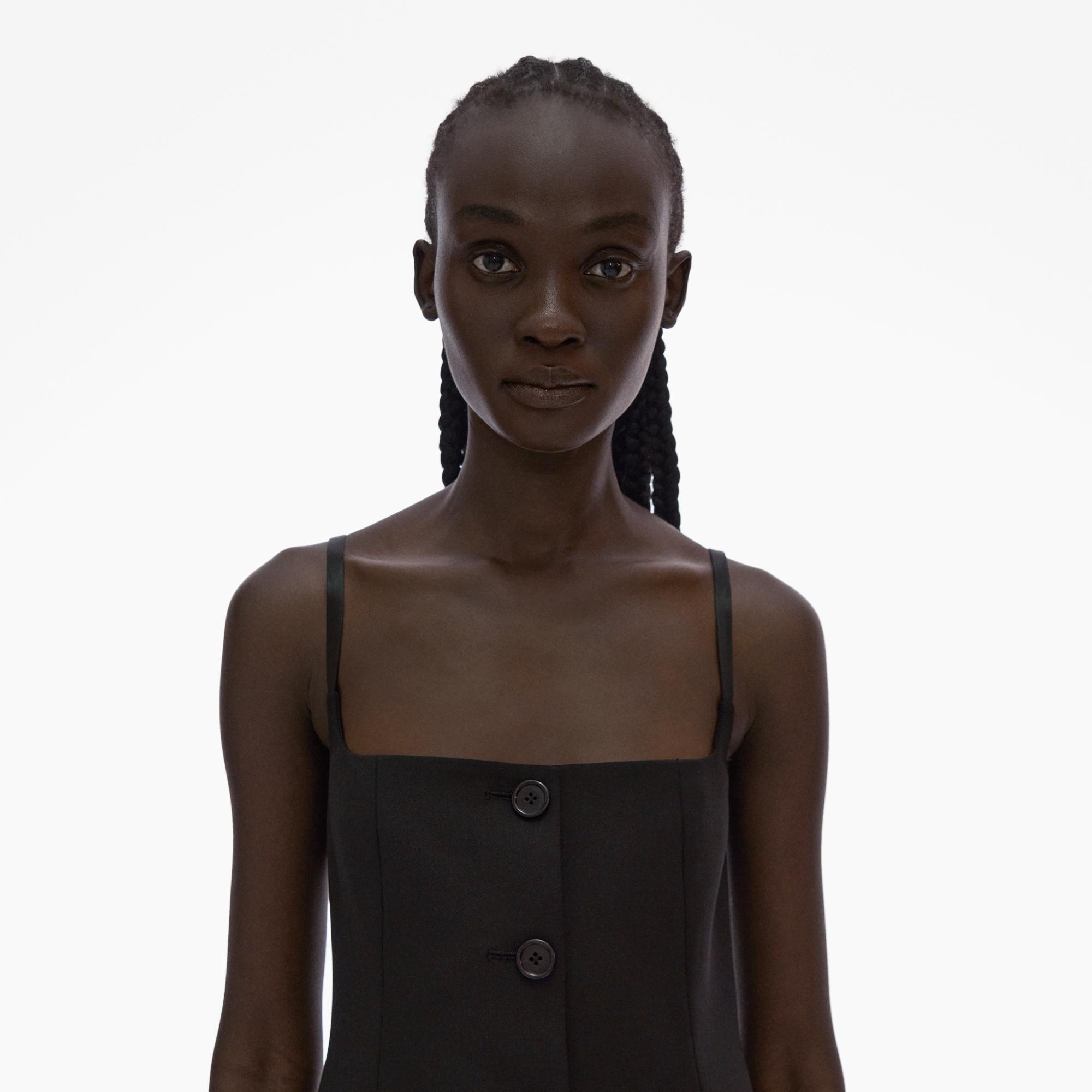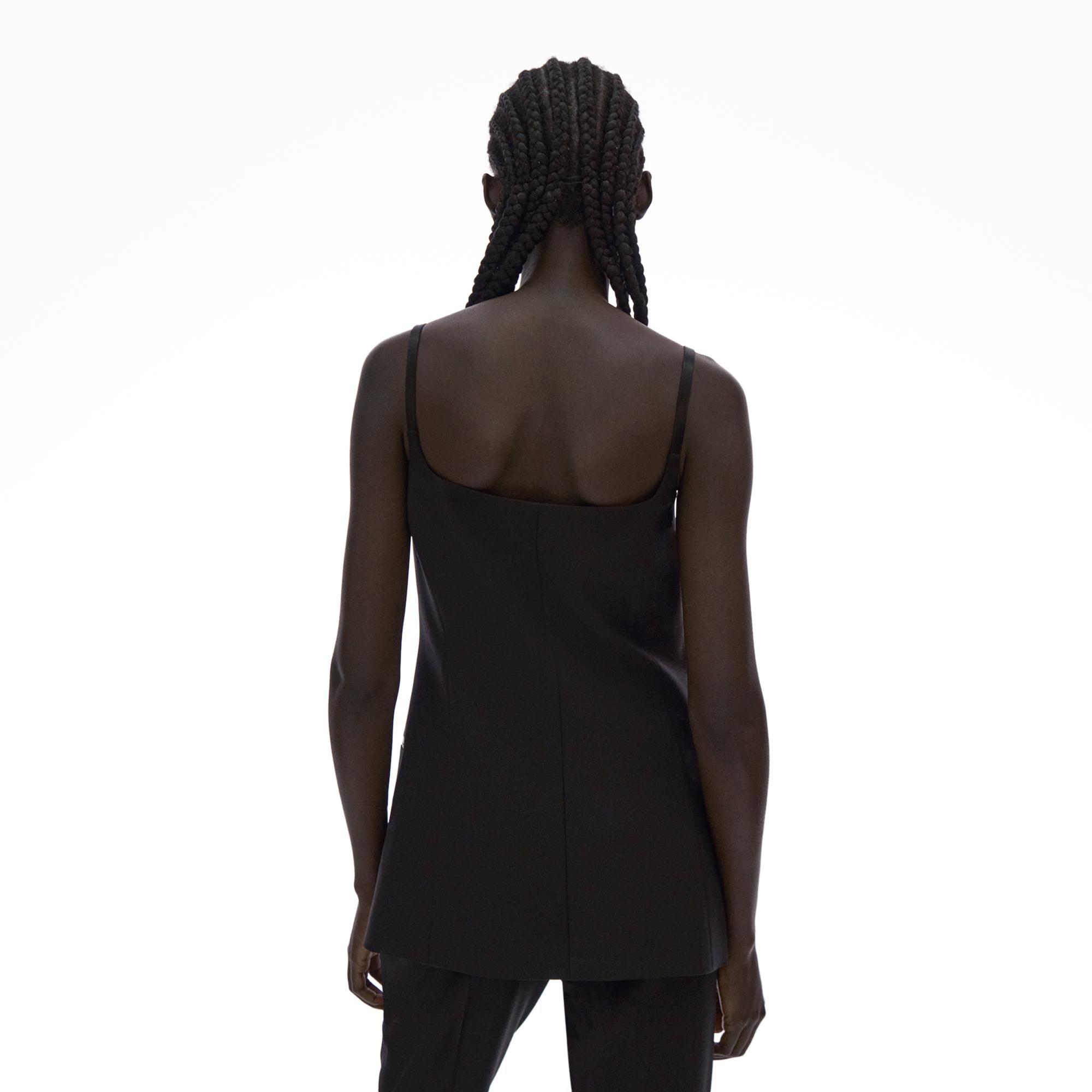 The Helmut Lang Blazer Top is a sleeveless style in a stretch wool blend with side welt pockets and button front closures.