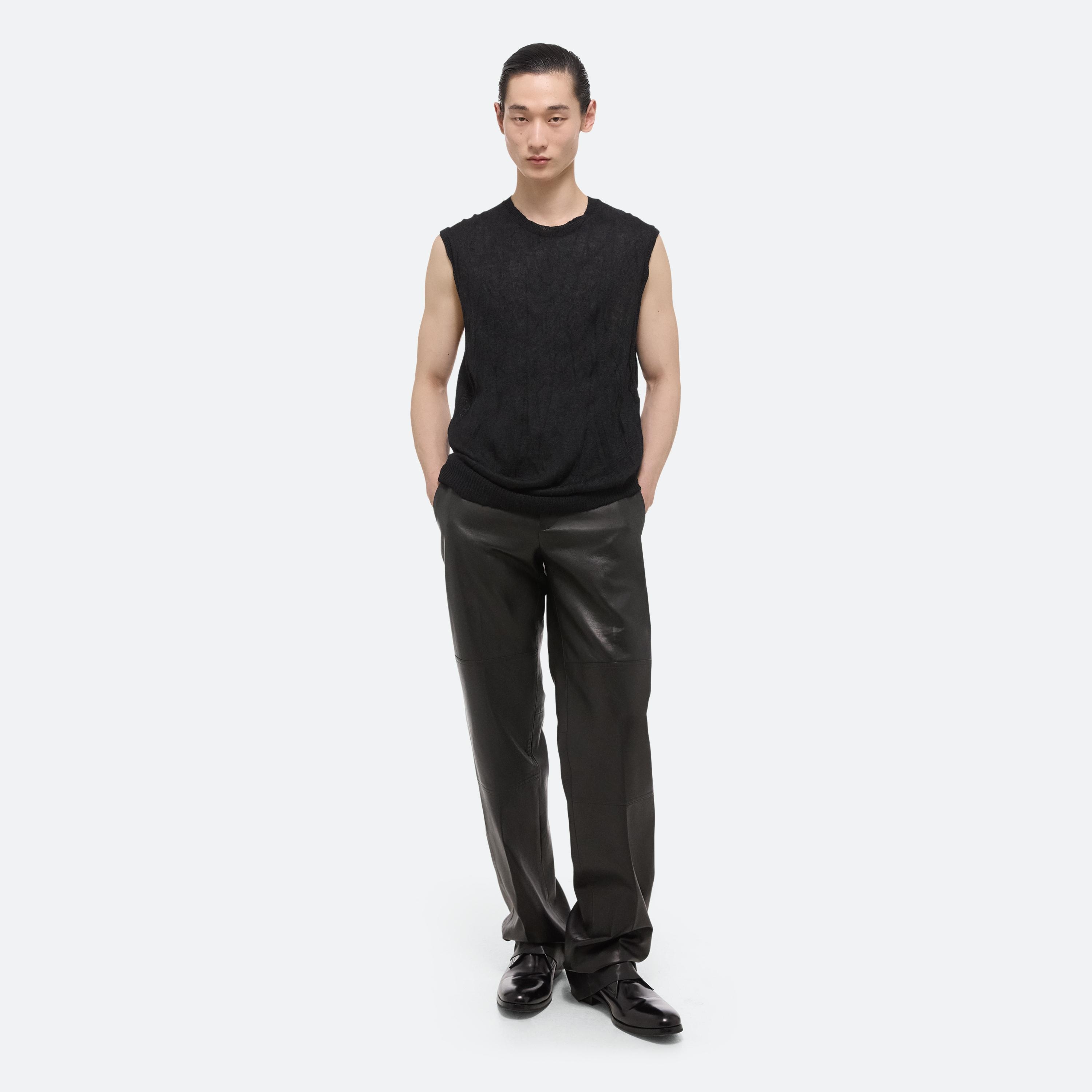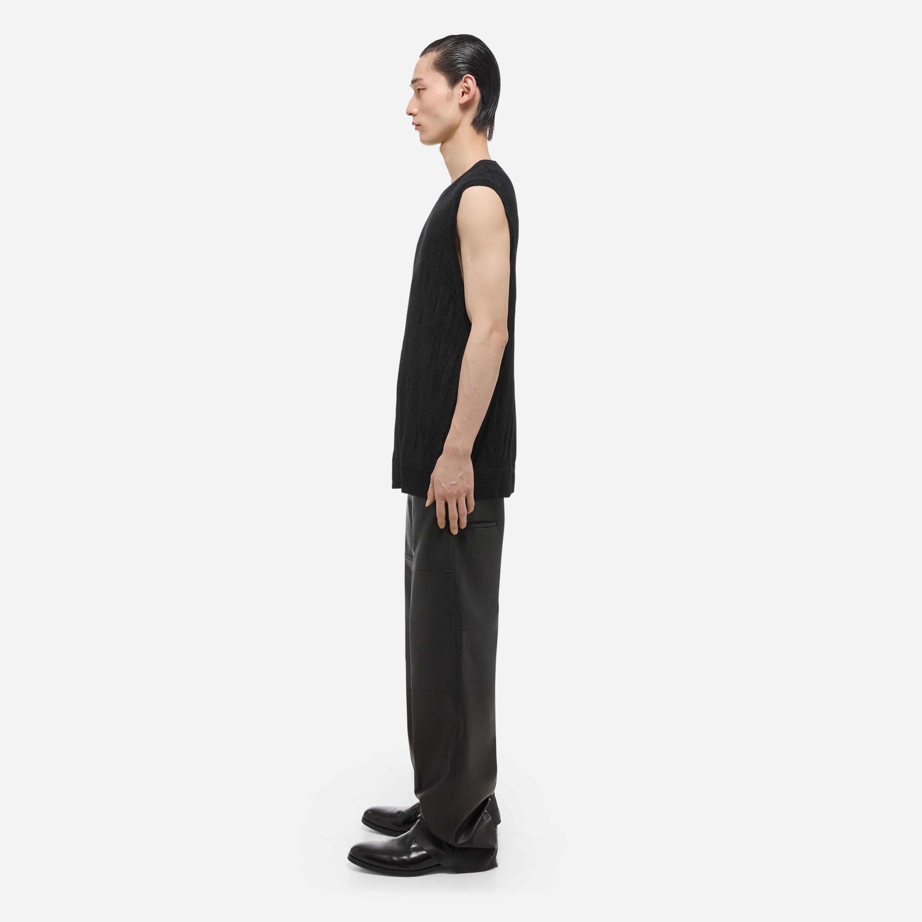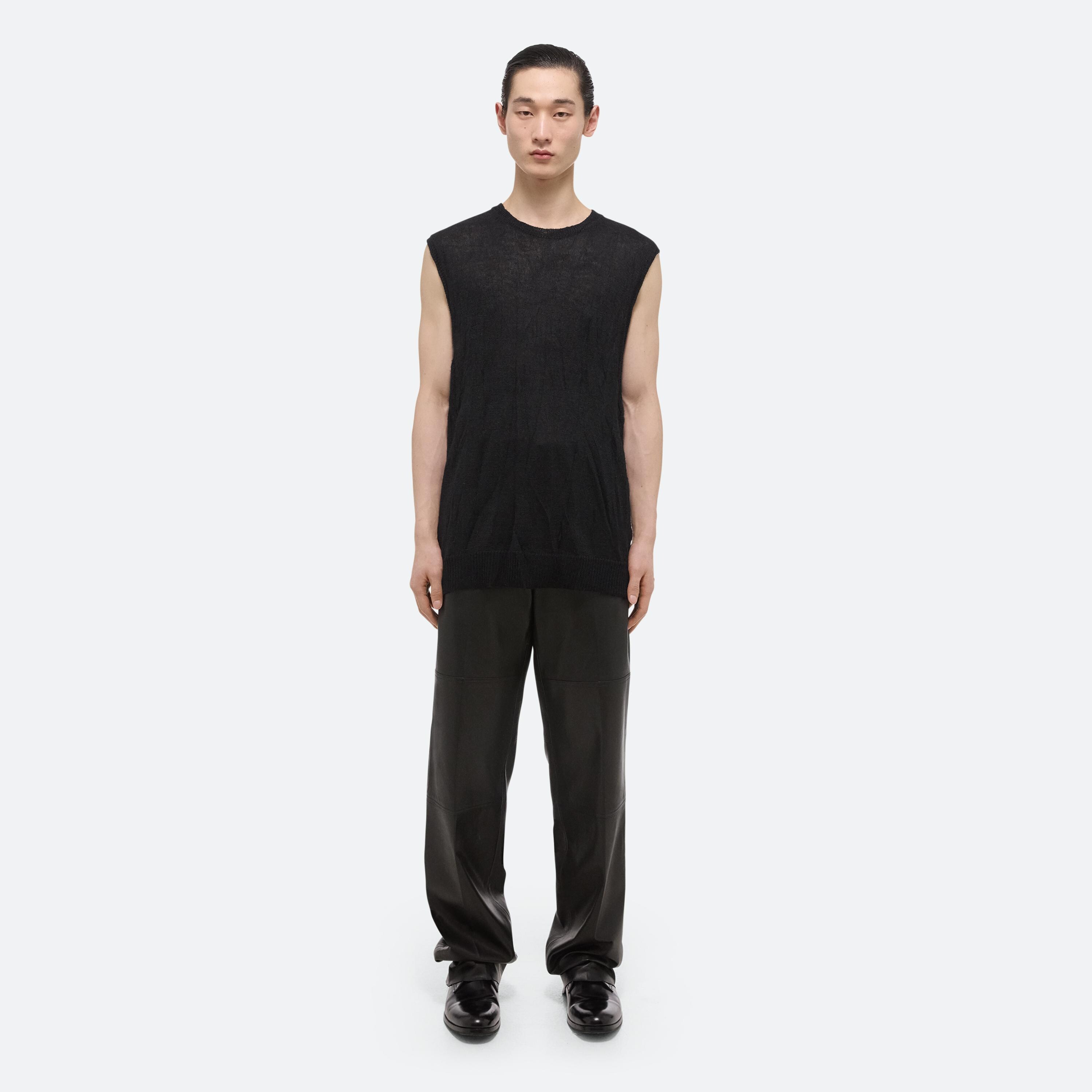 Fine gauge relaxed tank with the HELMUT LANG logo intarsia on back. The crush textured is formed by a special heat treatment executed by hand.