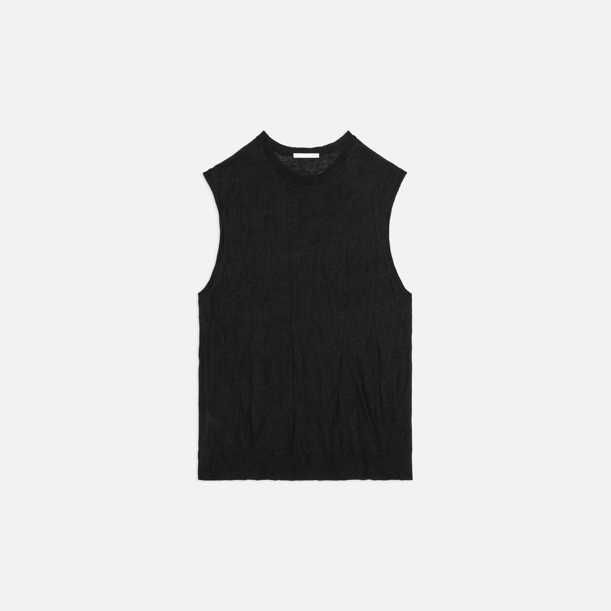 Fine gauge relaxed tank with the HELMUT LANG logo intarsia on back. The crush textured is formed by a special heat treatment executed by hand.