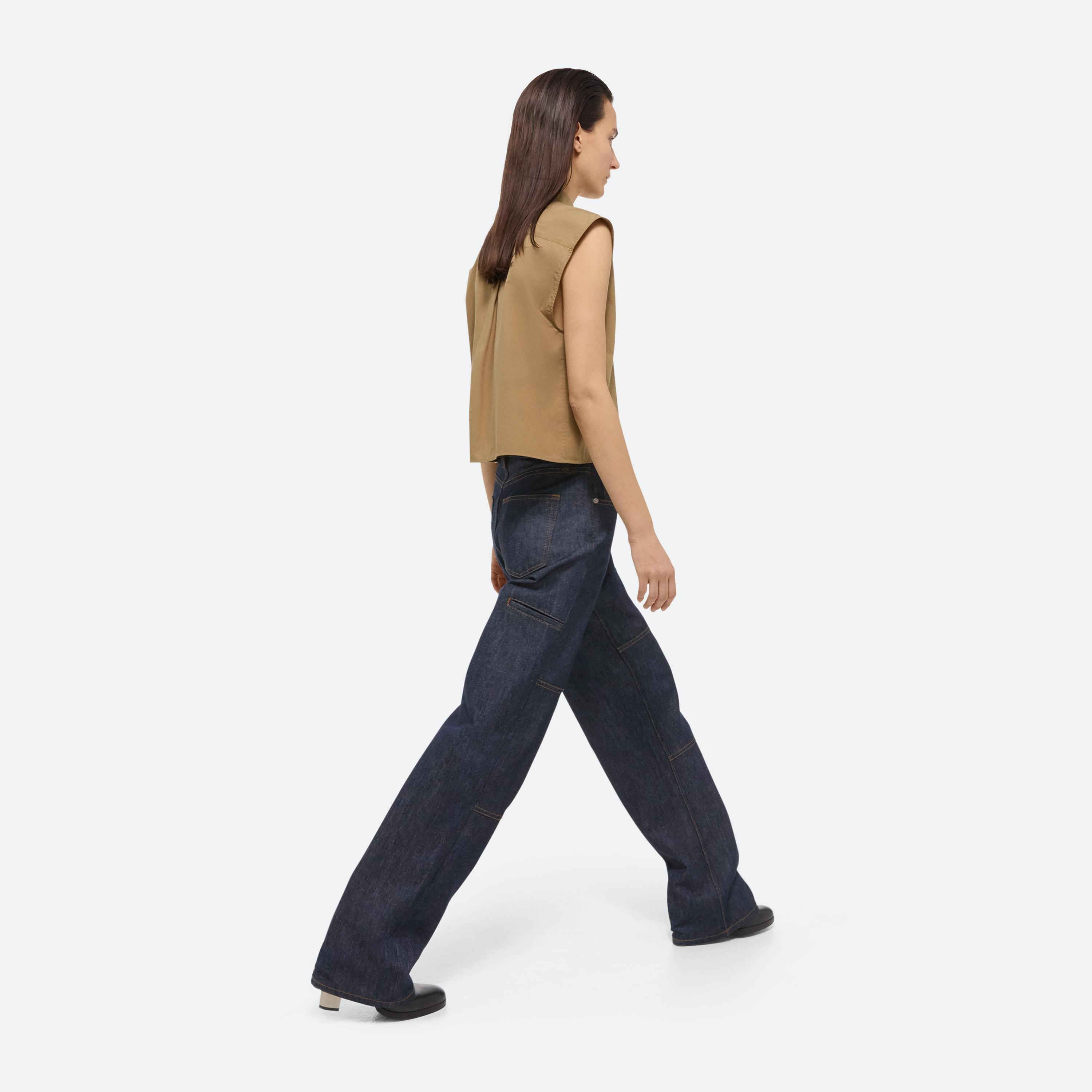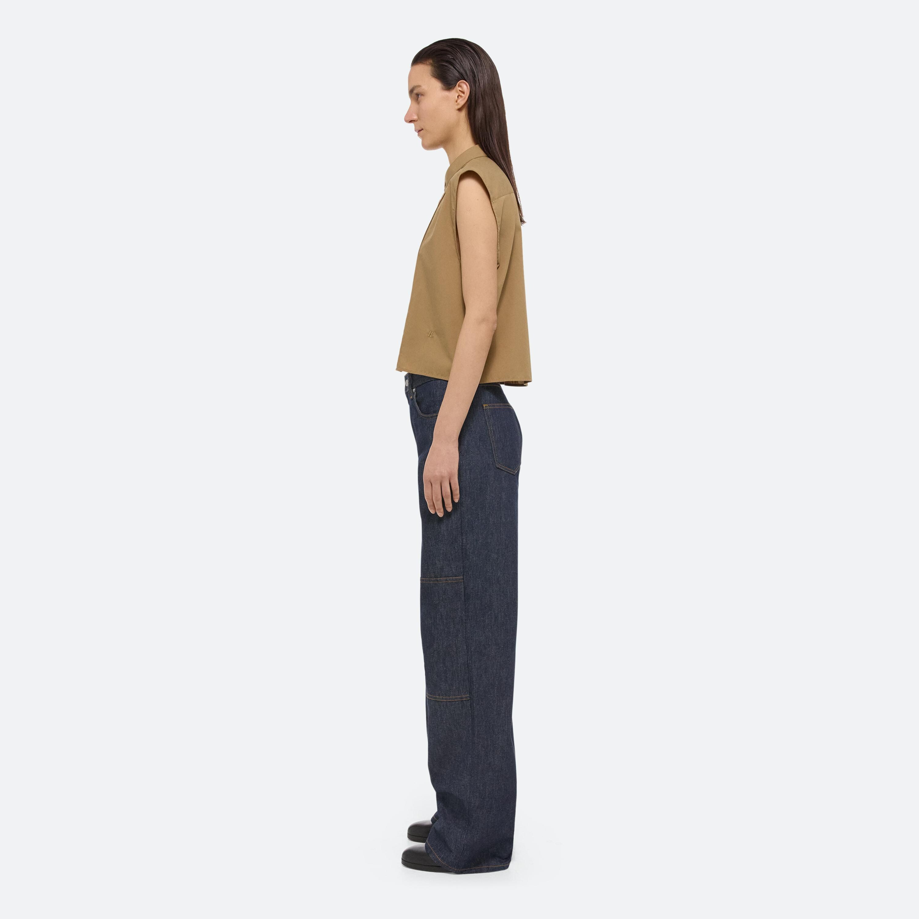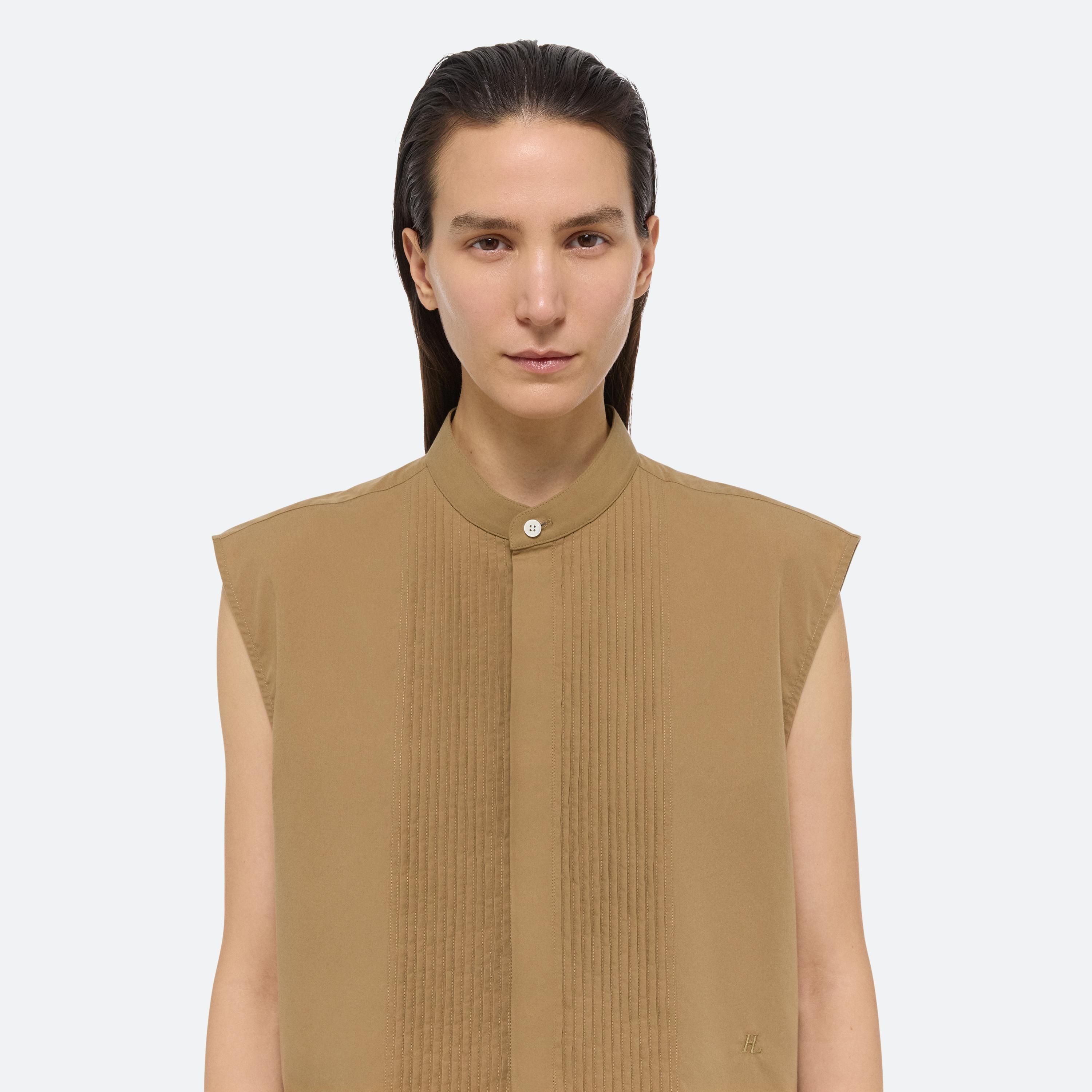 Cropped fitted sleeveless pintucked tuxedo shirt in soft cotton poplin.