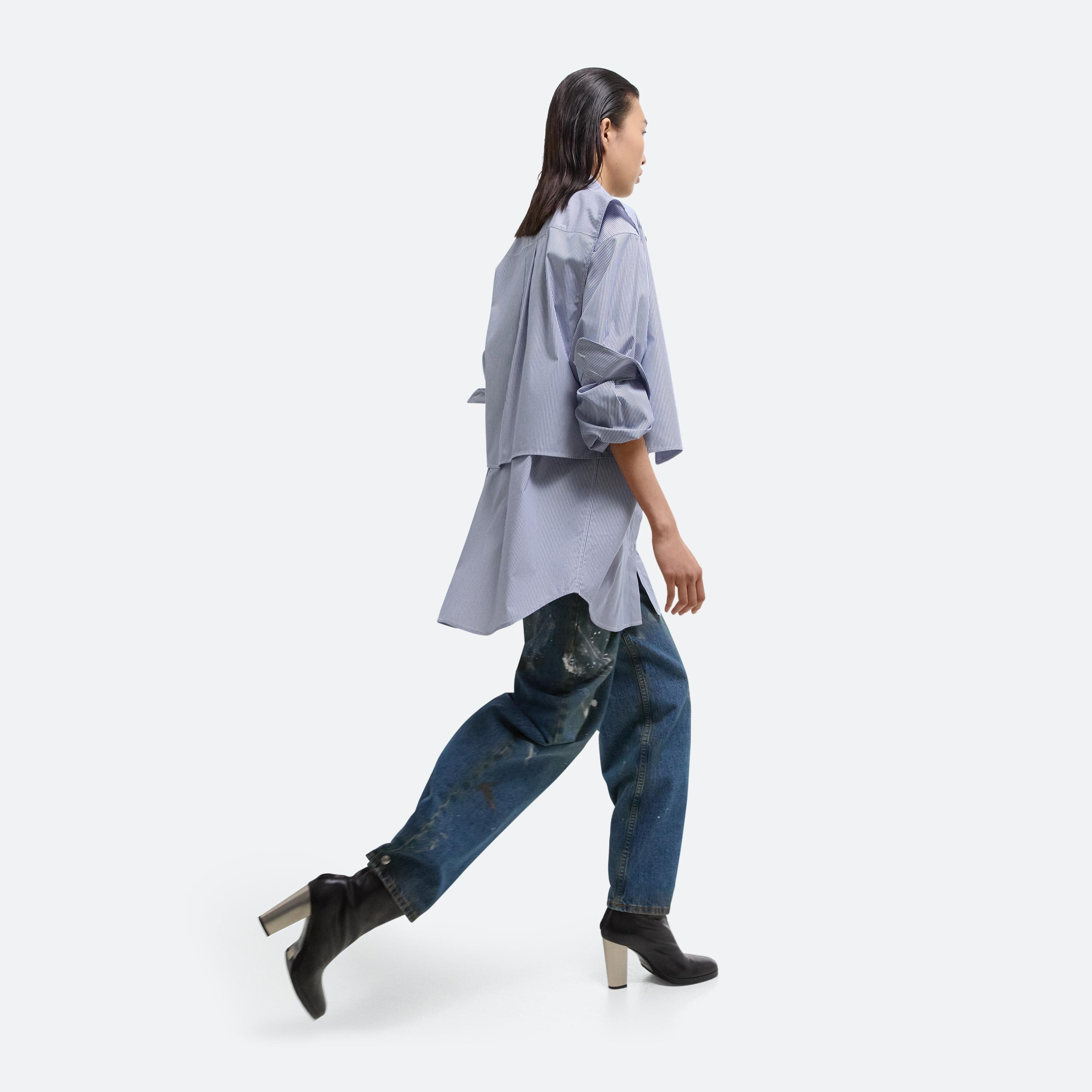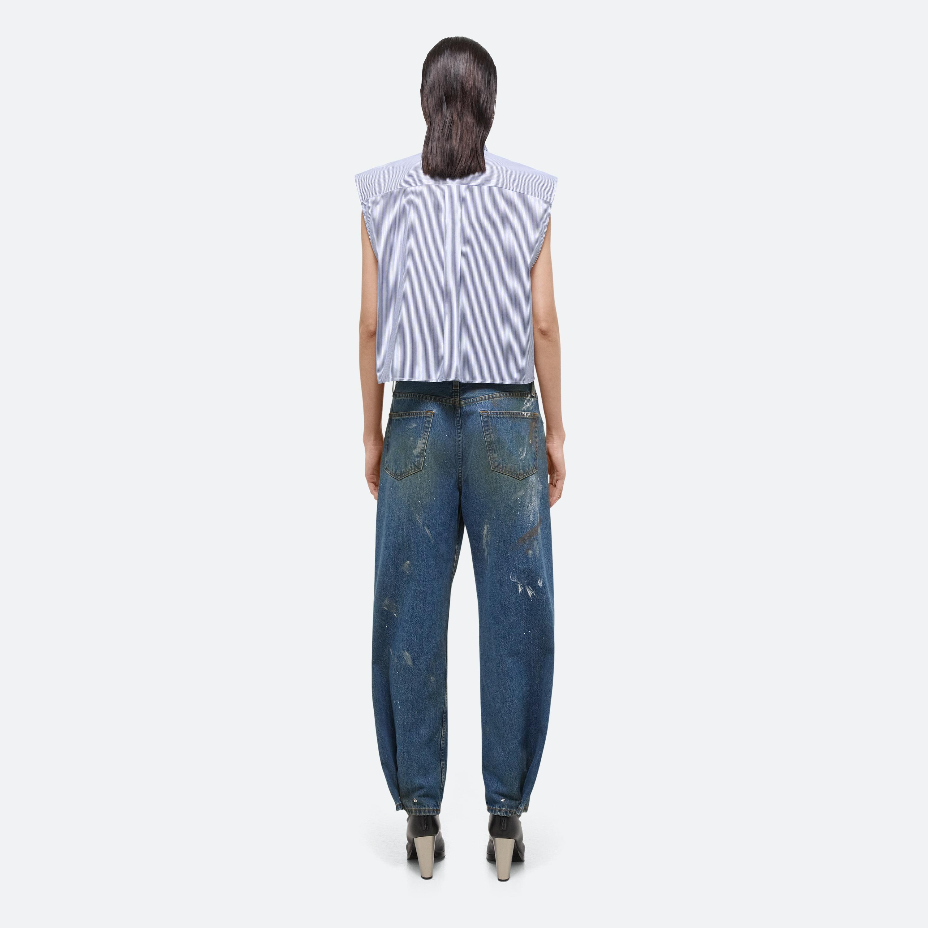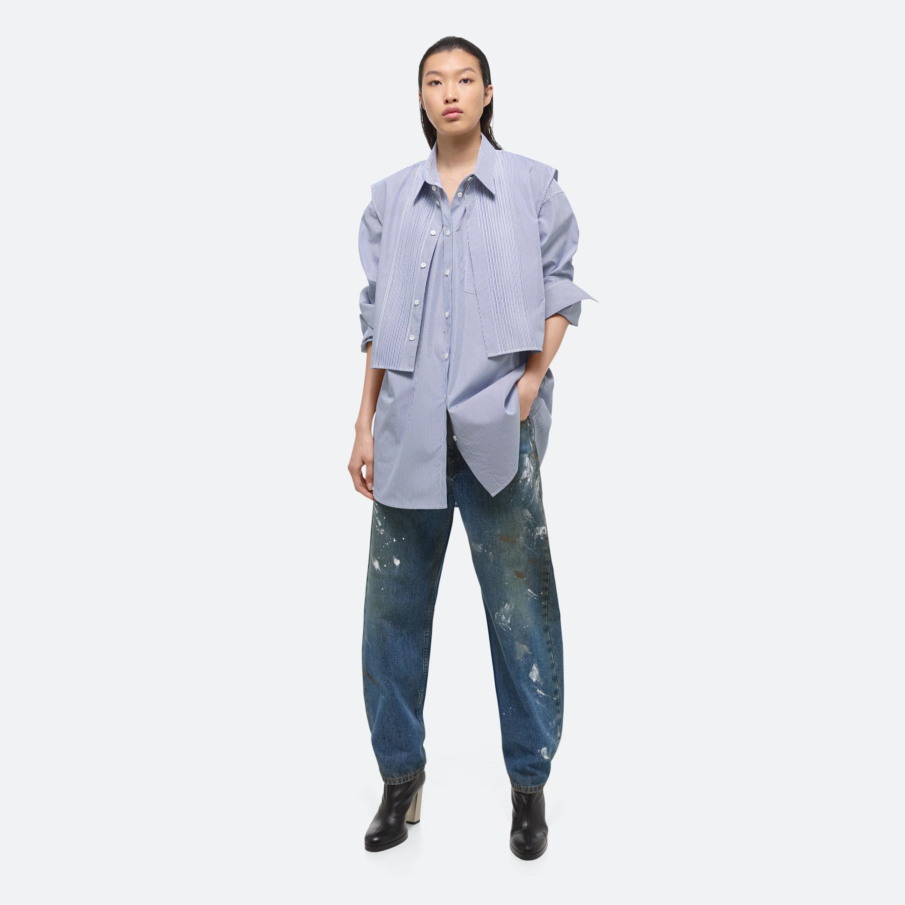 Sleeveless pintucked tuxedo shirt in a striped Japanese cotton poplin. Cut with a relaxed, cropped fit.