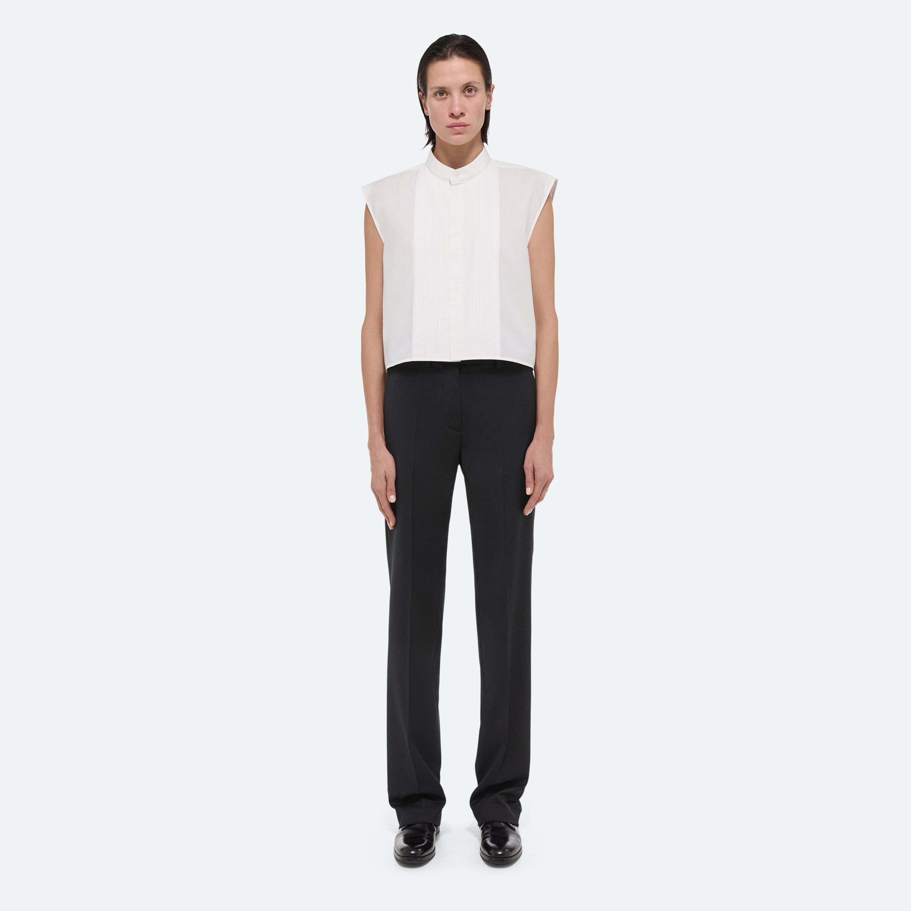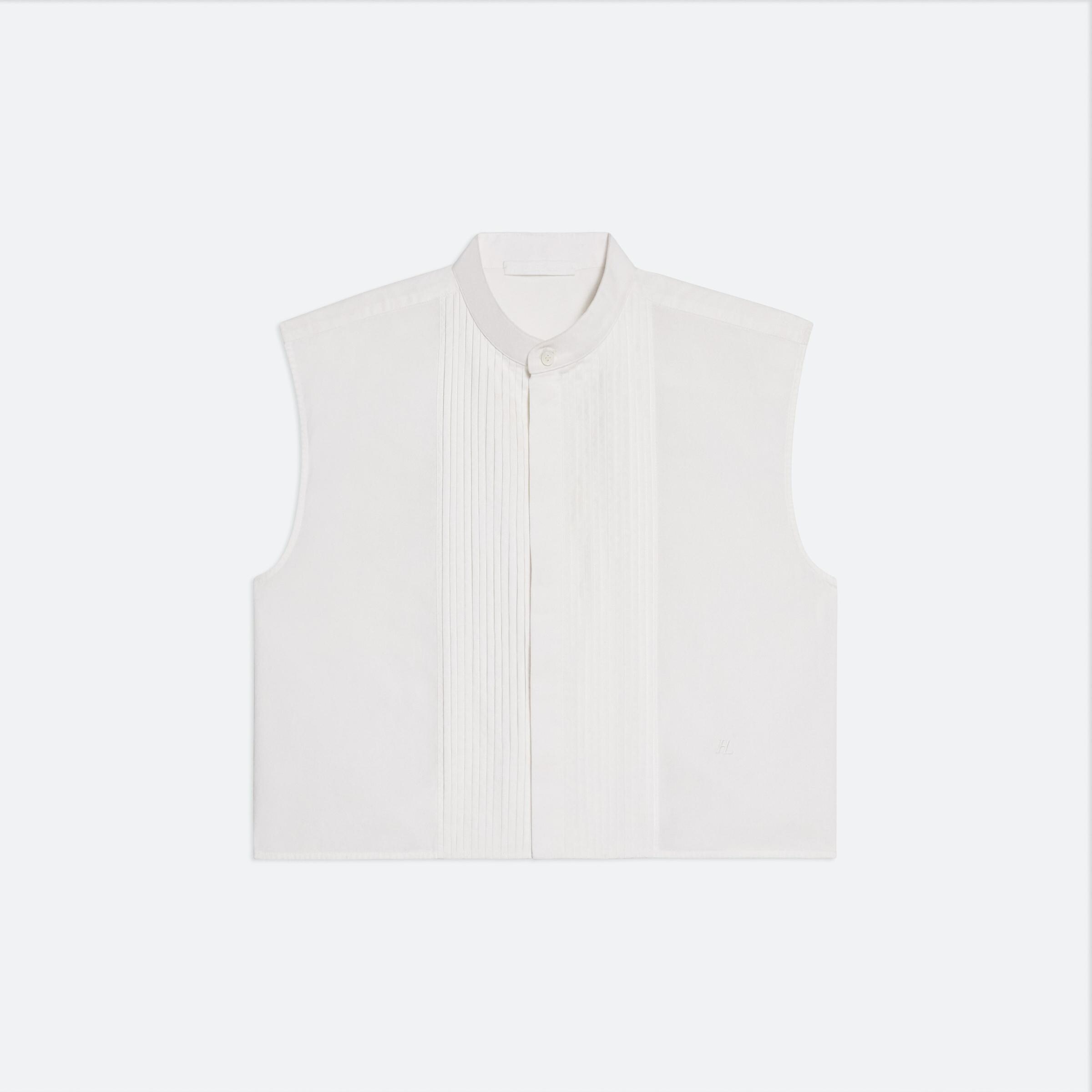Cropped fitted sleeveless pintucked tuxedo shirt in soft cotton poplin.
