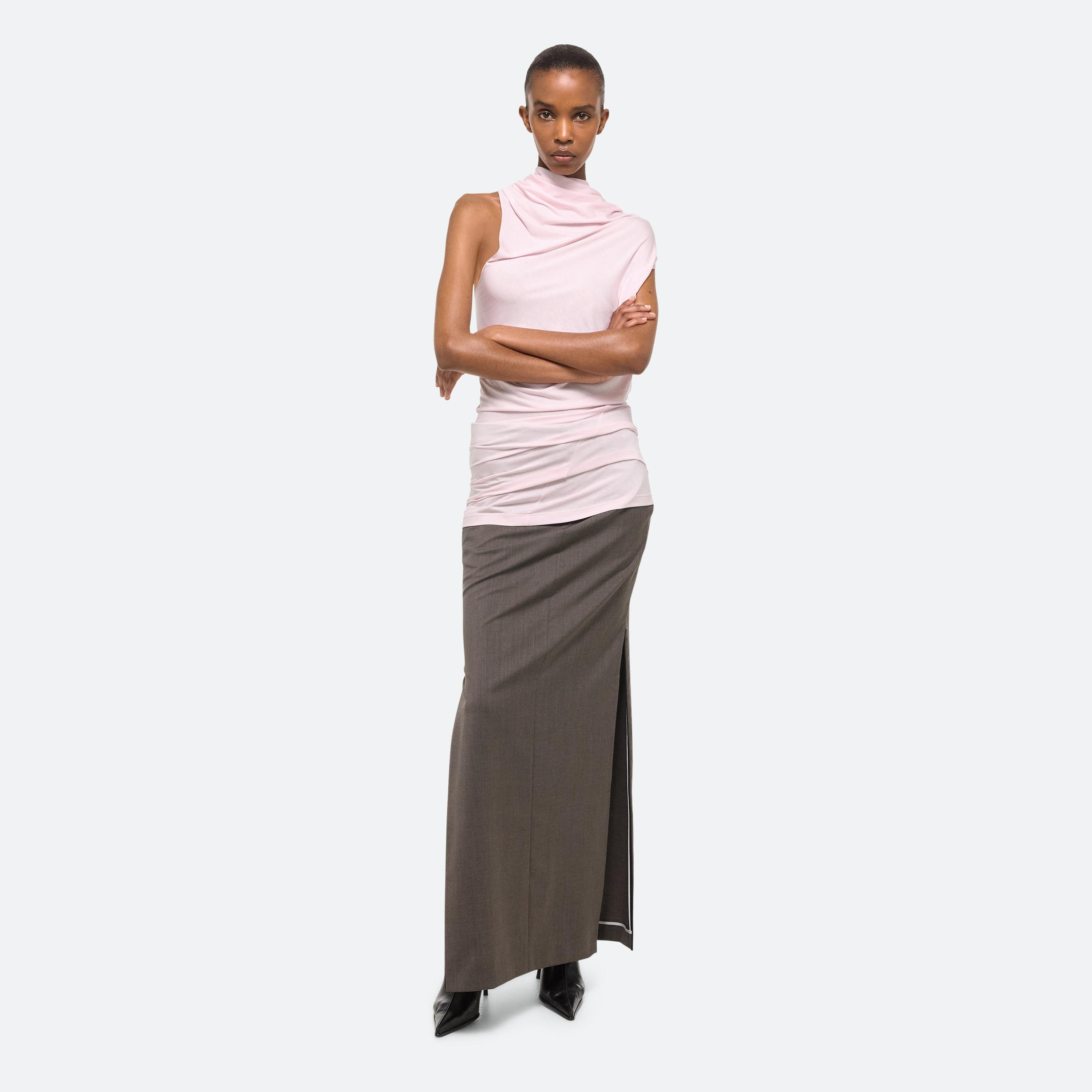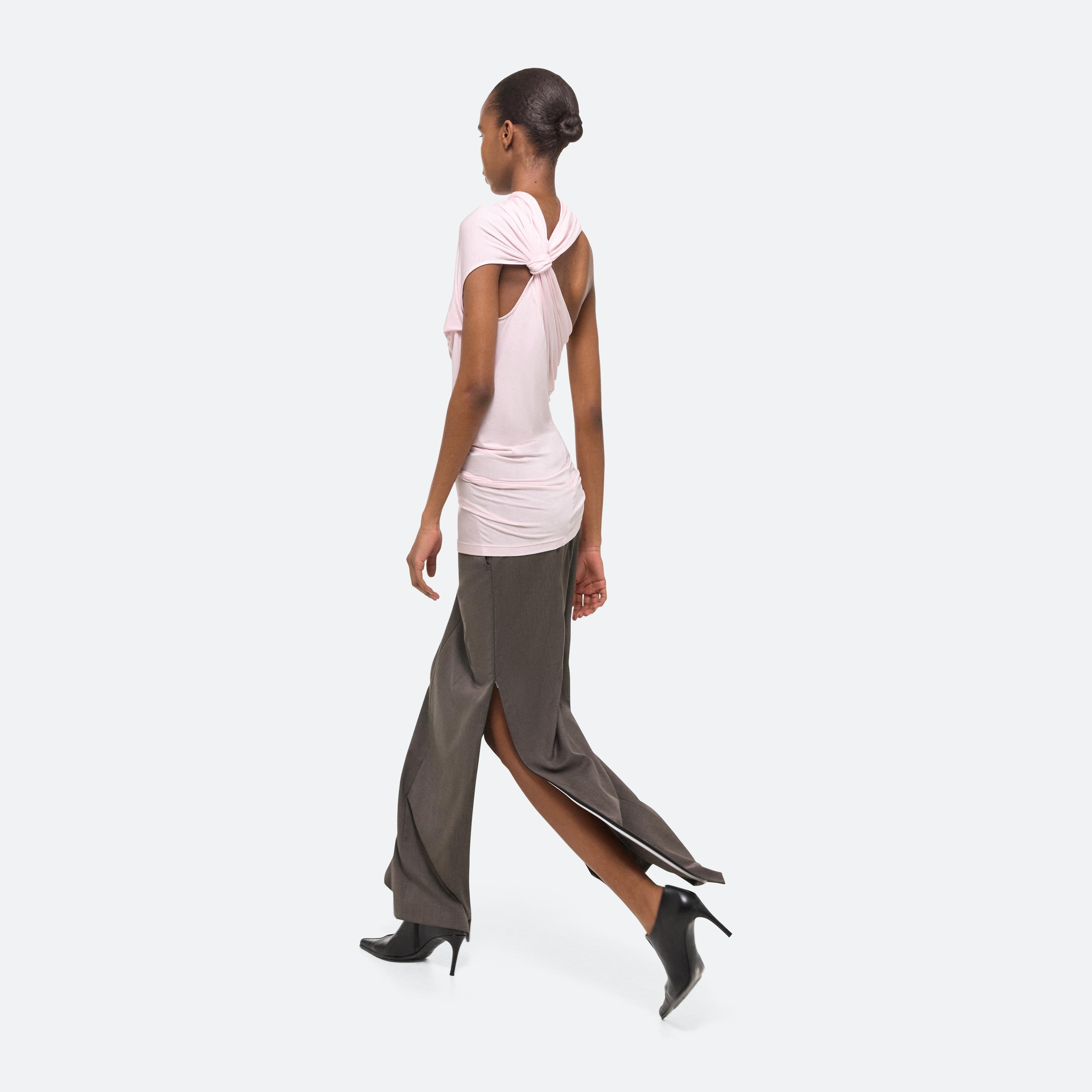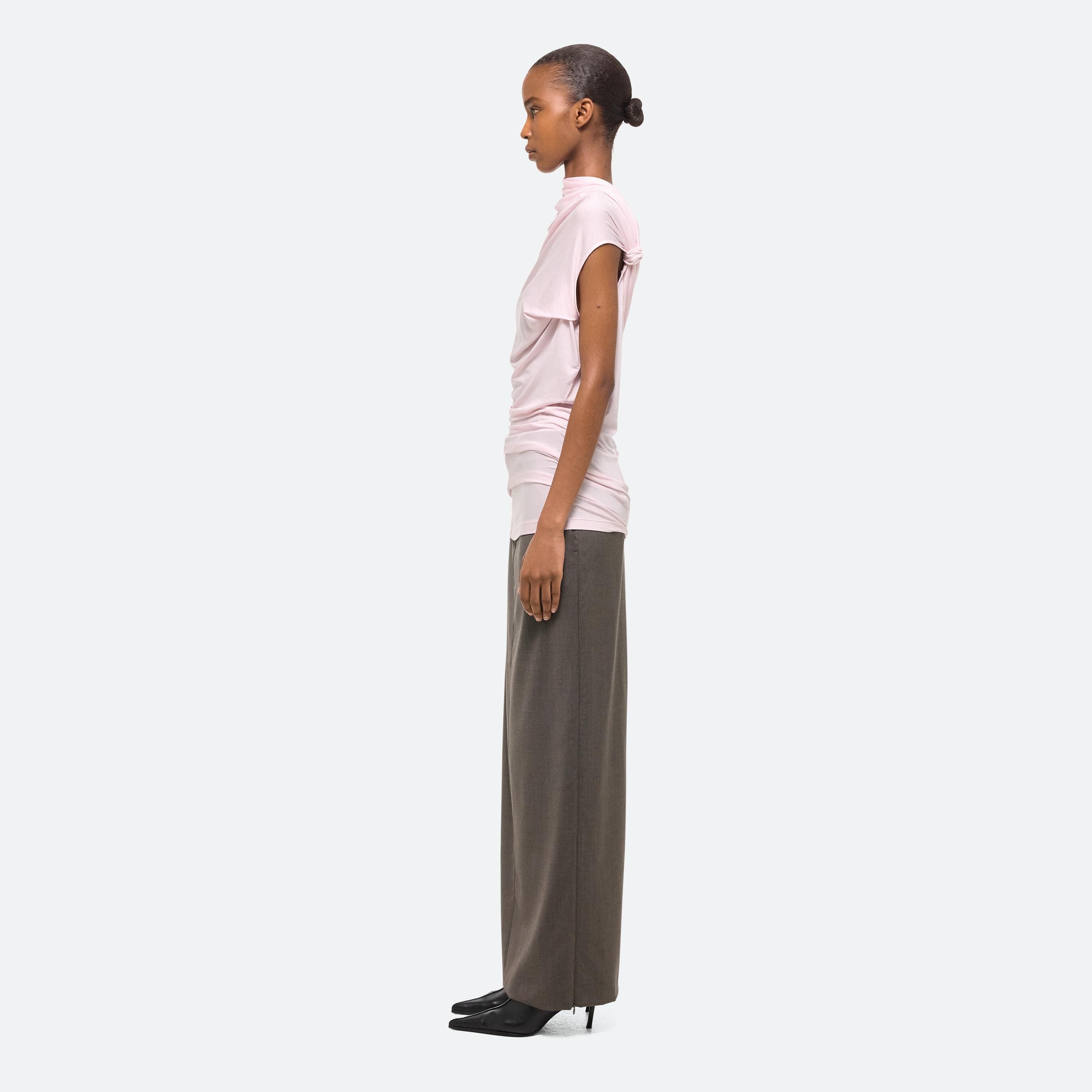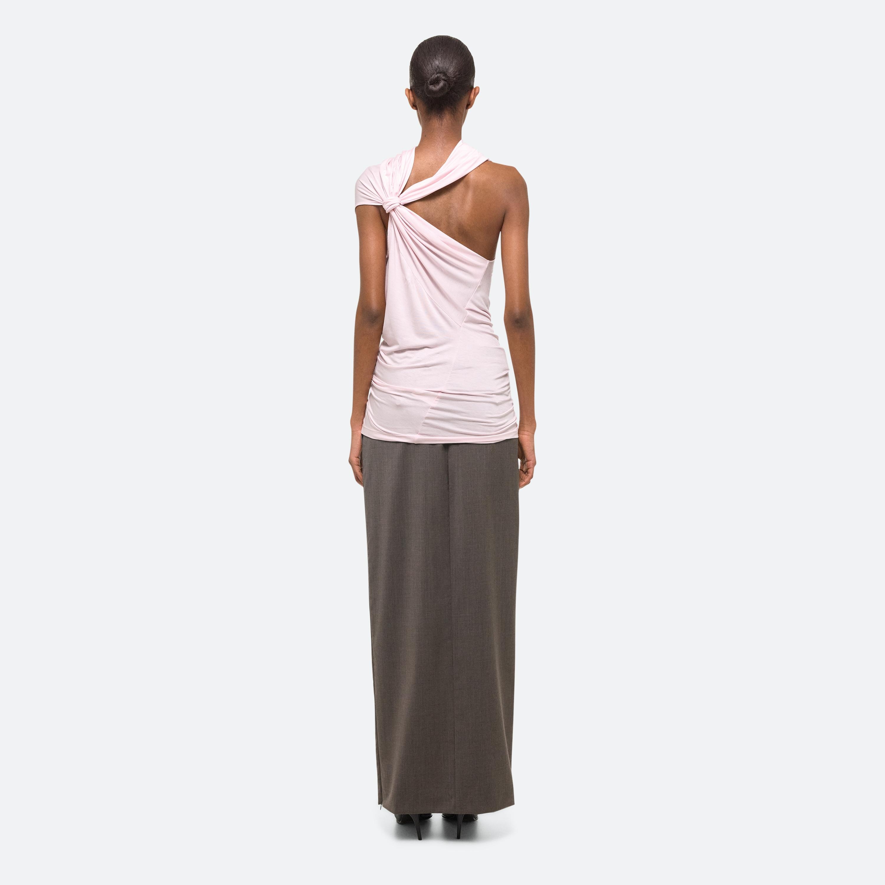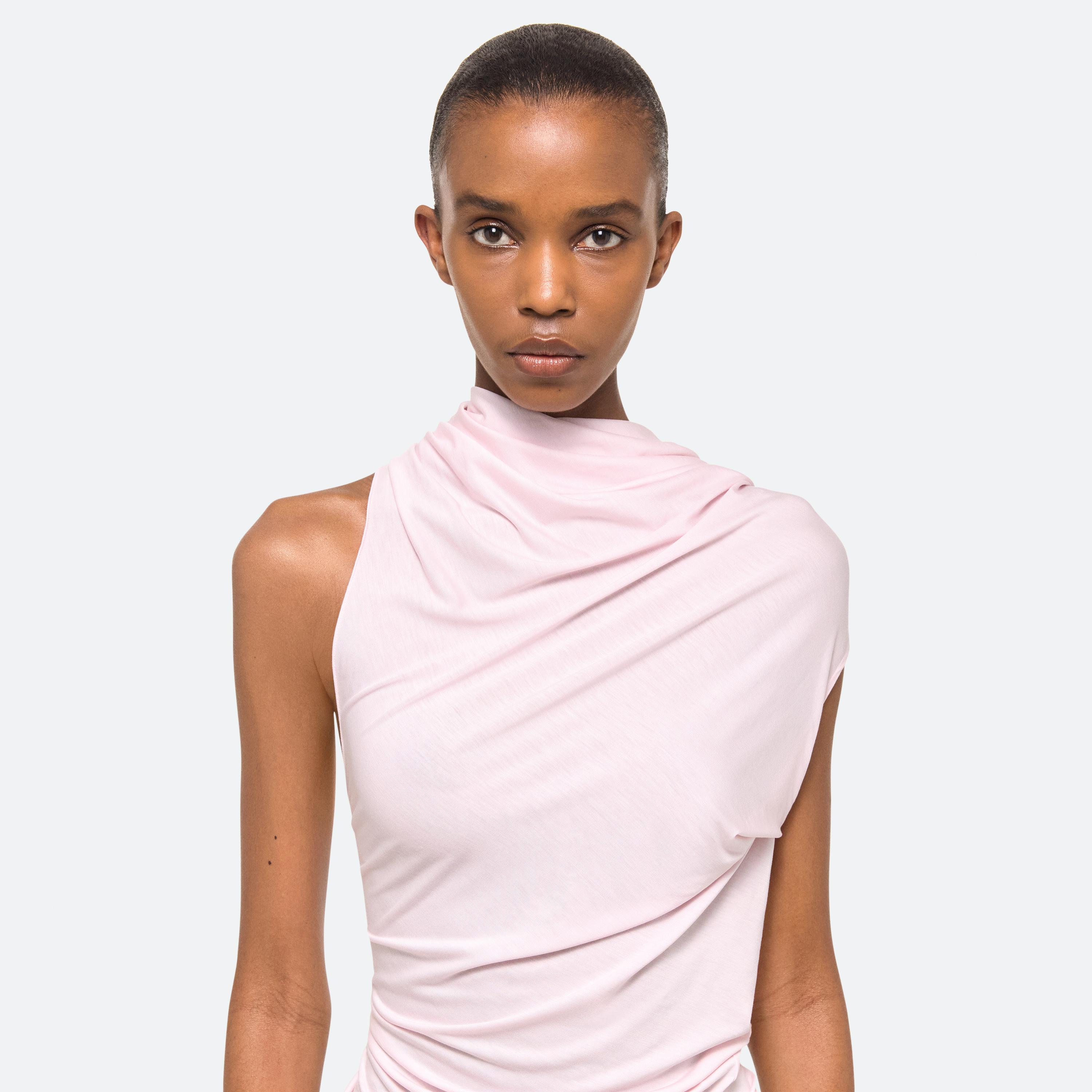 Sleeveless top in soft lyocell jersey, draped to mimic the way fabric moves against the wind. Cut for a looser fit, with a high neck and asymmetrical knotted back. Matches the Wind Skirt.
