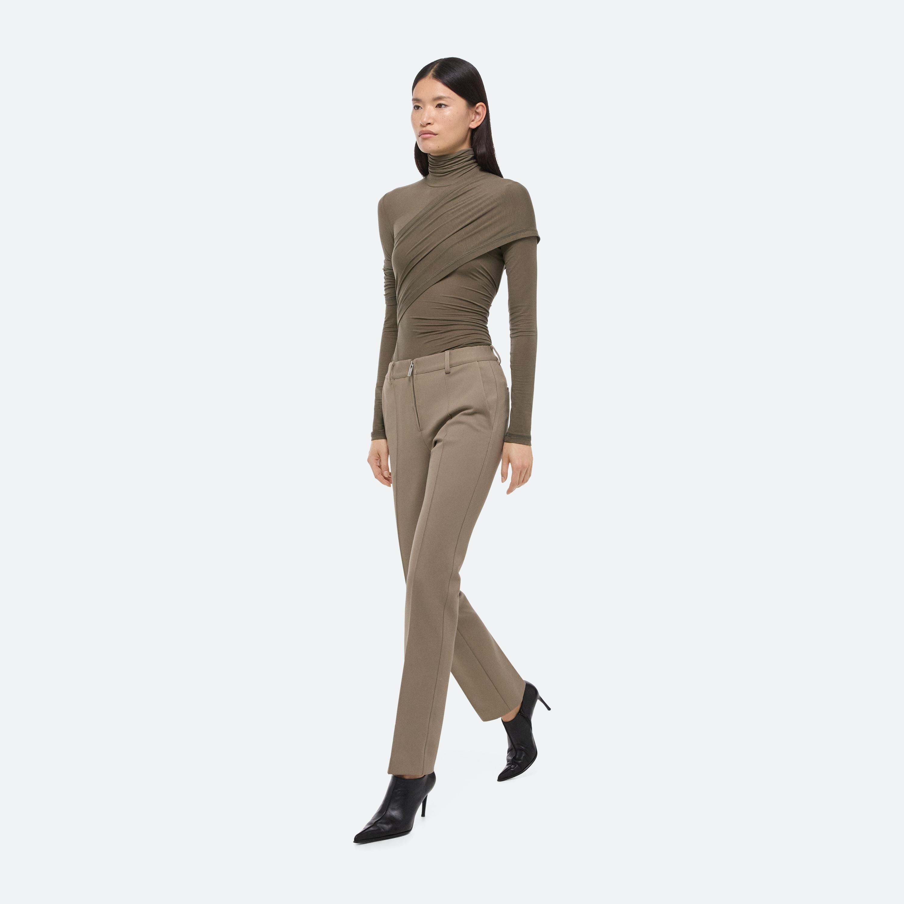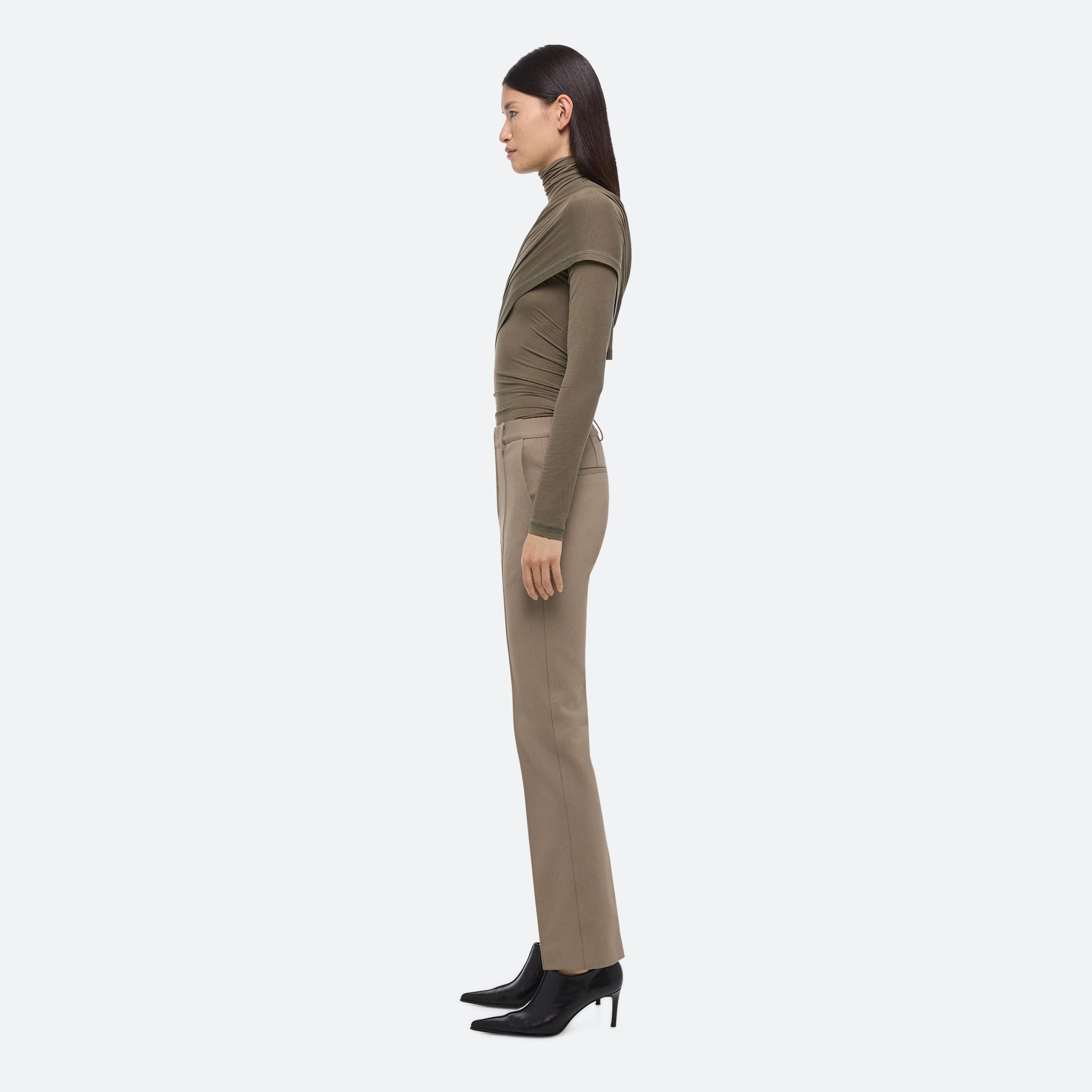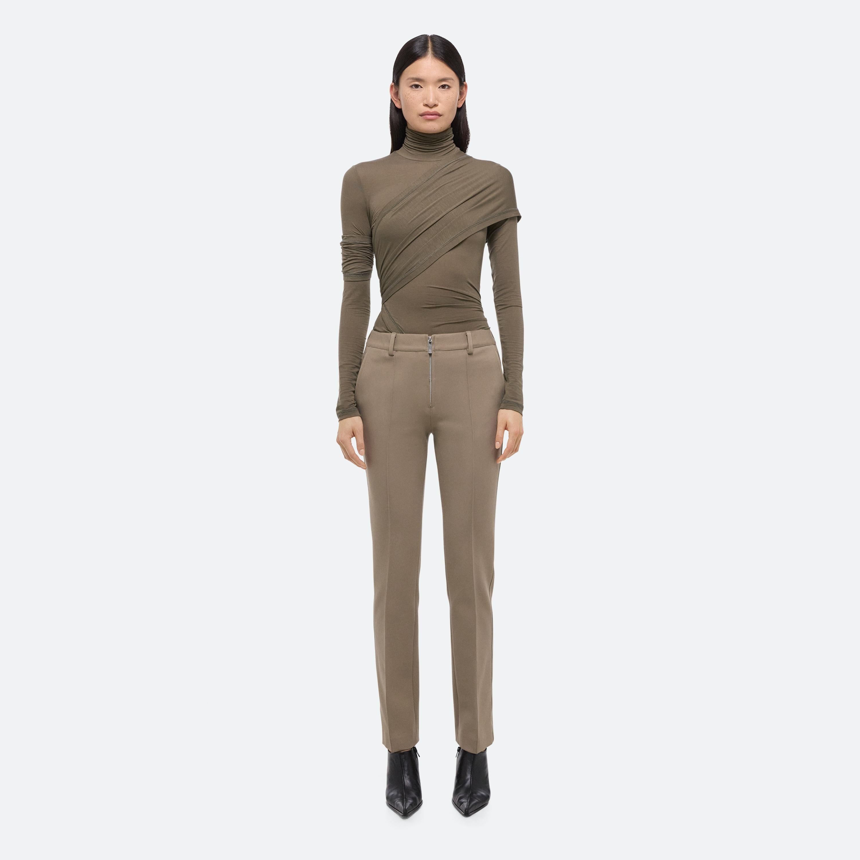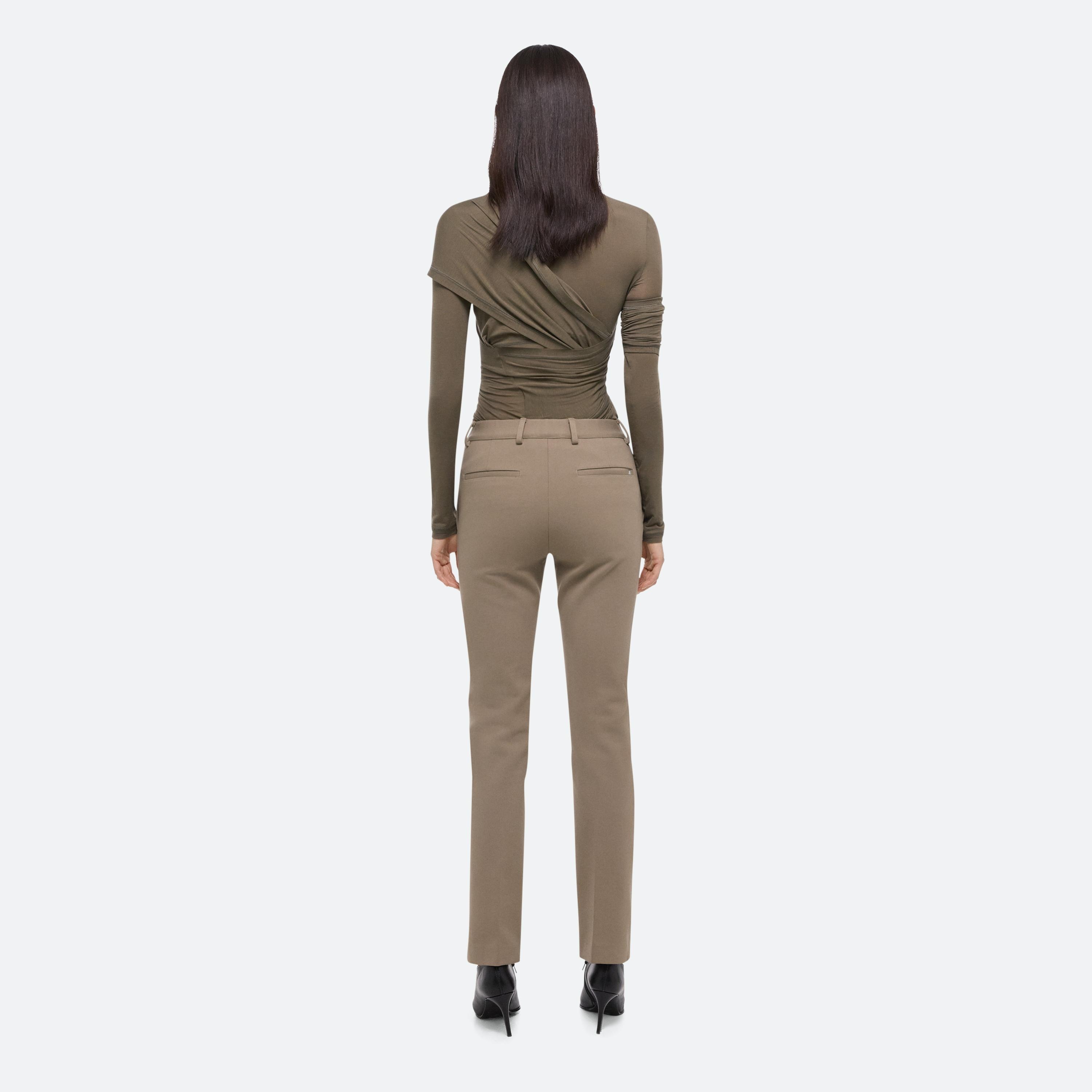 Tailored cigarette pants cut in a dense, structured ponte knit. Finished with an exposed front zipper and classic trouser details, including welt pockets and a pintucked front crease. Matches the Waisted Blazer.