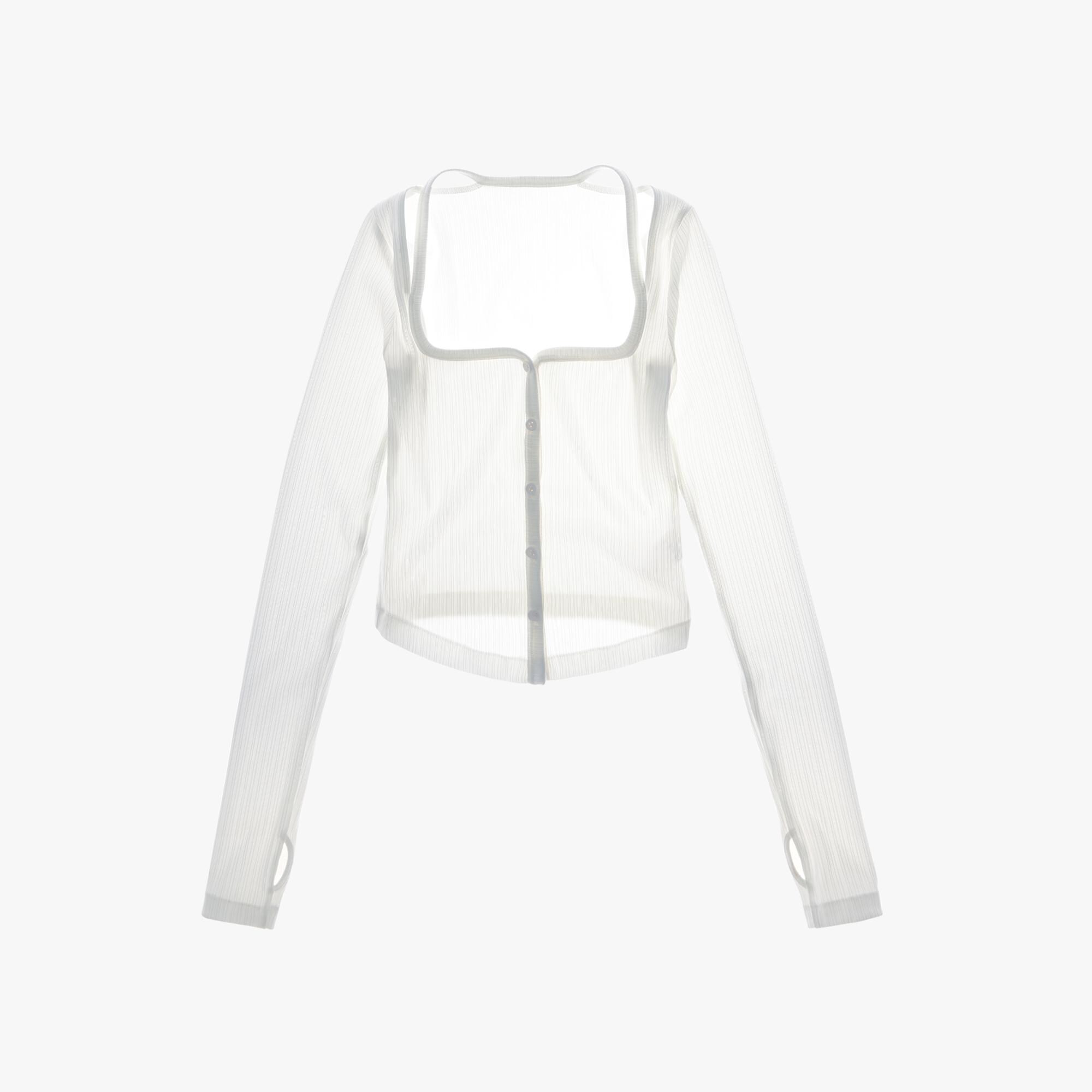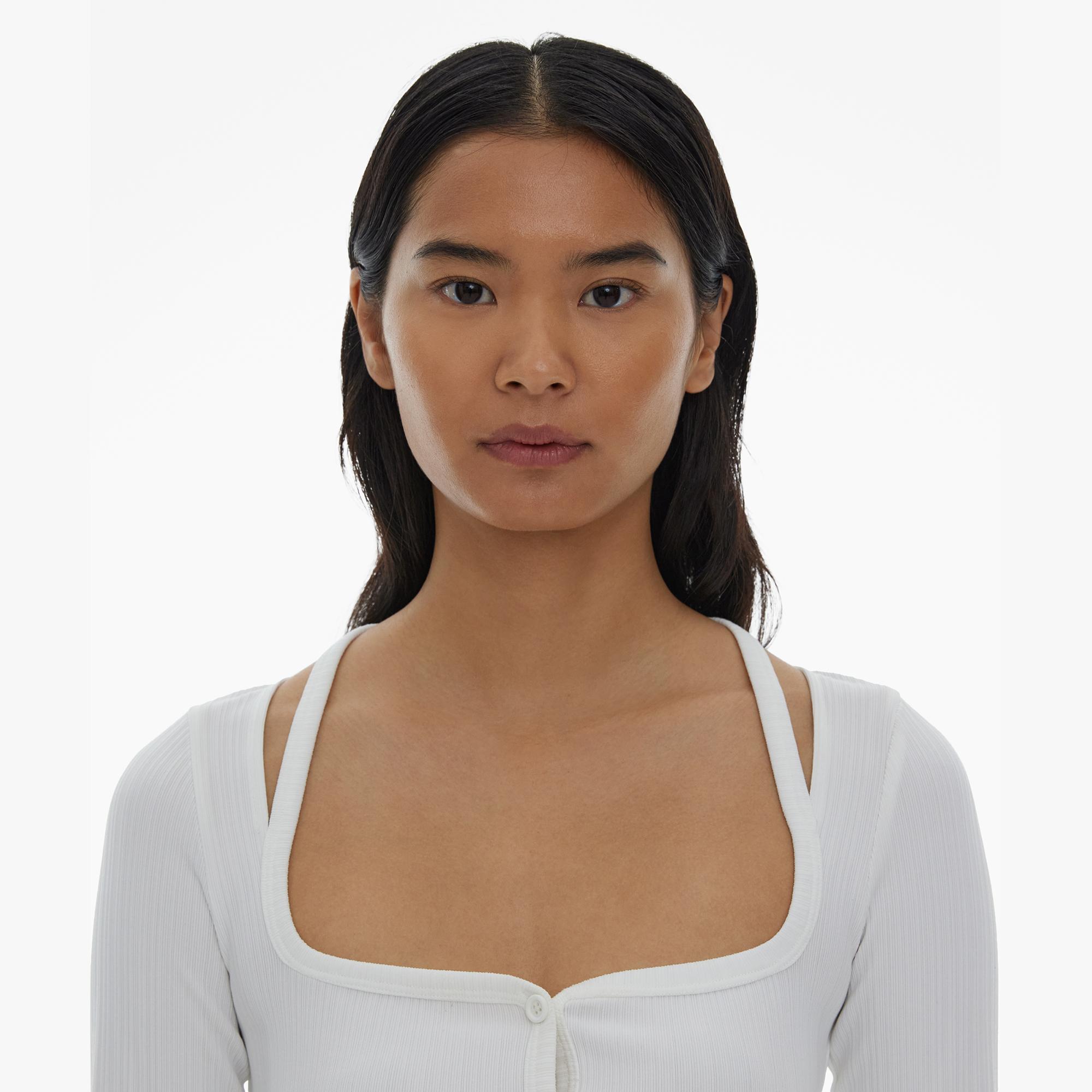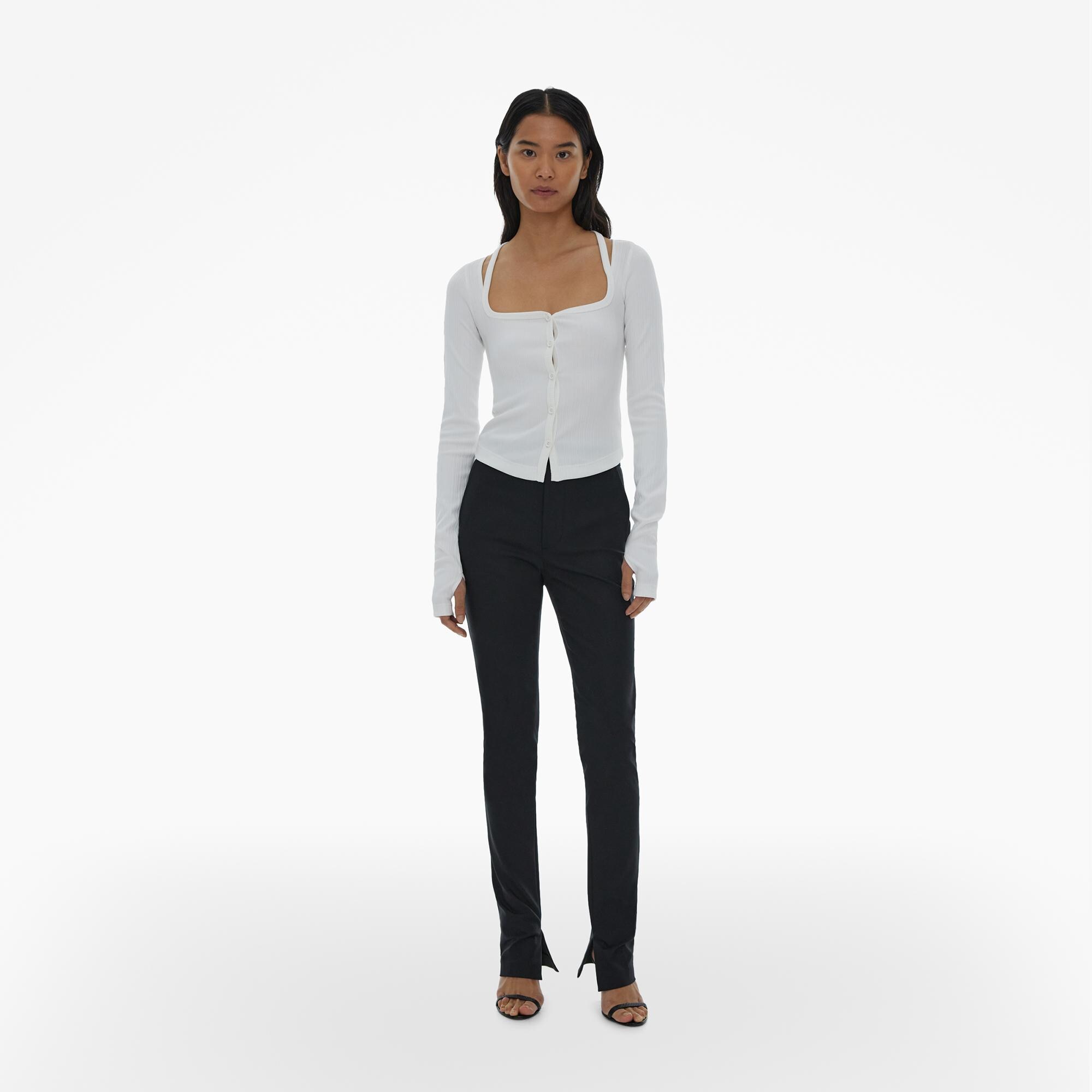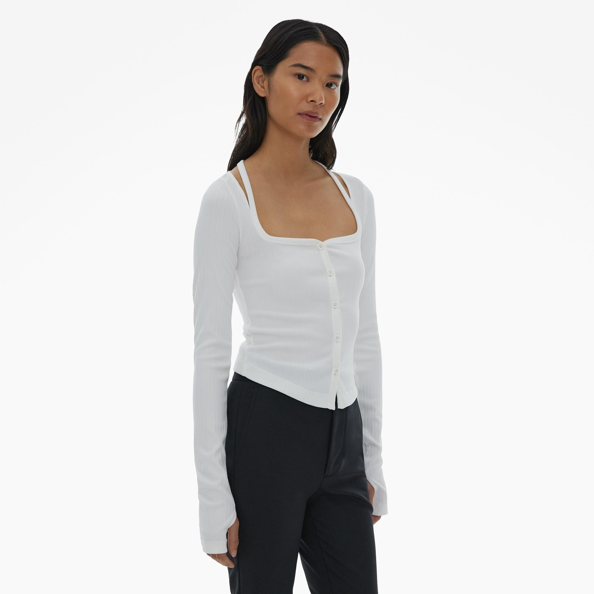 The Helmut Lang Cardigan is a slim-fitting style in cotton rib knit with a square neckline with slash details, button front closures, long sleeves with thumbhole details.