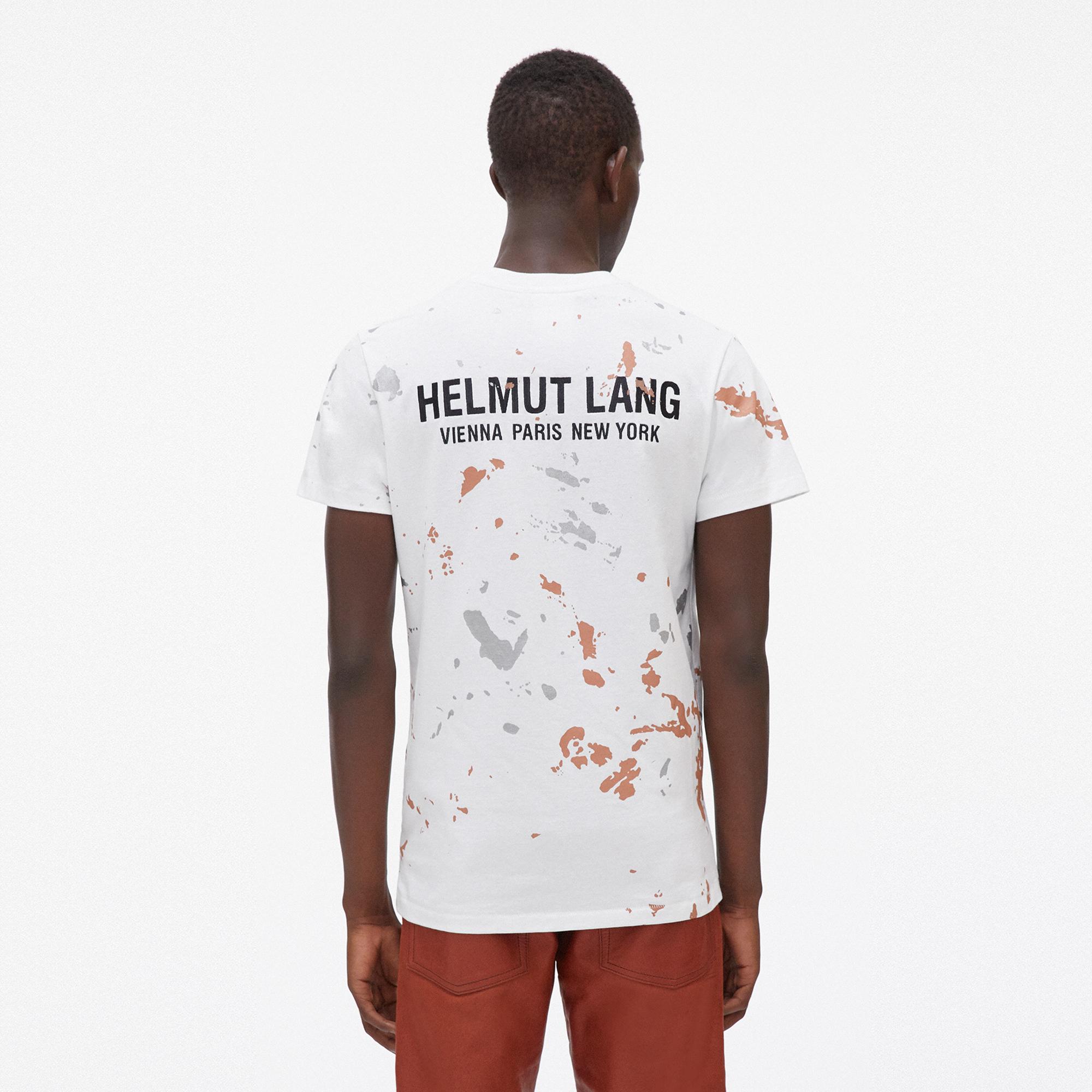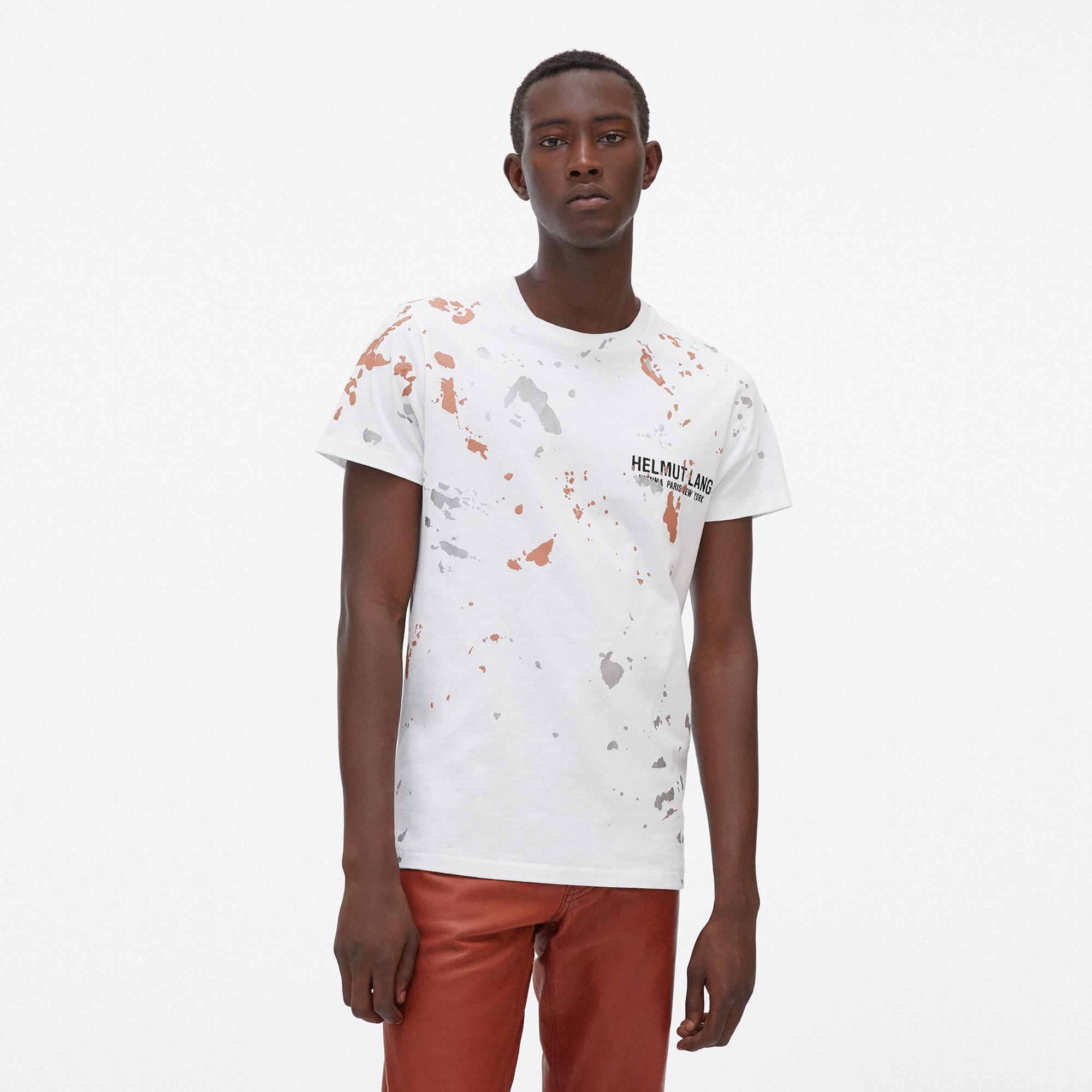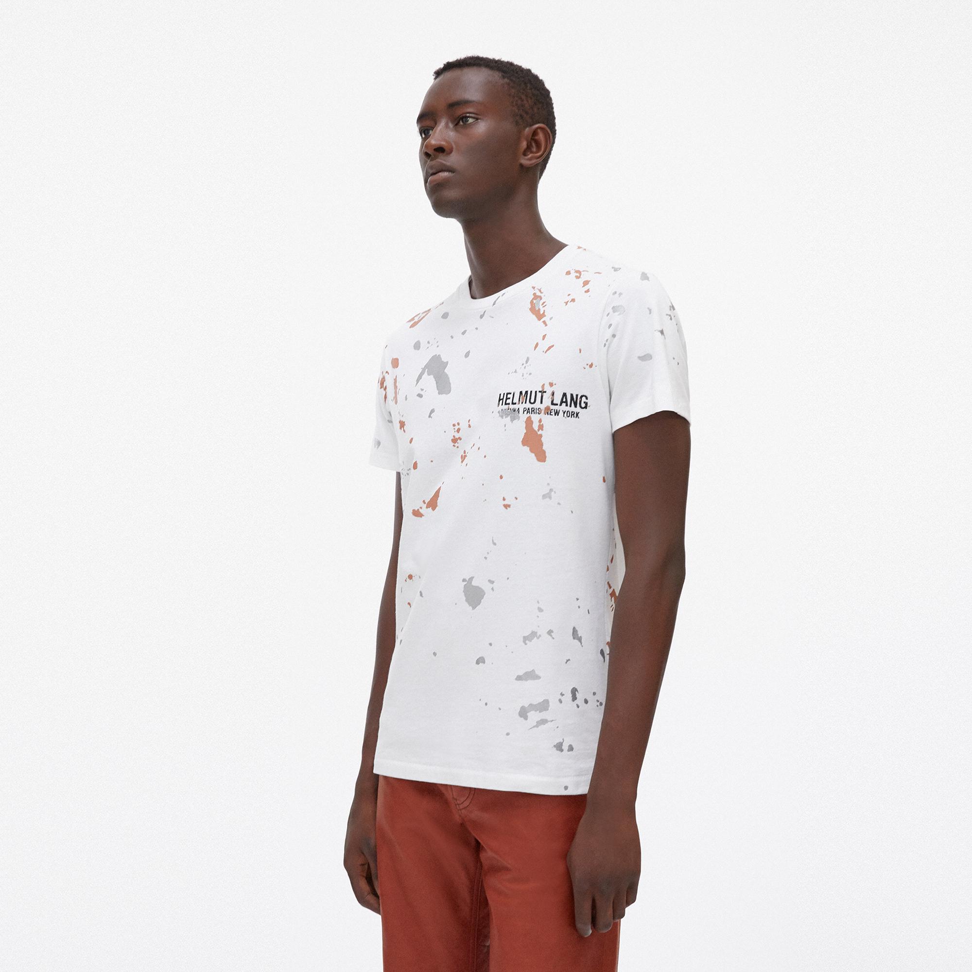 The Helmut Lang Standard Painter Tee is a cotton t-shirt with a printed paint-splatter pattern over an embroidered monogram