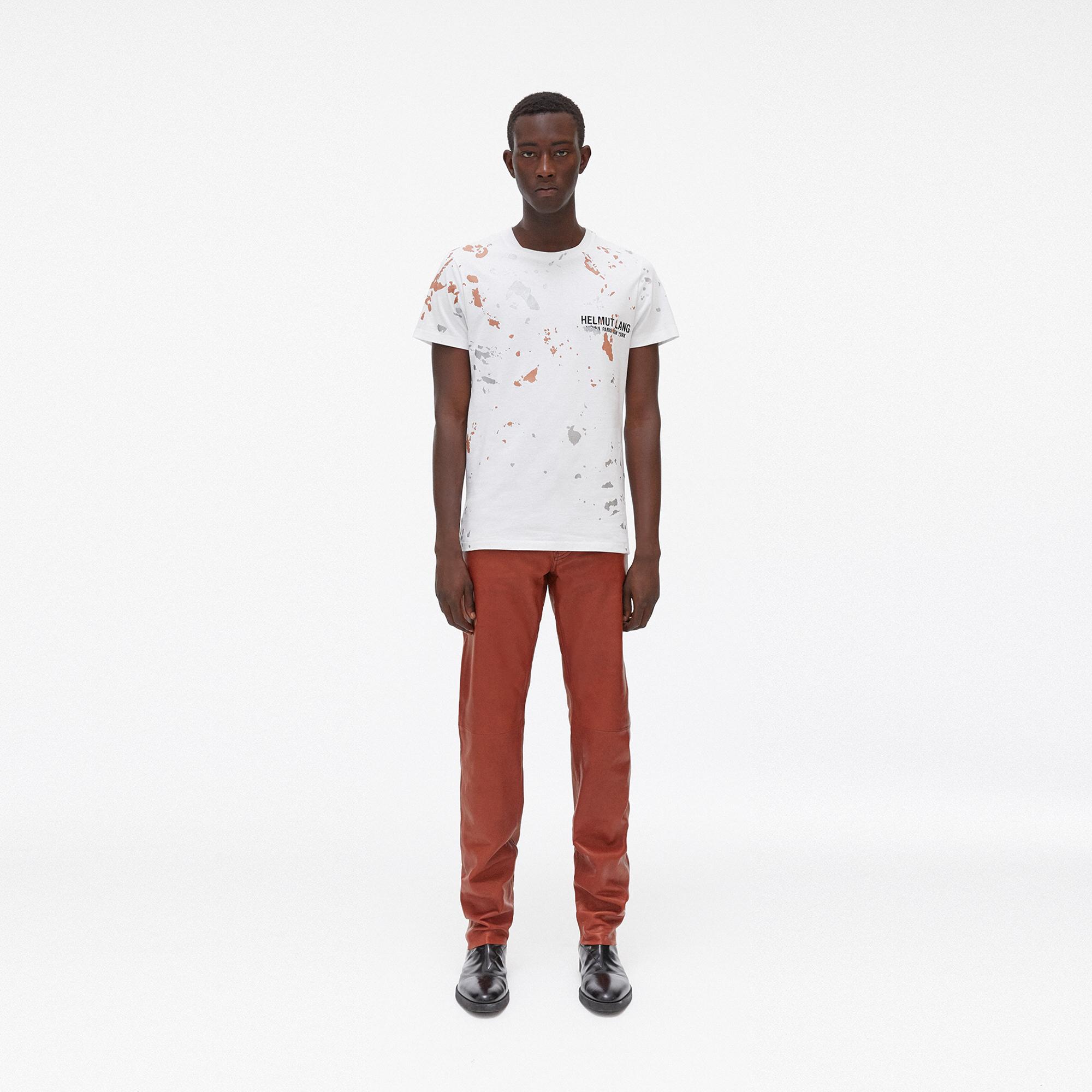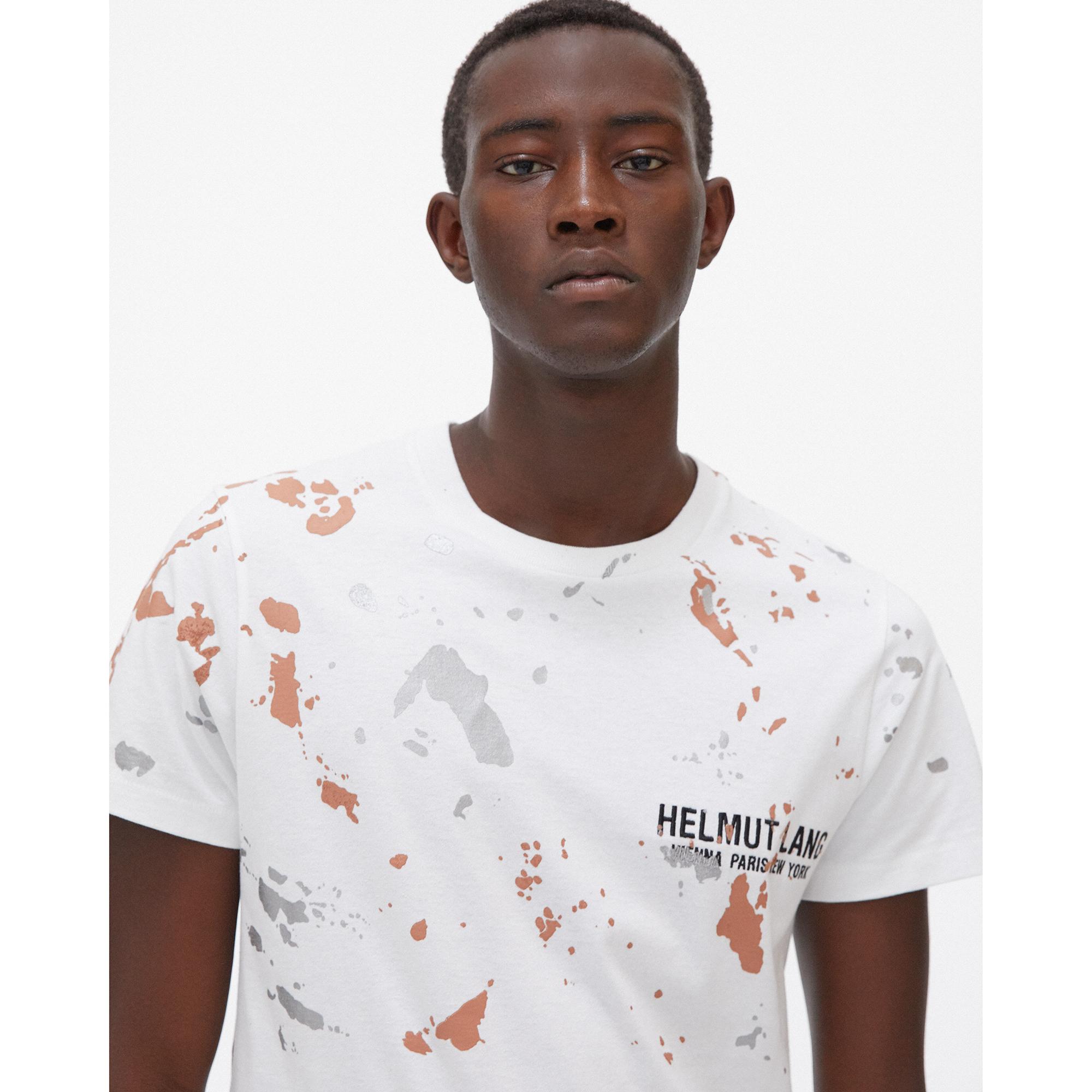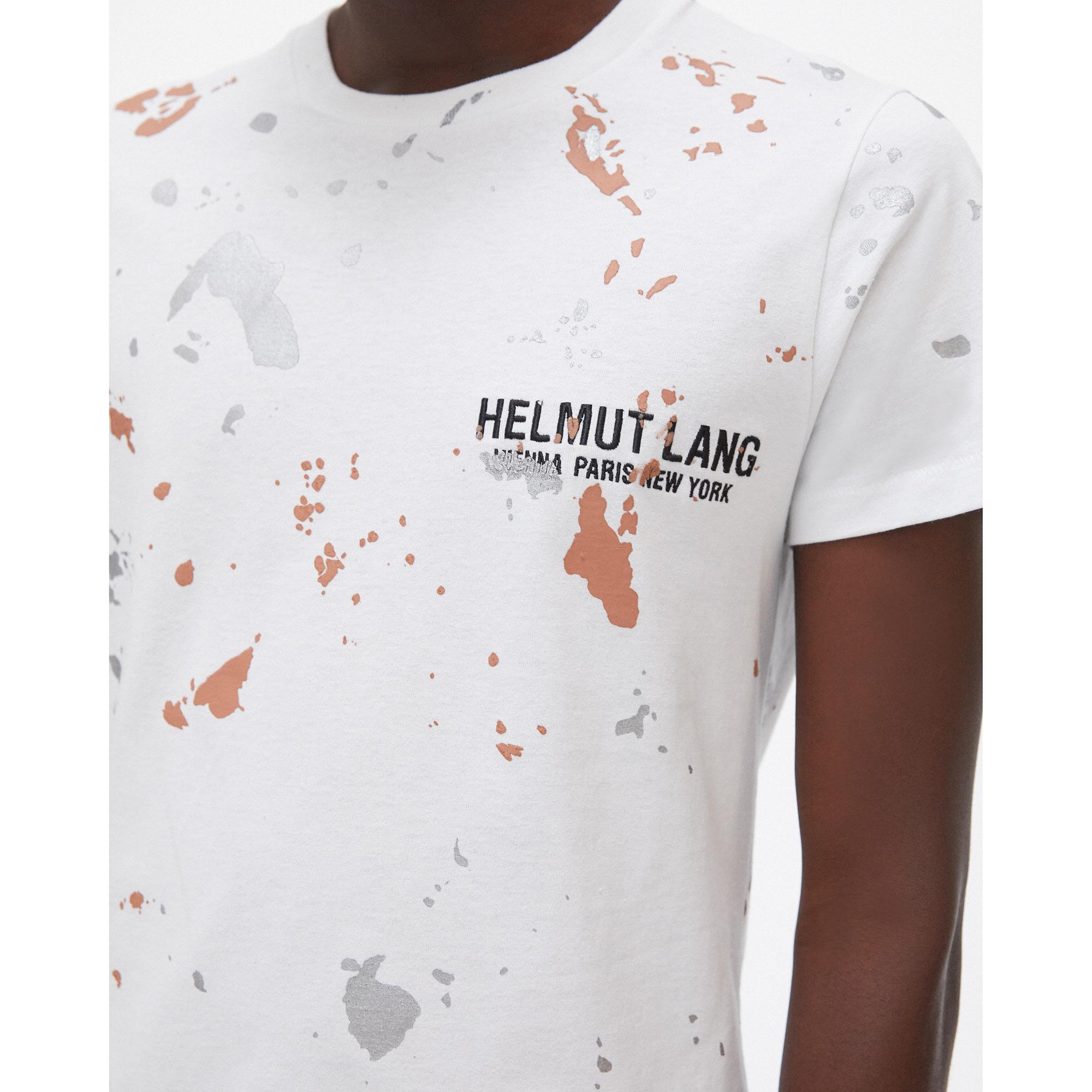 The Helmut Lang Standard Painter Tee is a cotton t-shirt with a printed paint-splatter pattern over an embroidered monogram