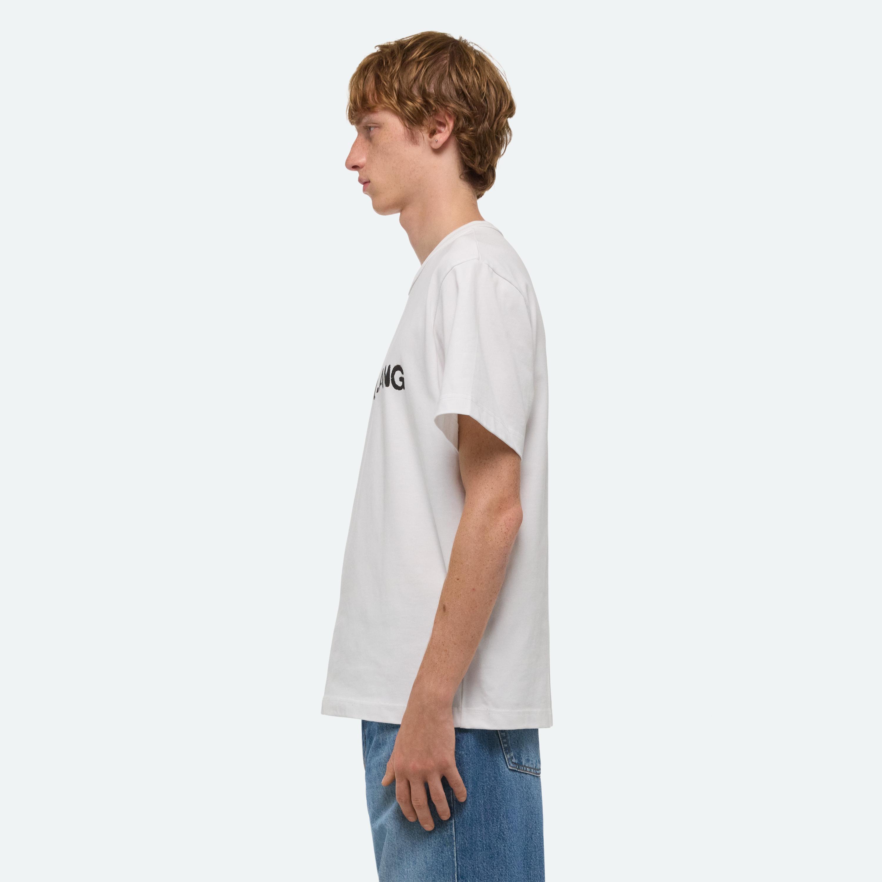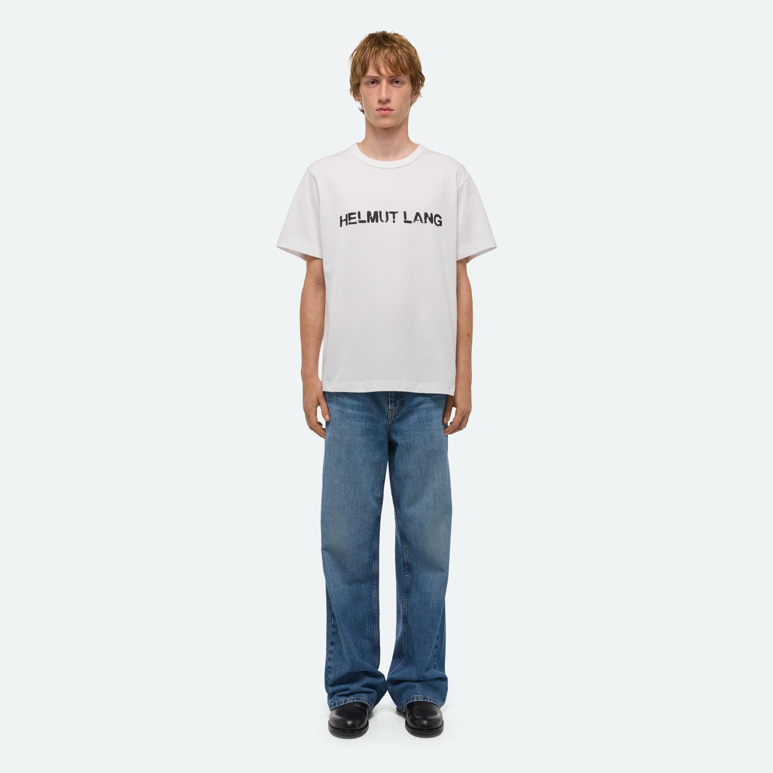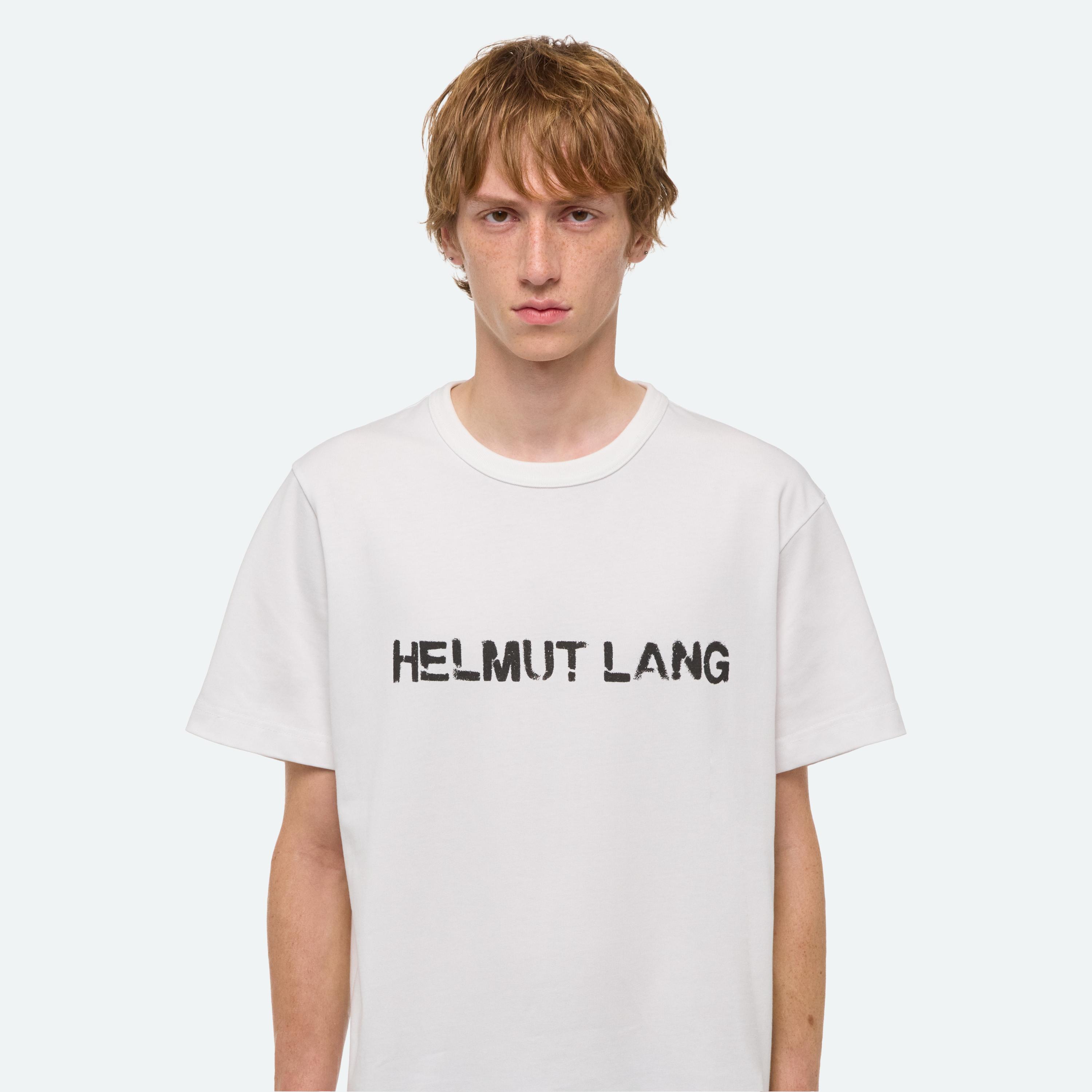 Crewneck tee with painted stencil logo on front.