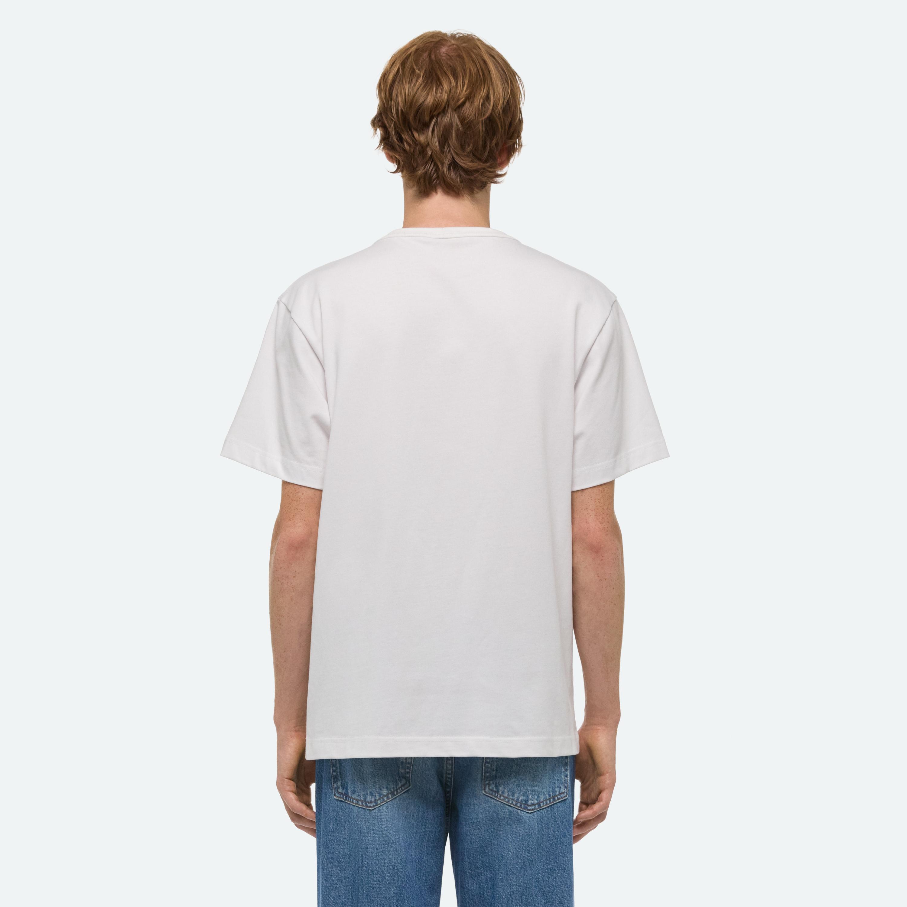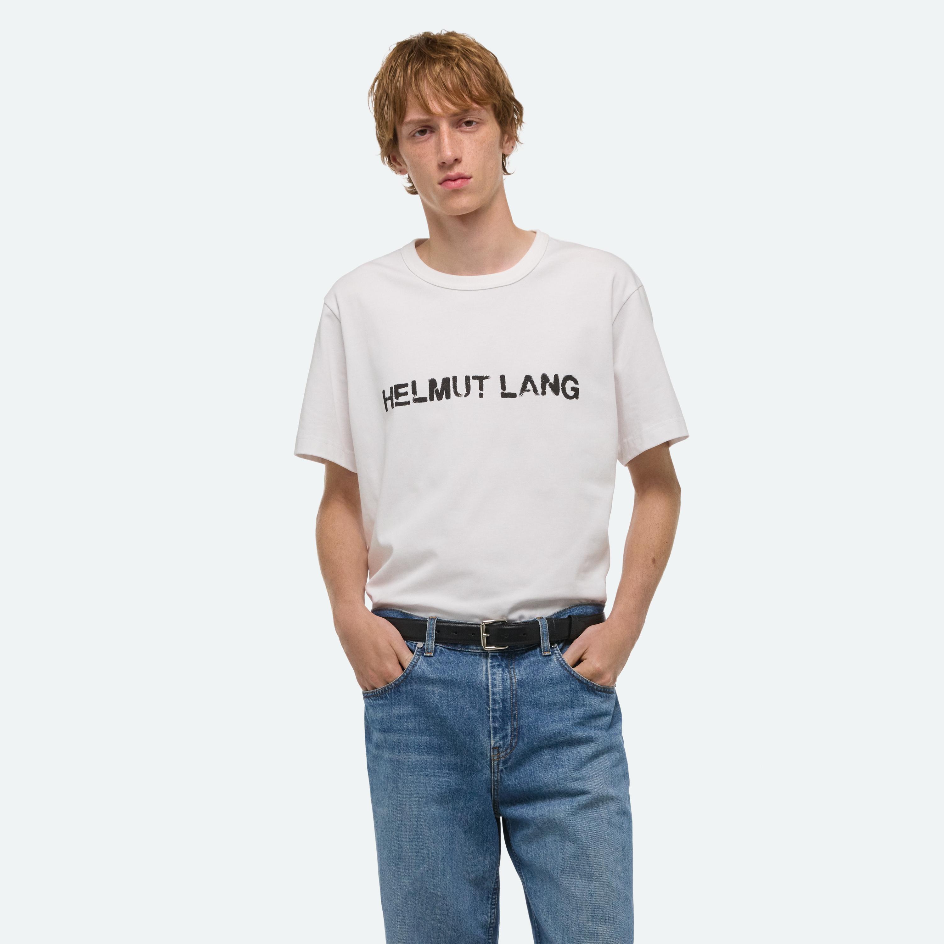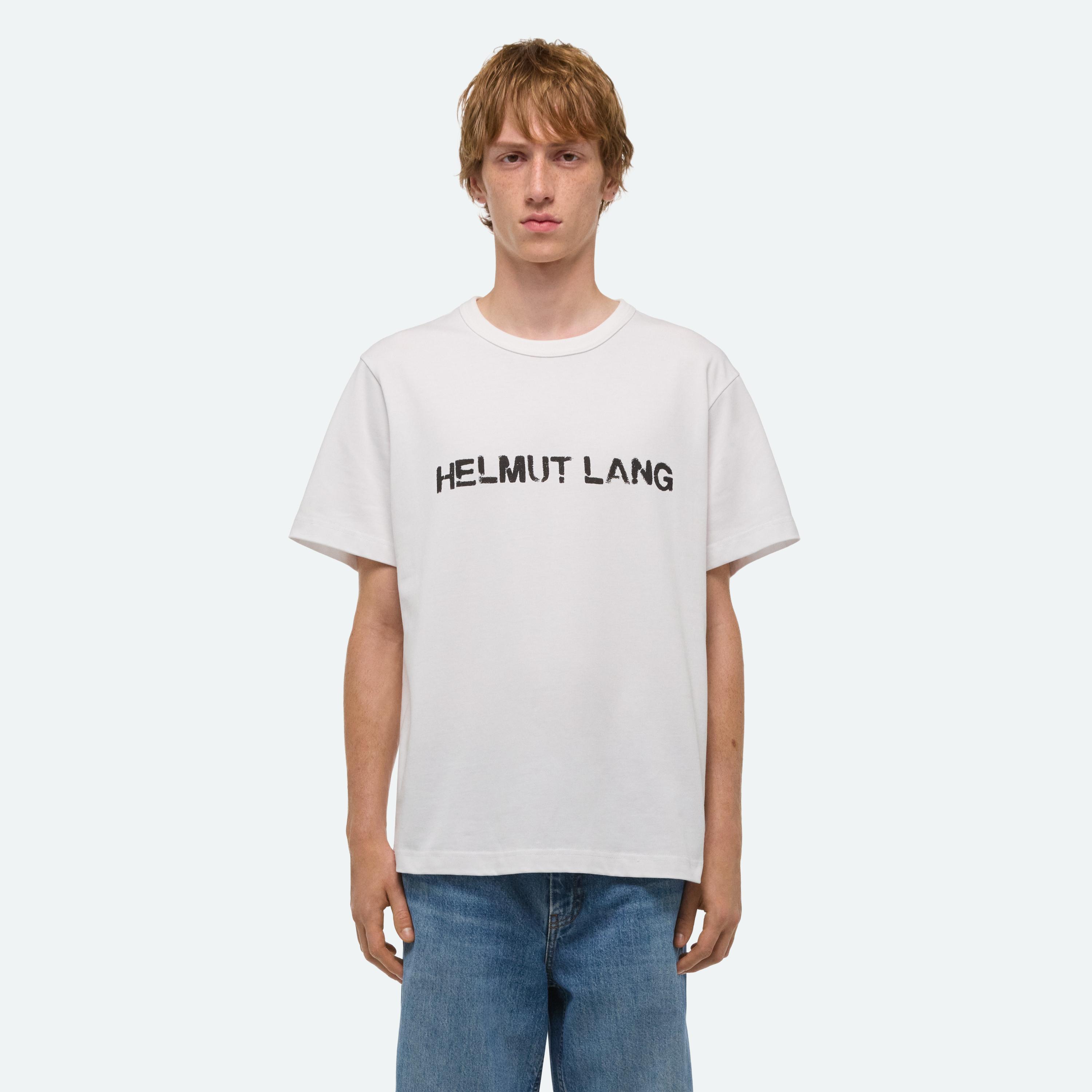 Crewneck tee with painted stencil logo on front.