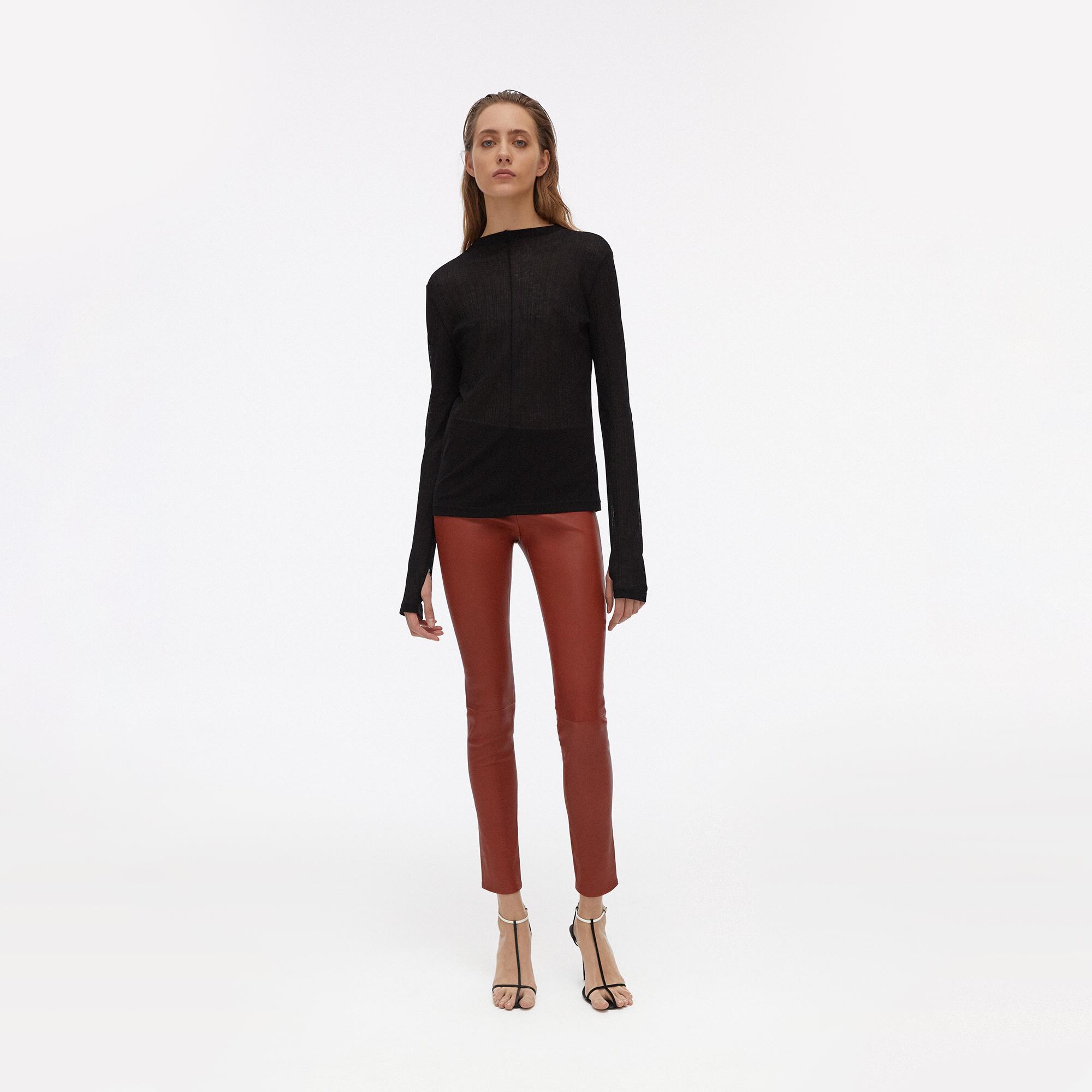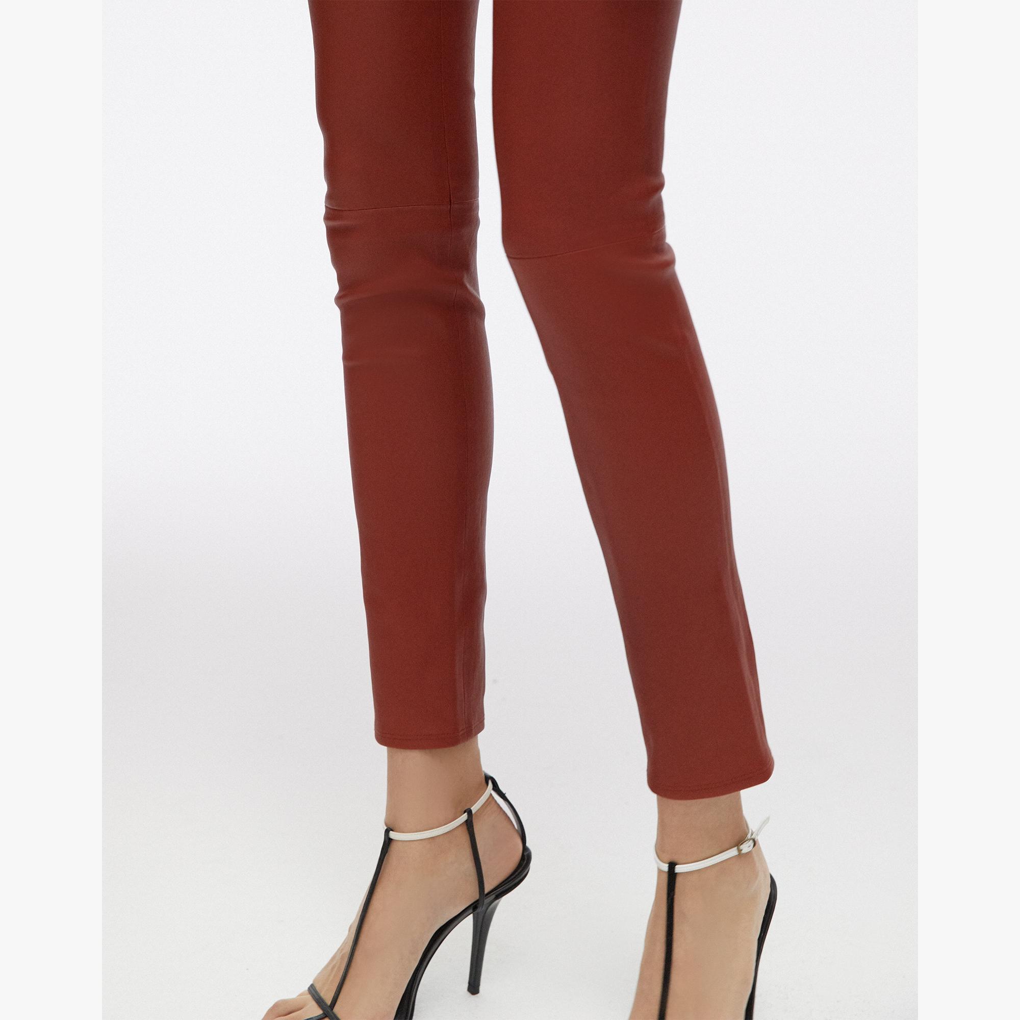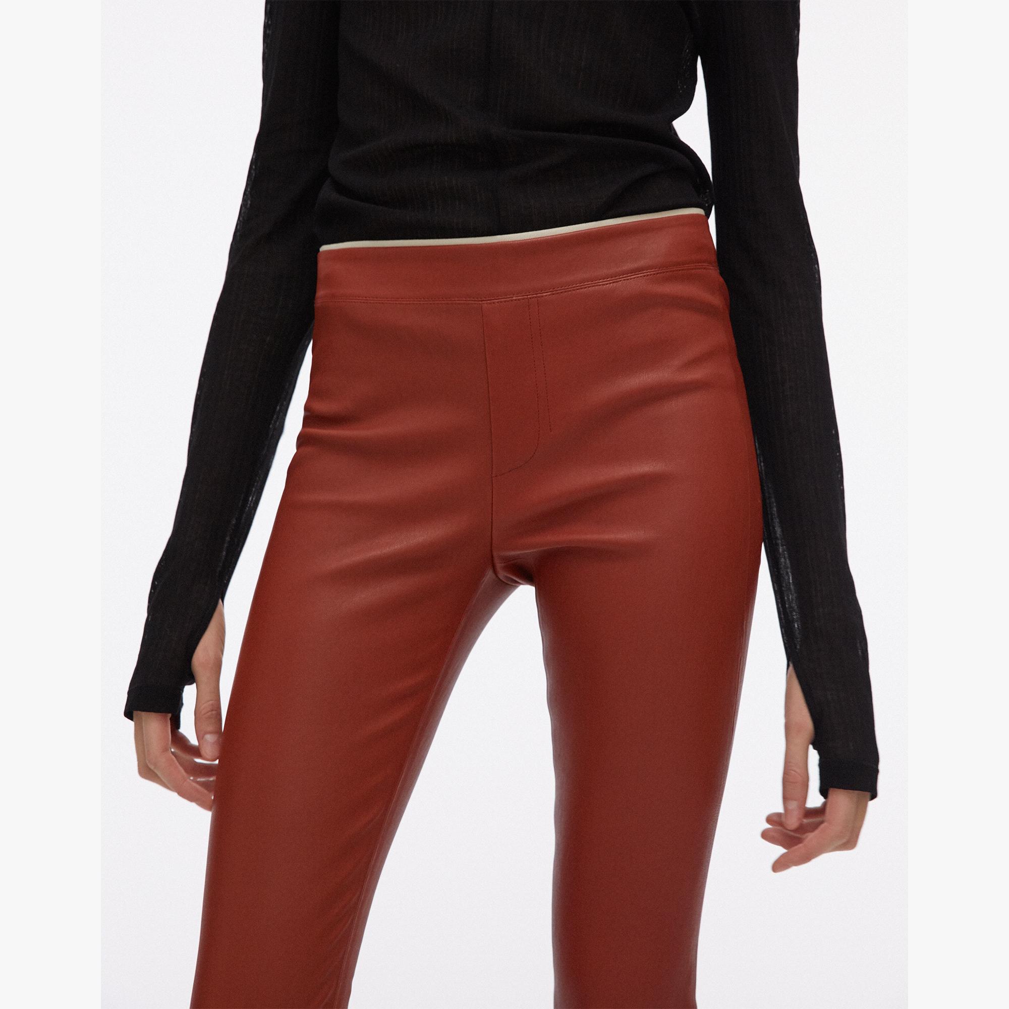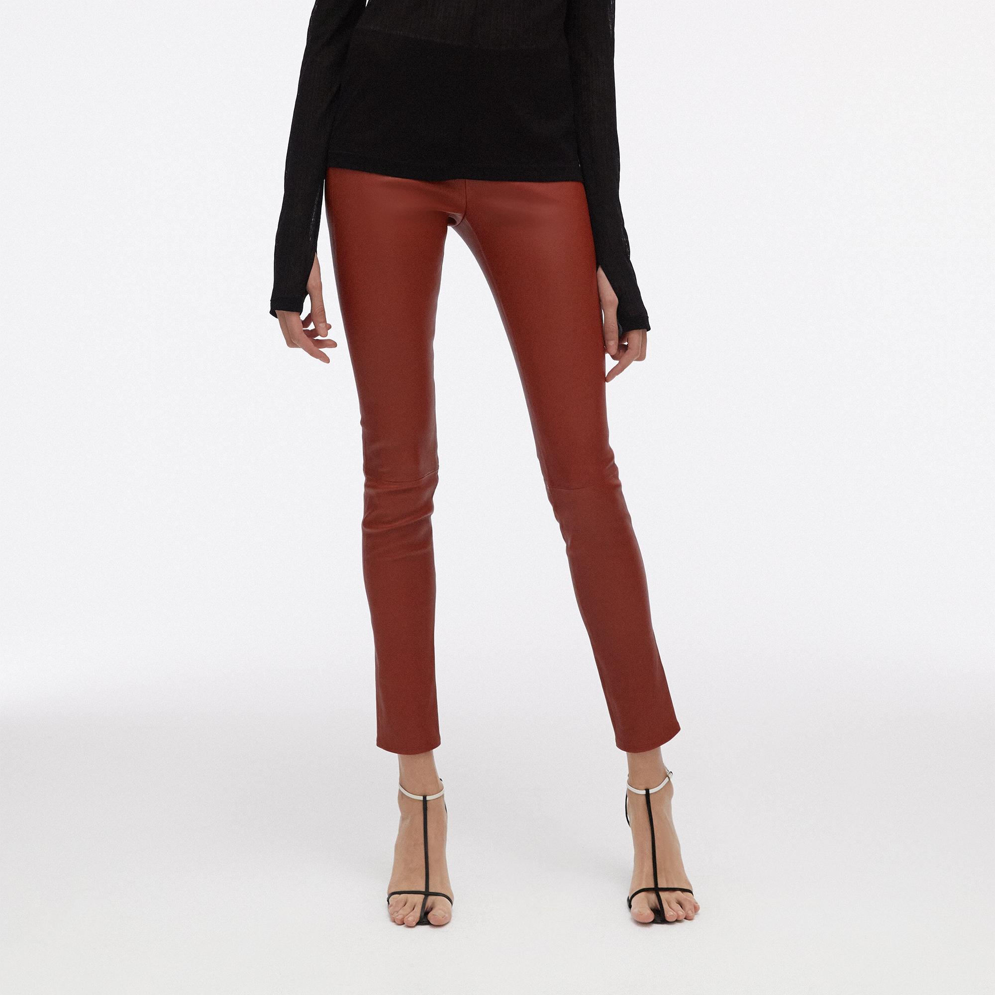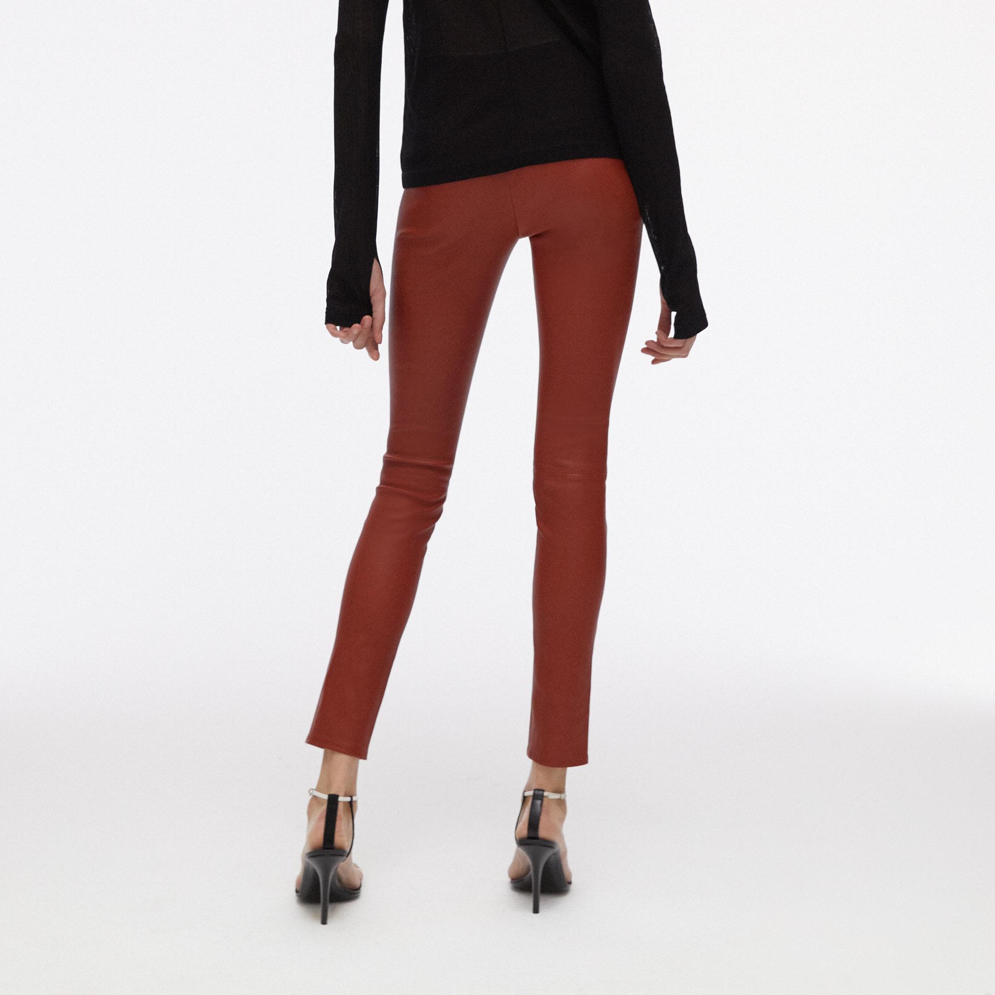 The Helmut Lang Leather Legging is a stretch lamb leather legging with an elastic waistband and faux fly detail