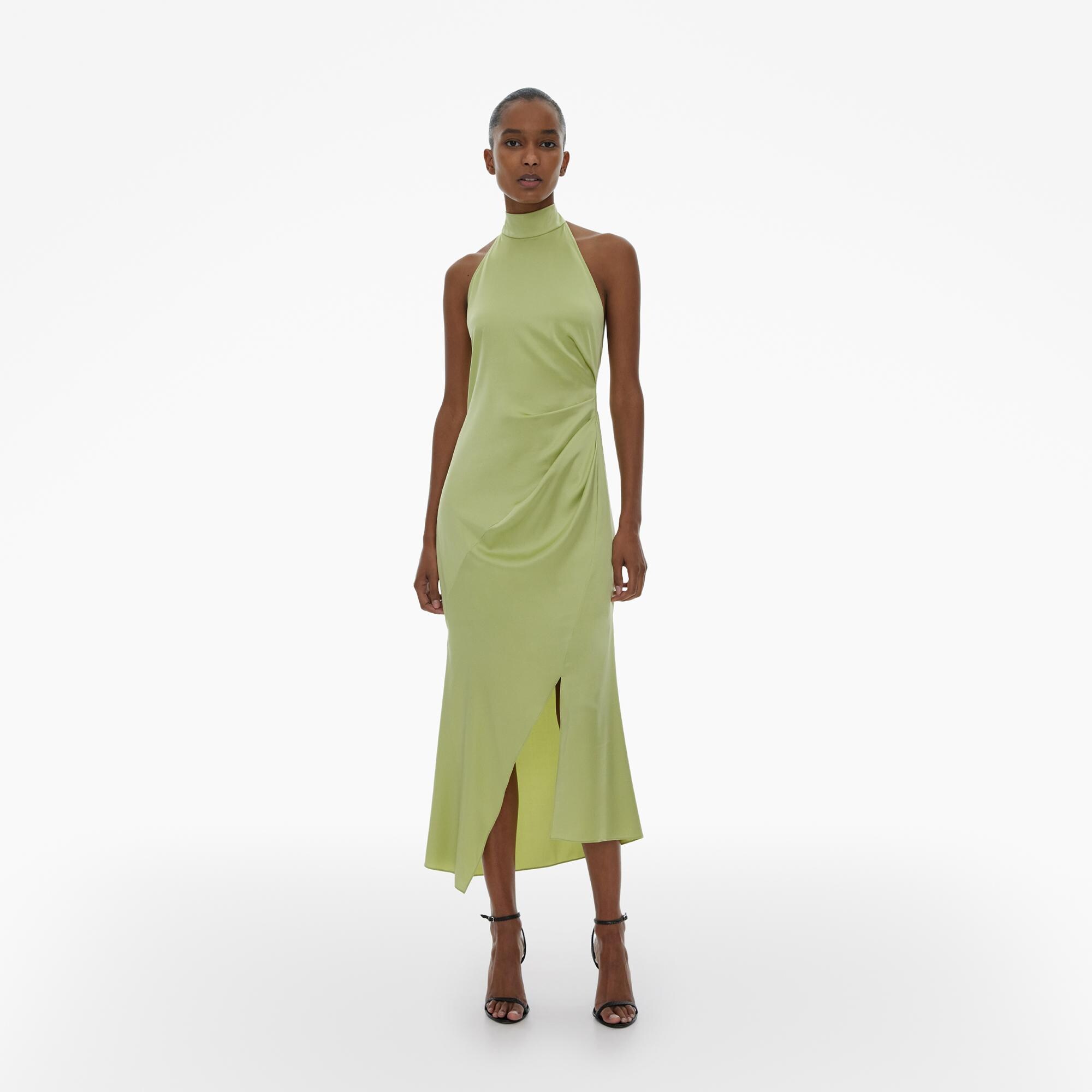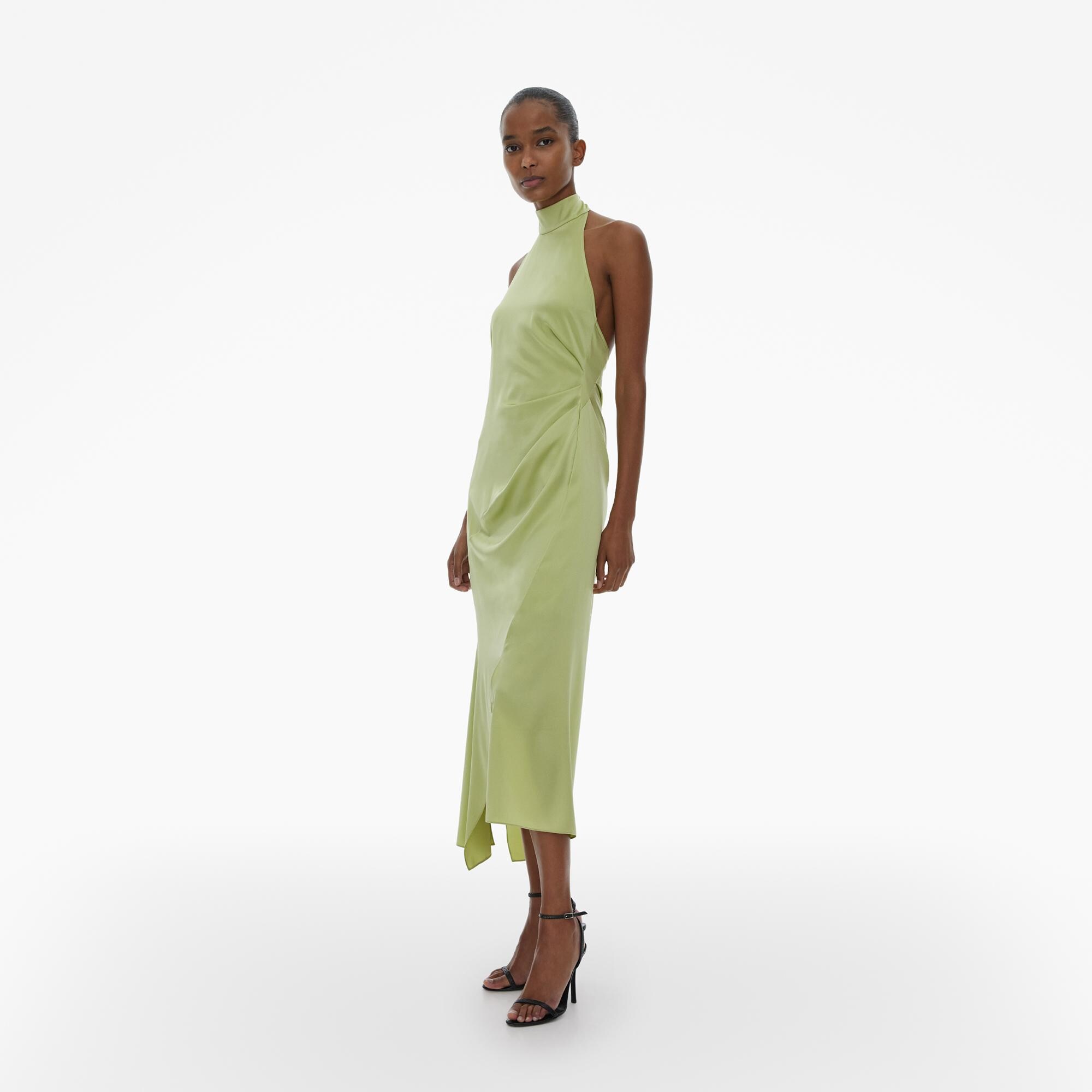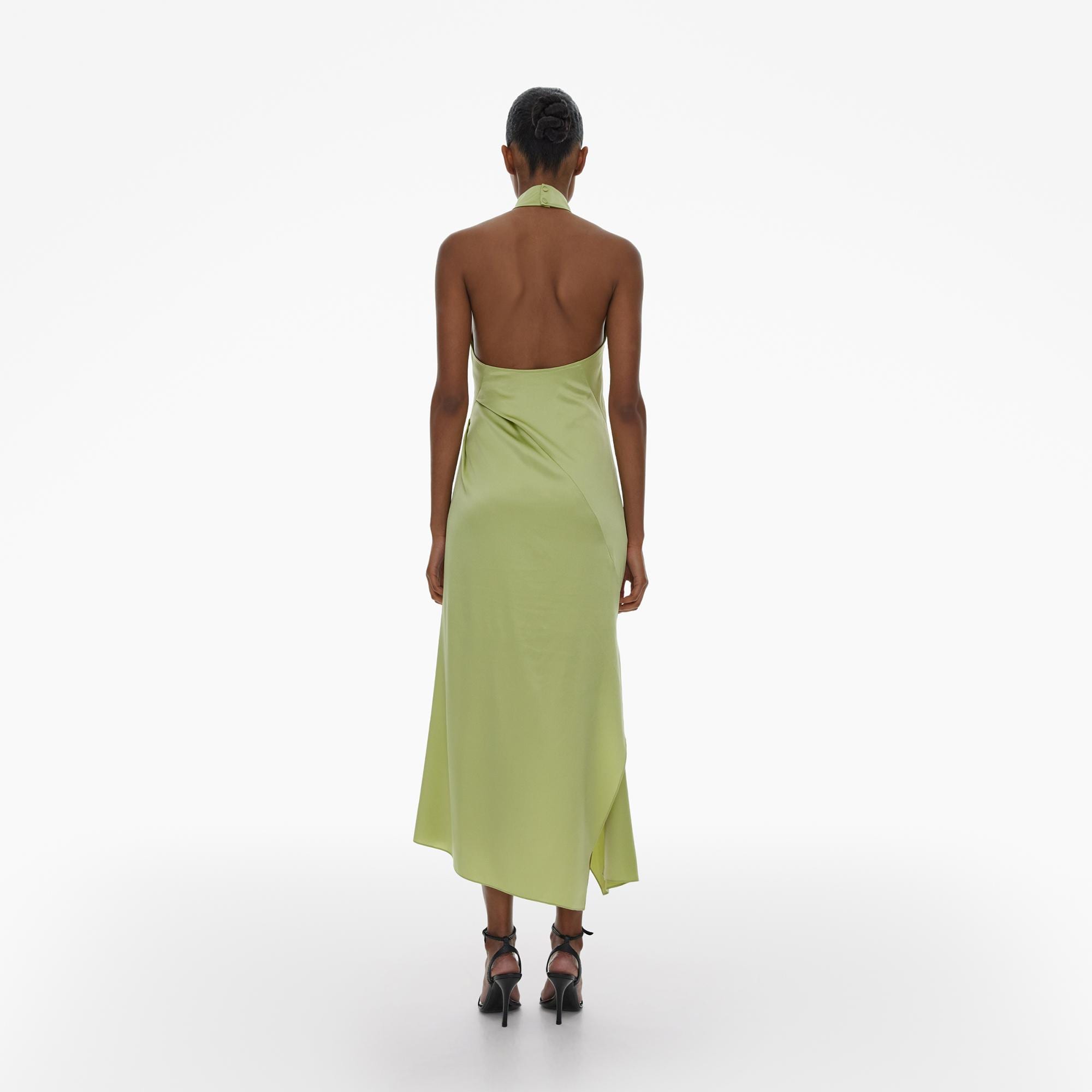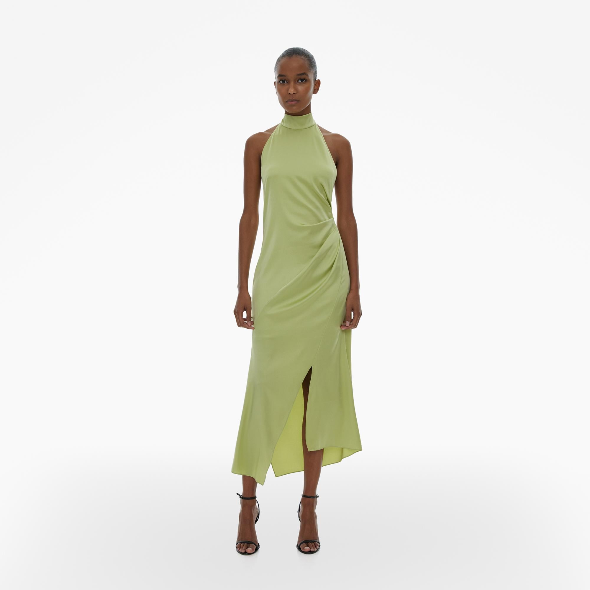 The Helmut Lang Midi Dress is a slim-fitting style in stretch silk satin with a halter neckline, back button closures, asymmetrical hem with a slit detail.