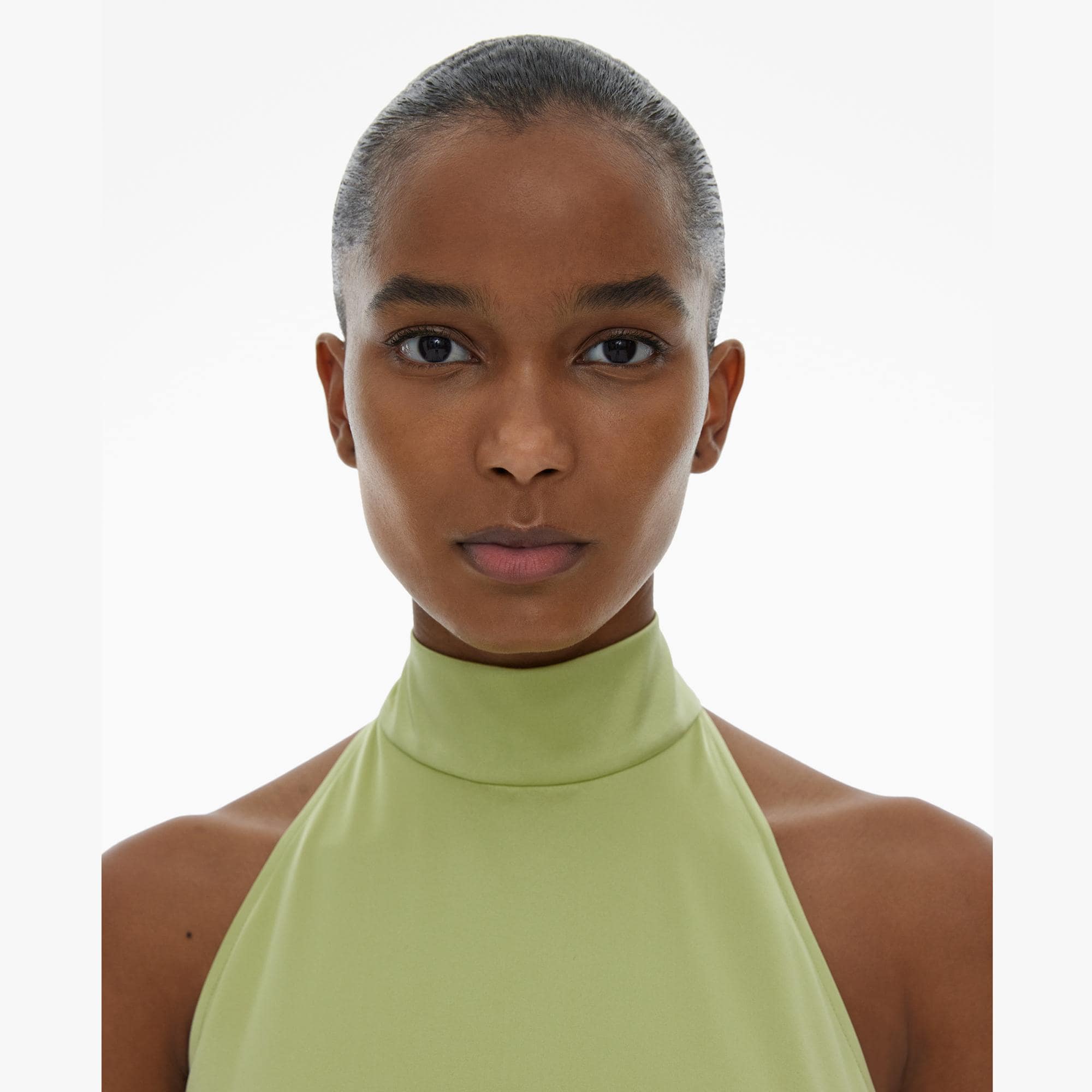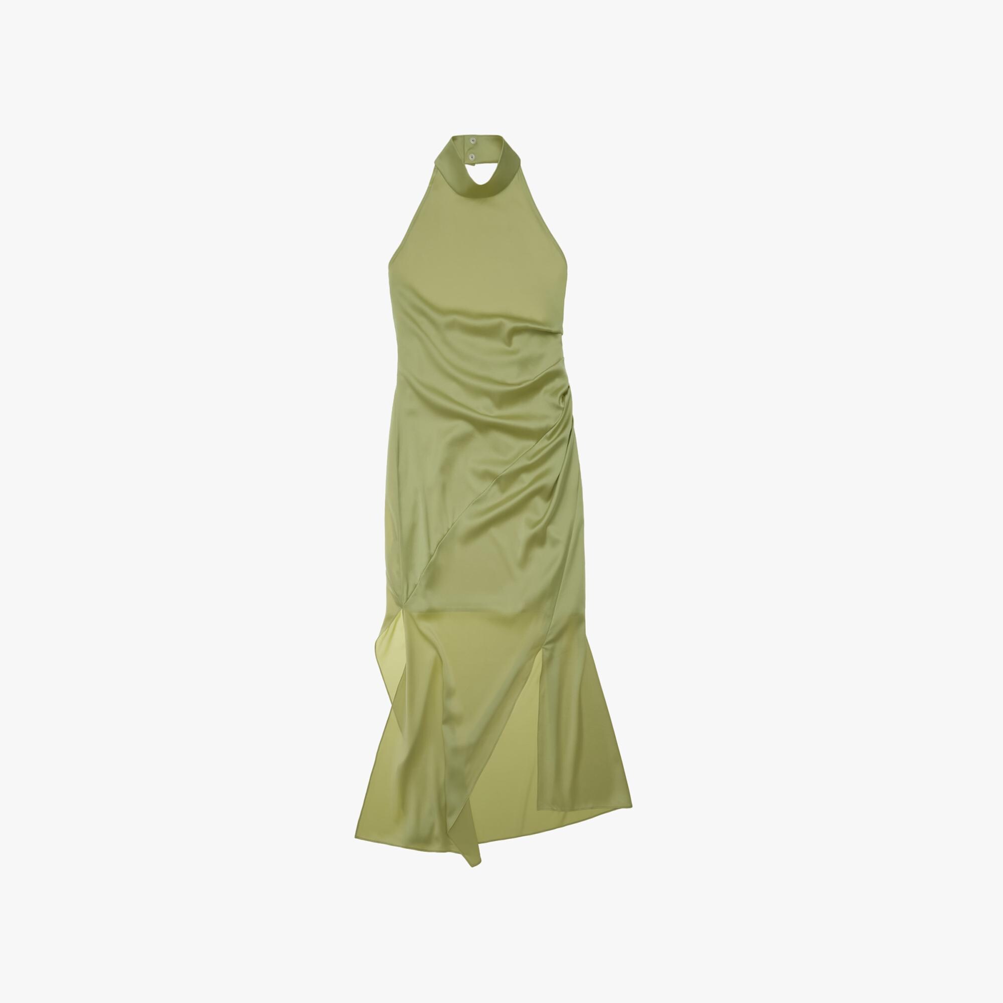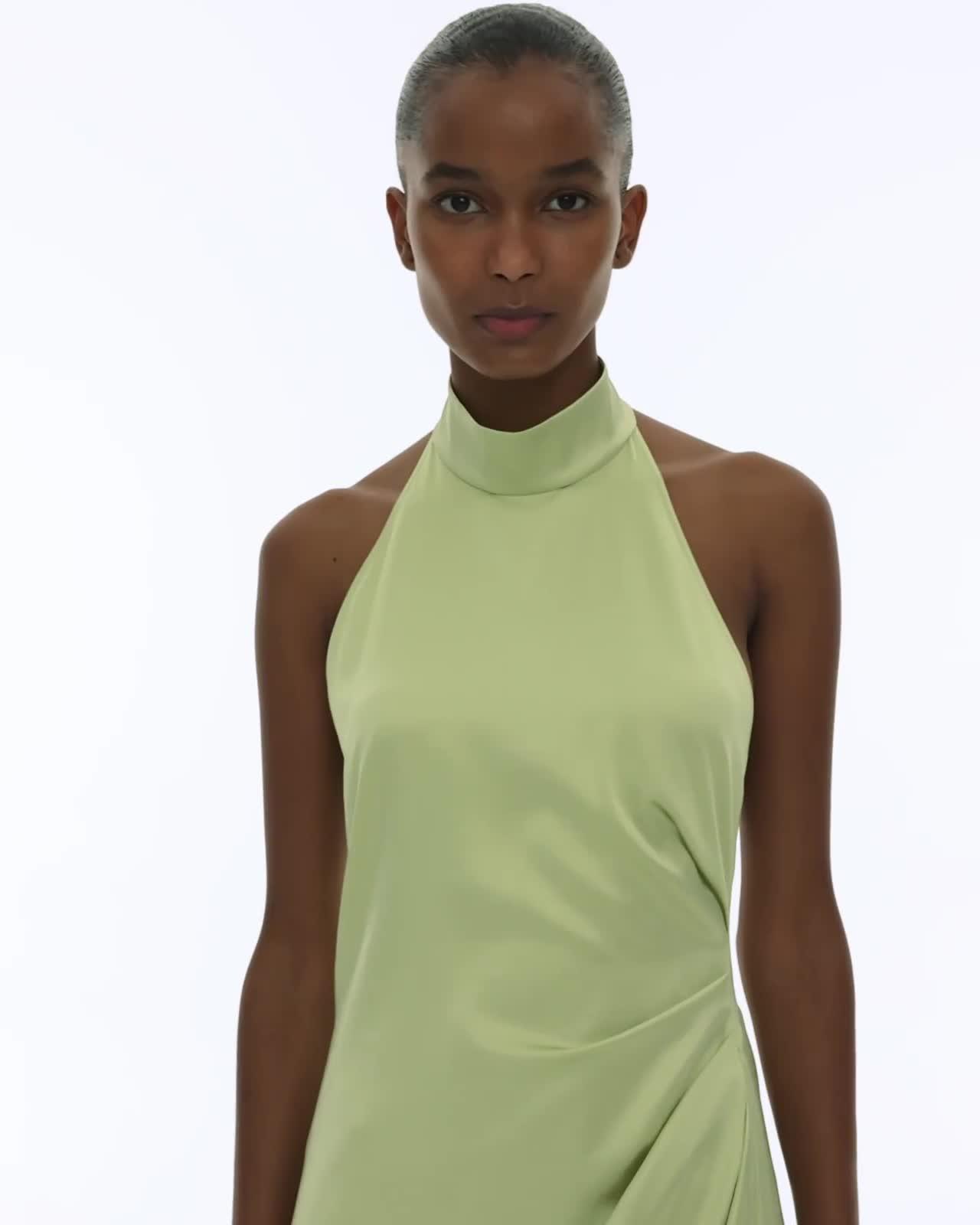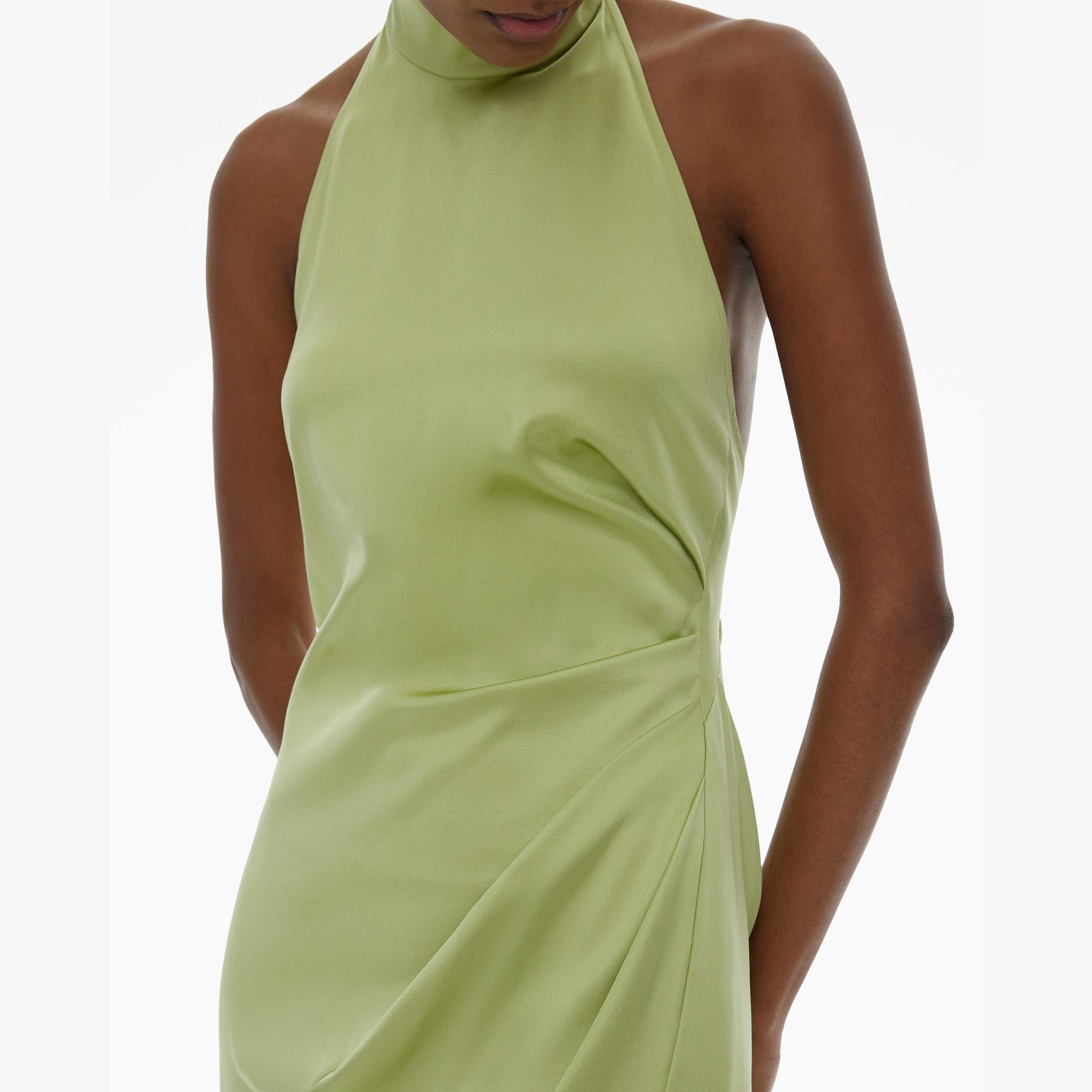 The Helmut Lang Midi Dress is a slim-fitting style in stretch silk satin with a halter neckline, back button closures, asymmetrical hem with a slit detail.