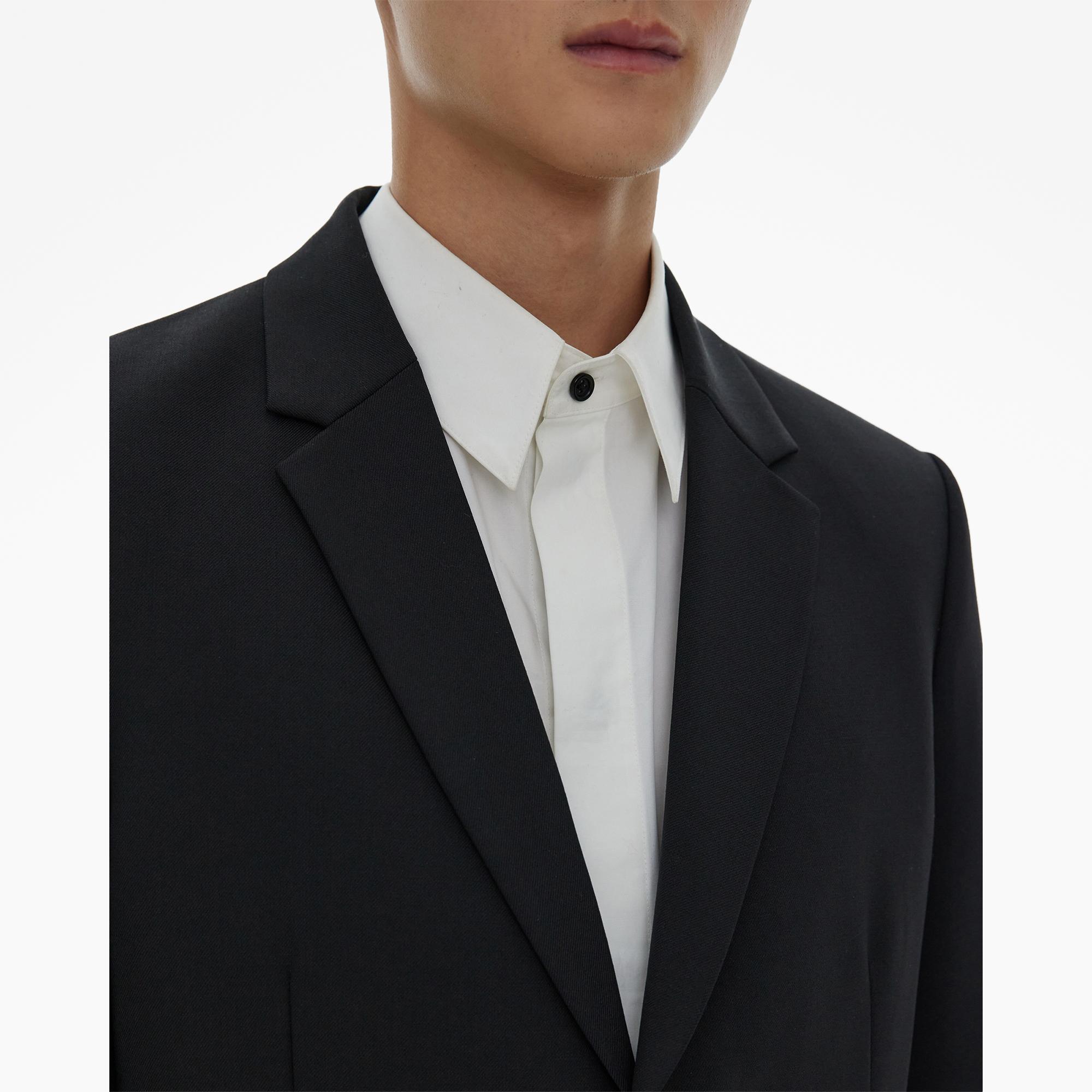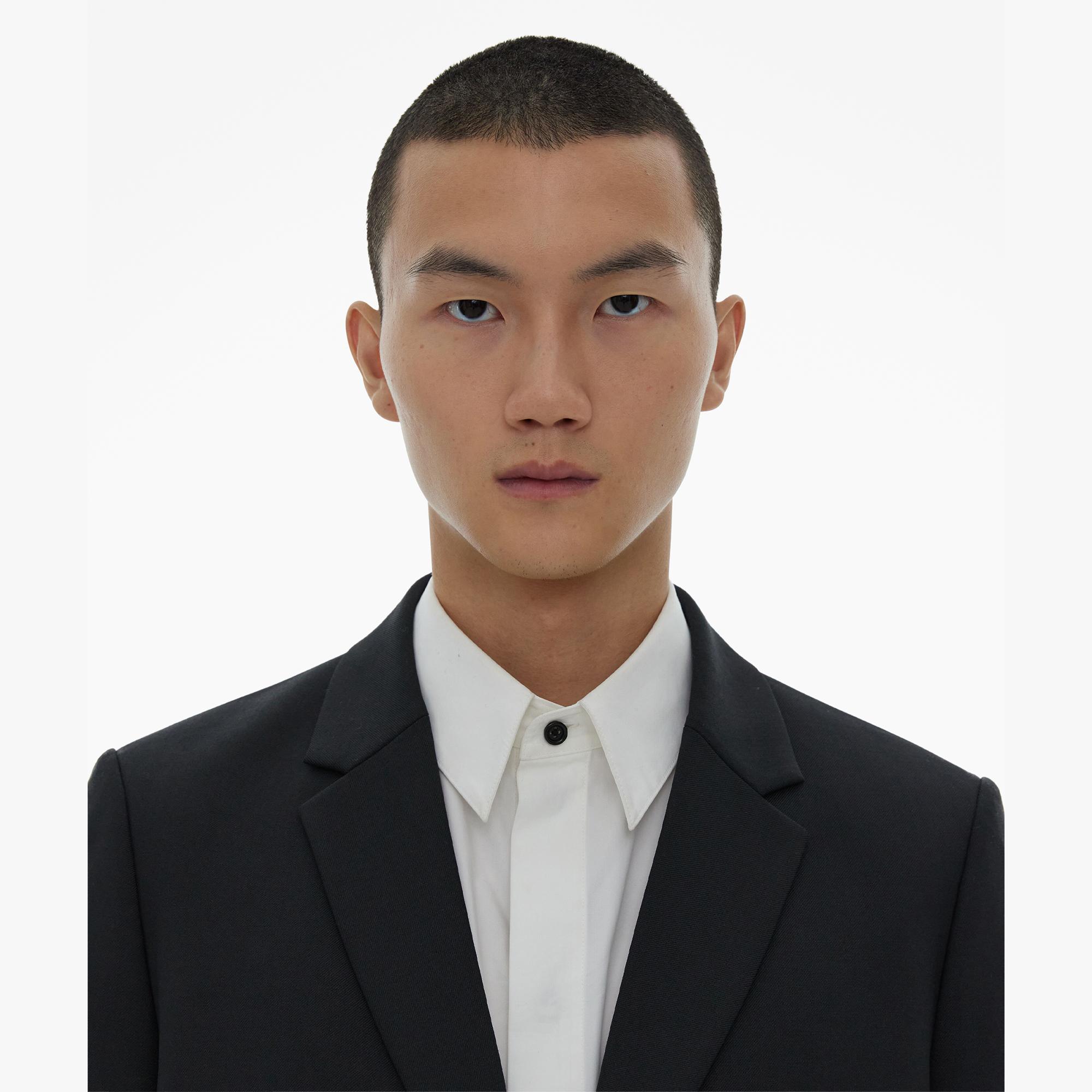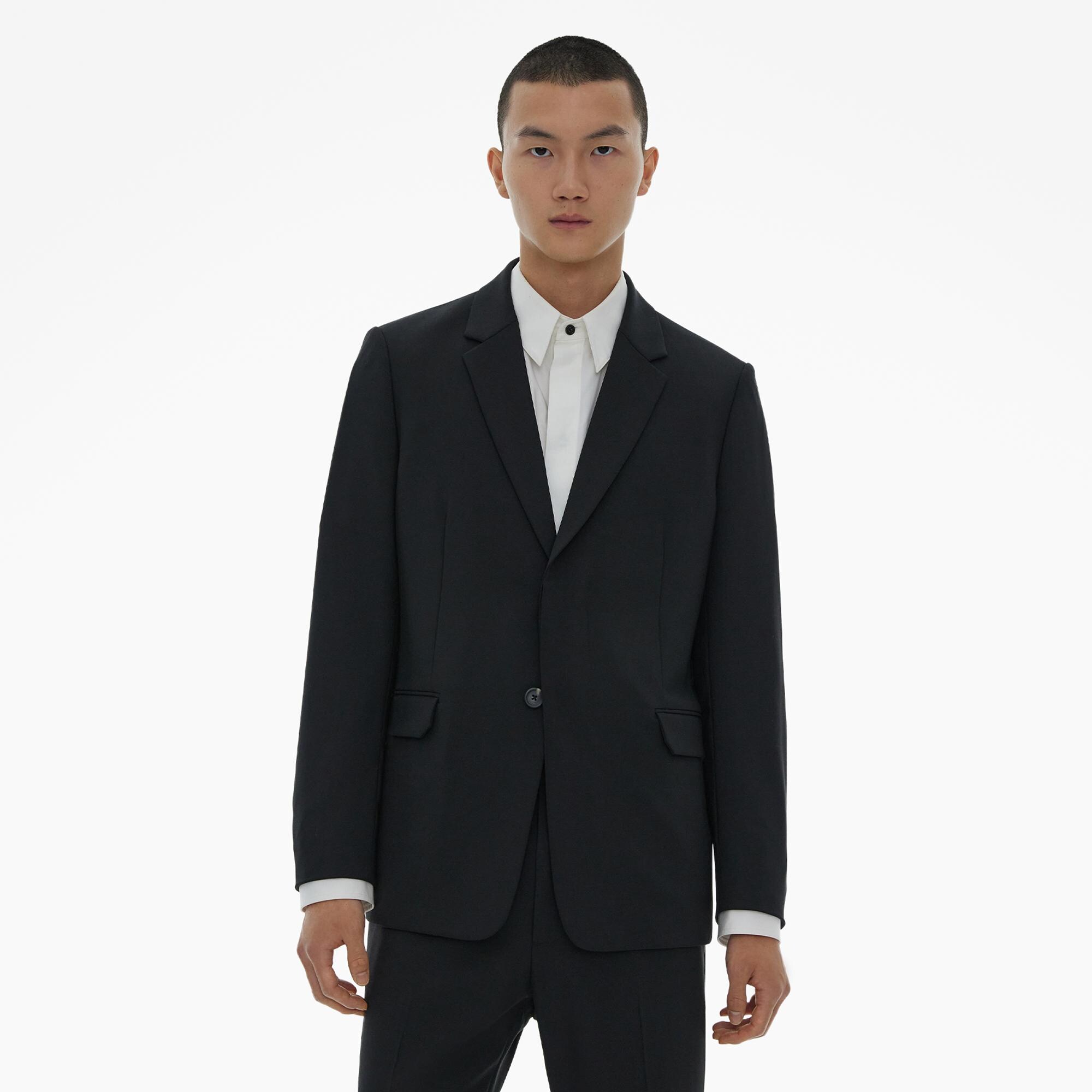The Helmut Lang Blazer is a tailored style in a stretch wool-blend with notched lapels, button front closures, and waist flap pockets.