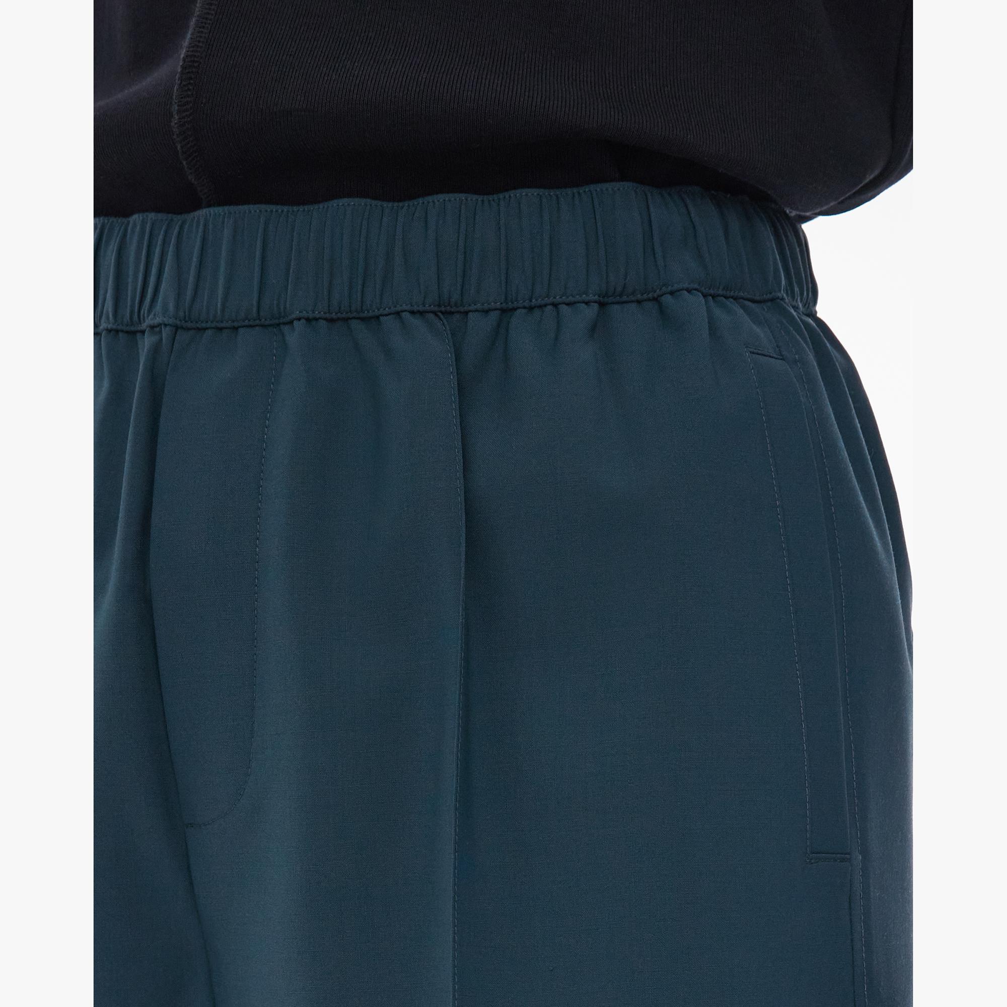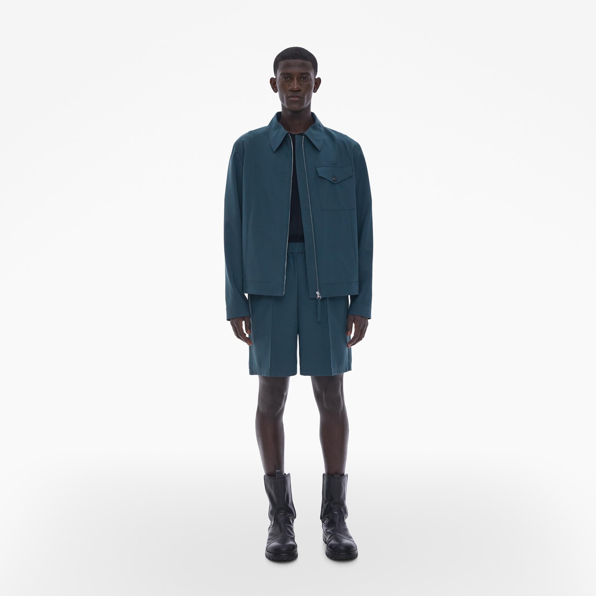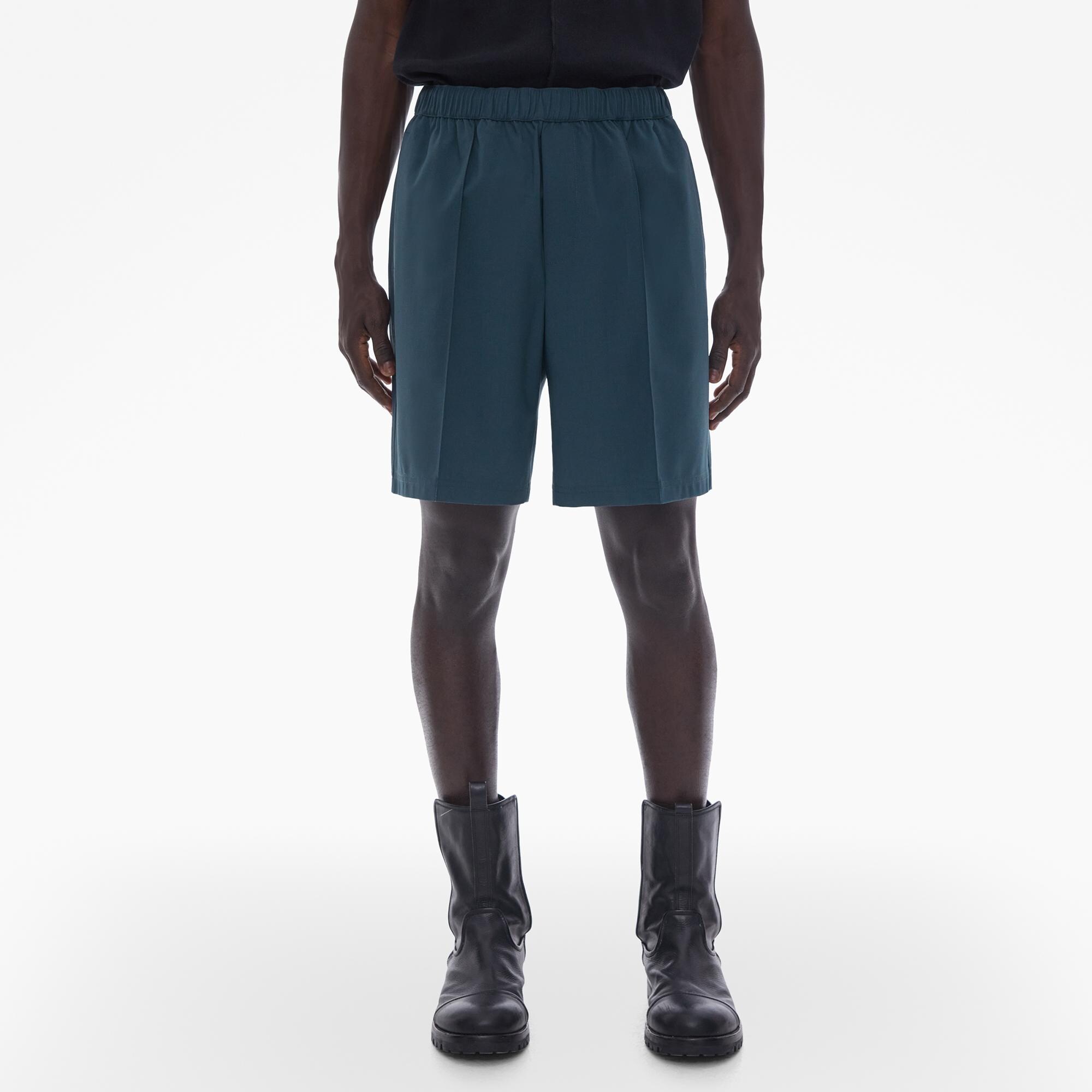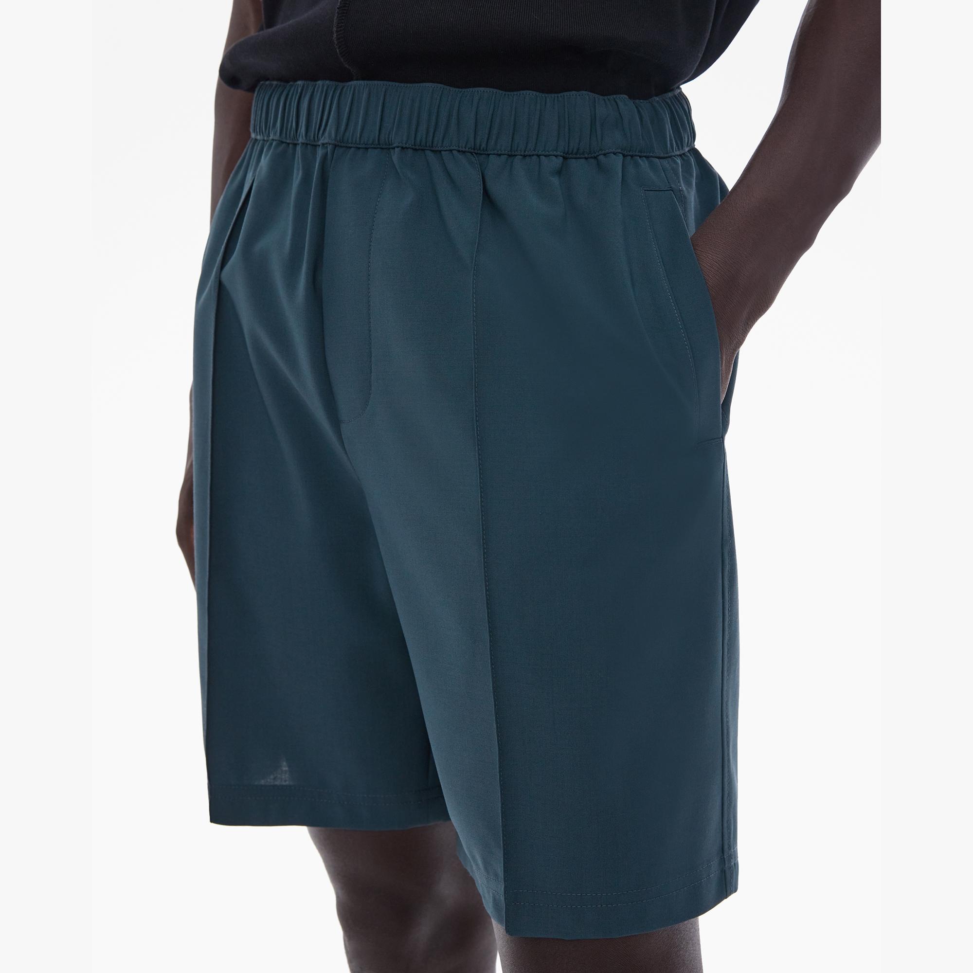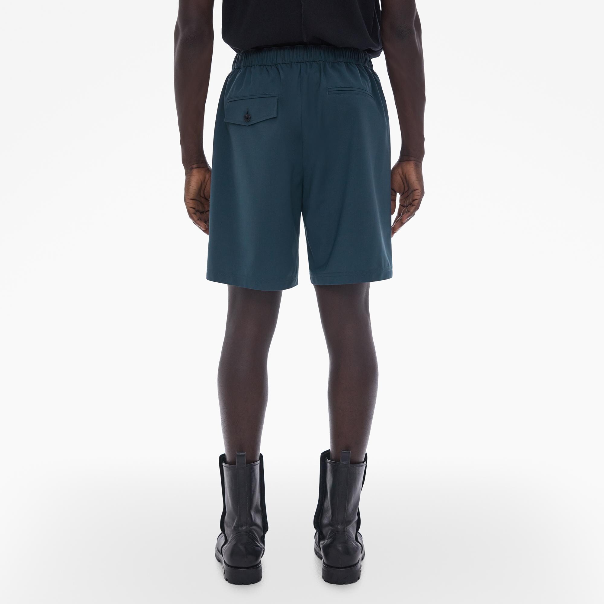 The Helmut Lang Short is a straight-leg style in stretch tropical wool suiting with a zip fly and hook closure, a partially elasticized waistband, and patch pockets at the side and back.