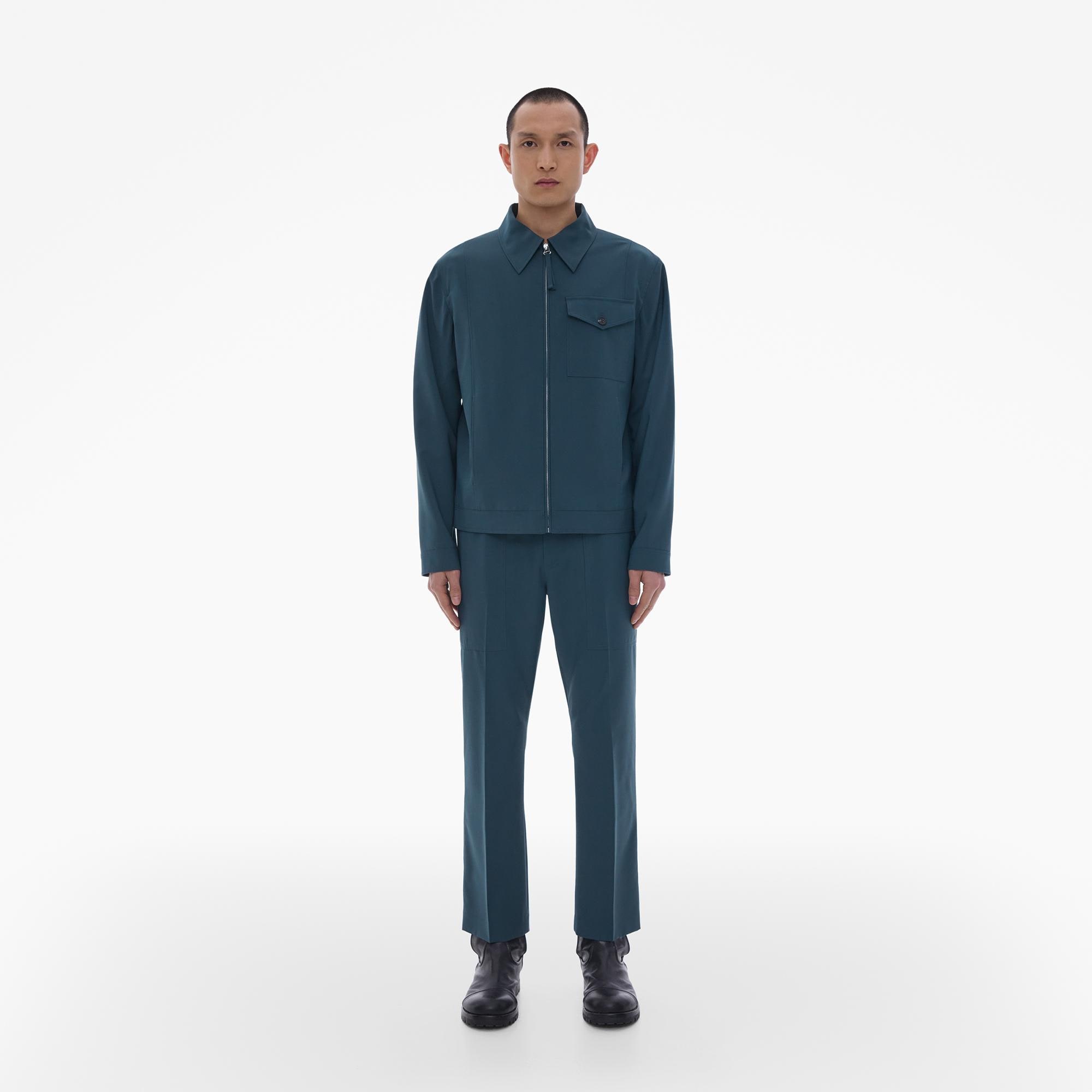 The Helmut Lang Tailored Jacket is a relaxed style in stretch tropical wool suiting with a pointed collar, zip front closure, button flap pocket, button cuffs, and sizer tabs at the side.