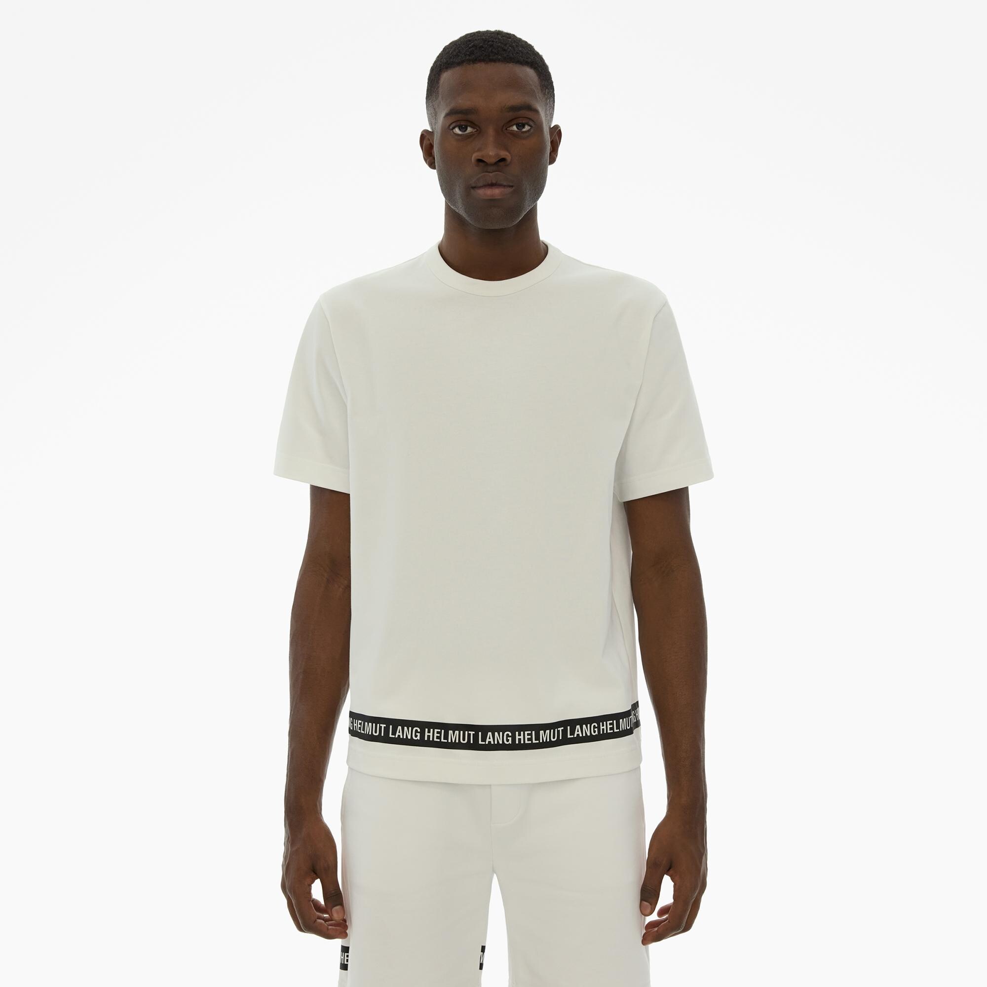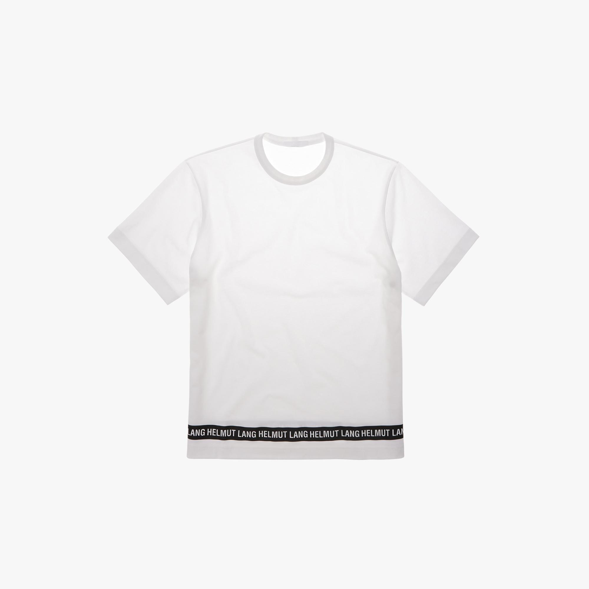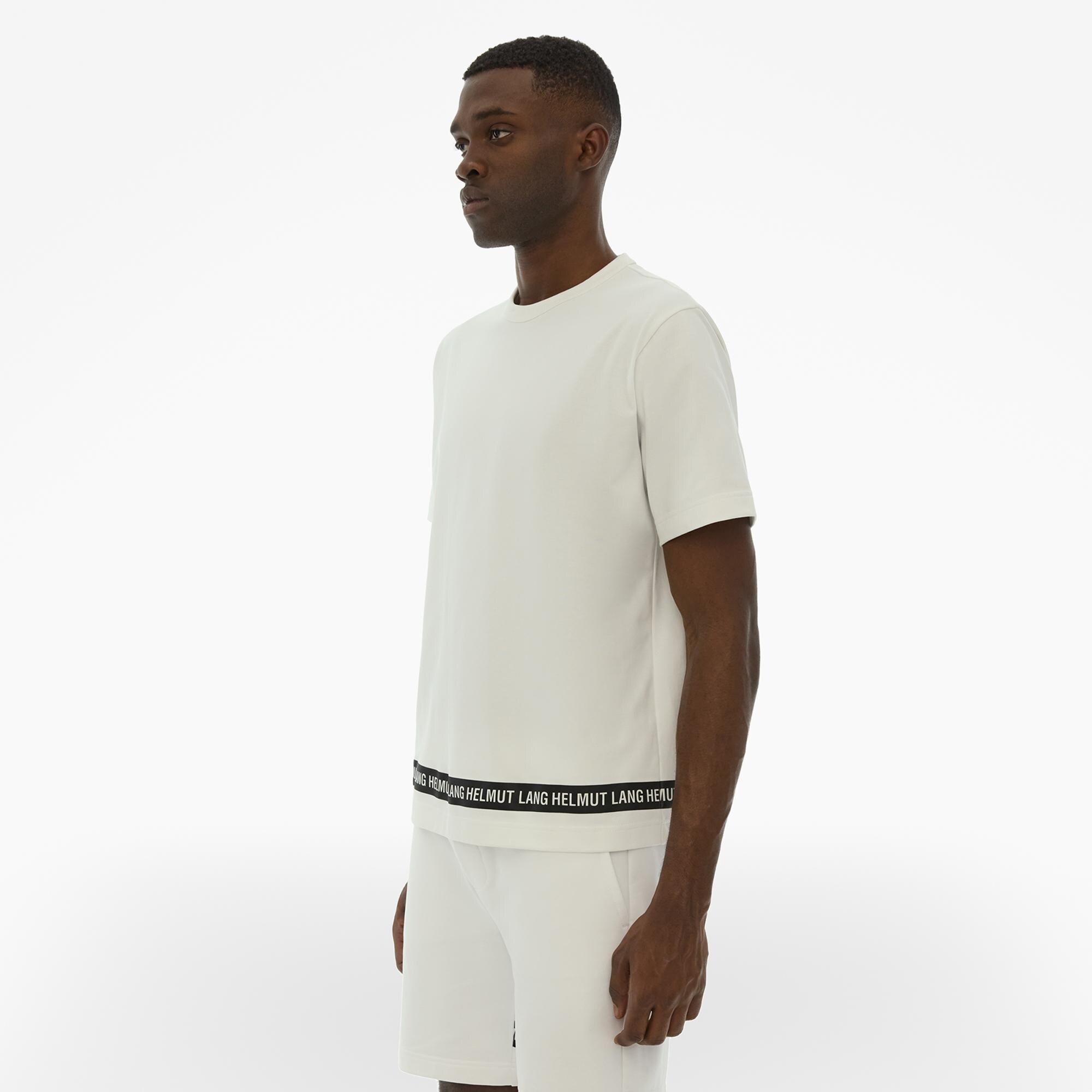 The Helmut Lang Tee is a cotton jersey crewneck with short sleeves and an HL logo striped hem.