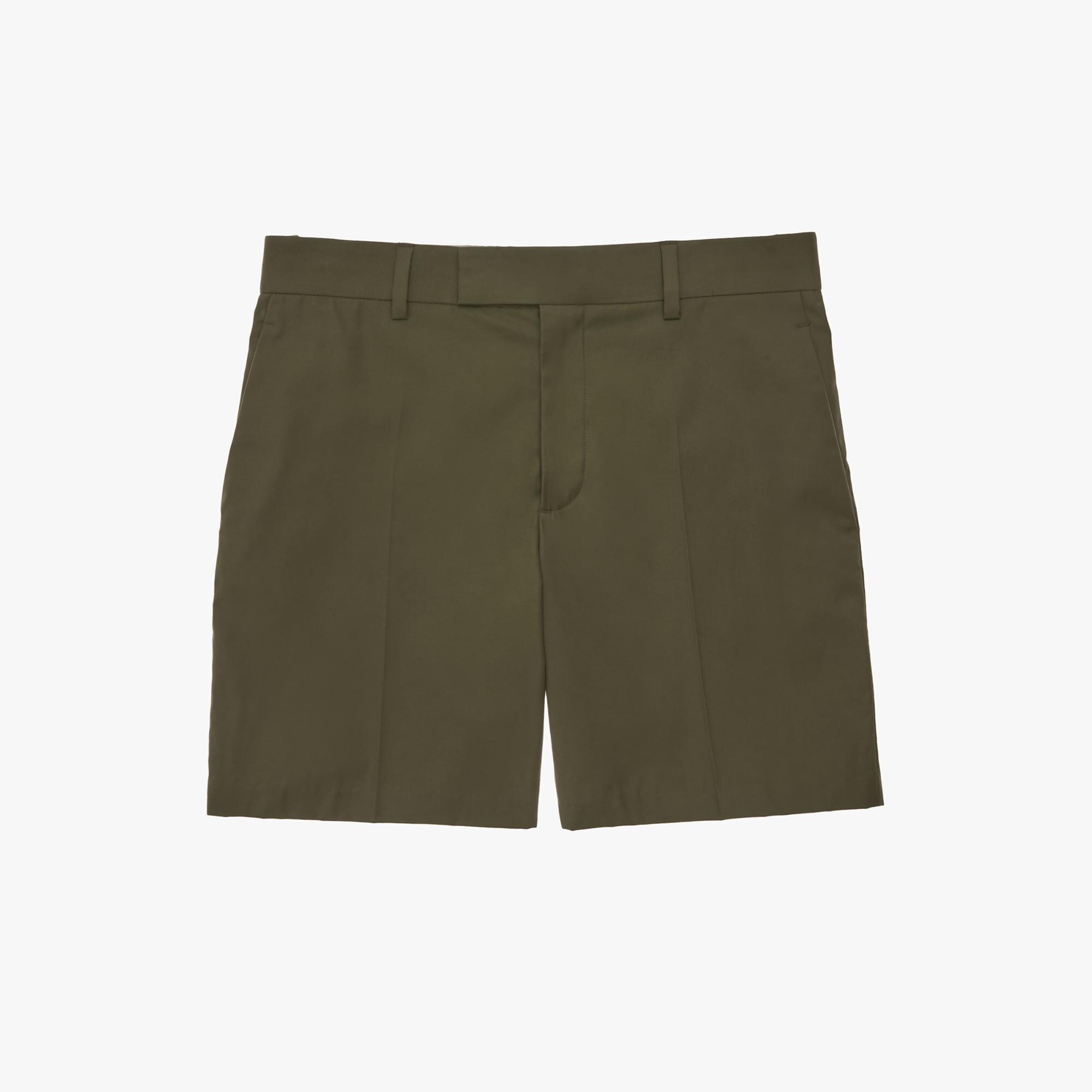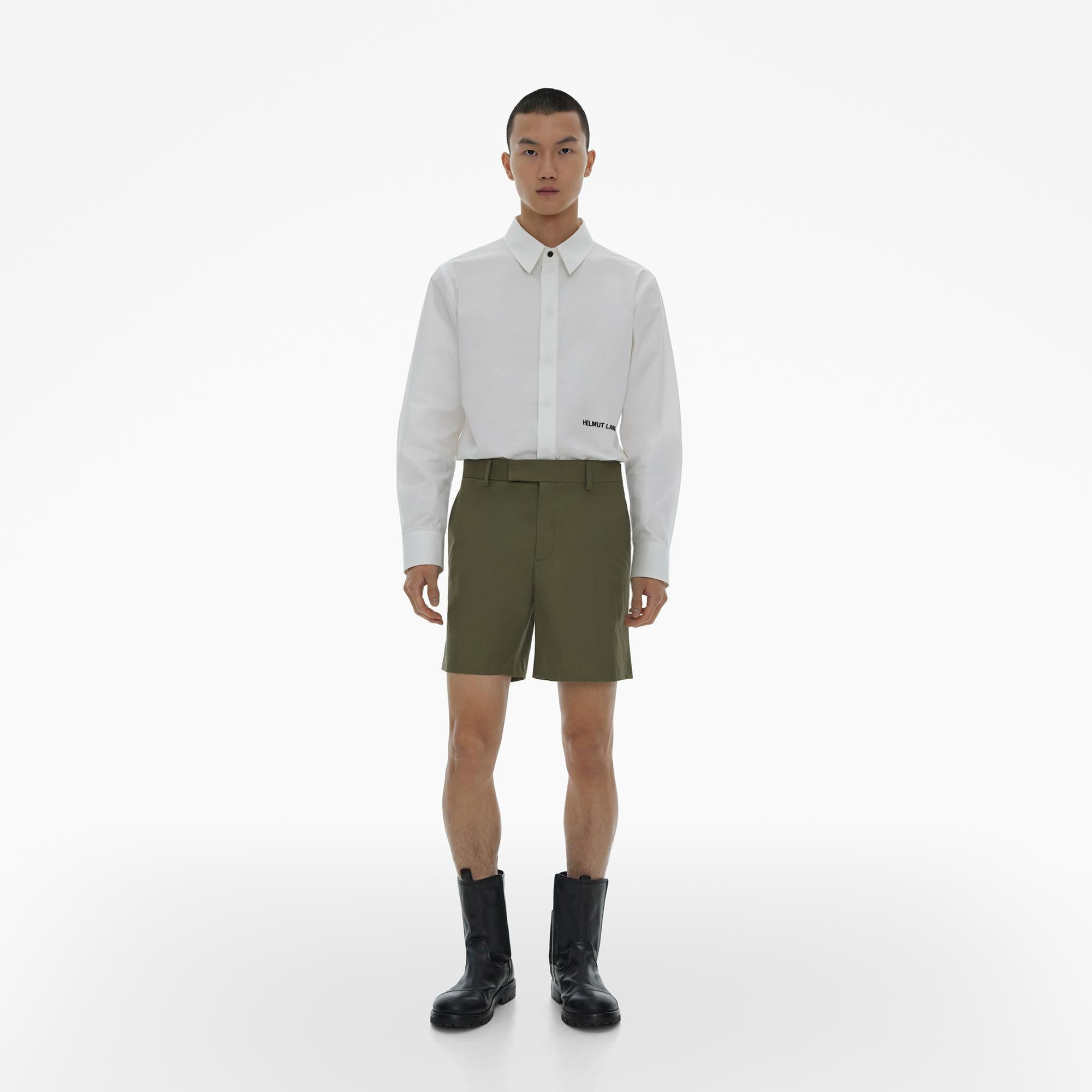 The Helmut Lang Short is a tailored style in a technical cotton suiting with a zip fly and hook closure, side slip pockets, and back button welt pockets.