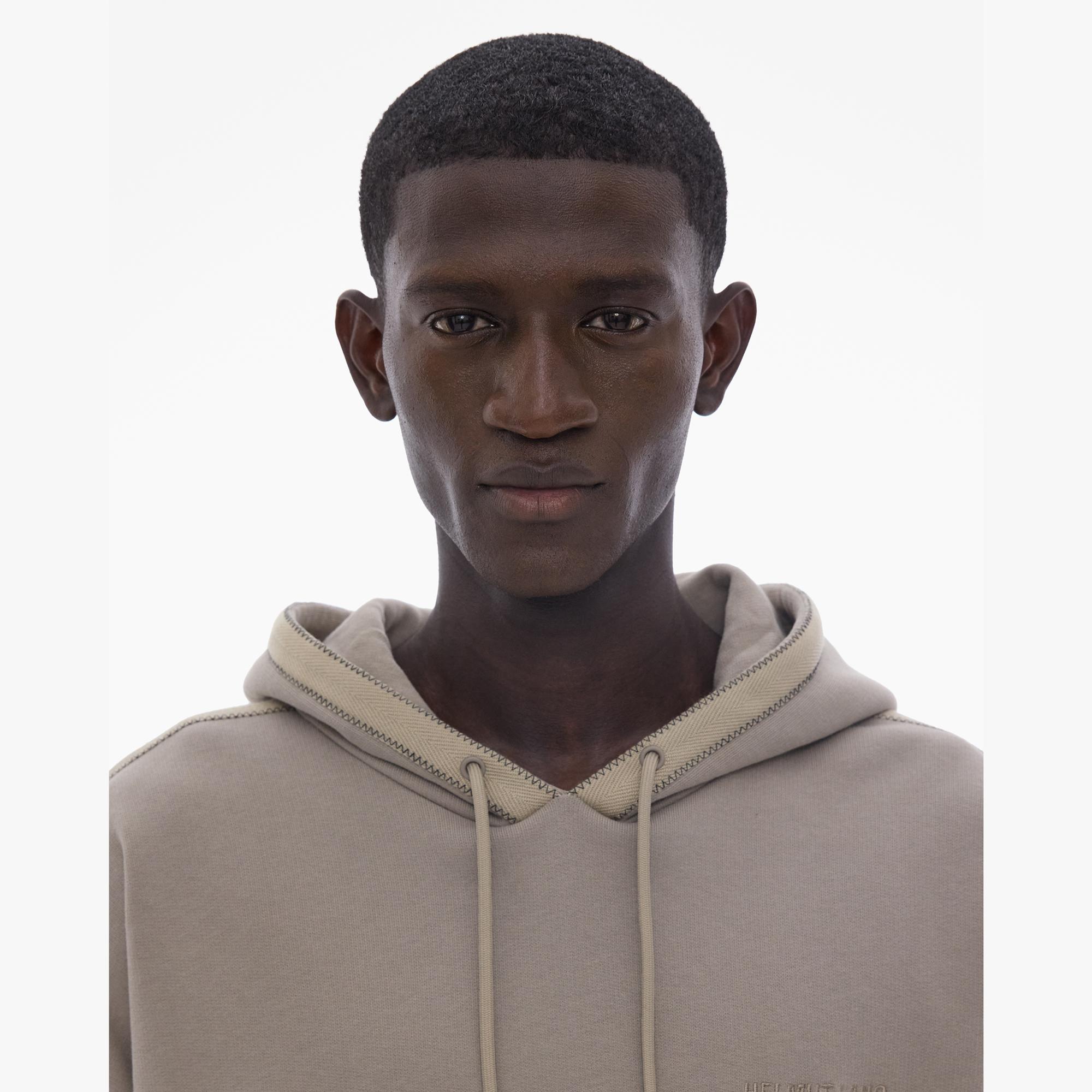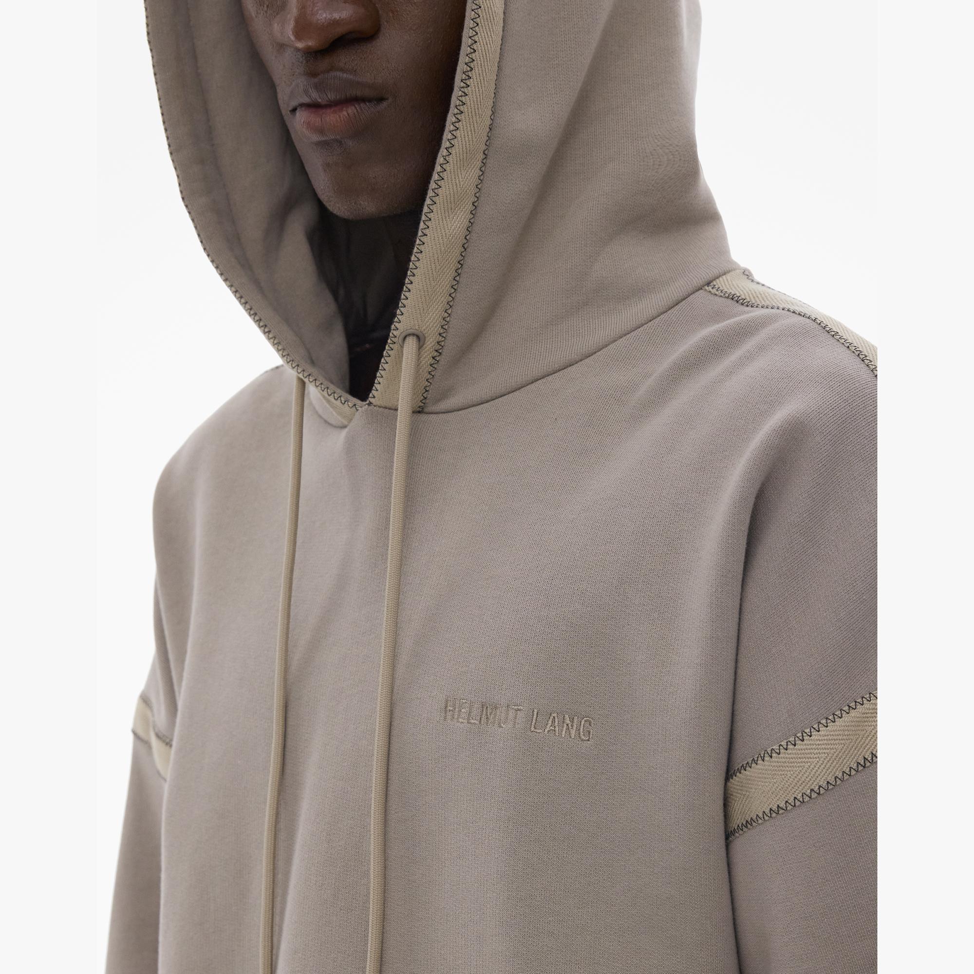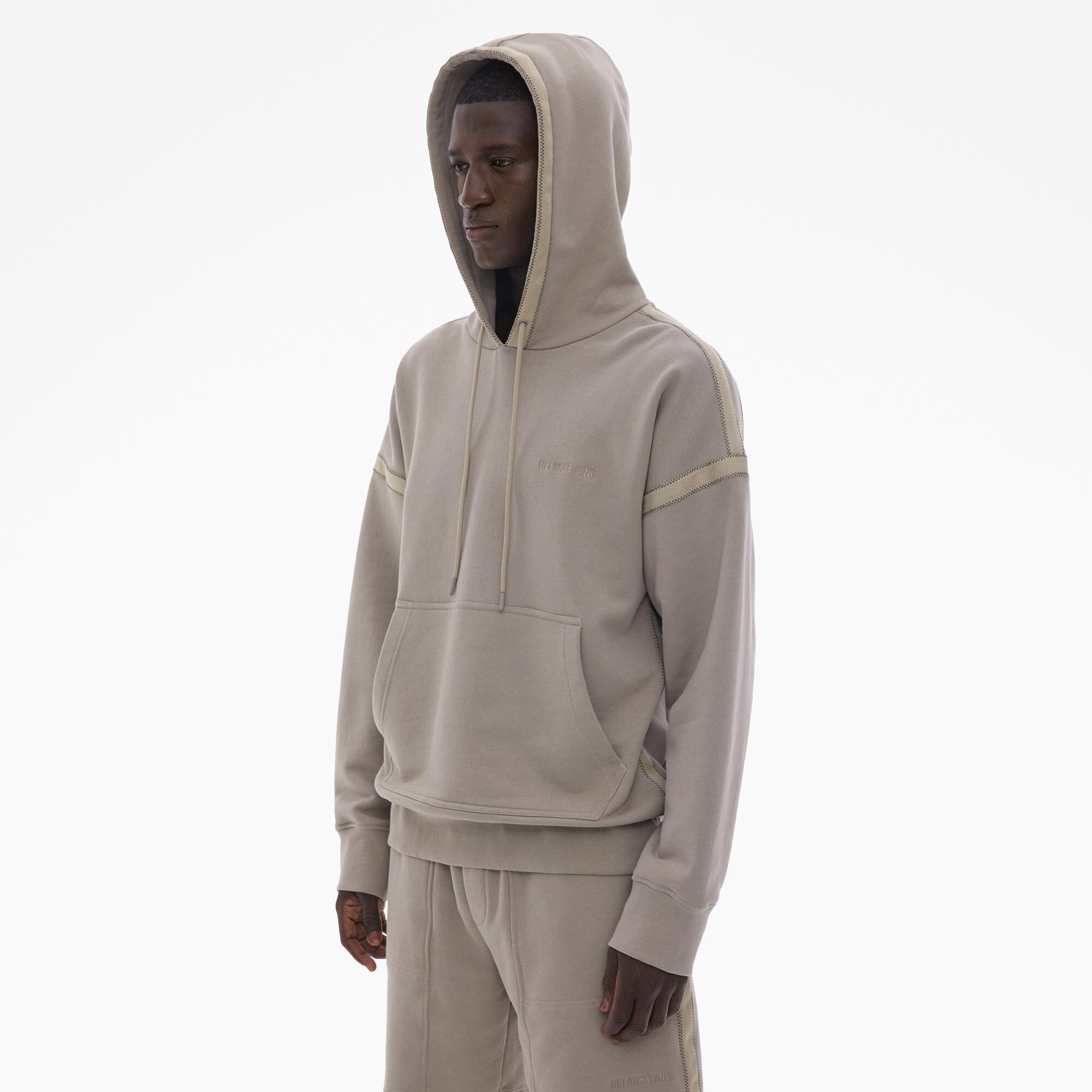 The Helmut Lang Tape Hoodie is a relaxed style in a loosely knit French cotton terry with dropped shoulders, drawstring hood, kangaroo pocket, topstitched tape trim, and rib knit details throughout.