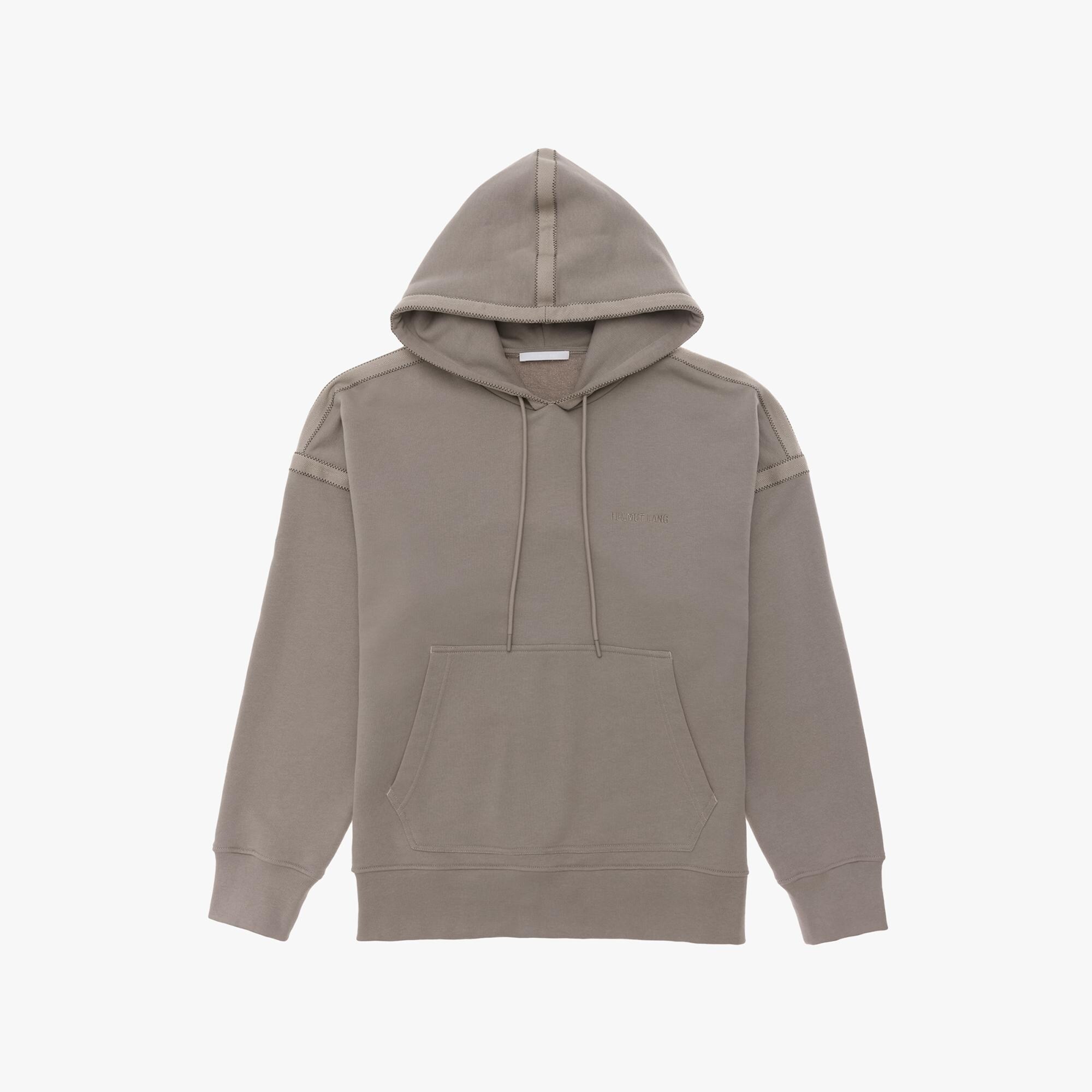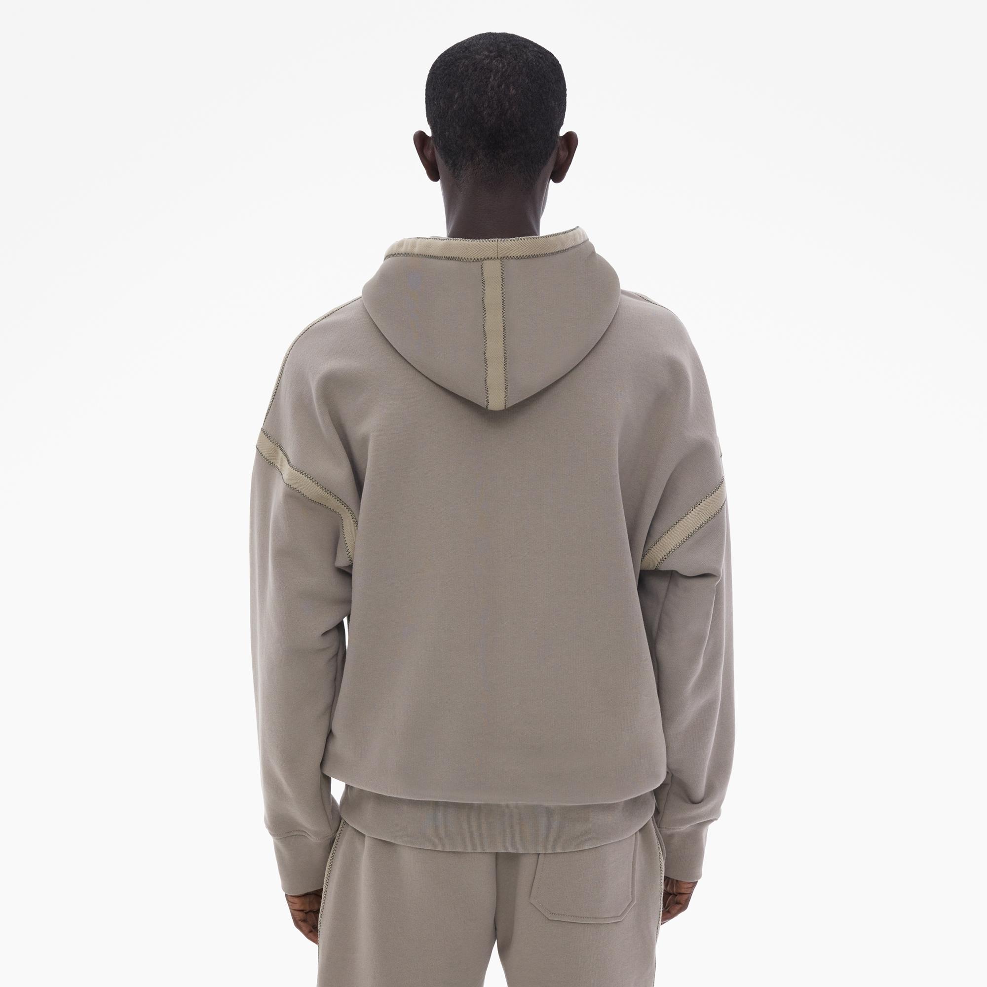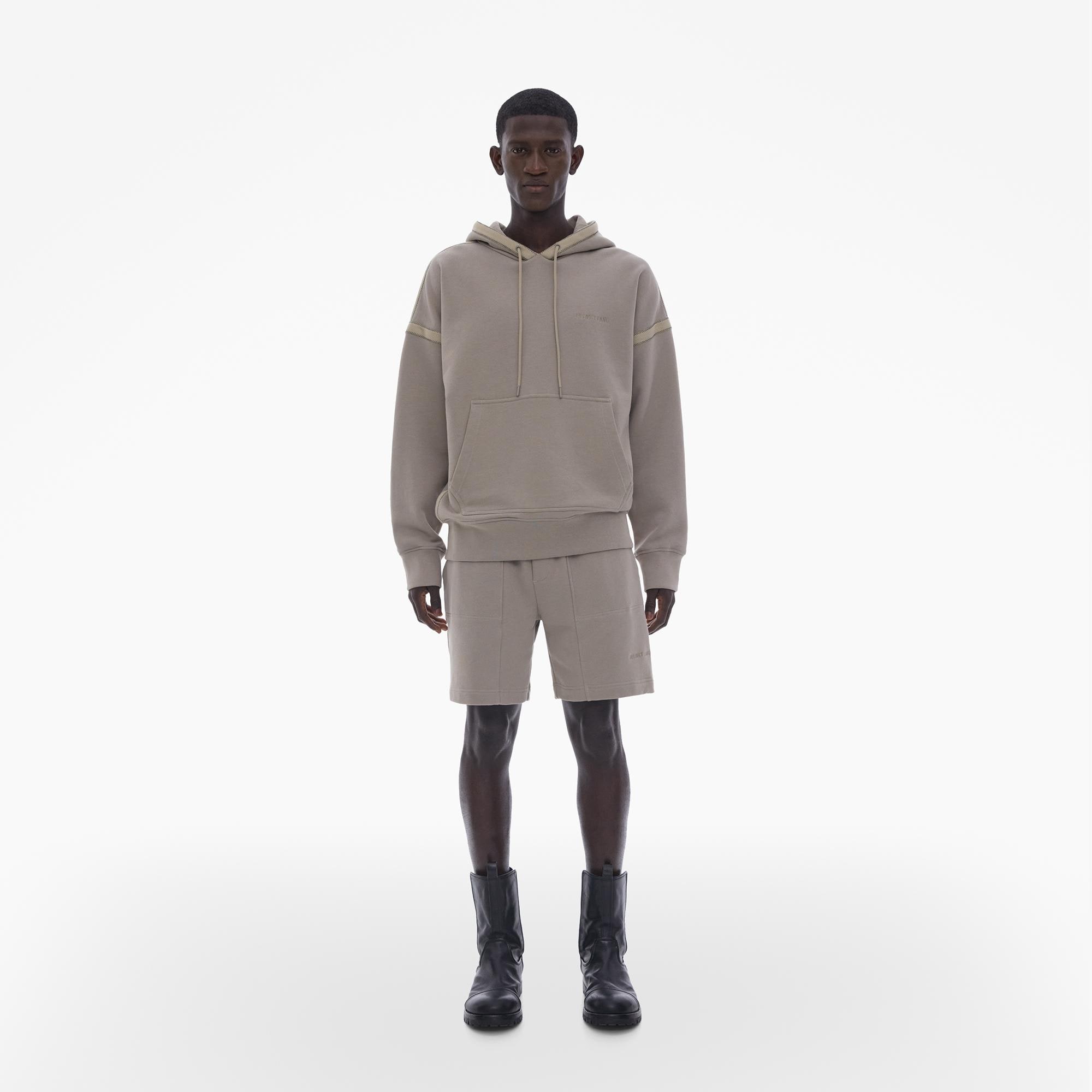 The Helmut Lang Tape Hoodie is a relaxed style in a loosely knit French cotton terry with dropped shoulders, drawstring hood, kangaroo pocket, topstitched tape trim, and rib knit details throughout.